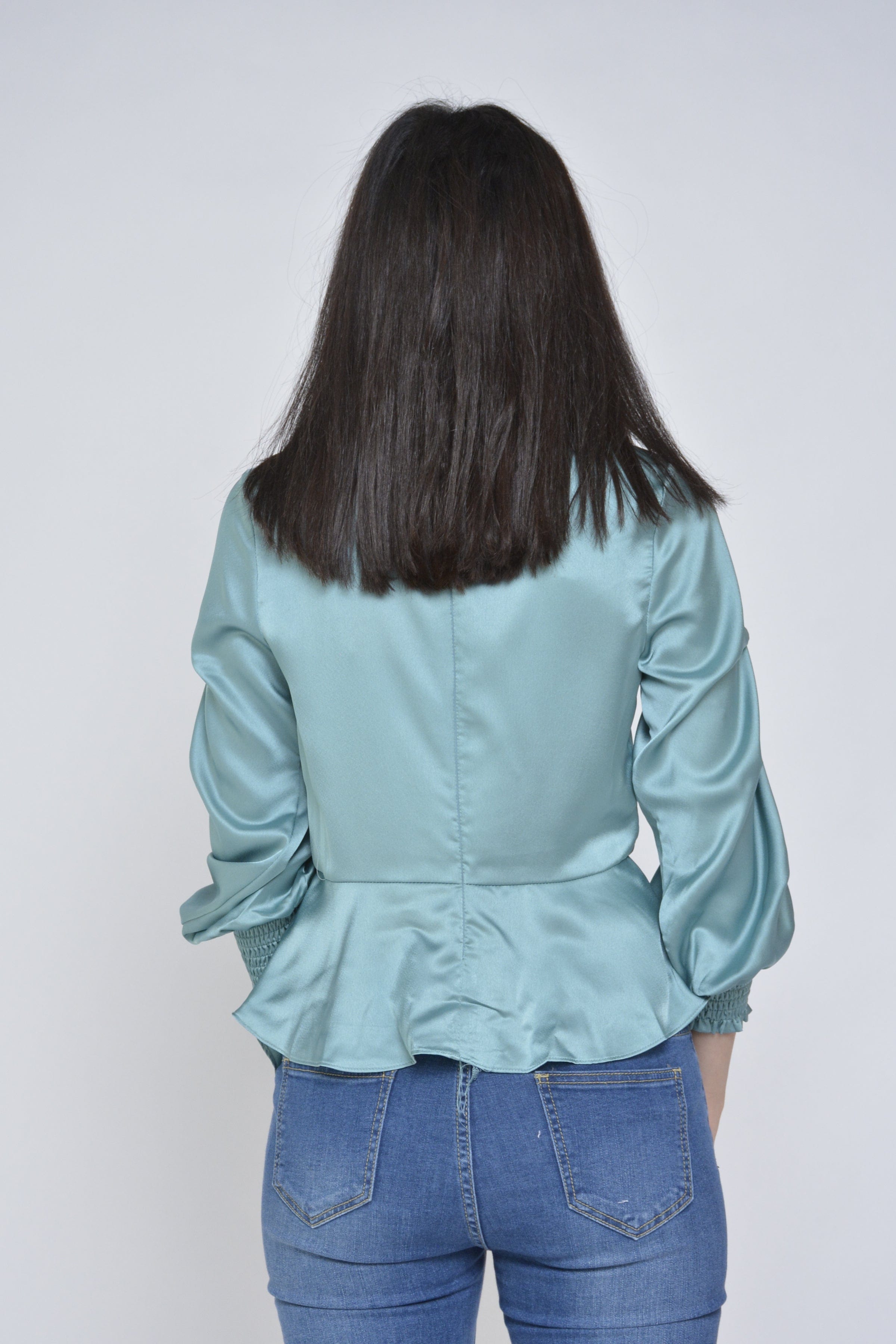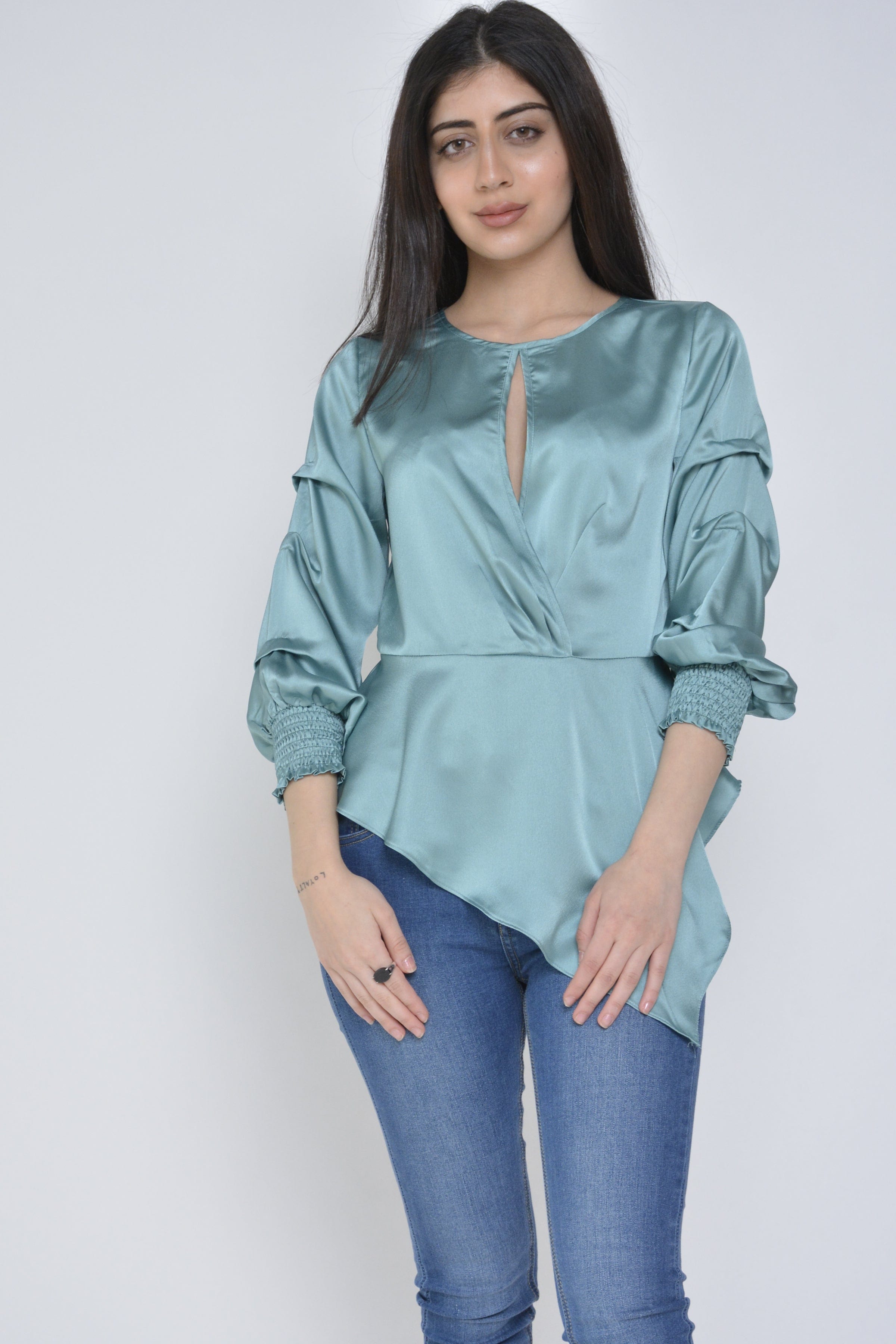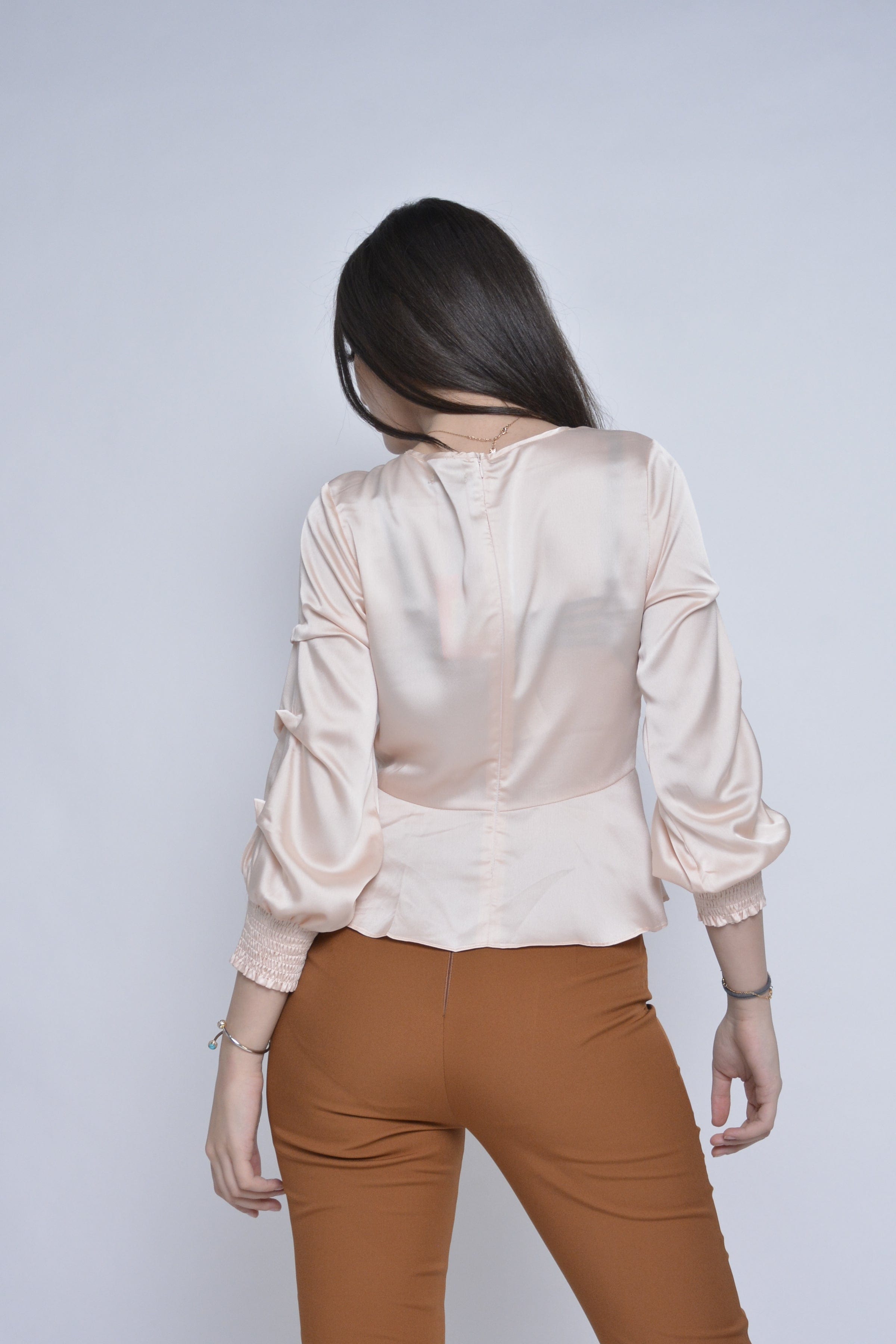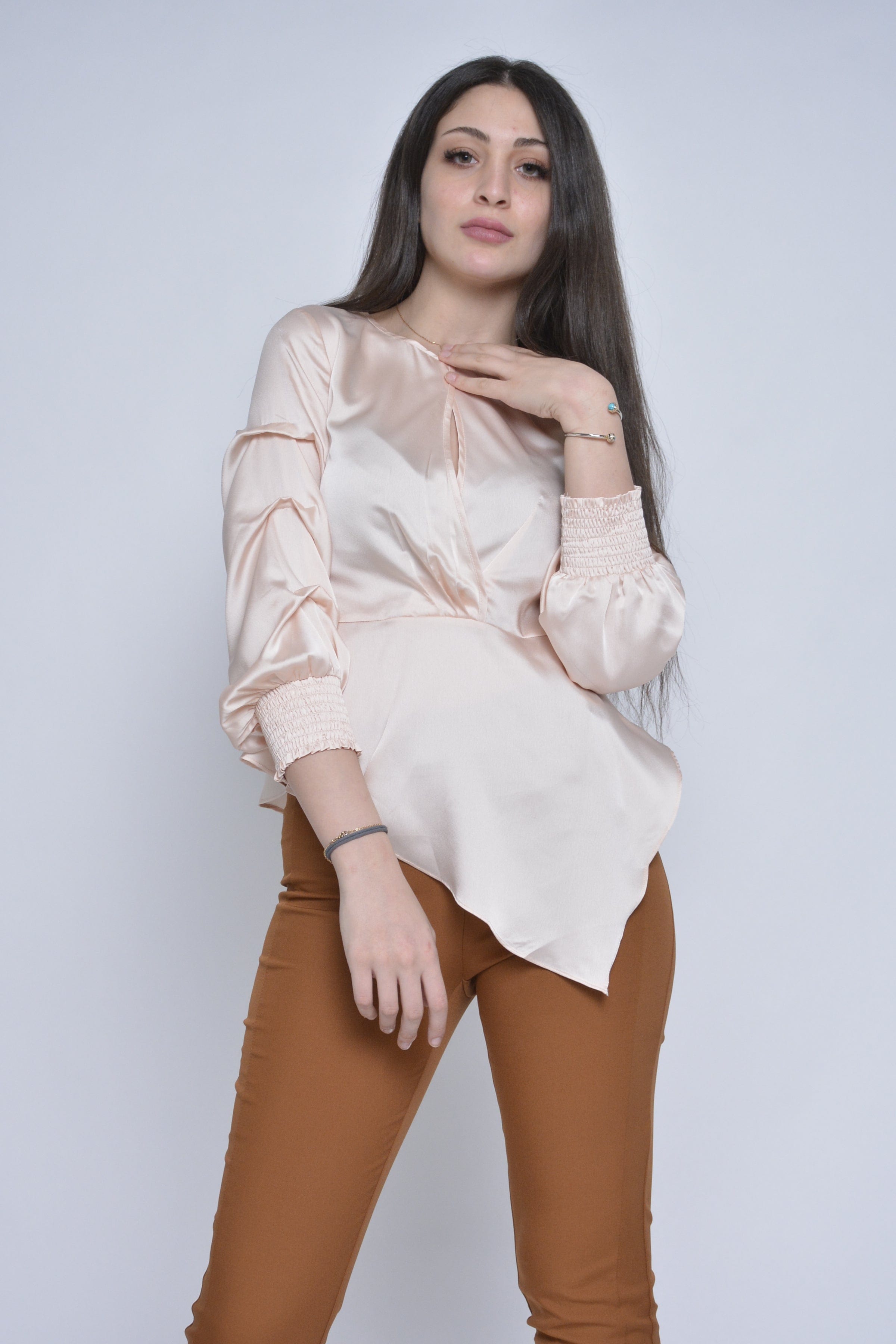 بلوزة ستان كلاسك فتحة من الصدر مثلث من أسفل كم طويل وأسورة نسائي