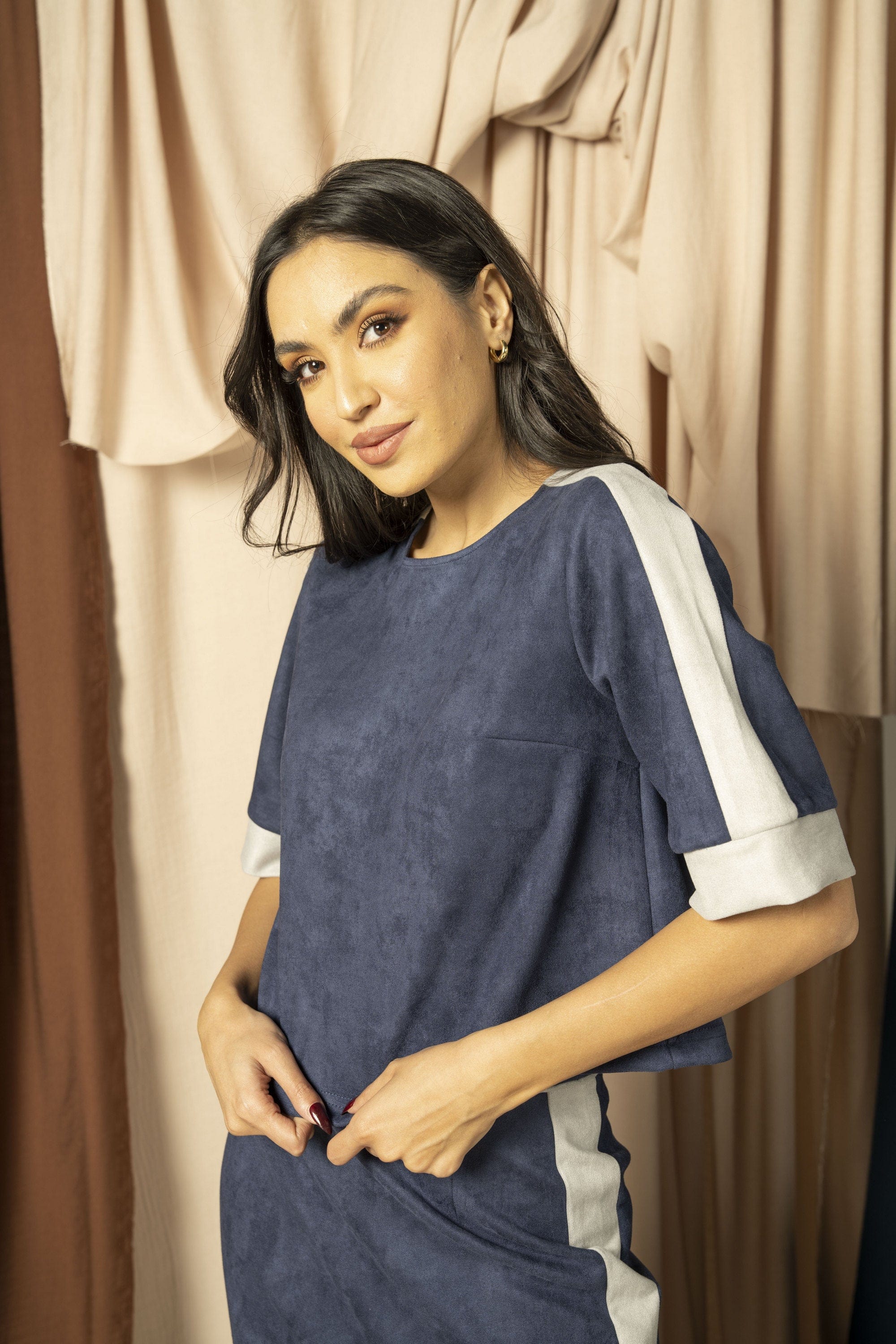 بلوزة شمواه بخط أبيض عريض علي الأكمام