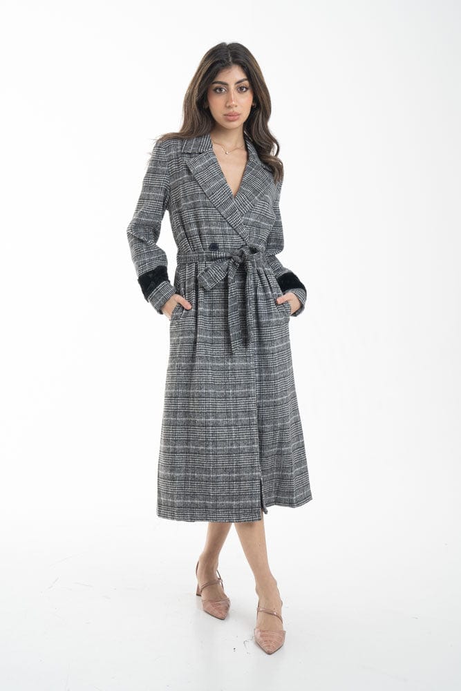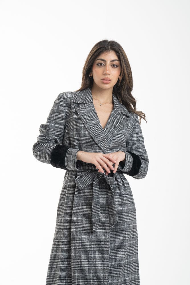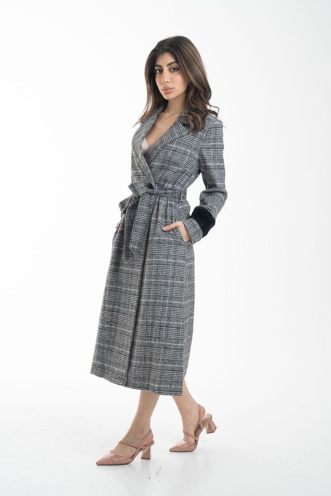 بالطو نسائي طويل رسمي مزين بفرو علي الكم