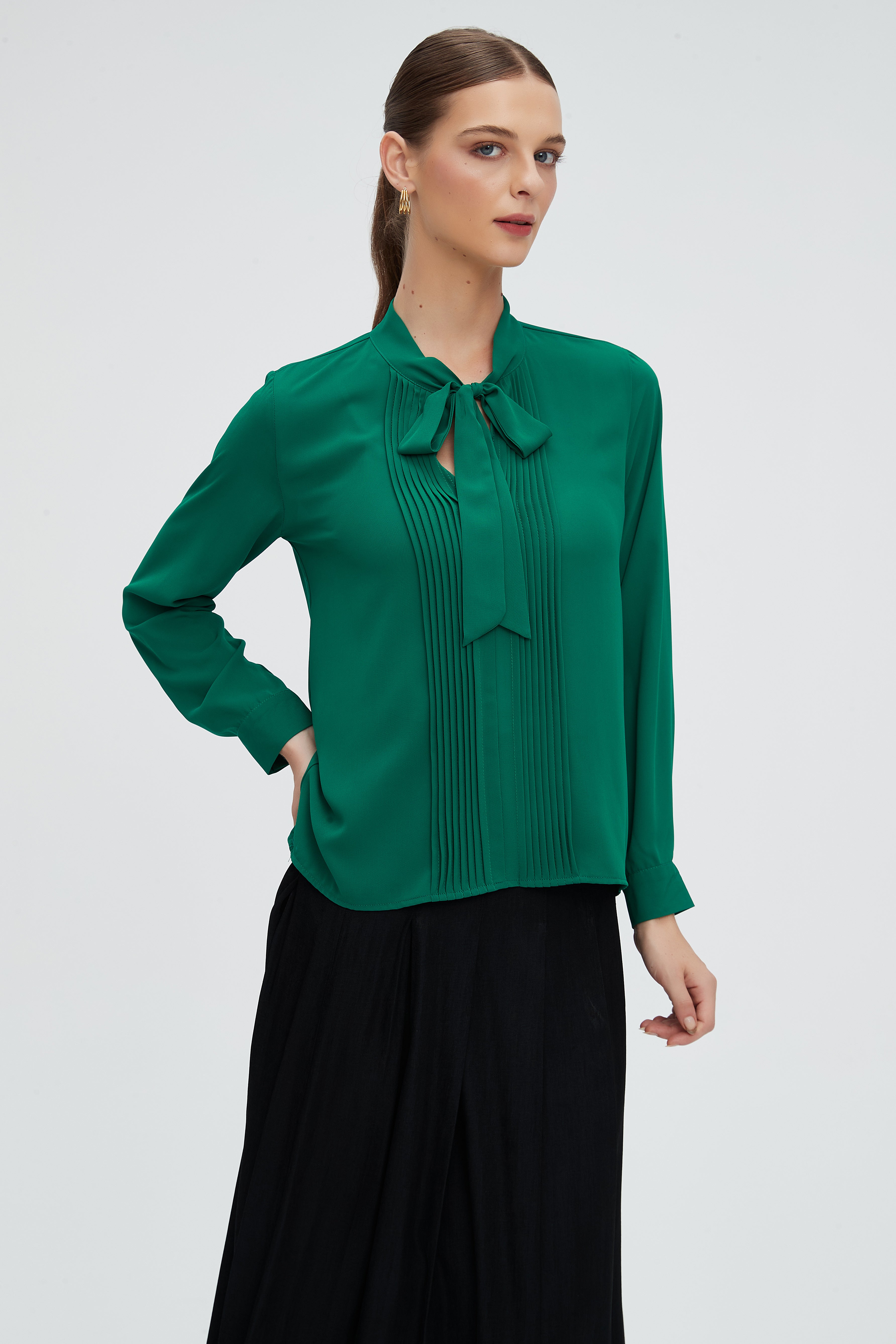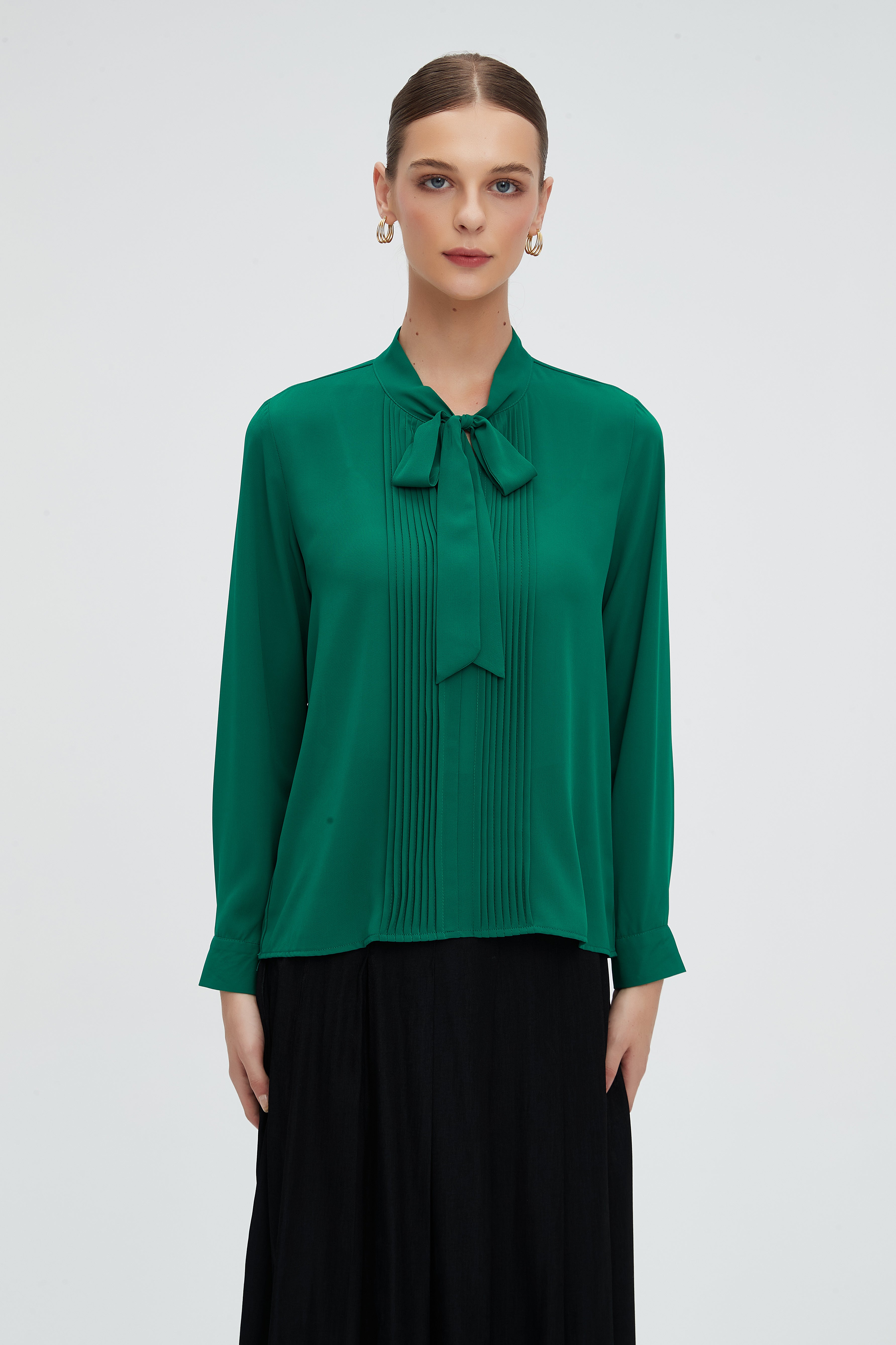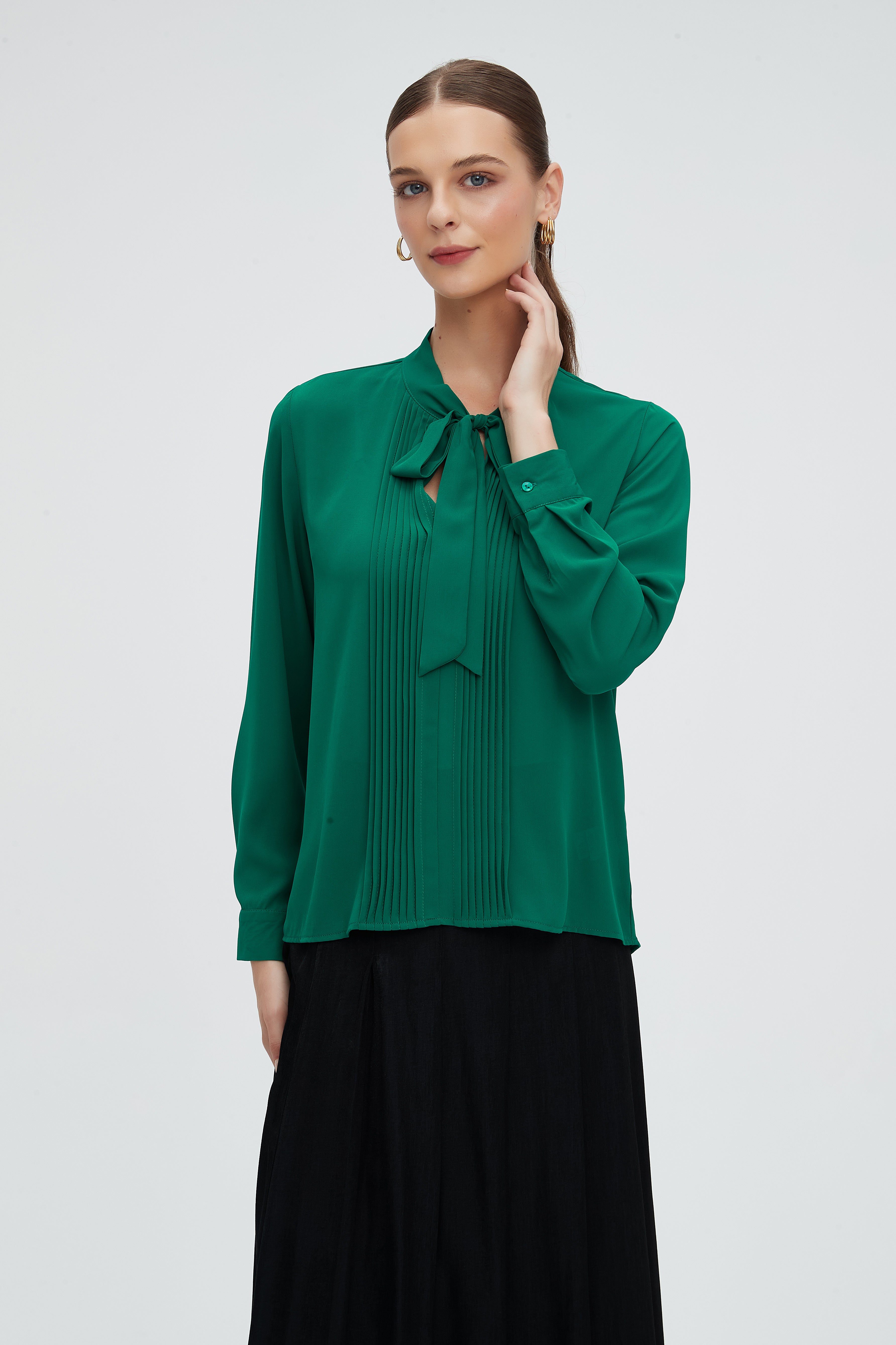 بلوزة سادة بكسرات أمامية وربطة عنق بأكمام طويلة