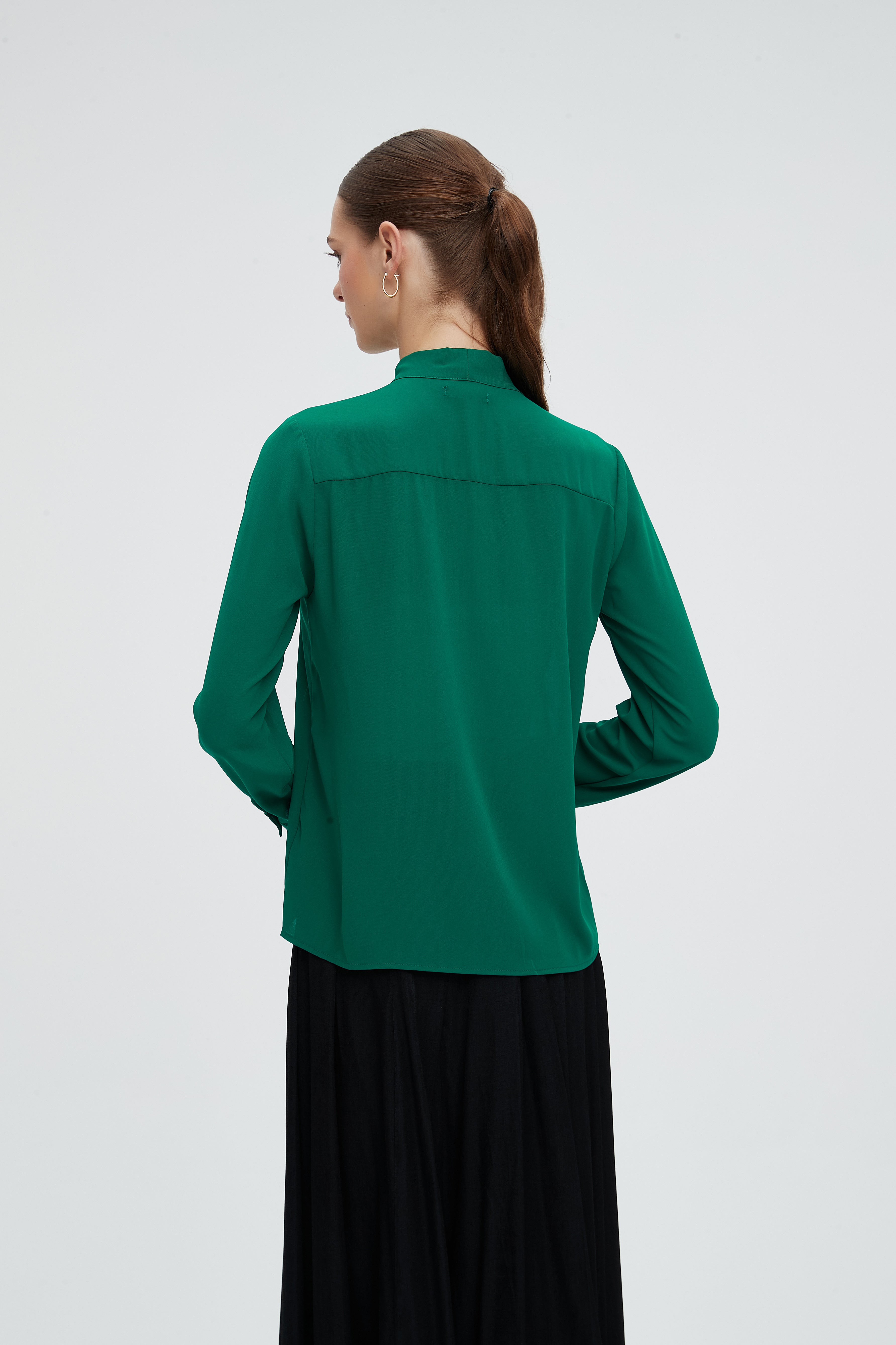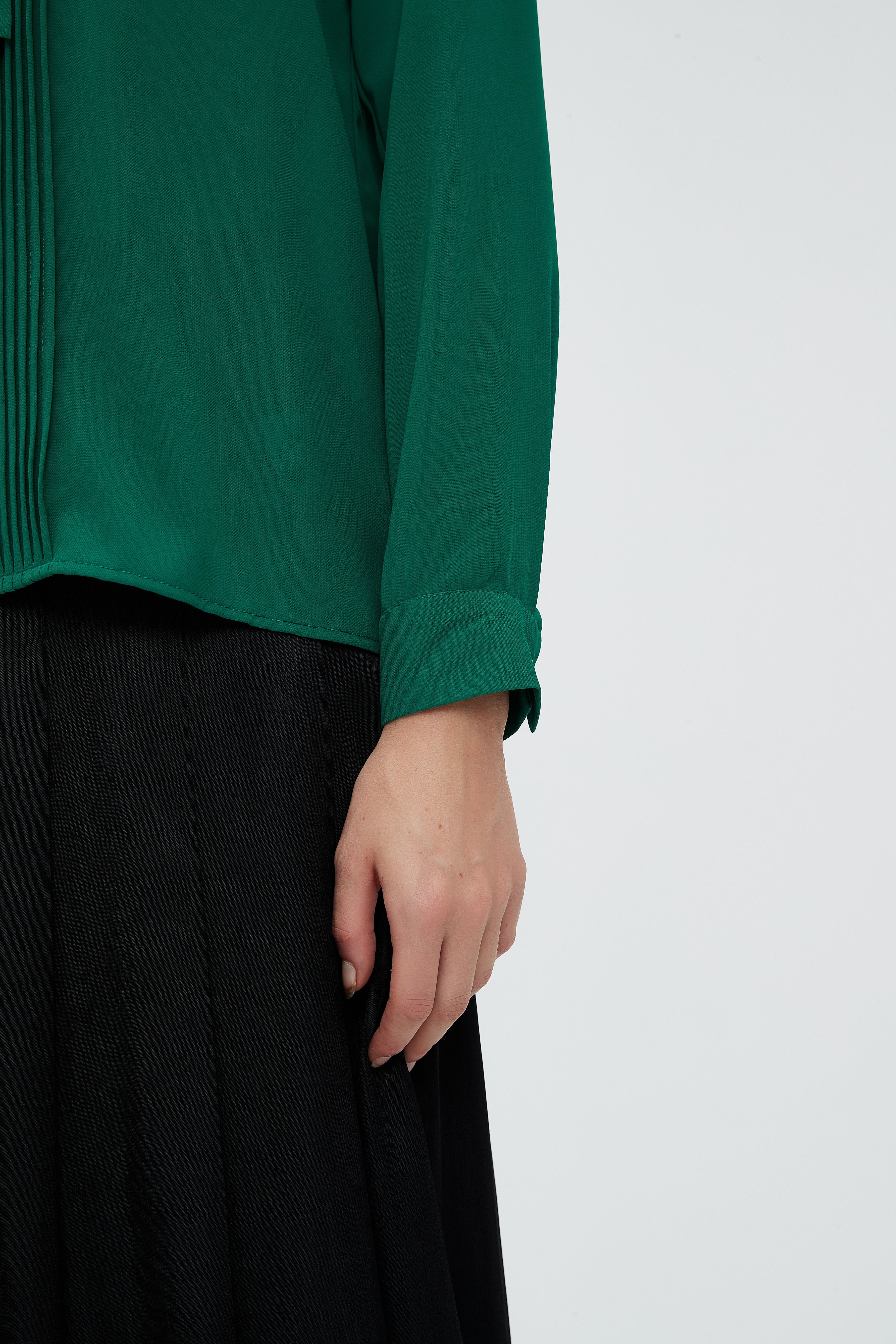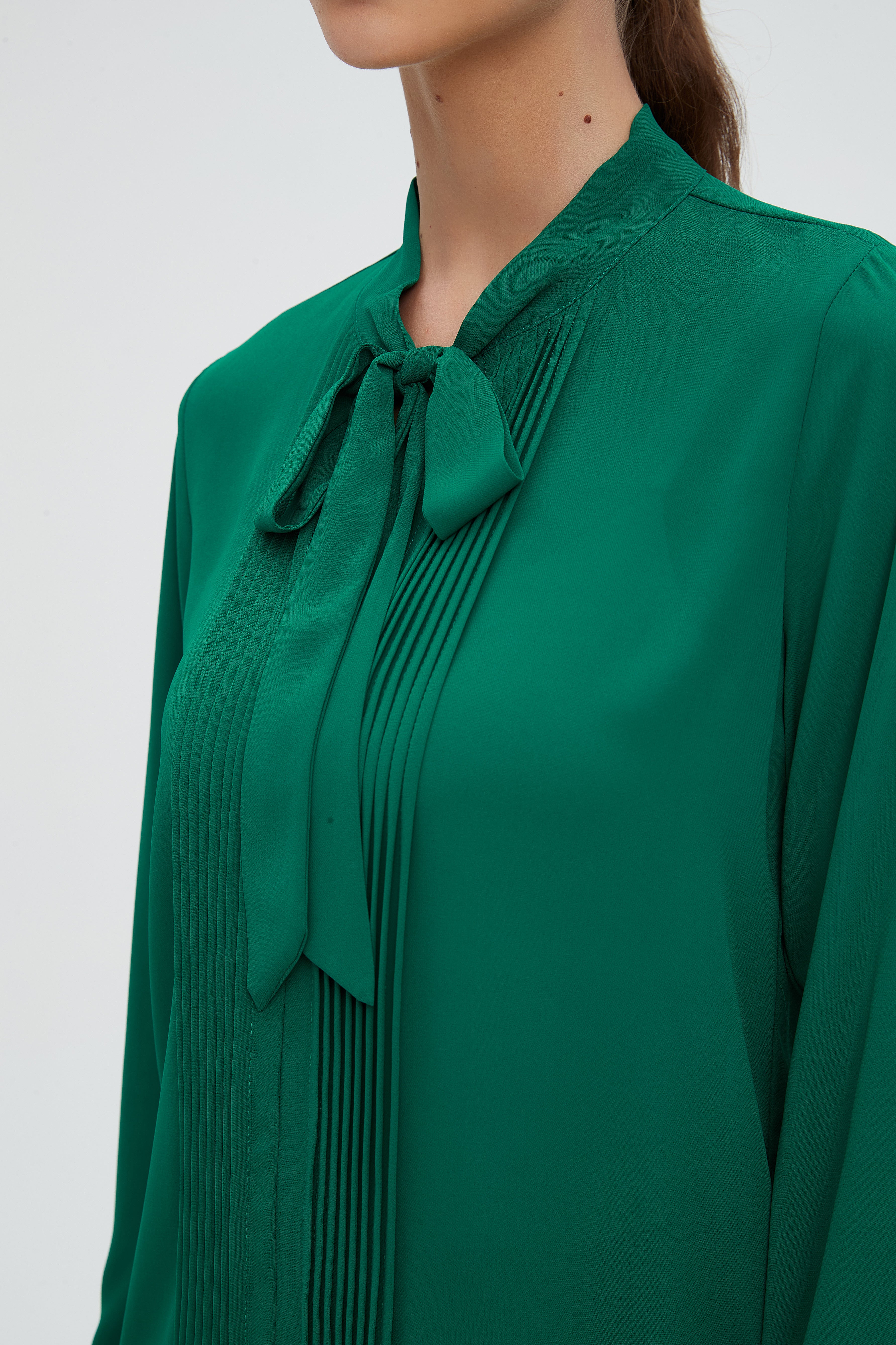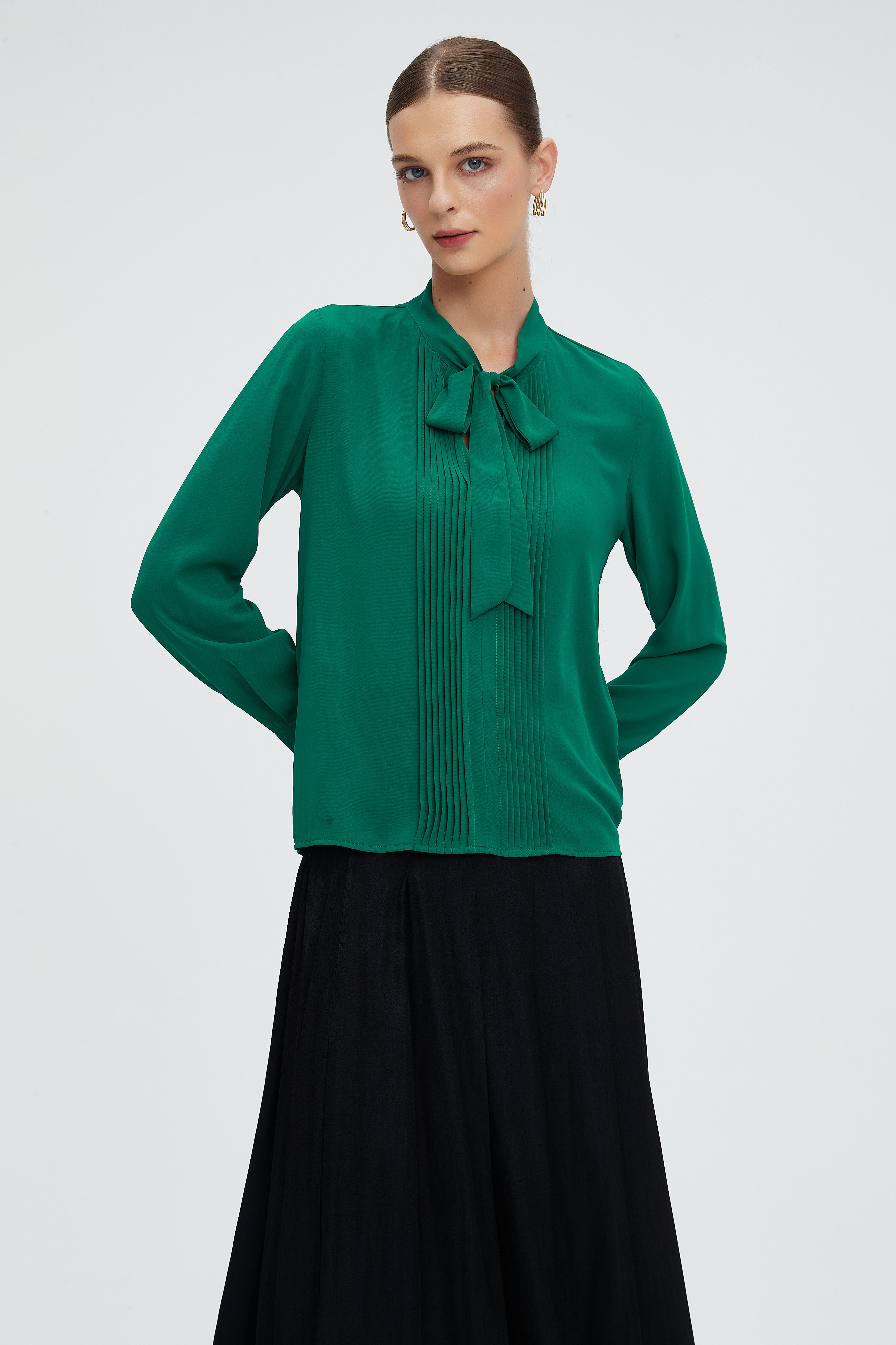 بلوزة سادة بكسرات أمامية وربطة عنق بأكمام طويلة
