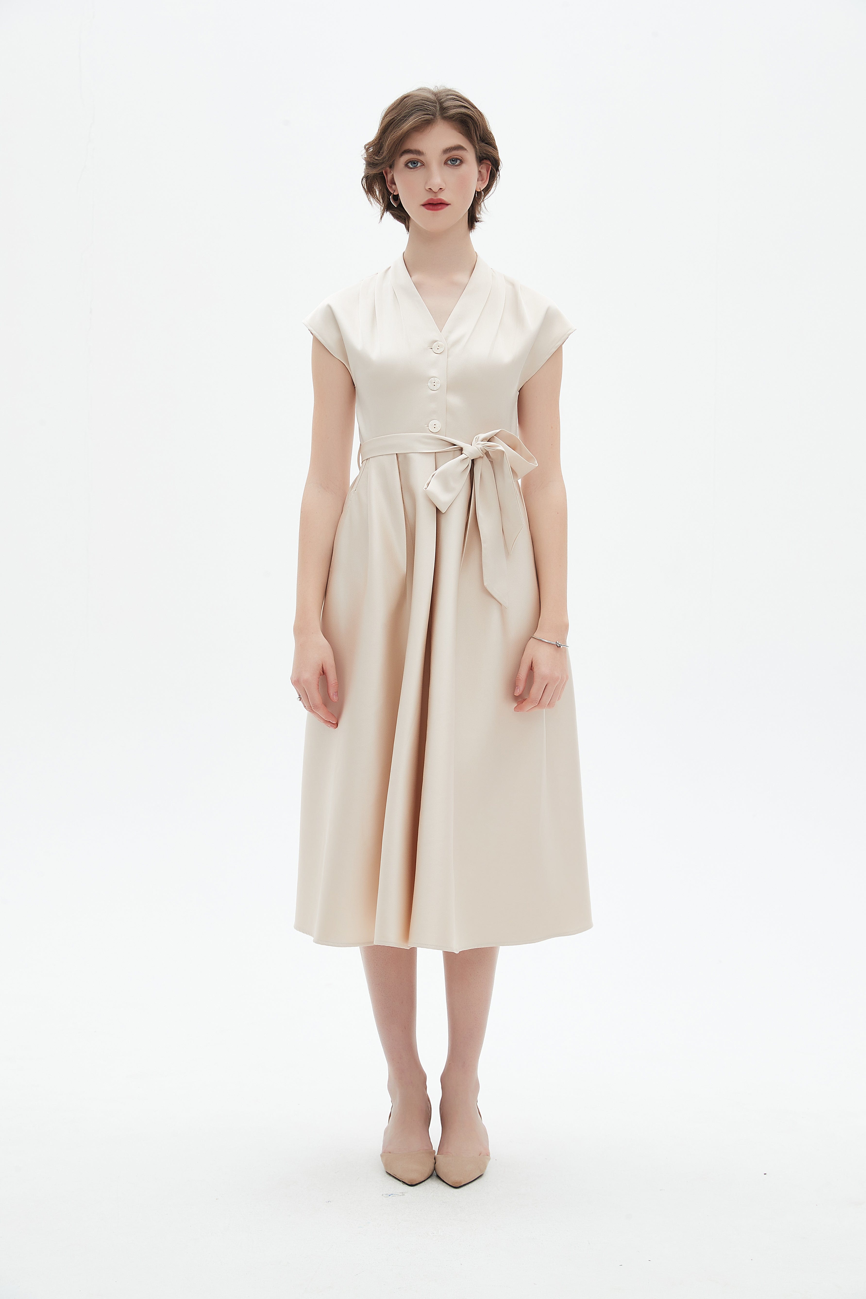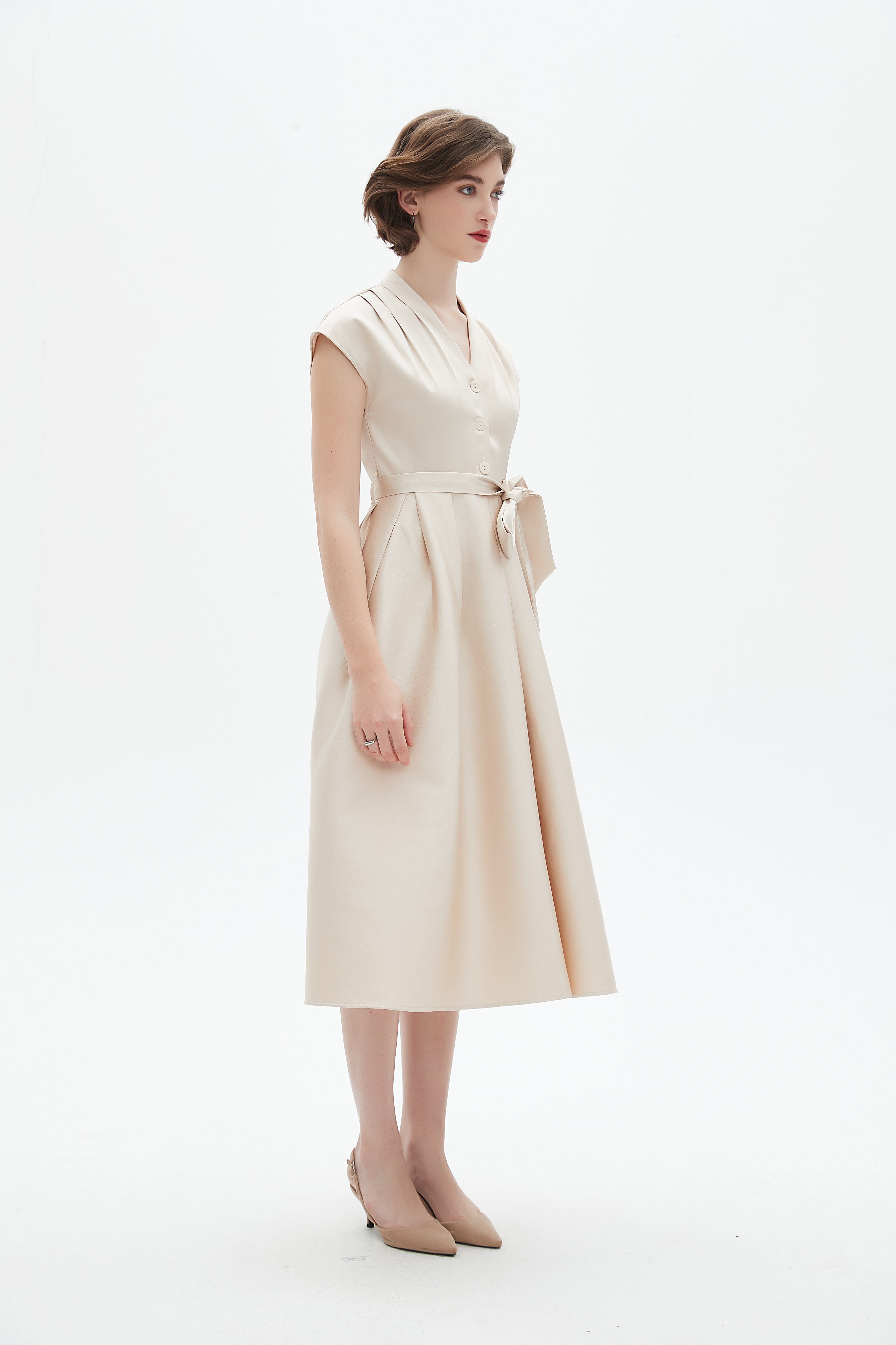 - التنسيق: نسقيه مع صندل مسطح لنهار كاجوال أو كعب منخفض لعشاء بسيط. أضيفي سترة خفيفة أو كارديغان للمرونة في كل المواسم، والحزام المرفق يبرز الخصر لإطلالة أكثر أنوثة.