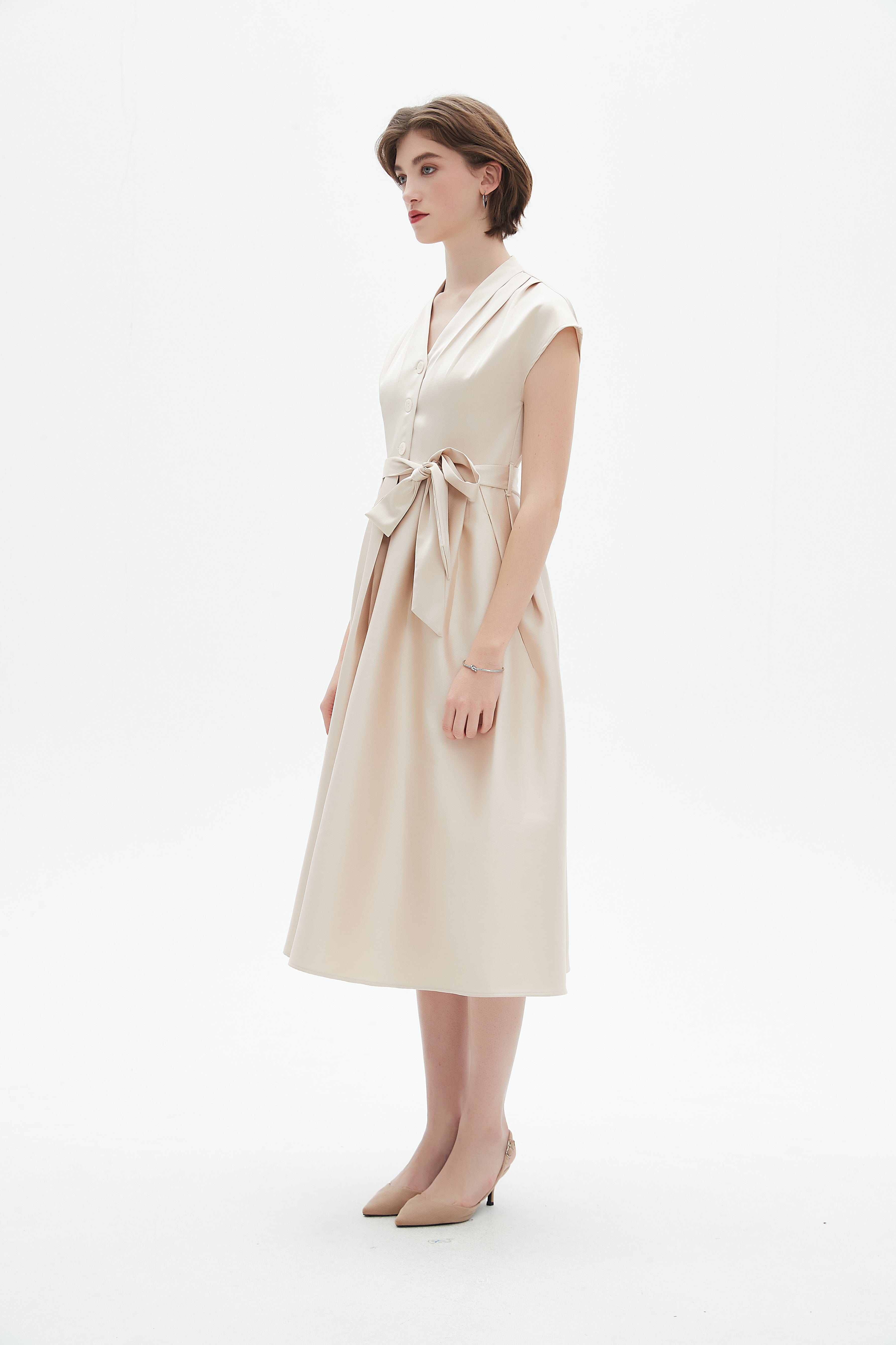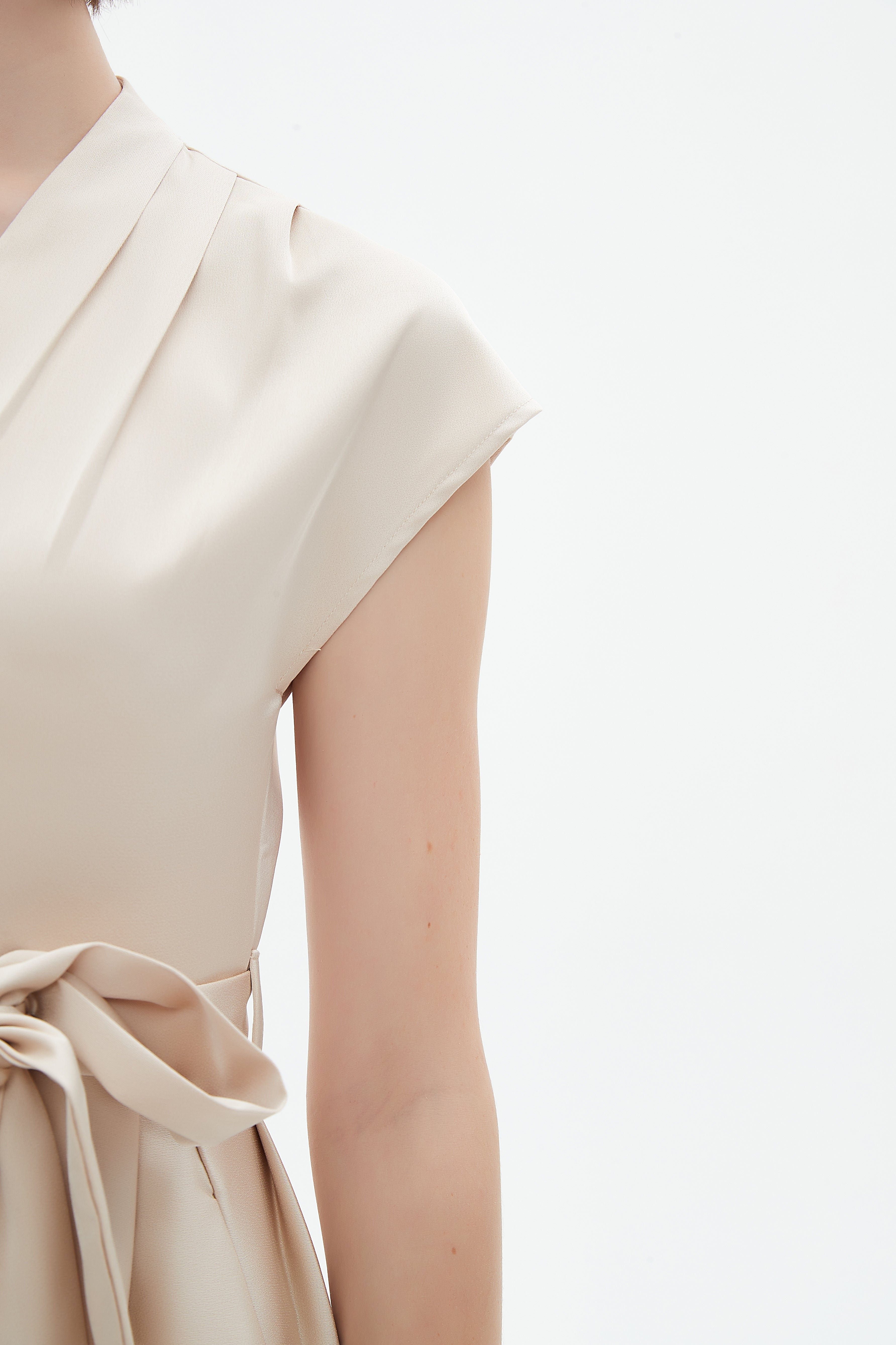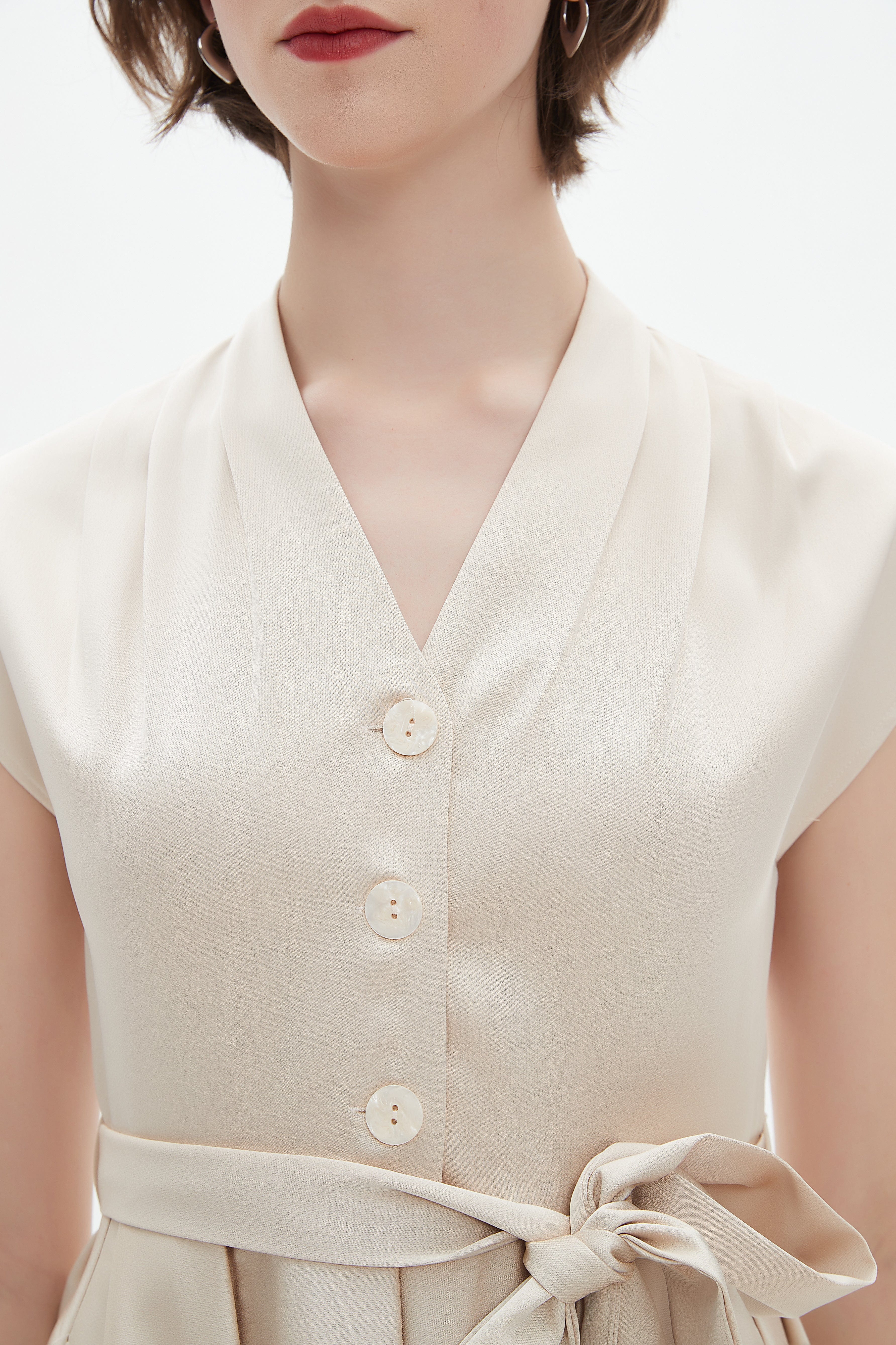 - ياقة V وأكمام قصيرة مغطاة لمظهر ناعم