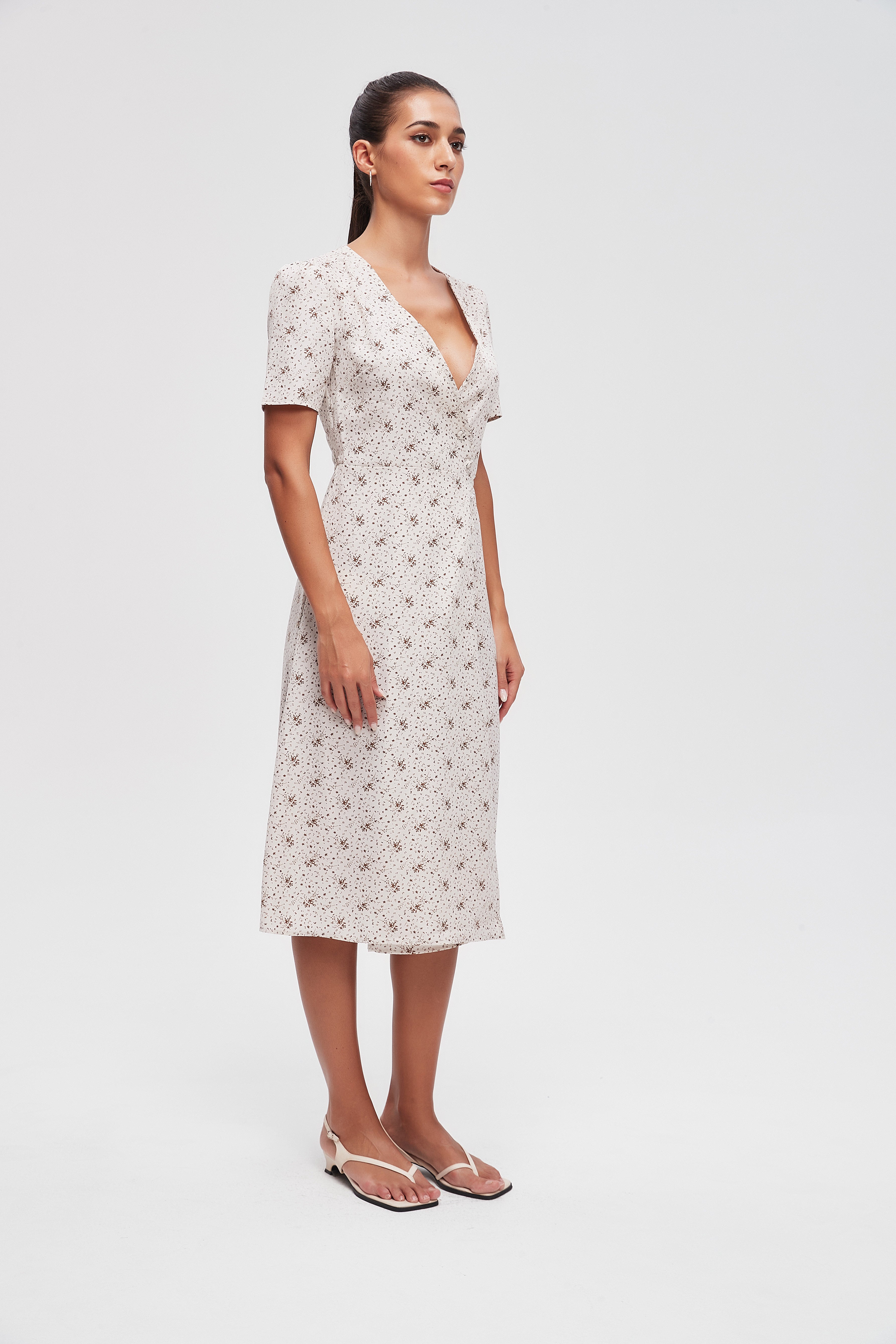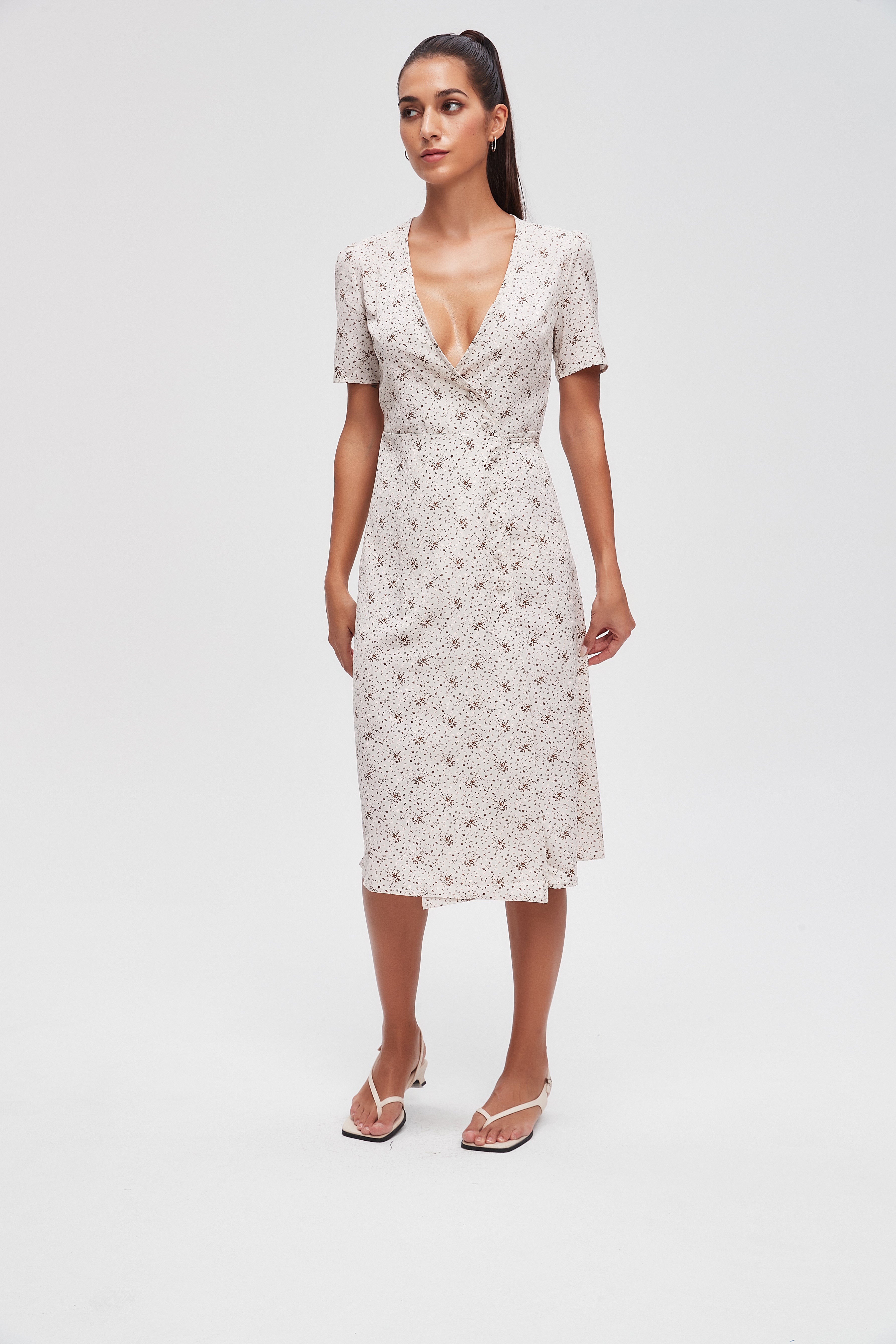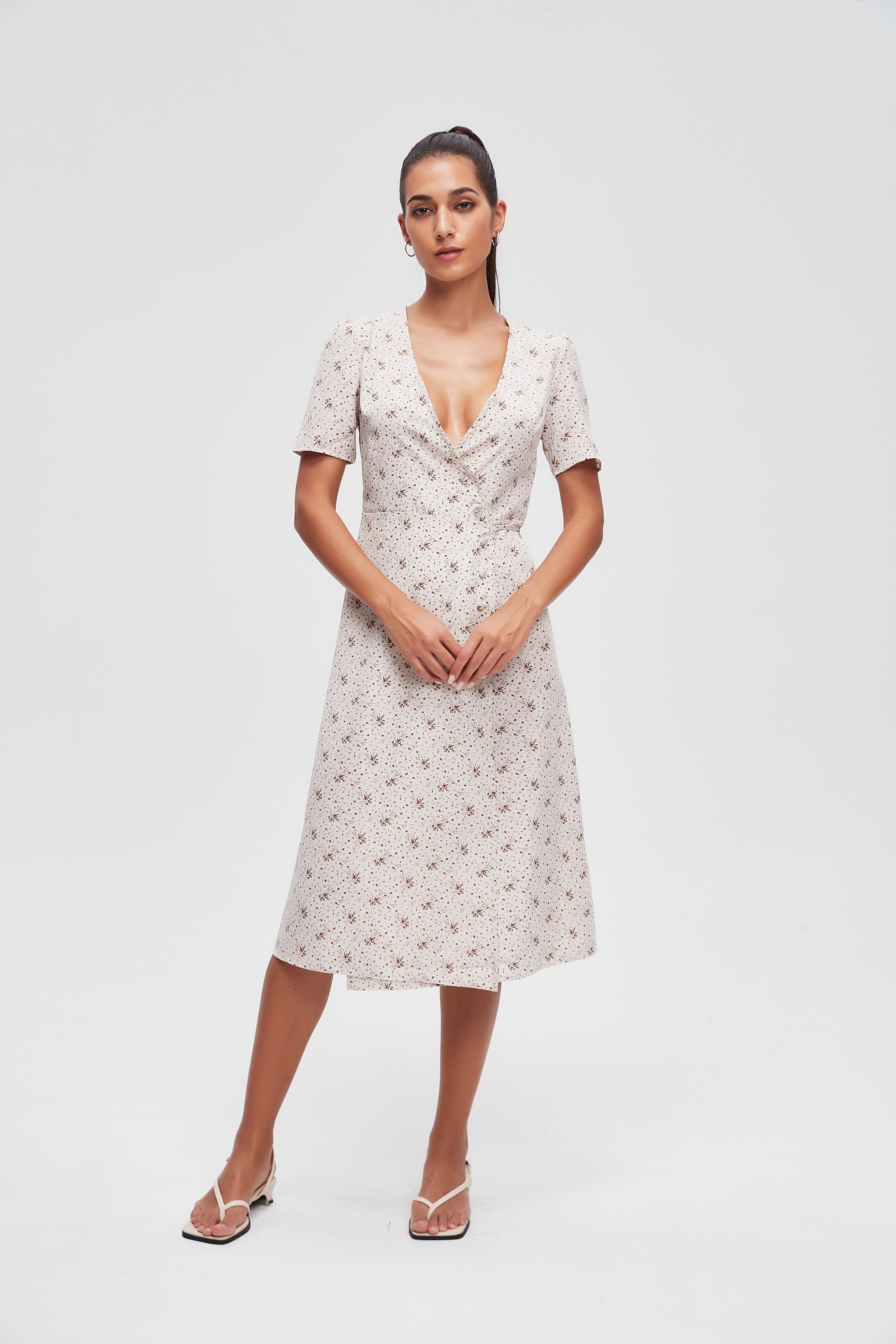 فستان مورد نصف كم بقصة لف بفتحة رقبة V