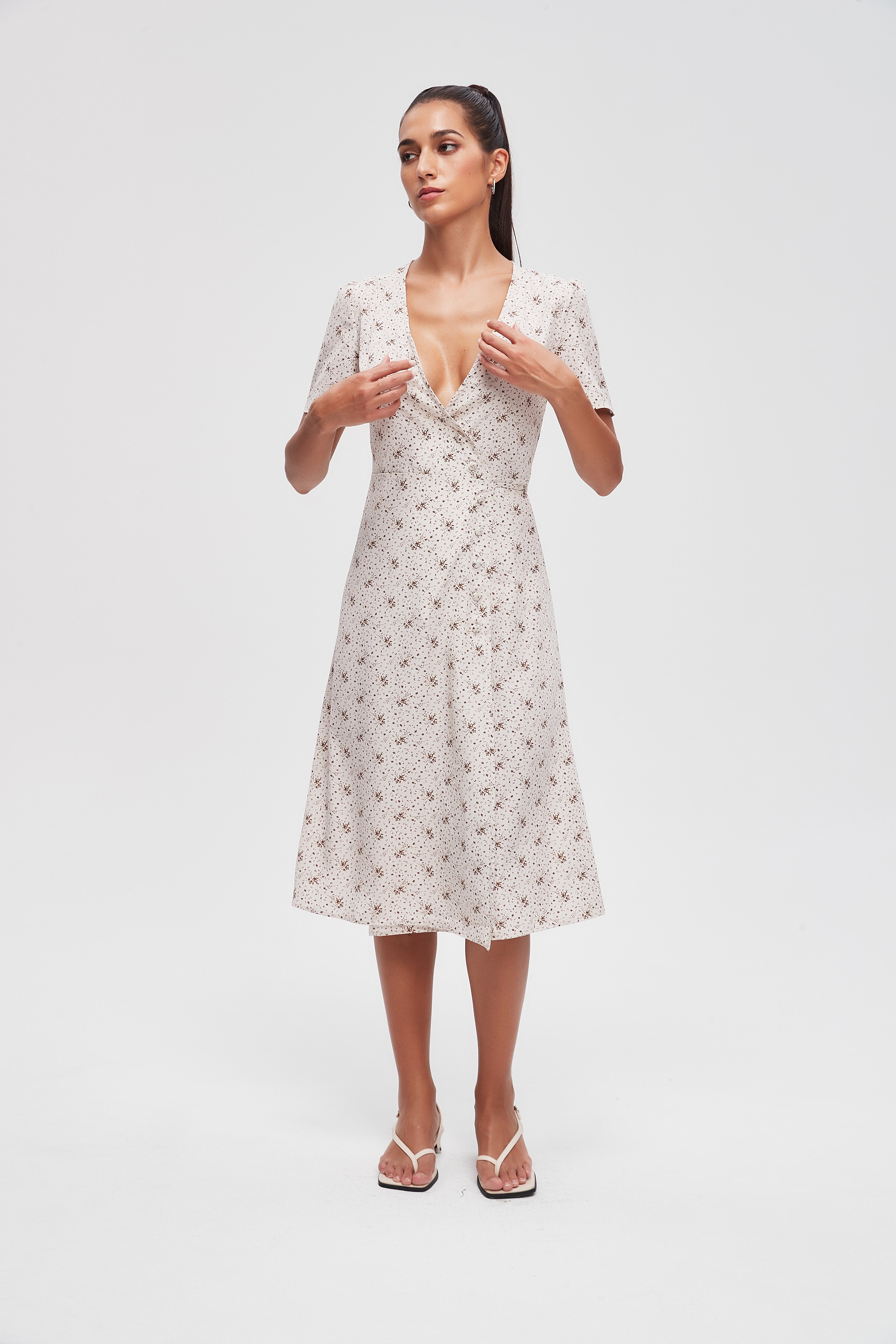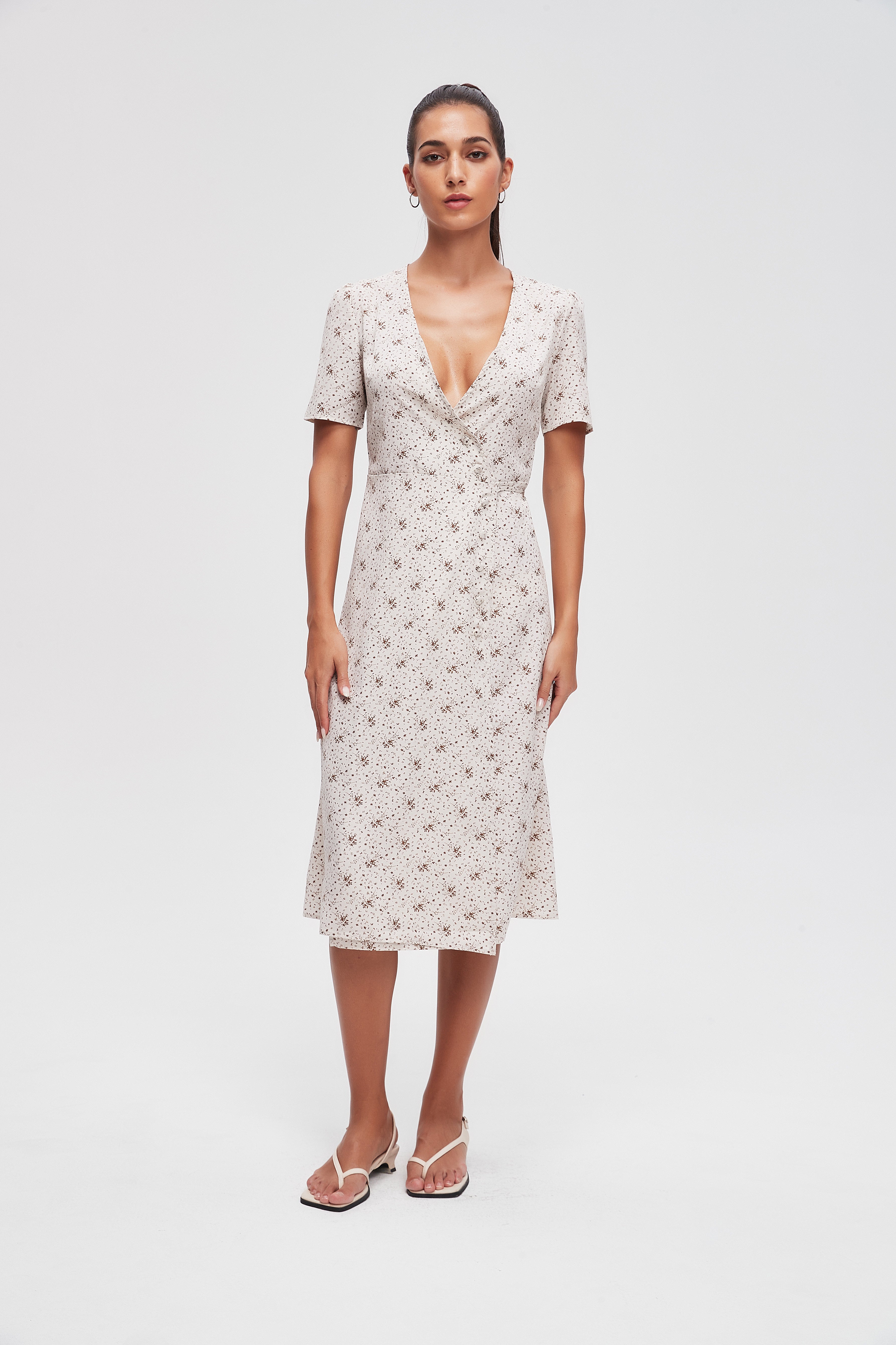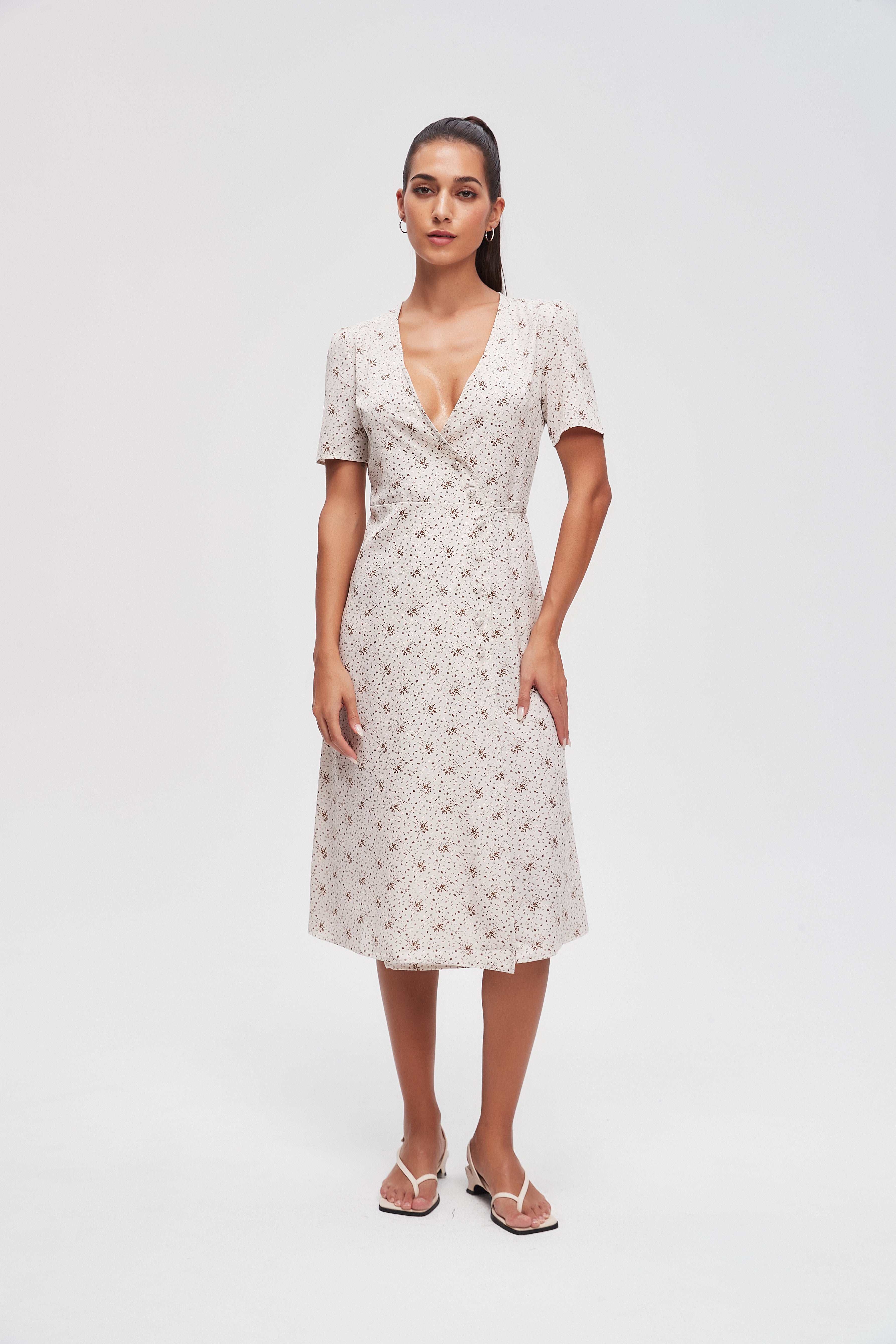 فستان مورد نصف كم بقصة لف بفتحة رقبة V