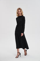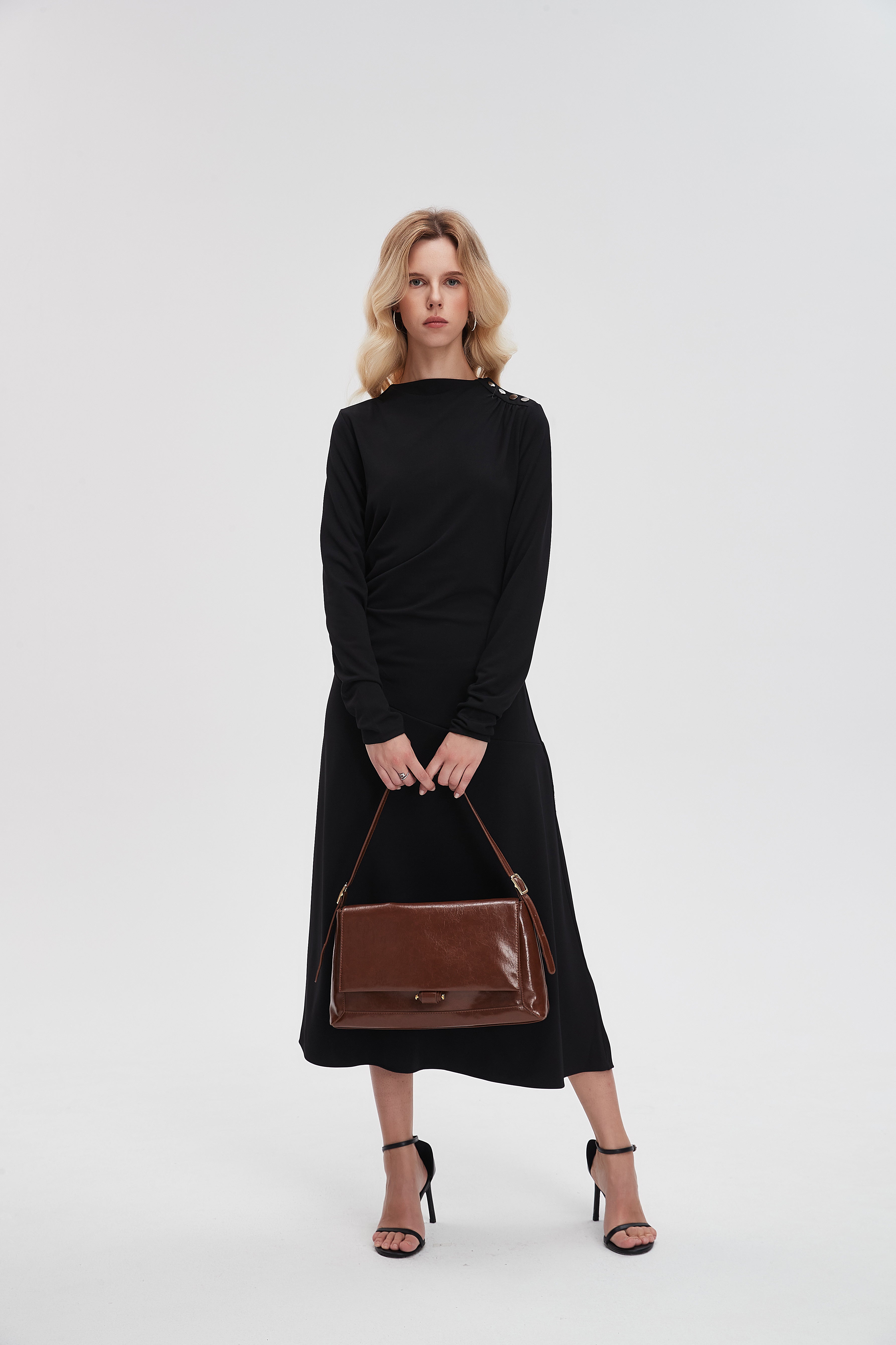 فستان ميدي ساده بأكمام طويله بزراير من عند الاكتاف