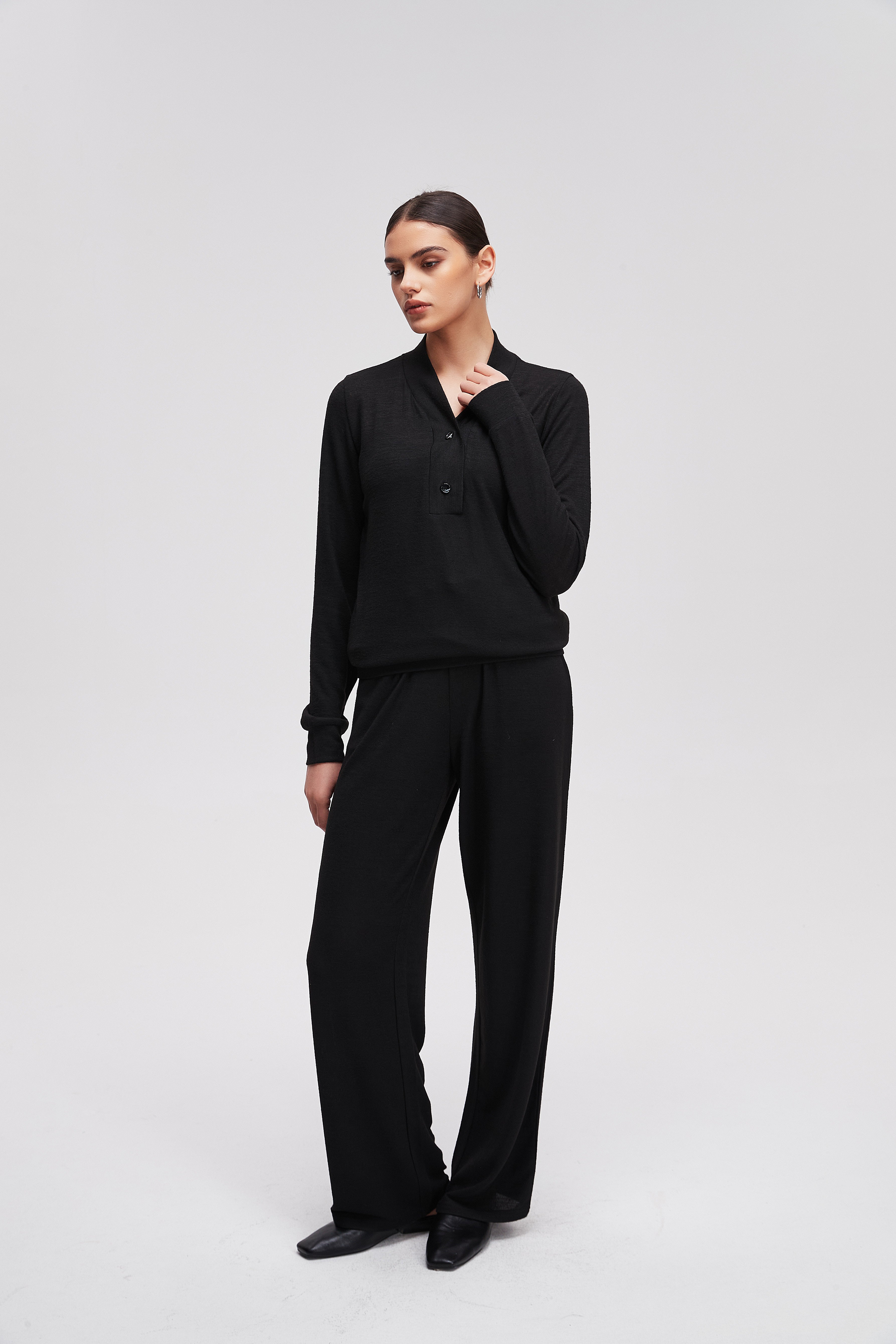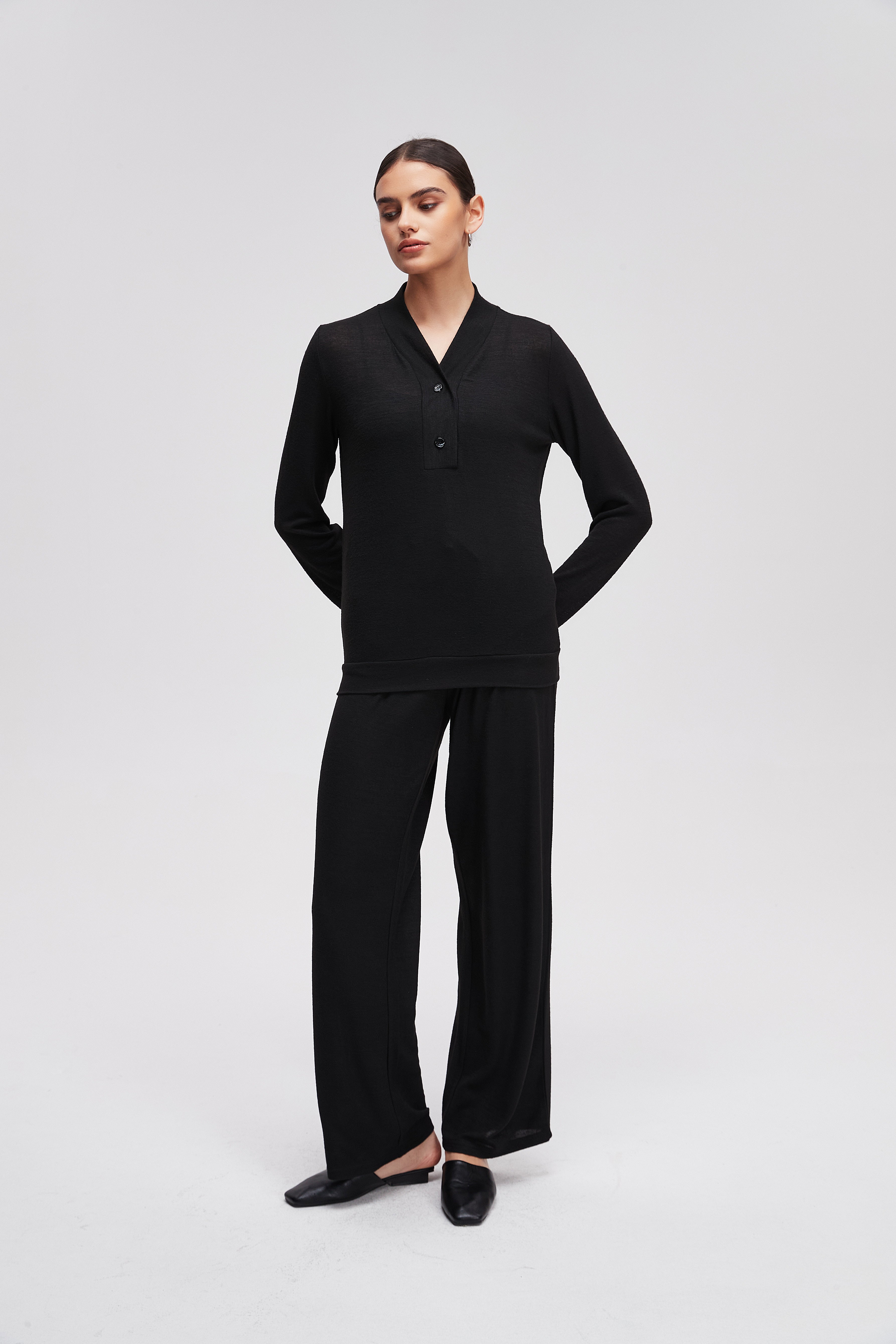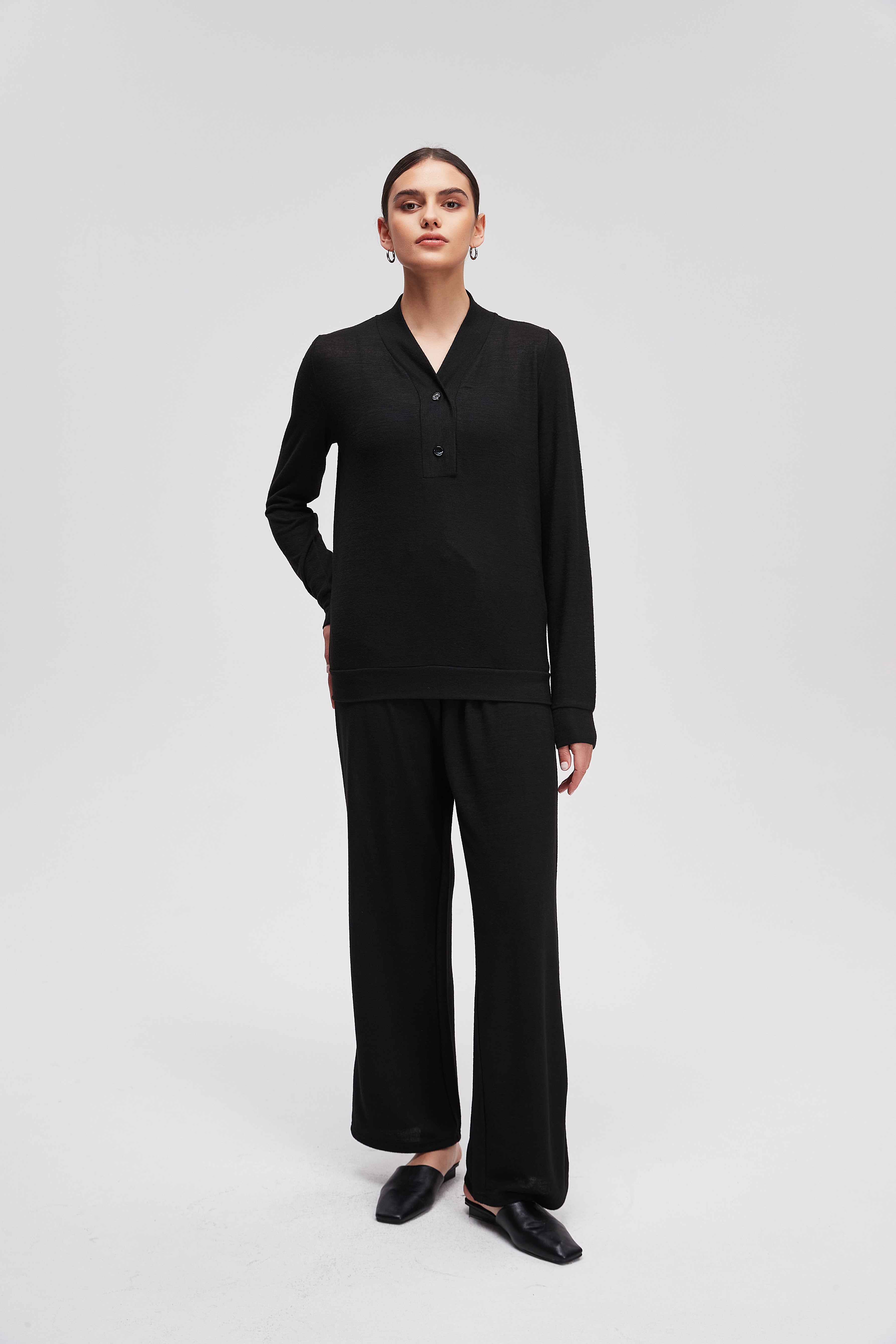 بيجامة بكم طويل وبنطلون برجل واسعة سادة
