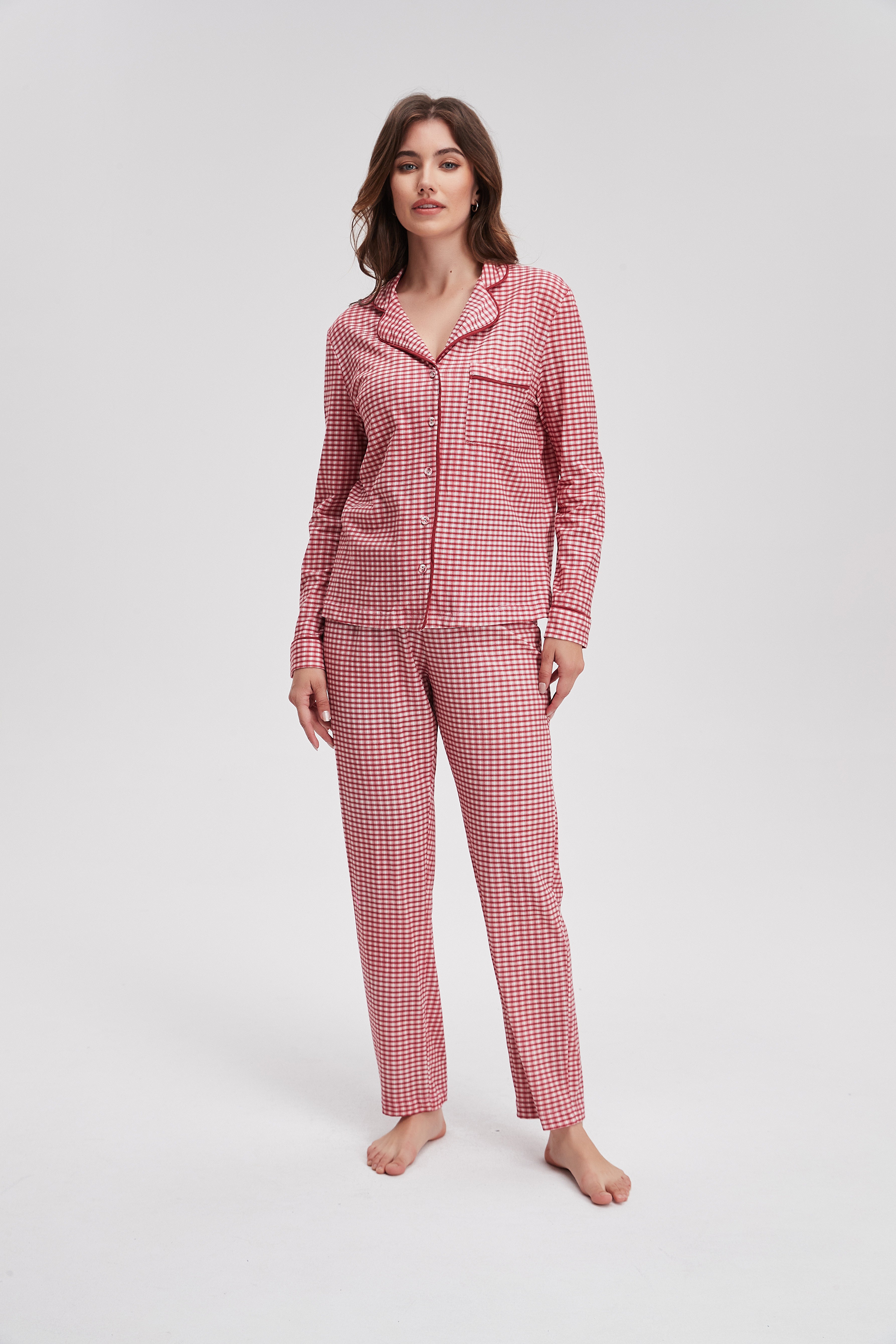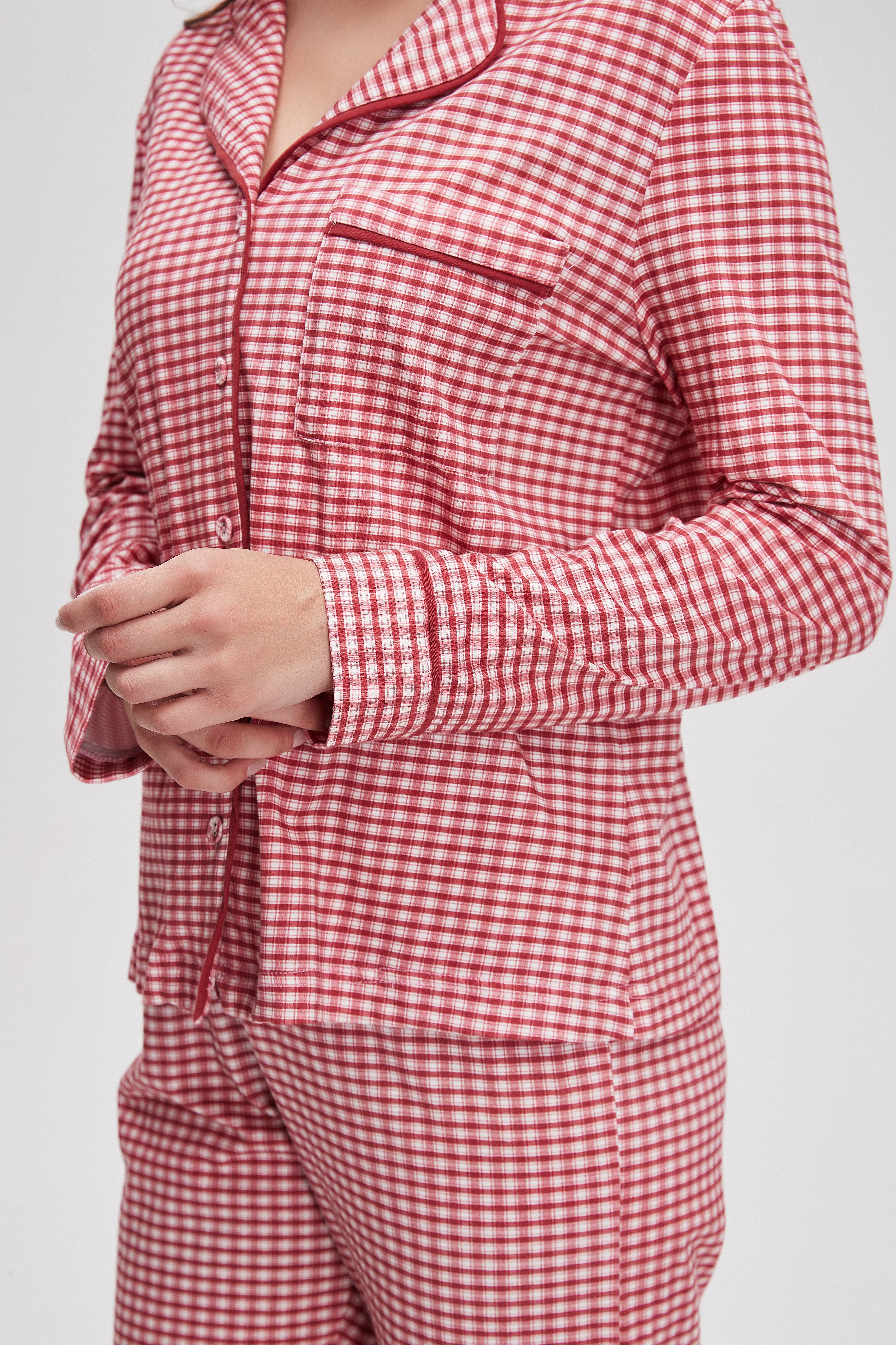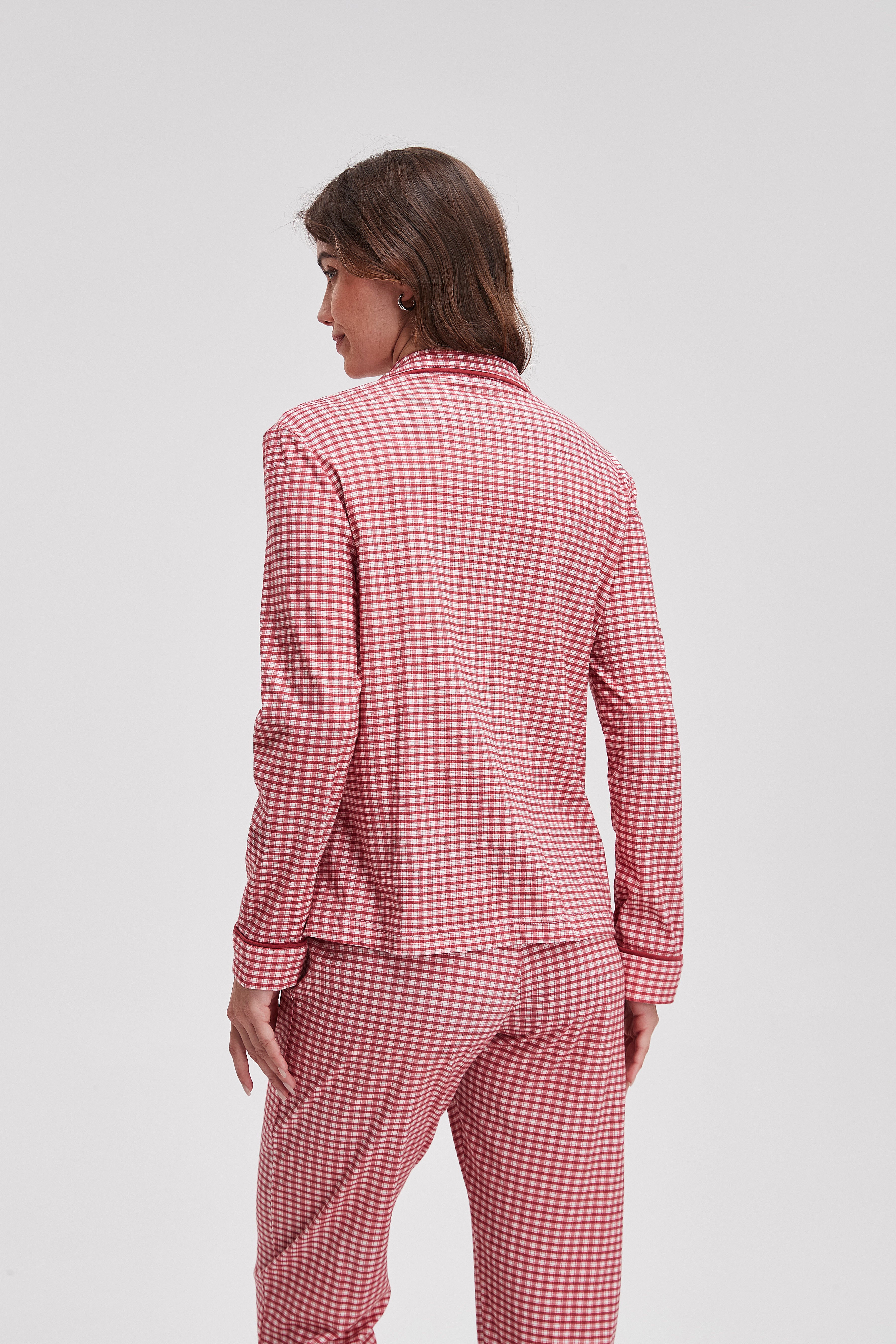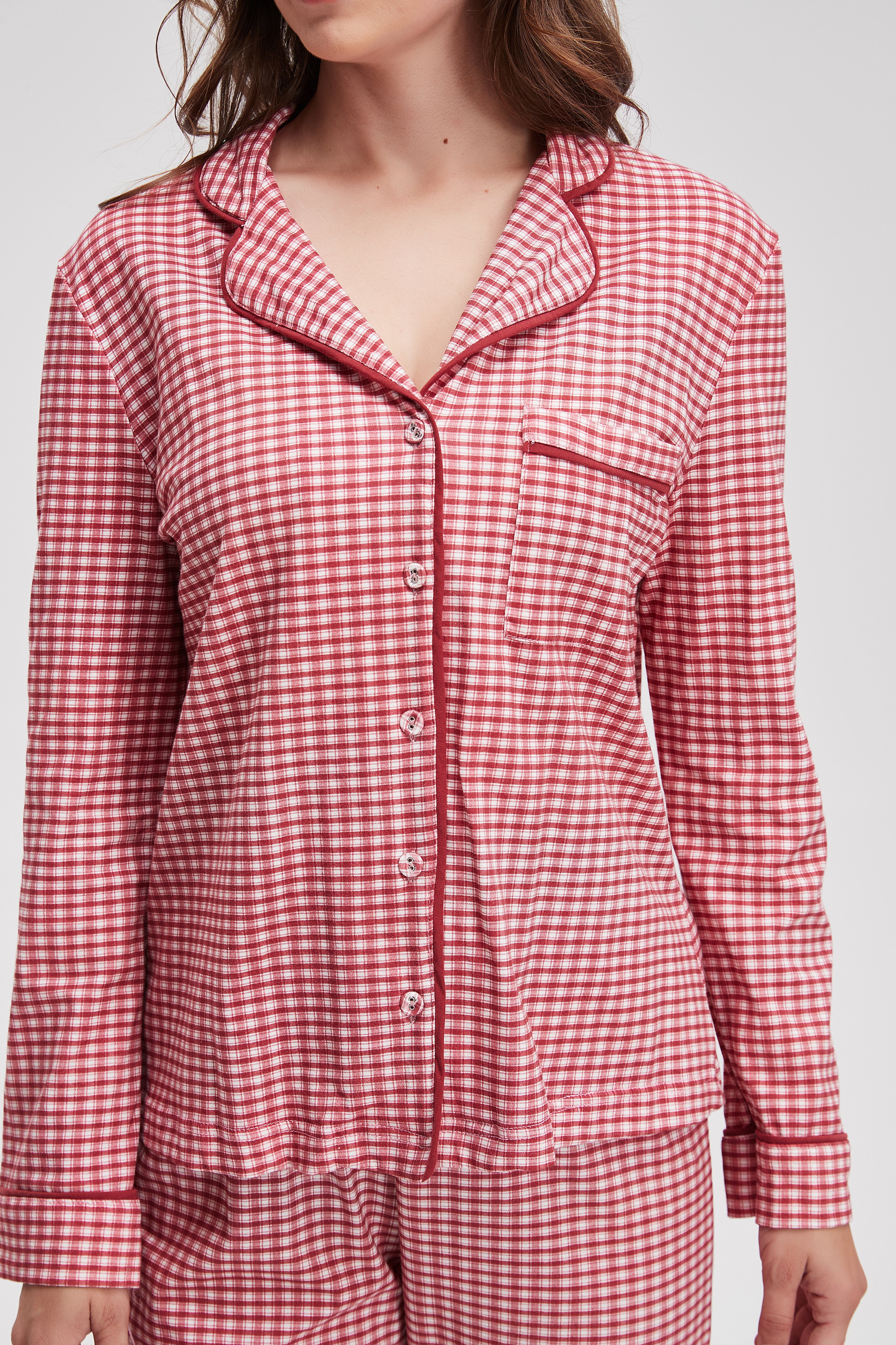 بيجامة كاروهات بأزرار أمامية كم طويل