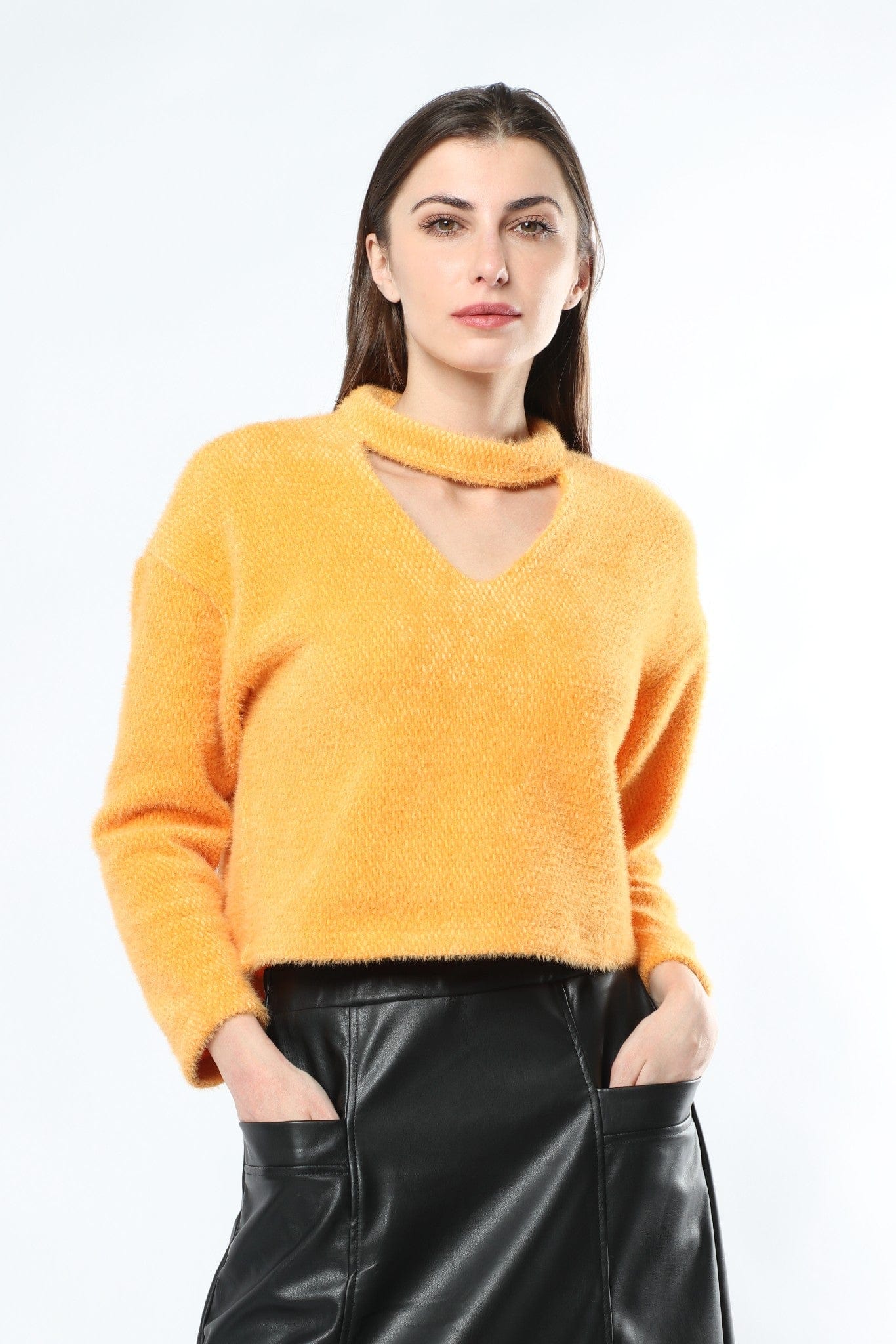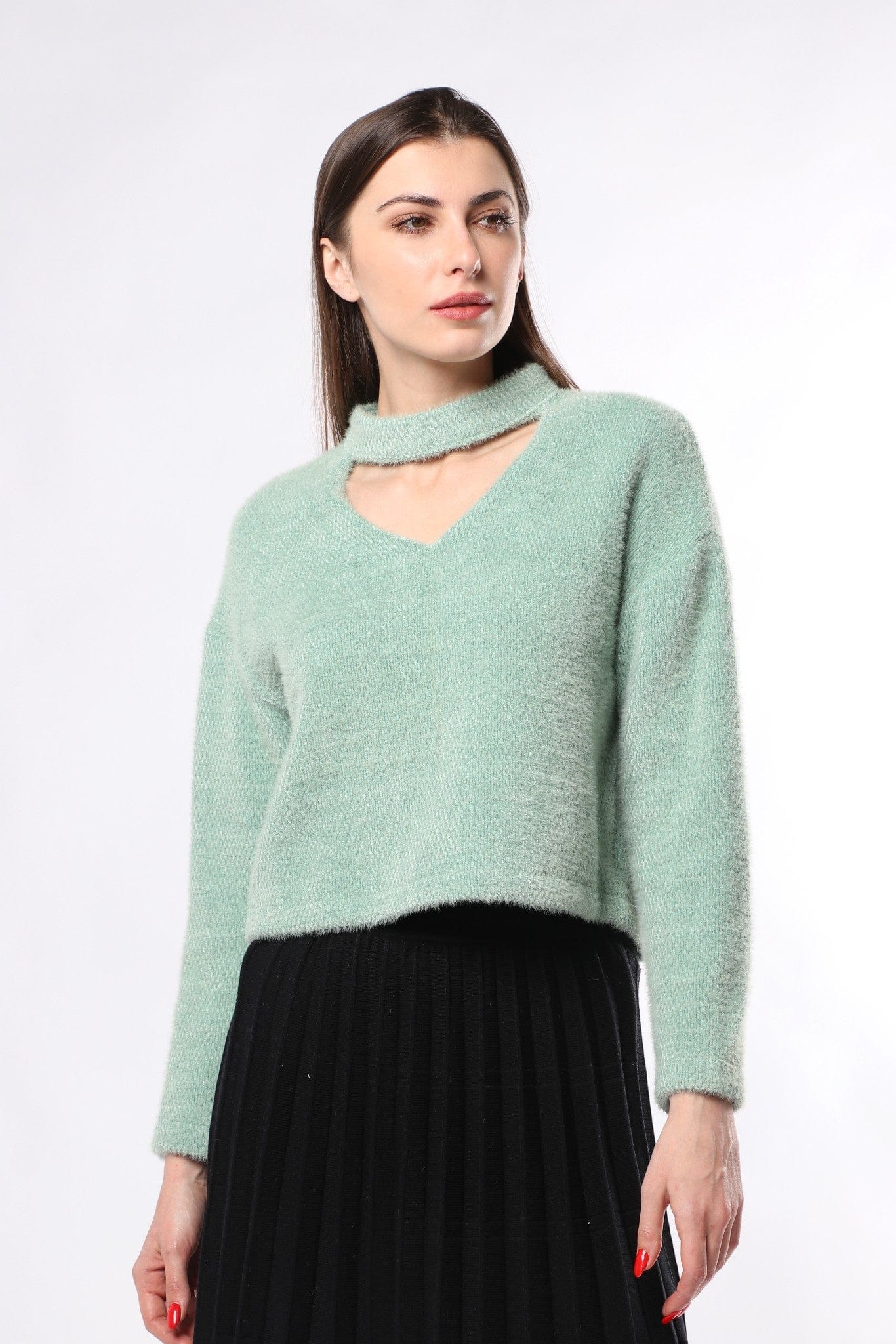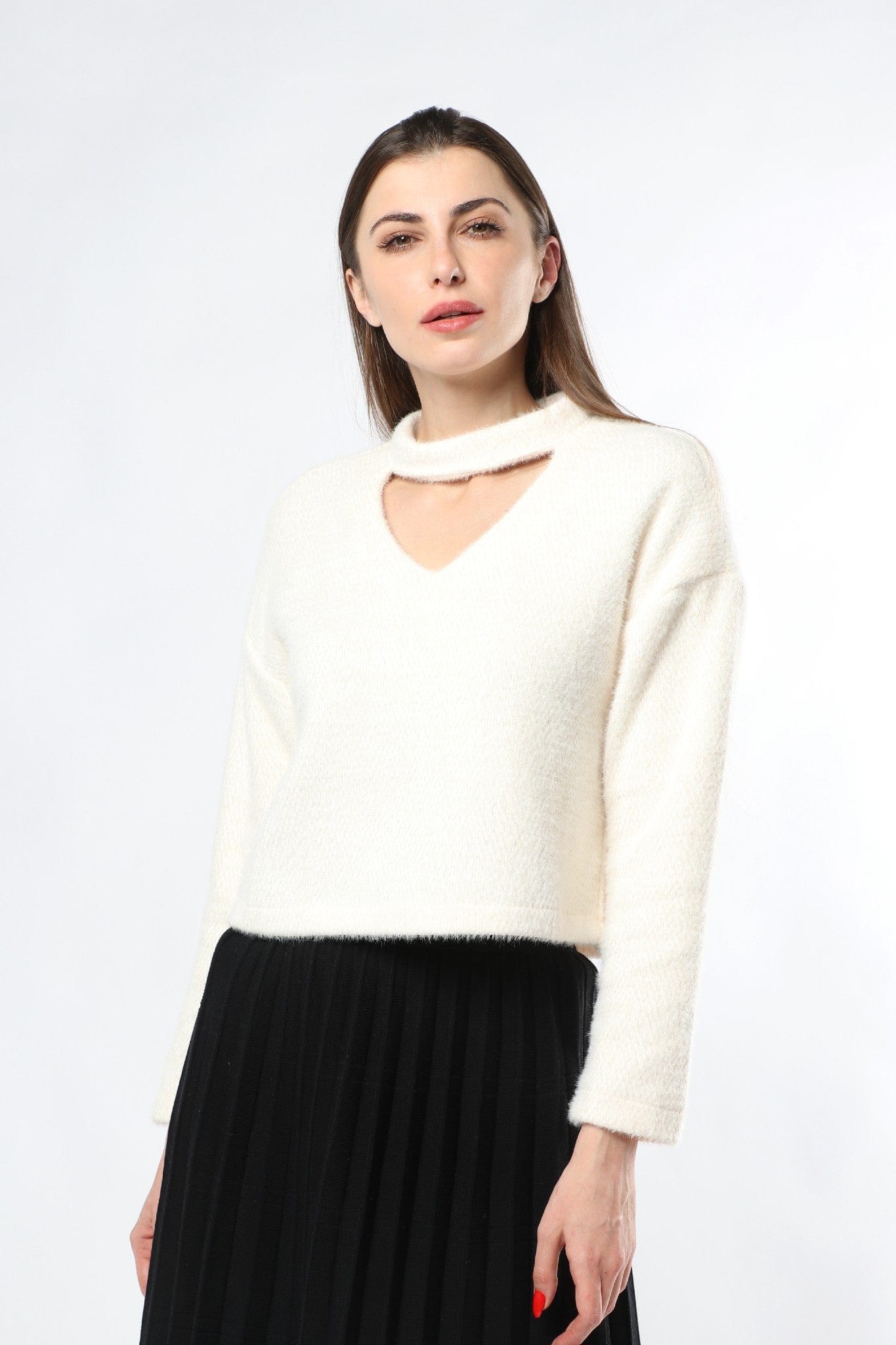 بلوزة بأكمام طويلة سادة بفتحة سبعة قصيرة