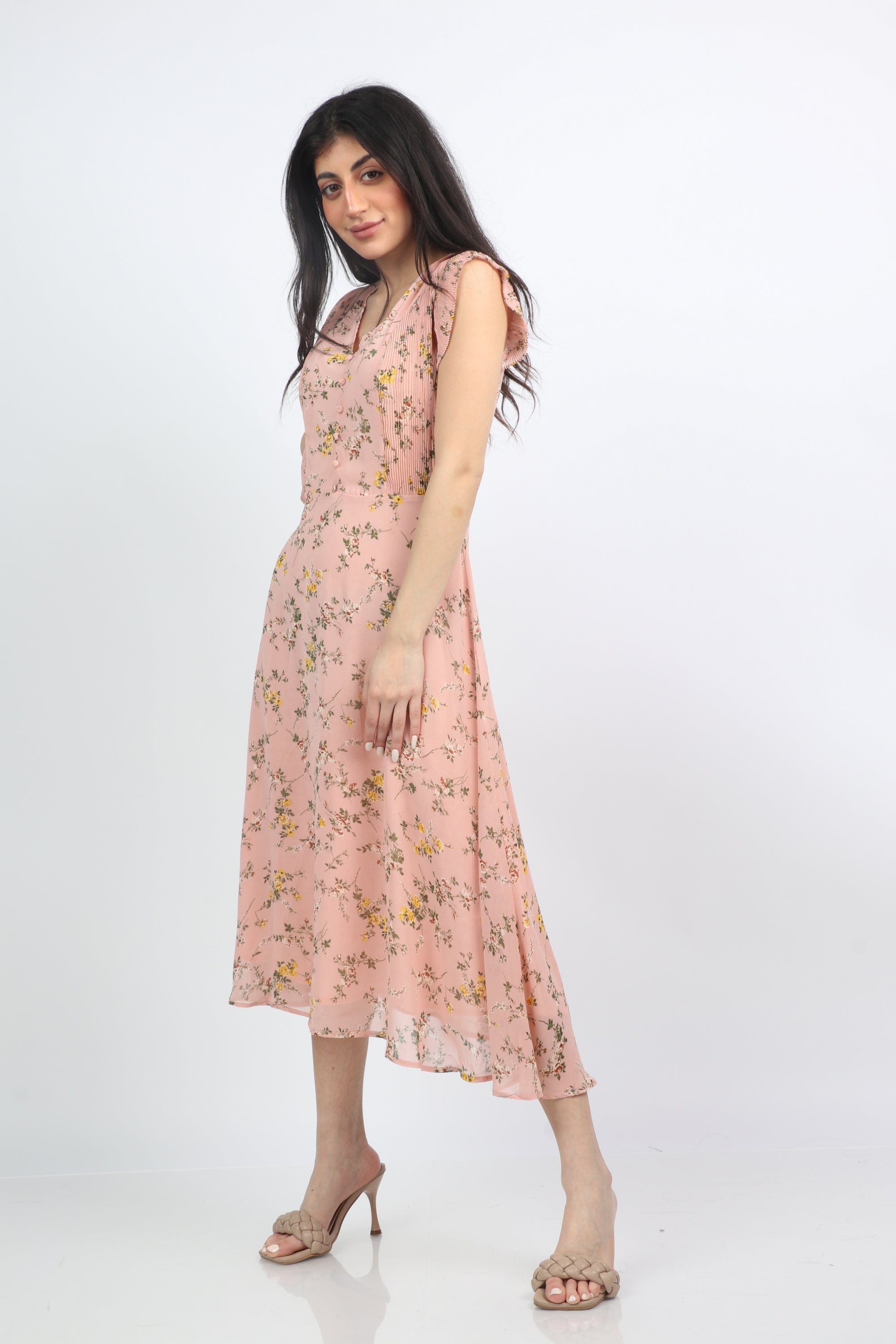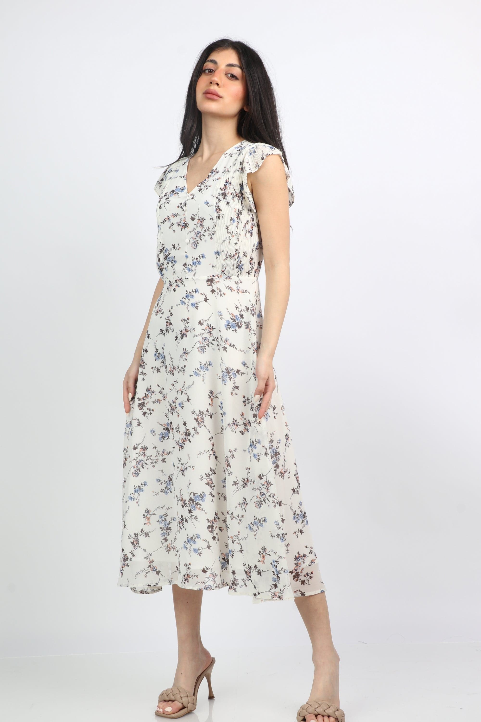 فستان ميدي مشجر مخصر منفوش كم قصير مكشكش