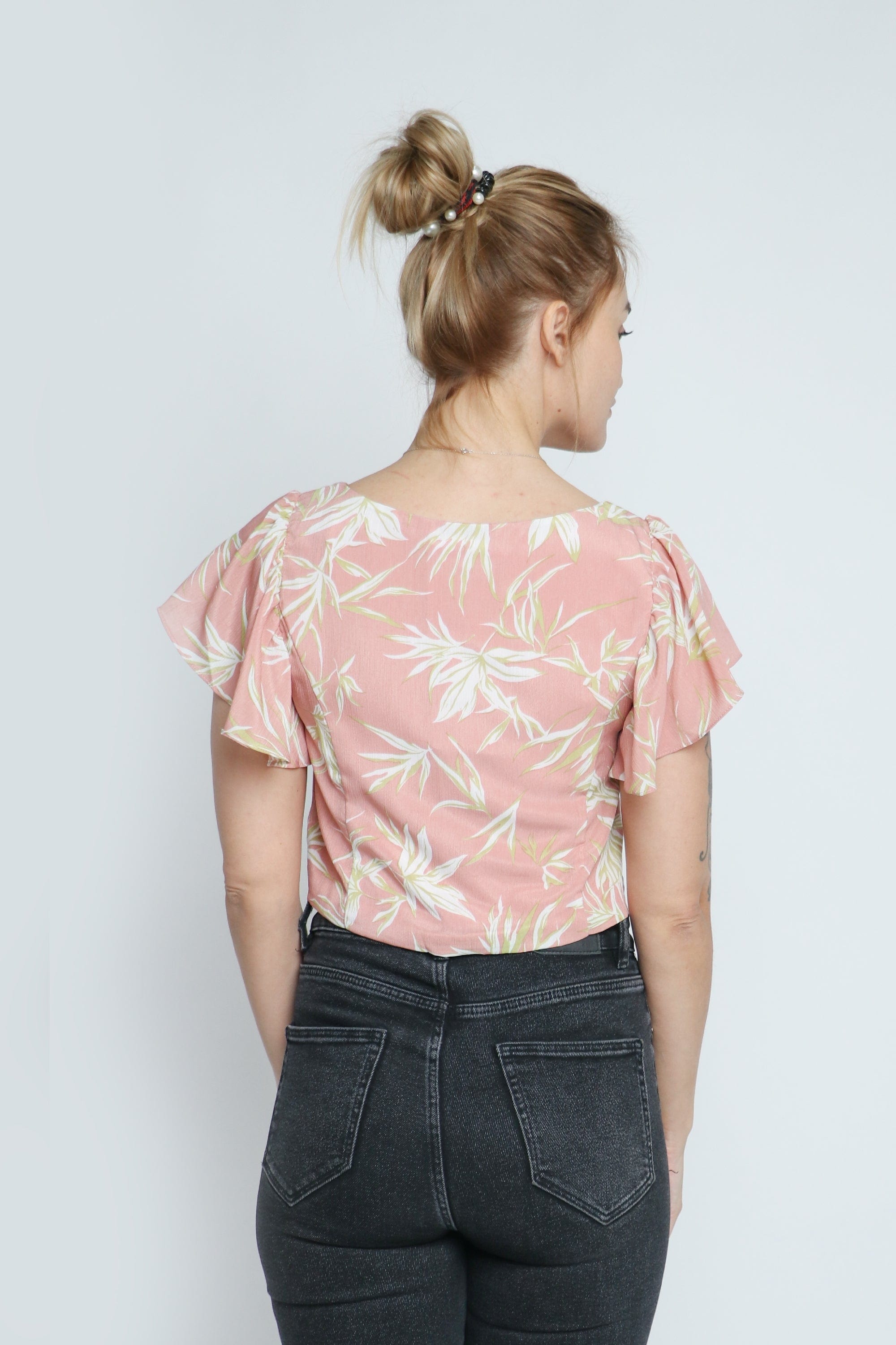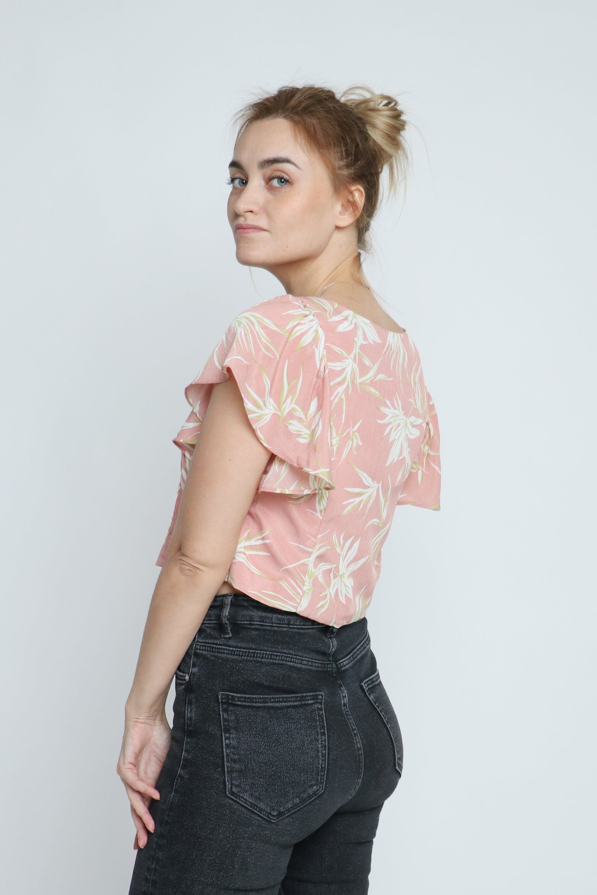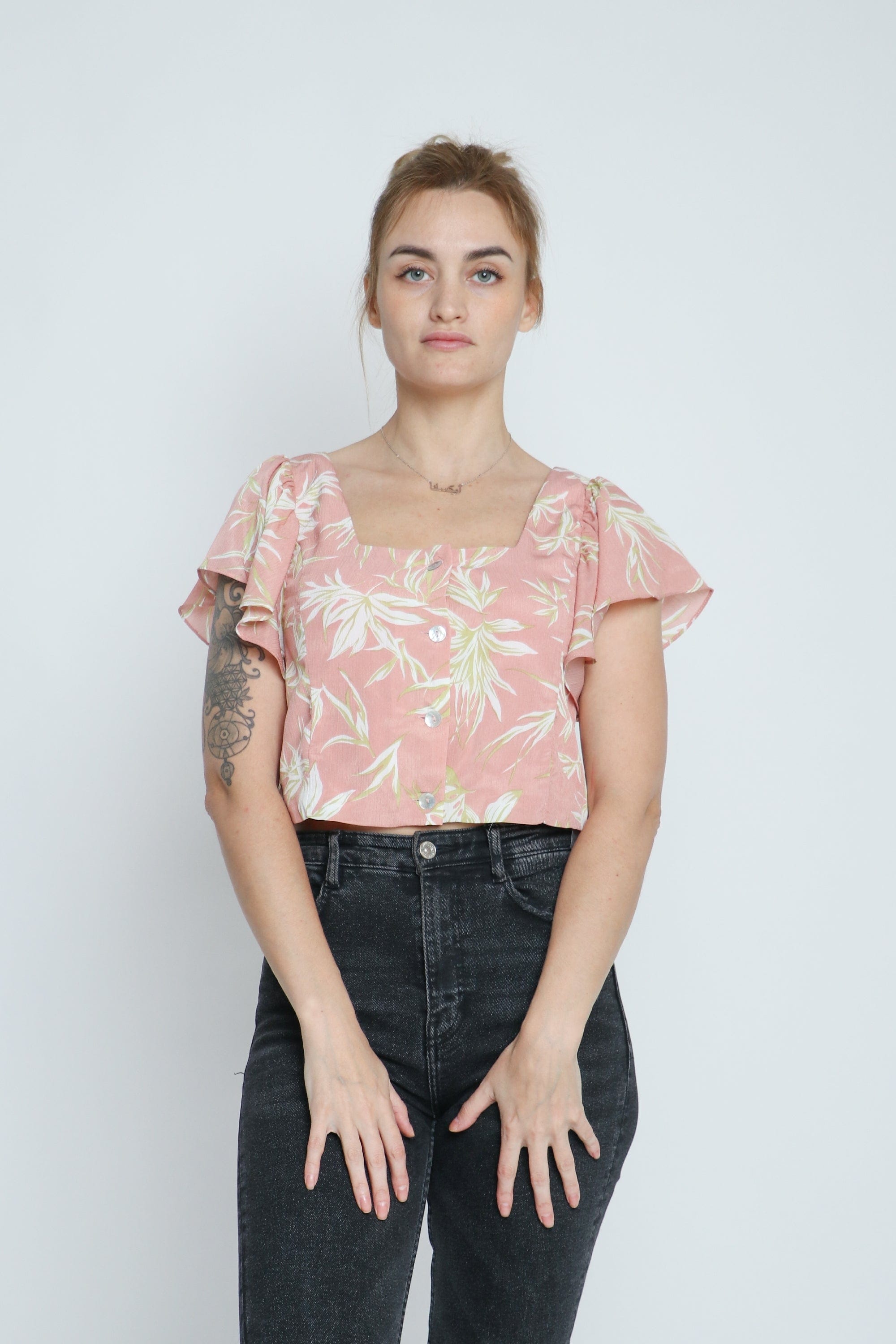 بلوزة مشجرة نص بطن كم قصير مكشكش نسائية
