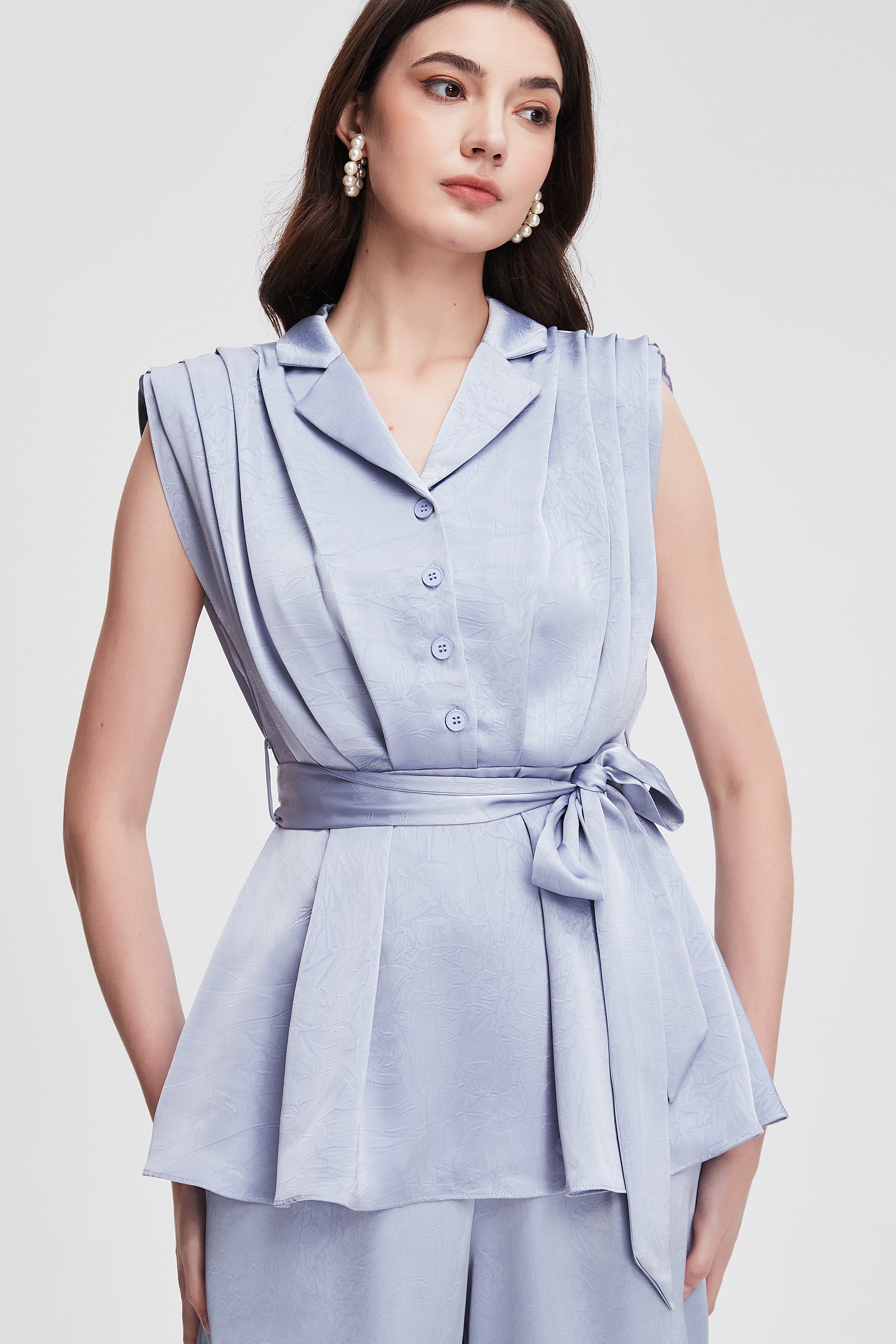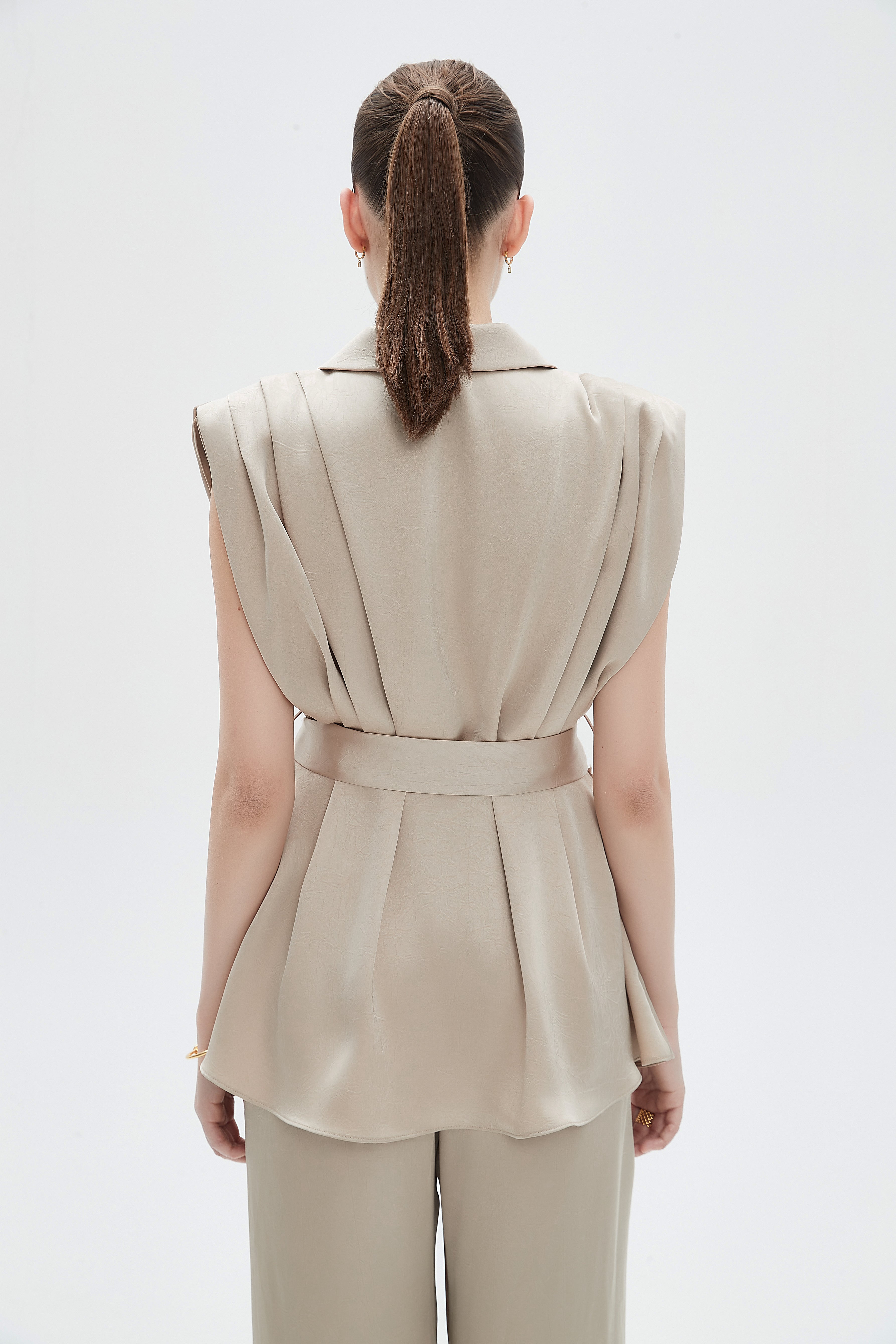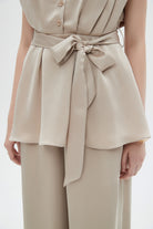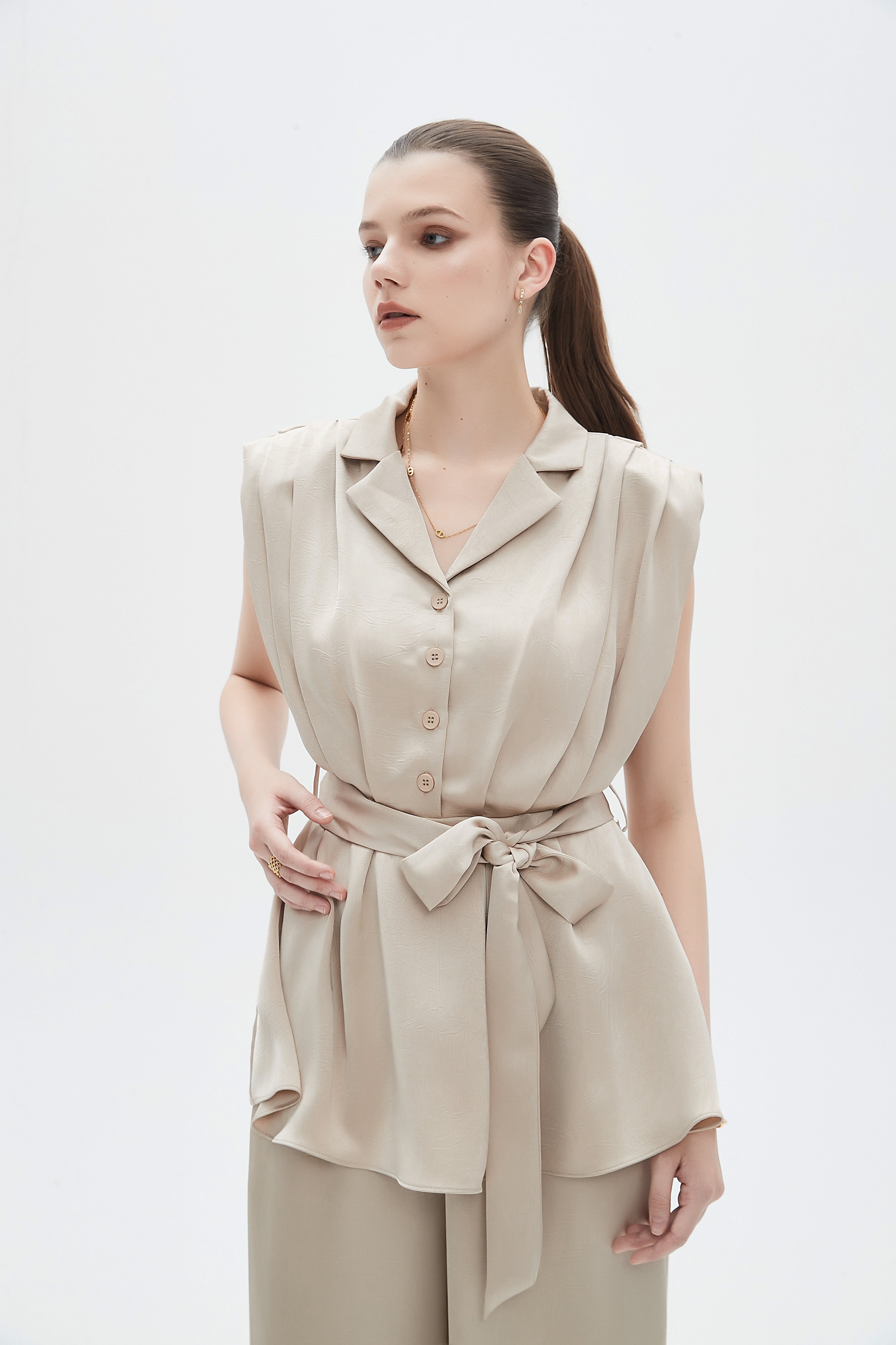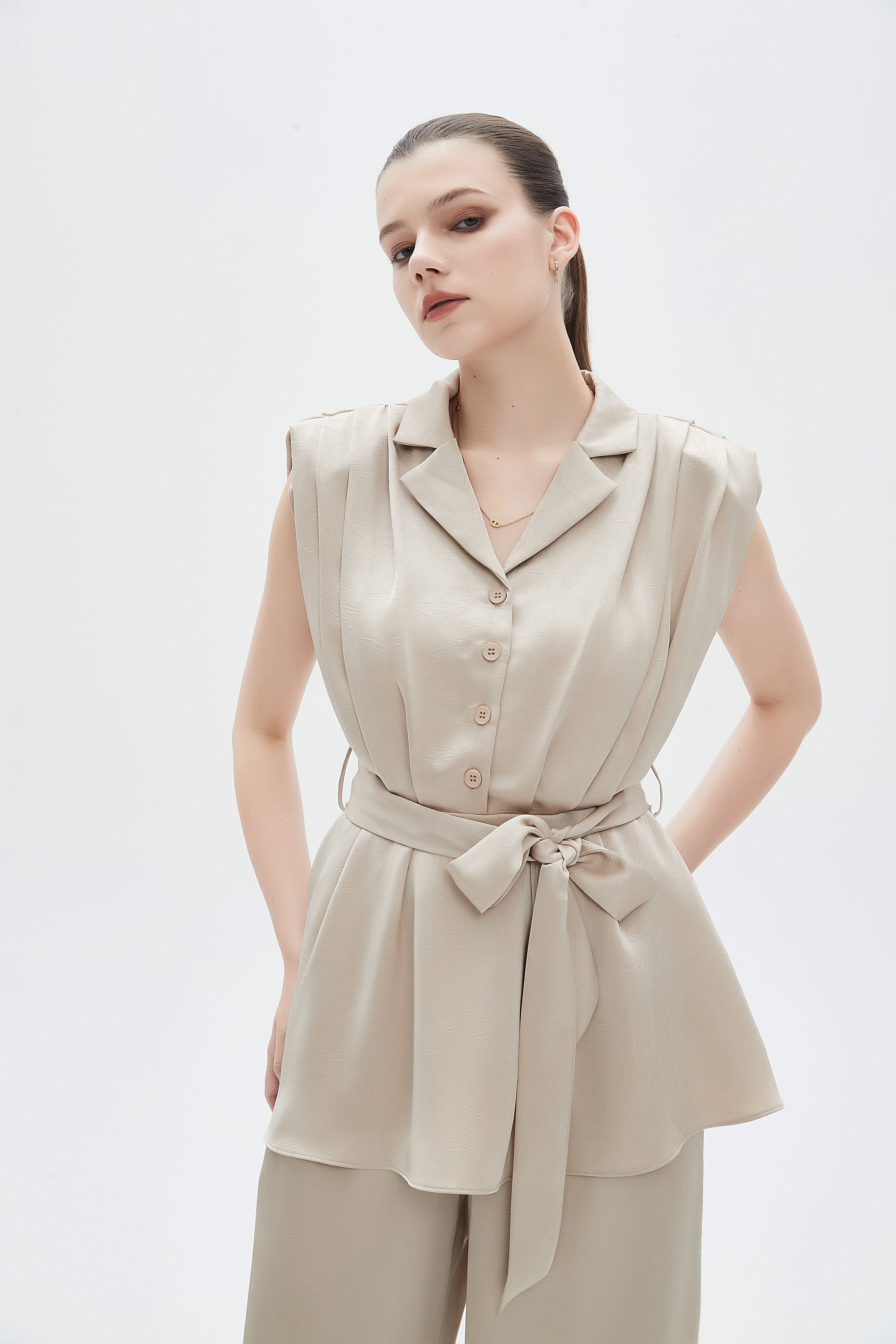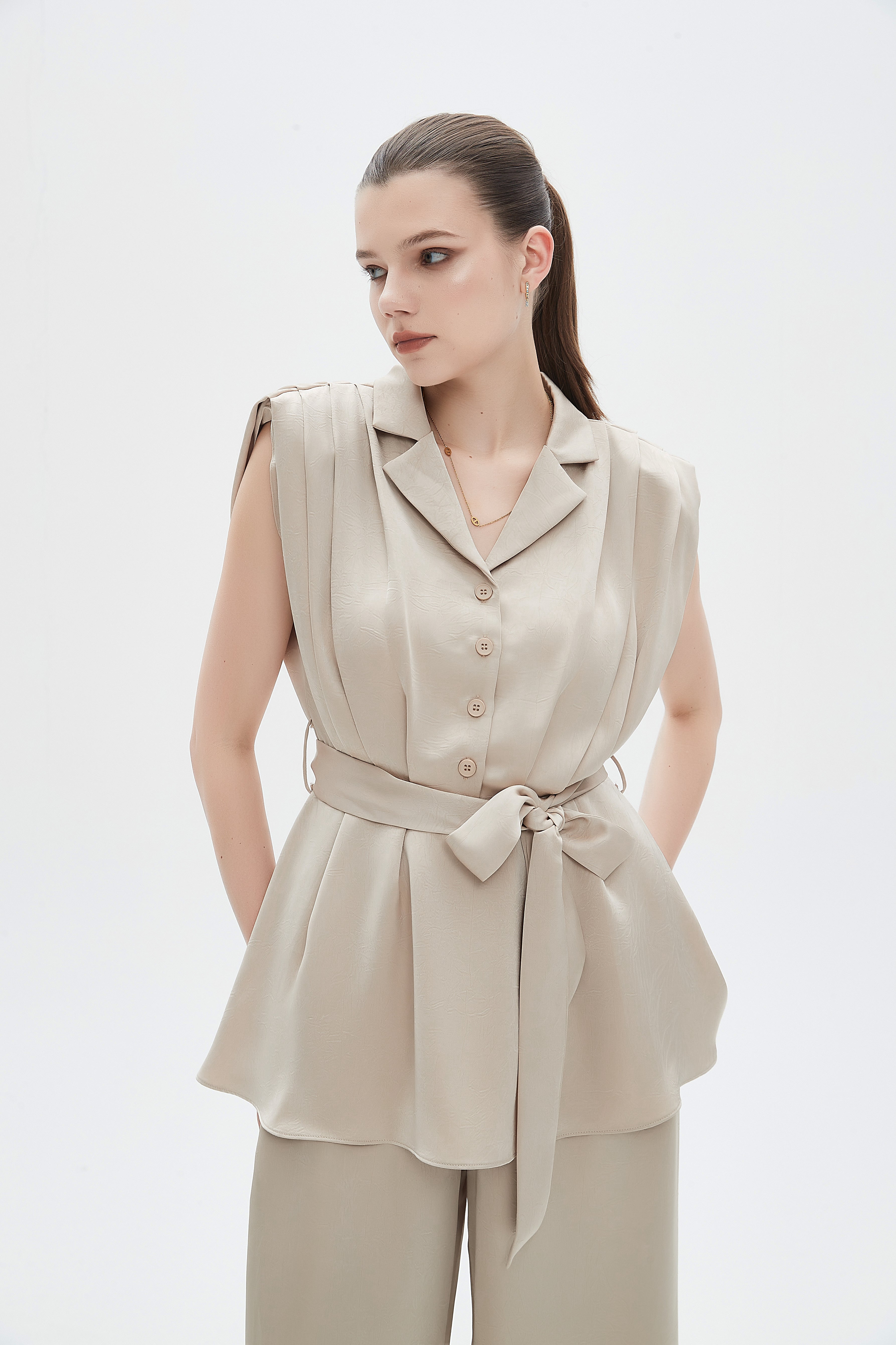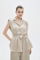 بلوزة نسائية بحزام بفتحة ياقة V بدون أكمام