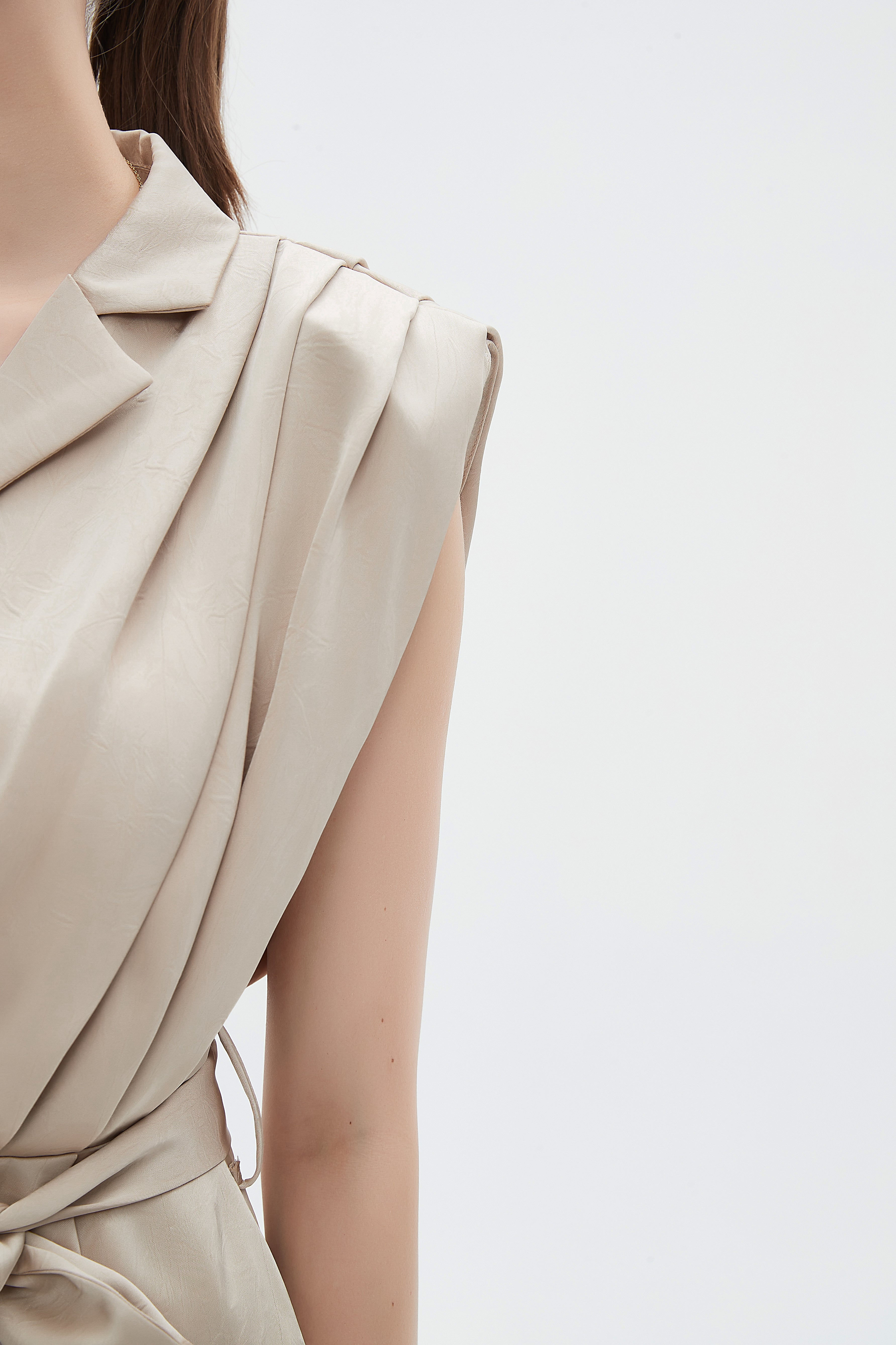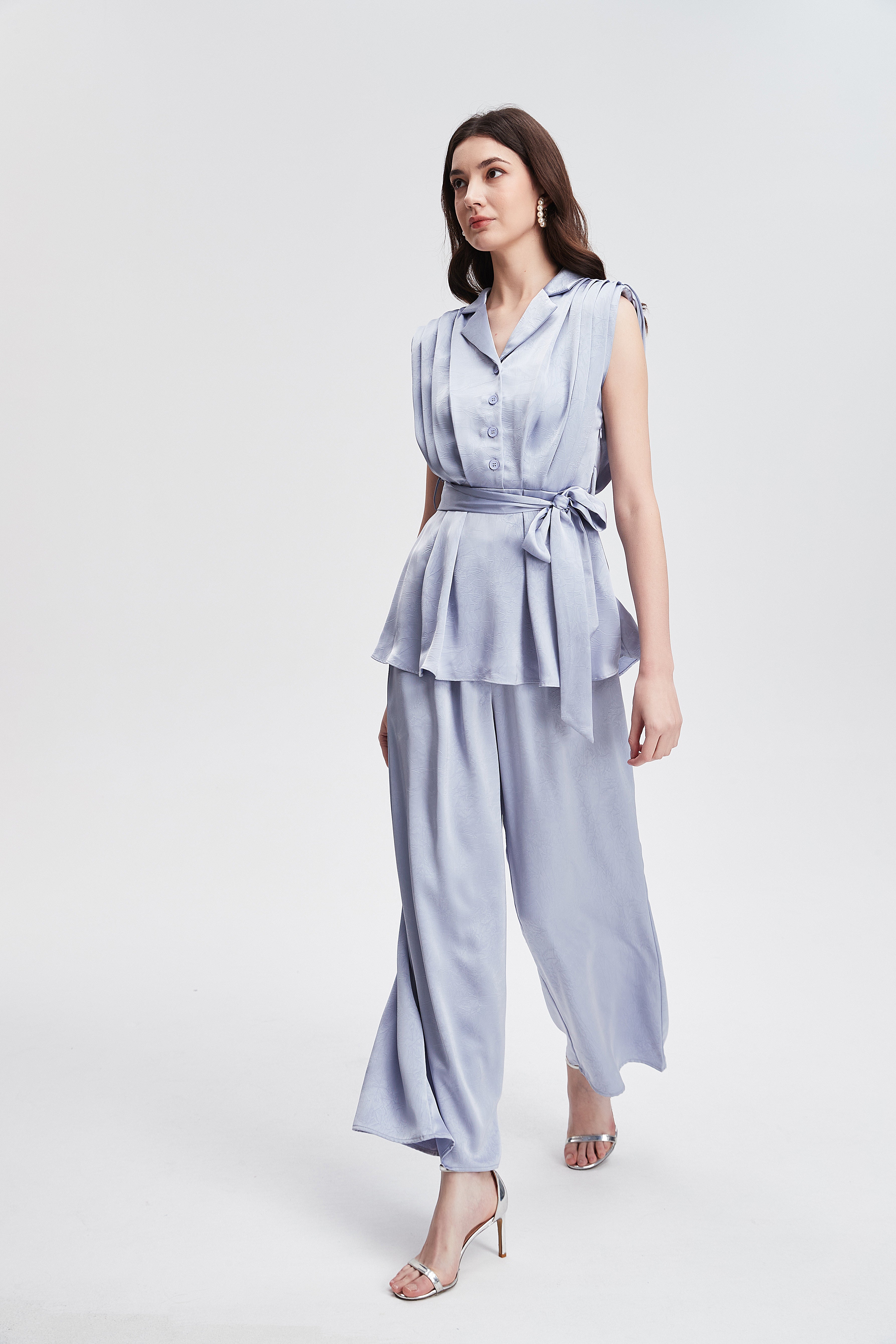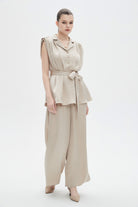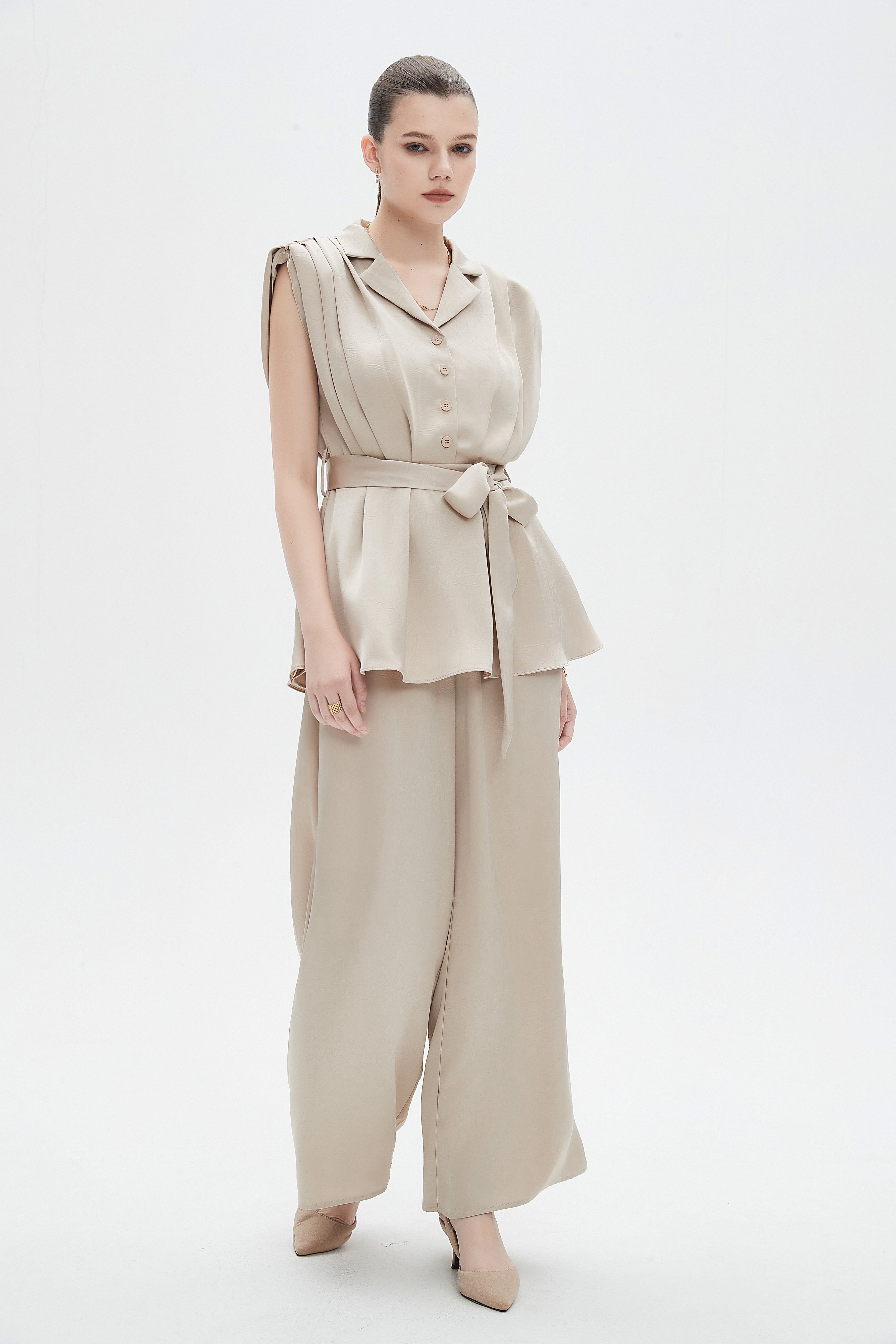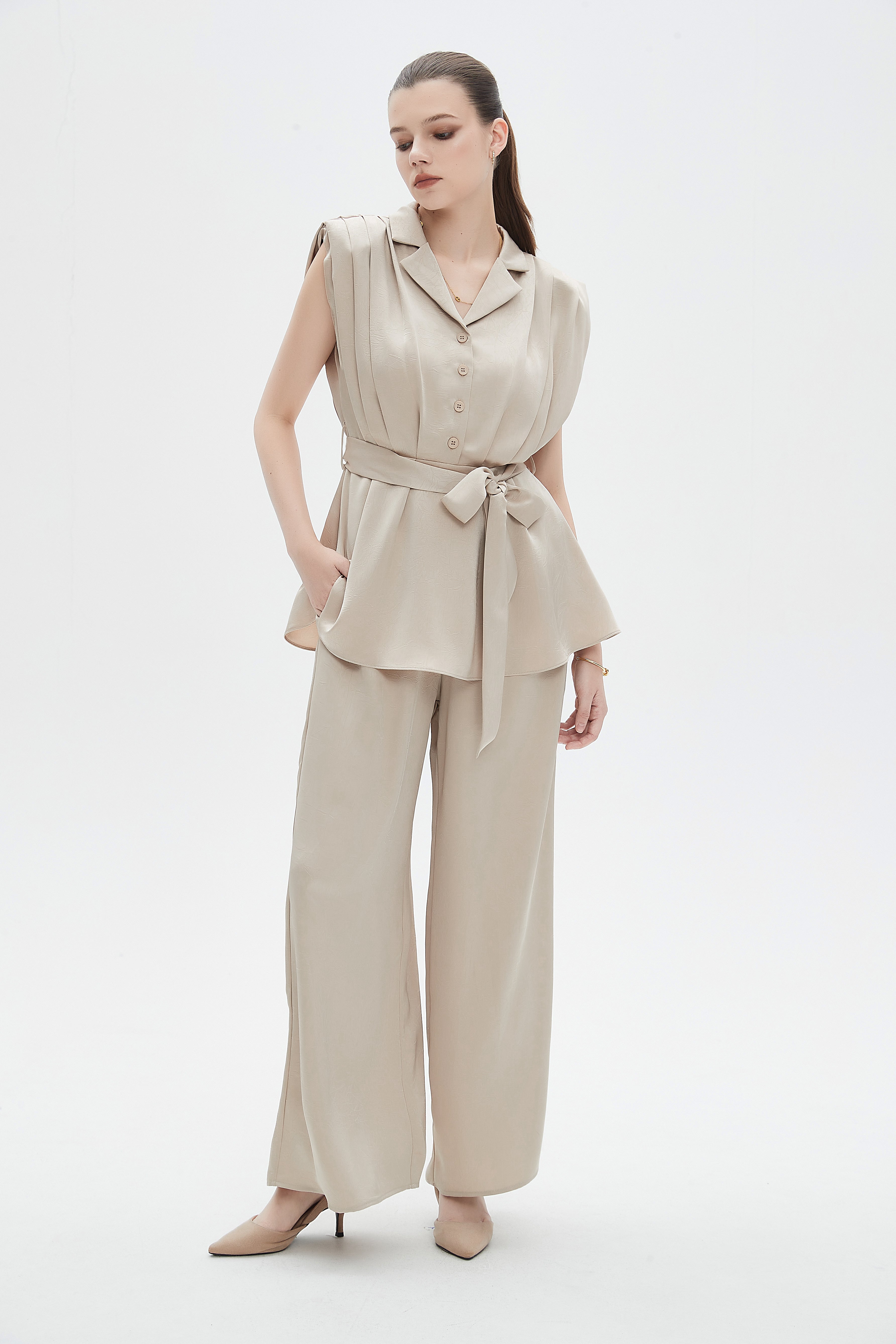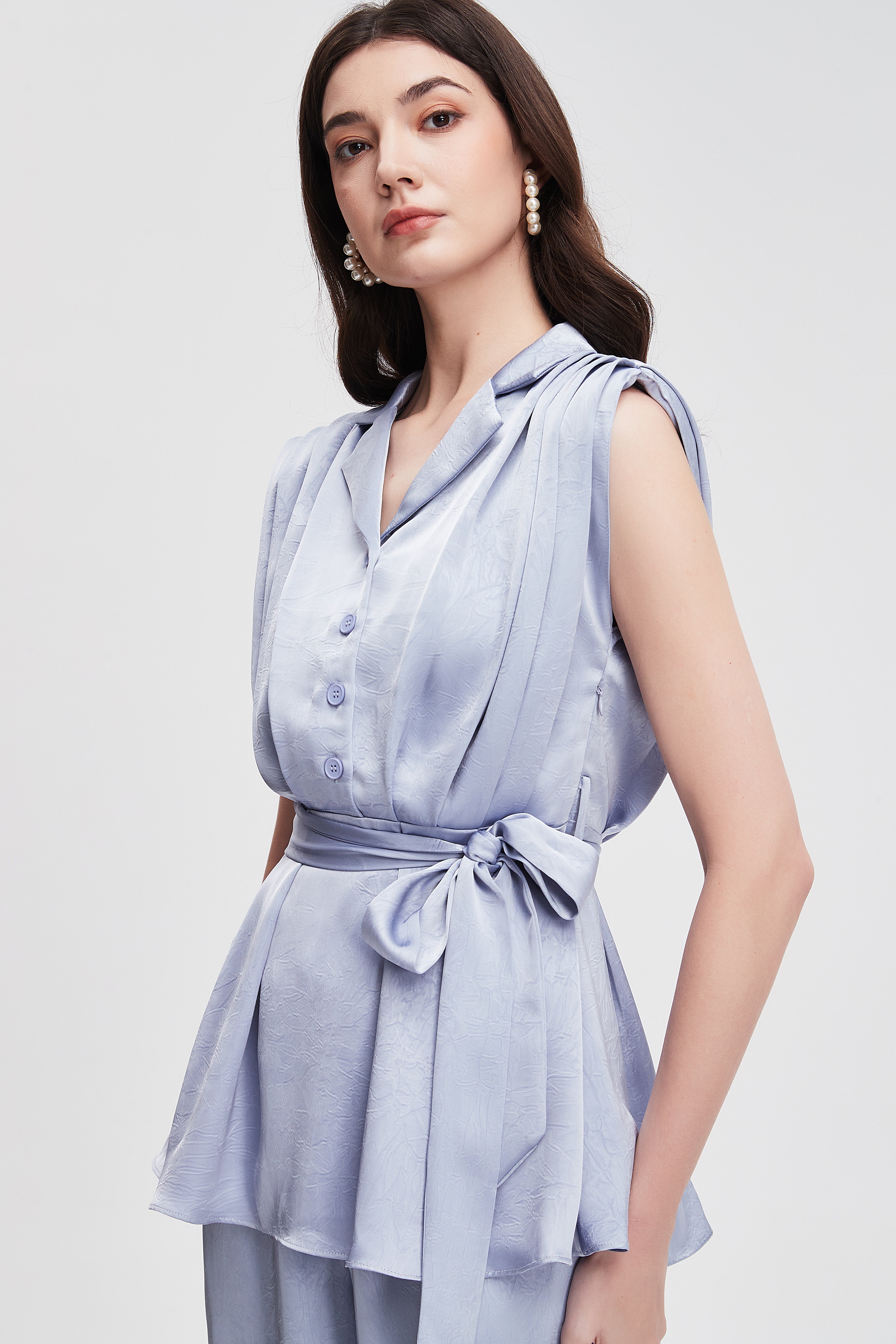بلوزة نسائية بحزام بفتحة ياقة V بدون أكمام