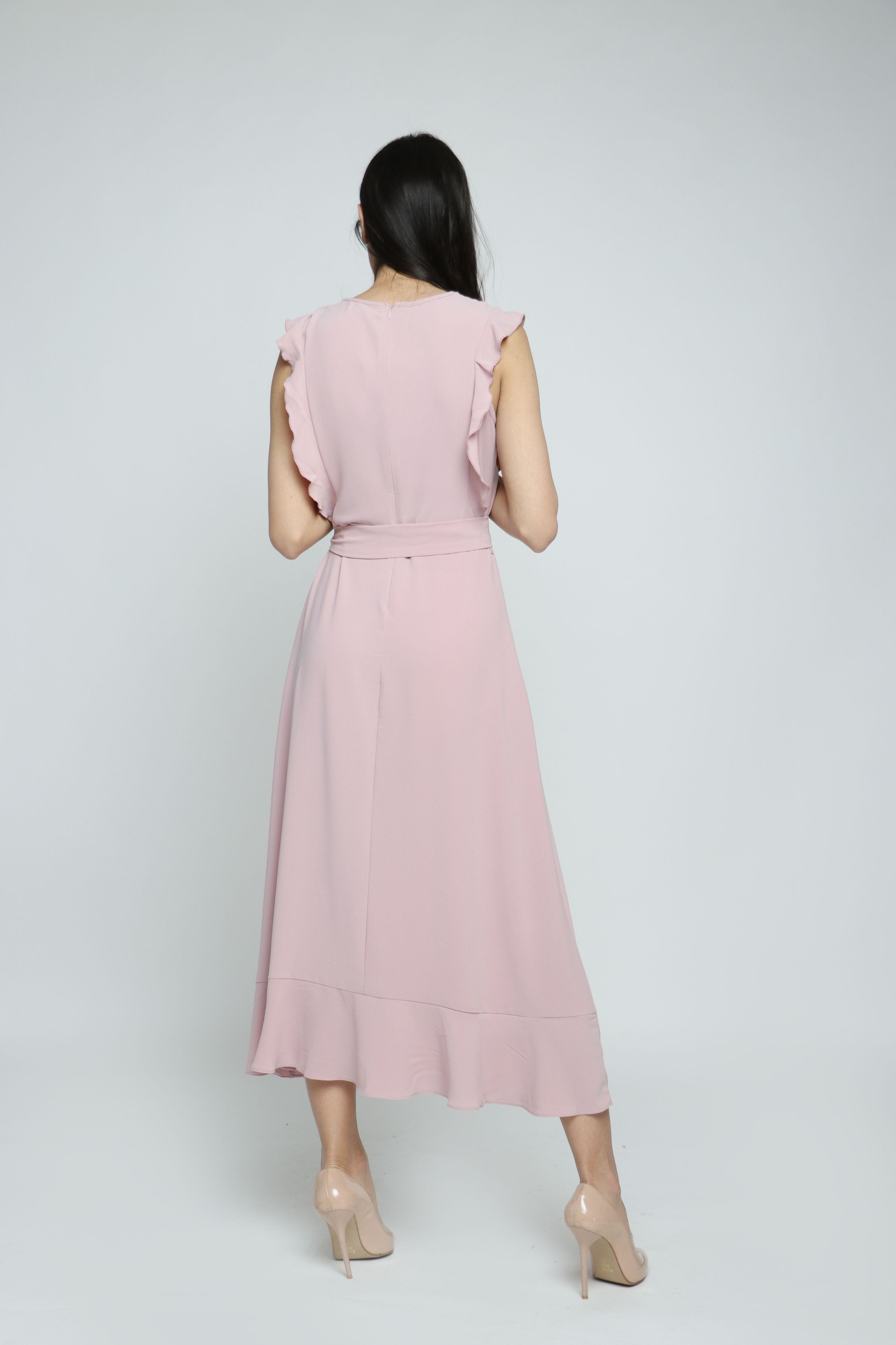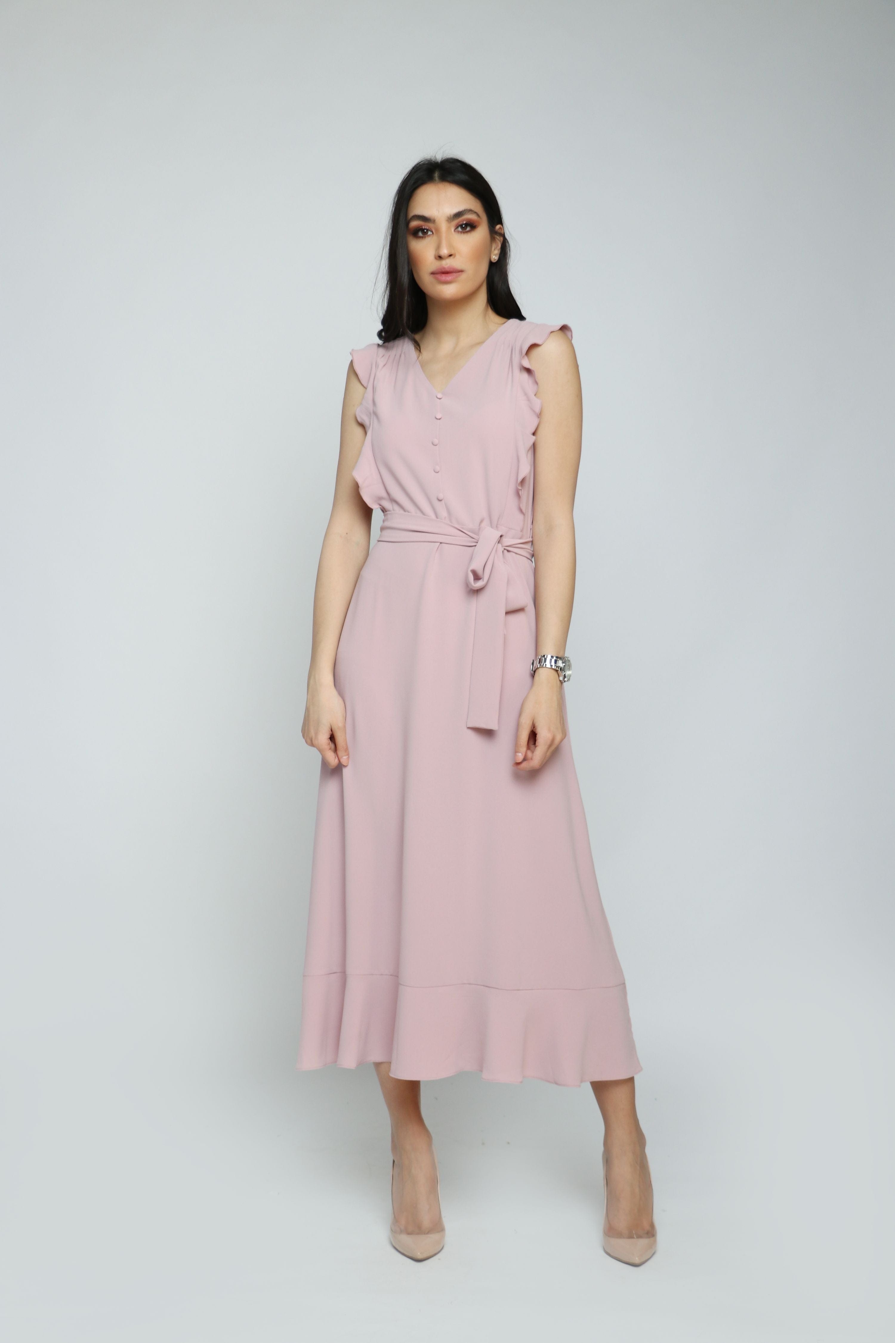 - فستان سادة وردي مع حزام مرفق لتحديد الخصر
