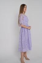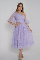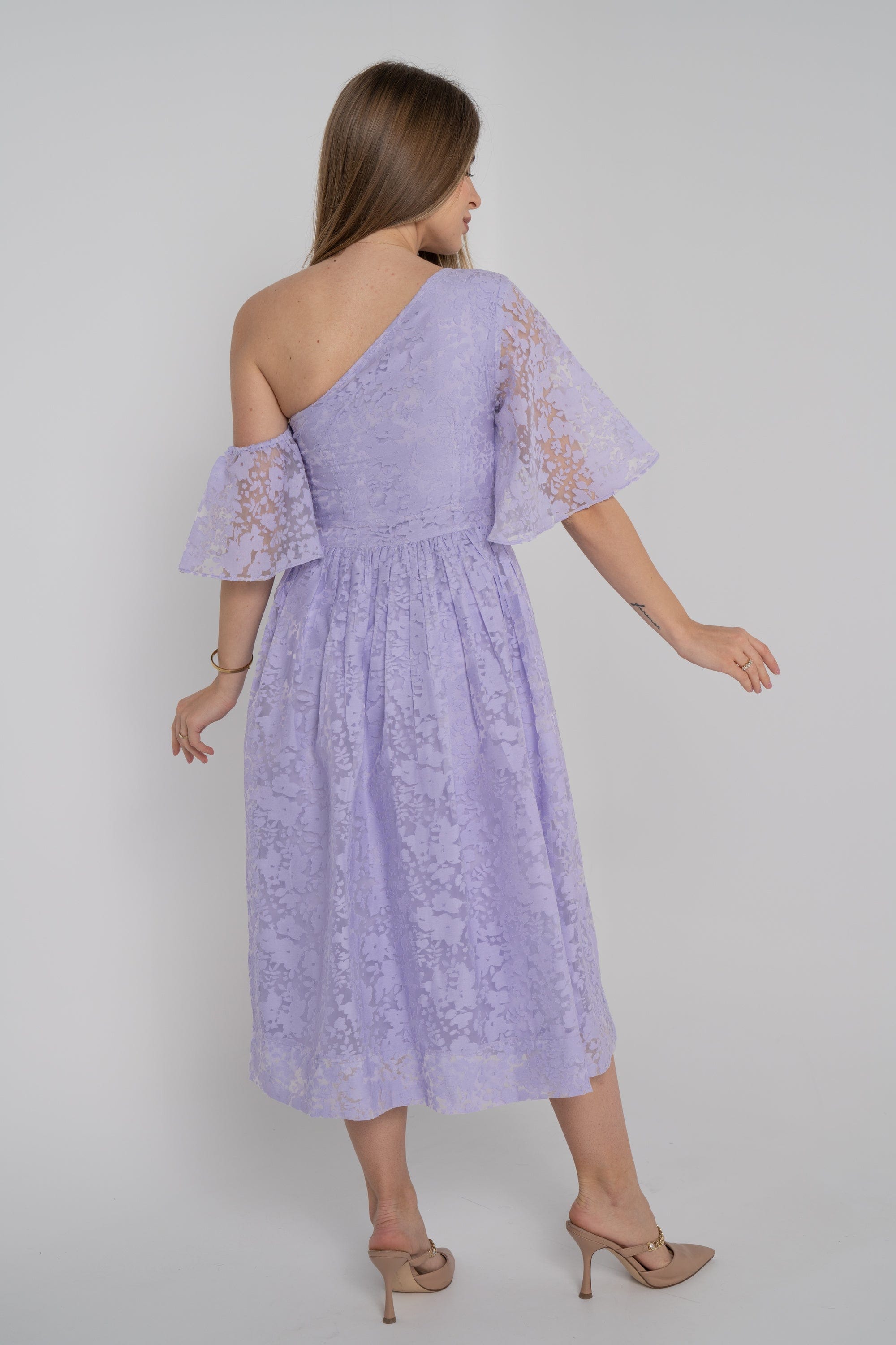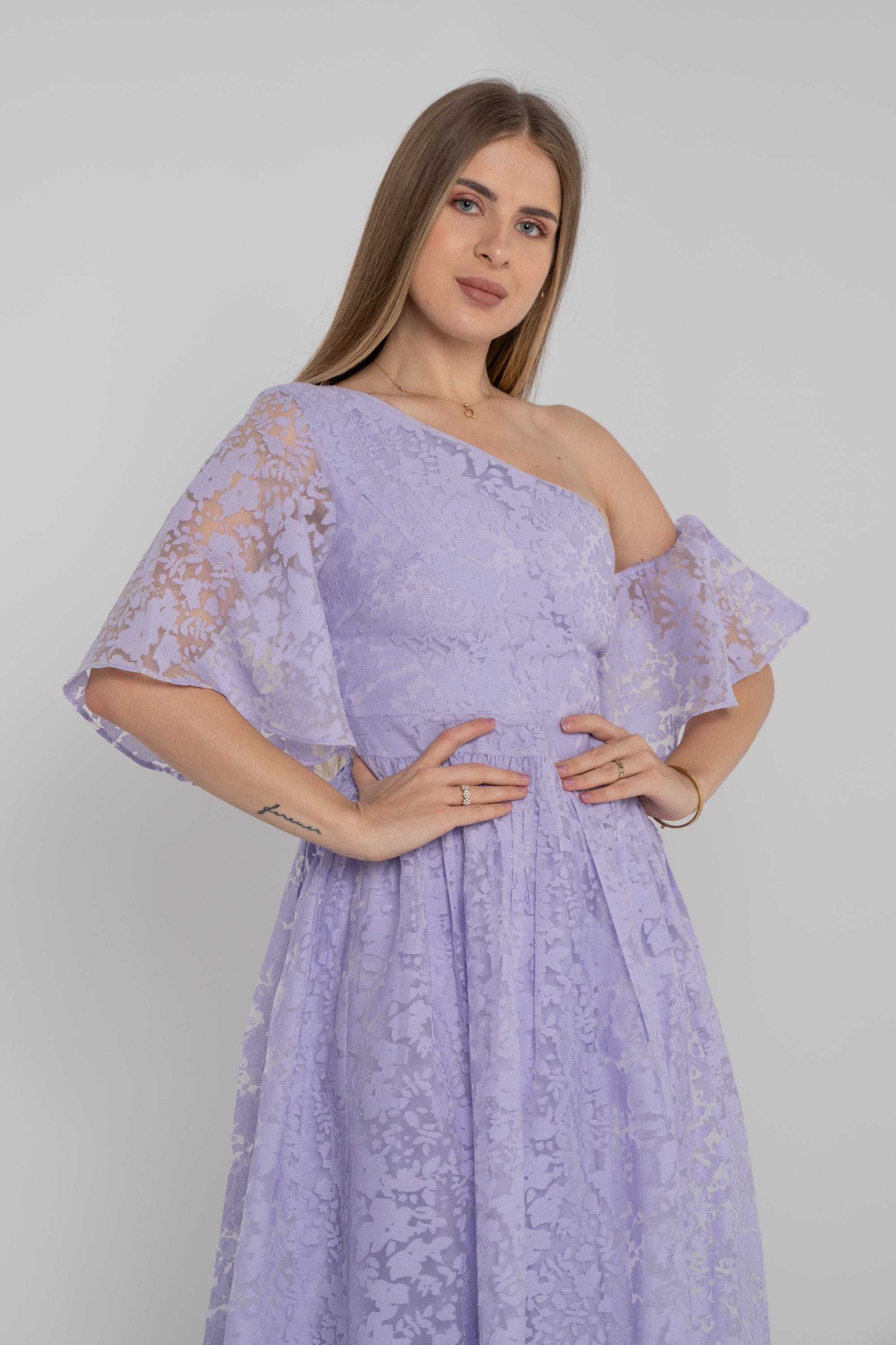 - التنسيق: نسقيه مع كعب رفيع وحقيبة صغيرة لحفلة مسائية، أو صندل بكعب مربع للخروجات النهارية. أضيفي عقدًا بسيطًا لياقة الكتف الواحد، وفي الفصول الباردة ضعي جاكيت خفيف أو شال محايد ليُكمل لون الليلكي.
