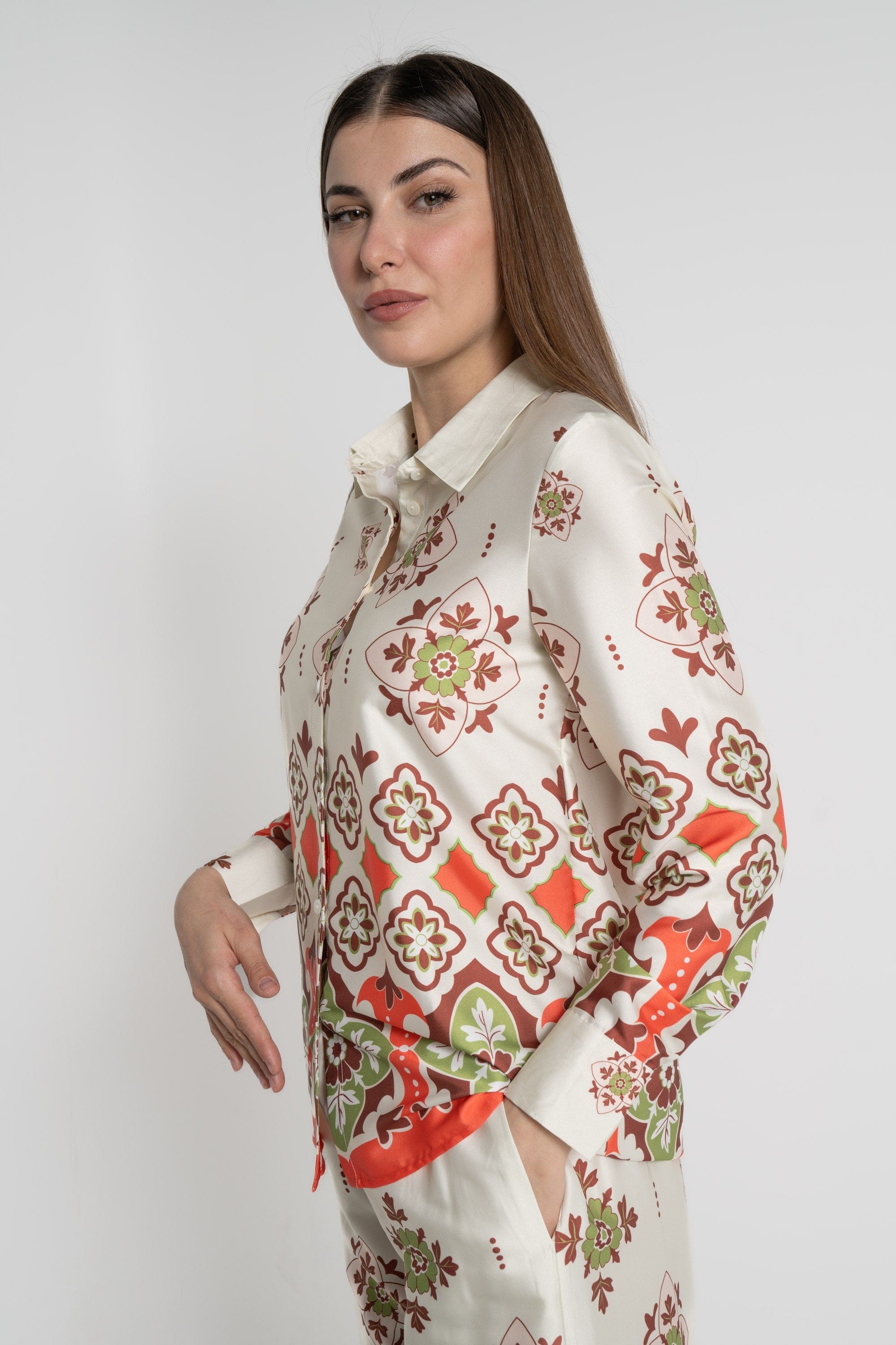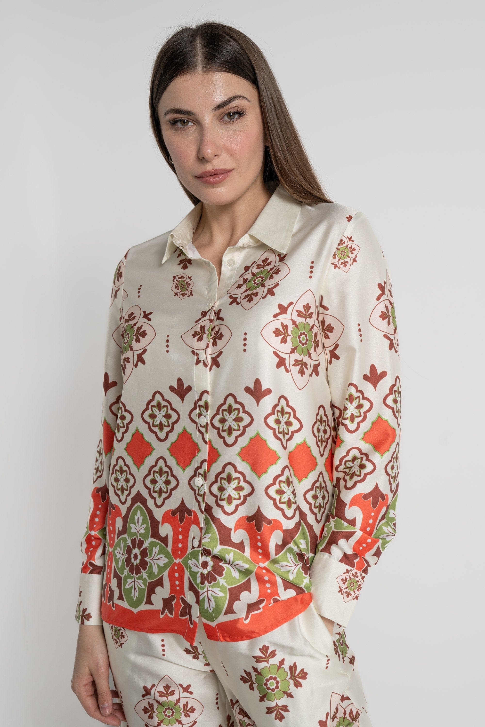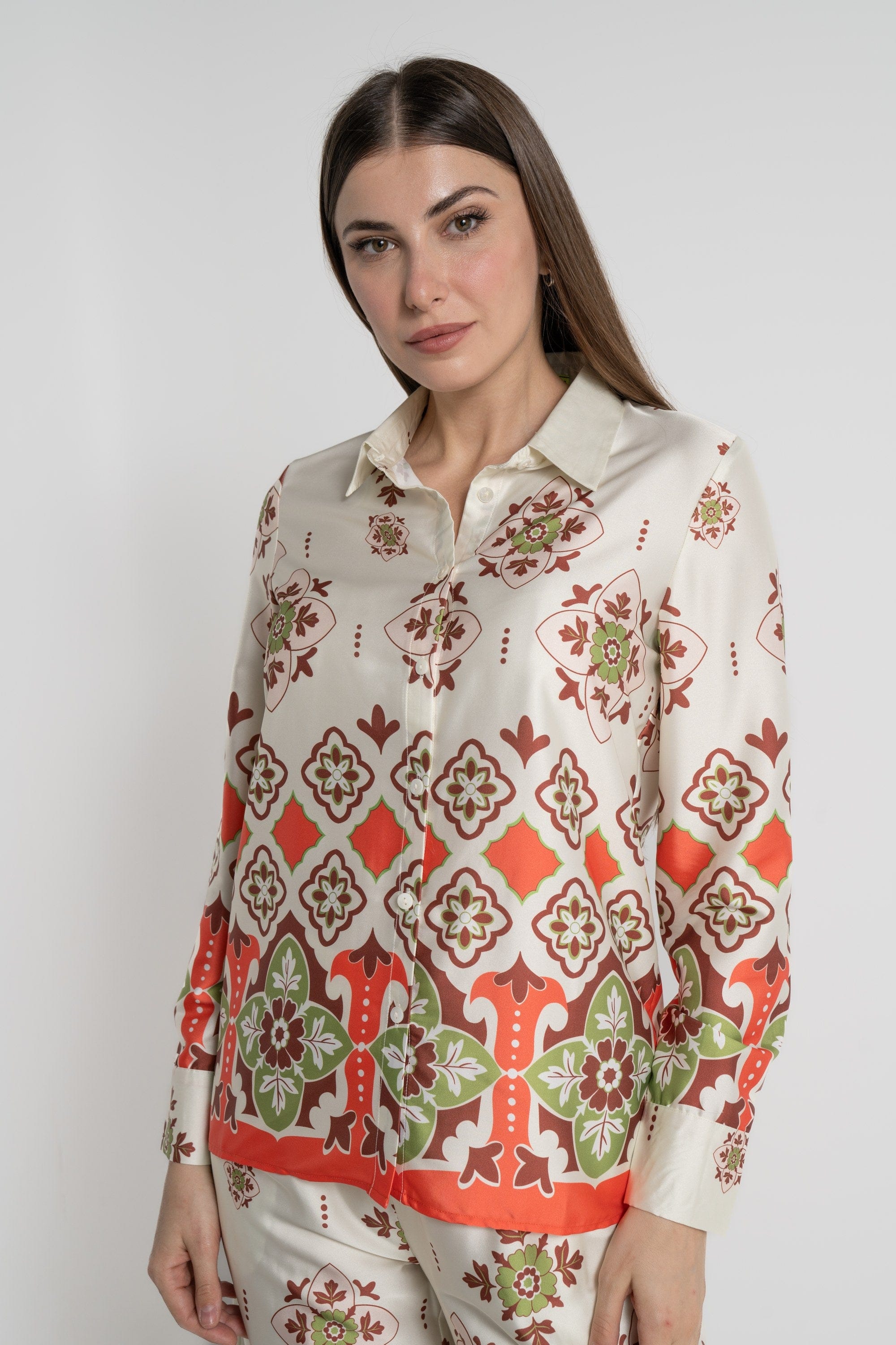 قميص بأكمام طويلة منقوش بأزرار أمامية نسائي
