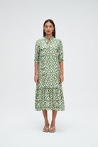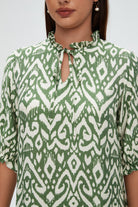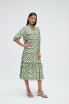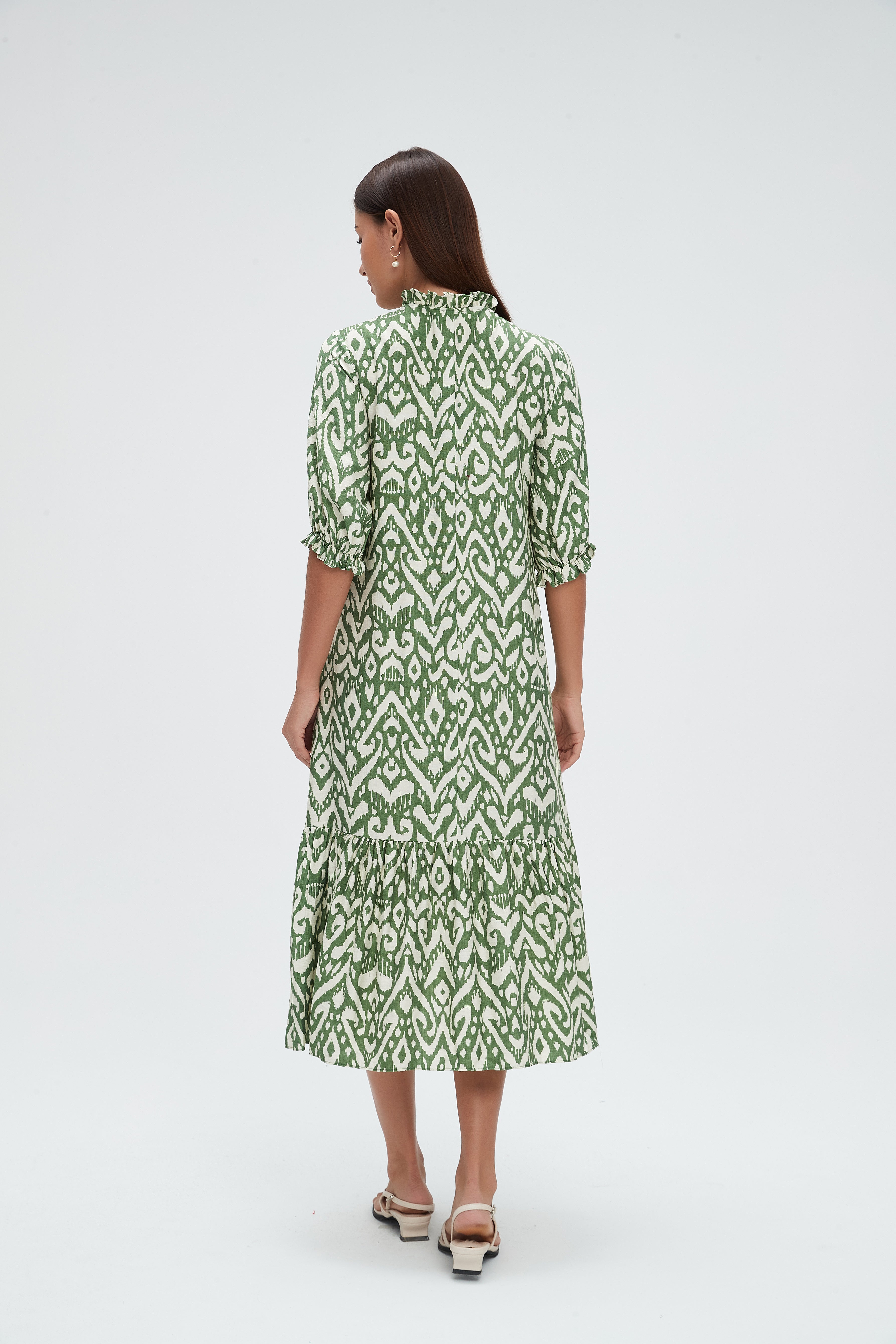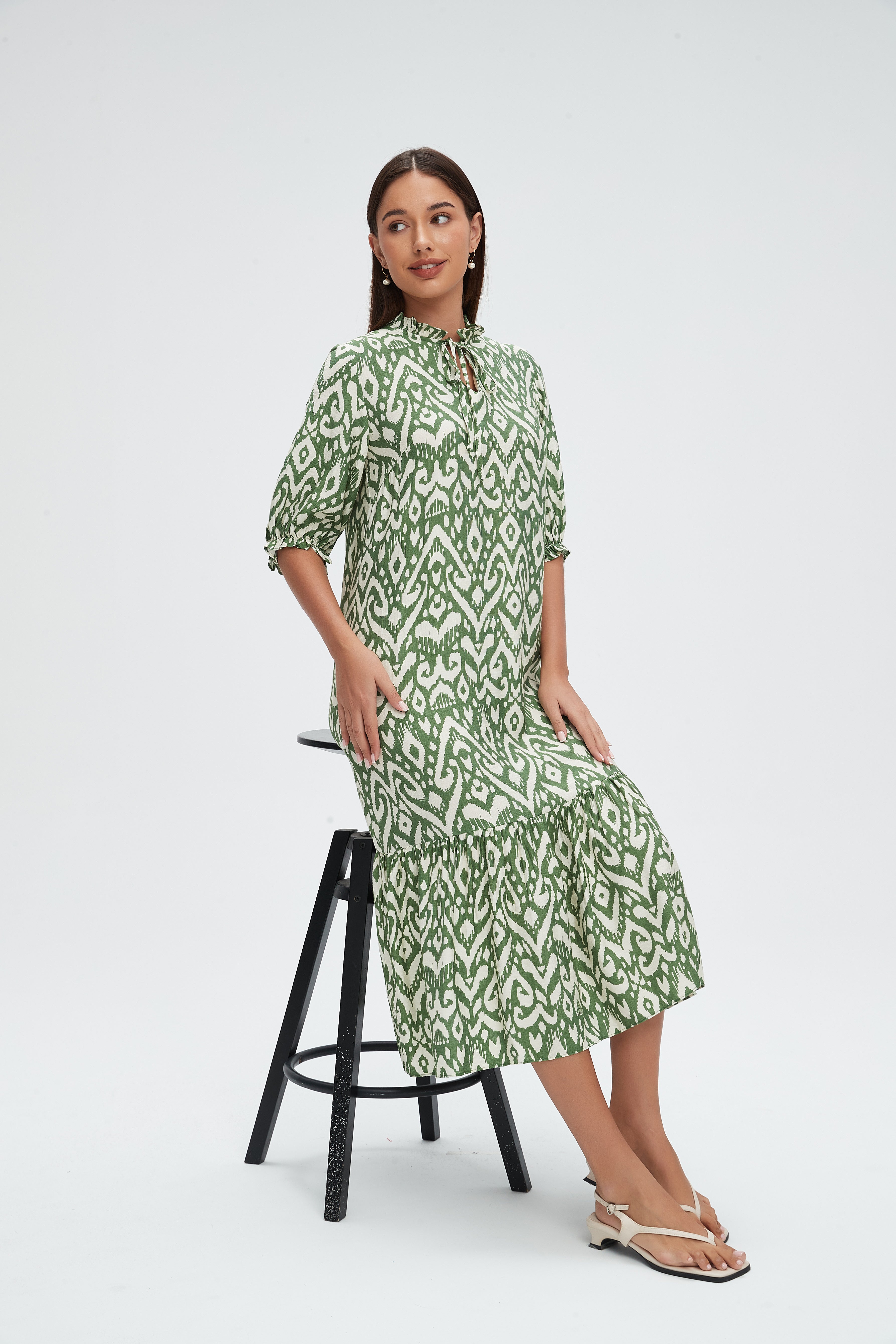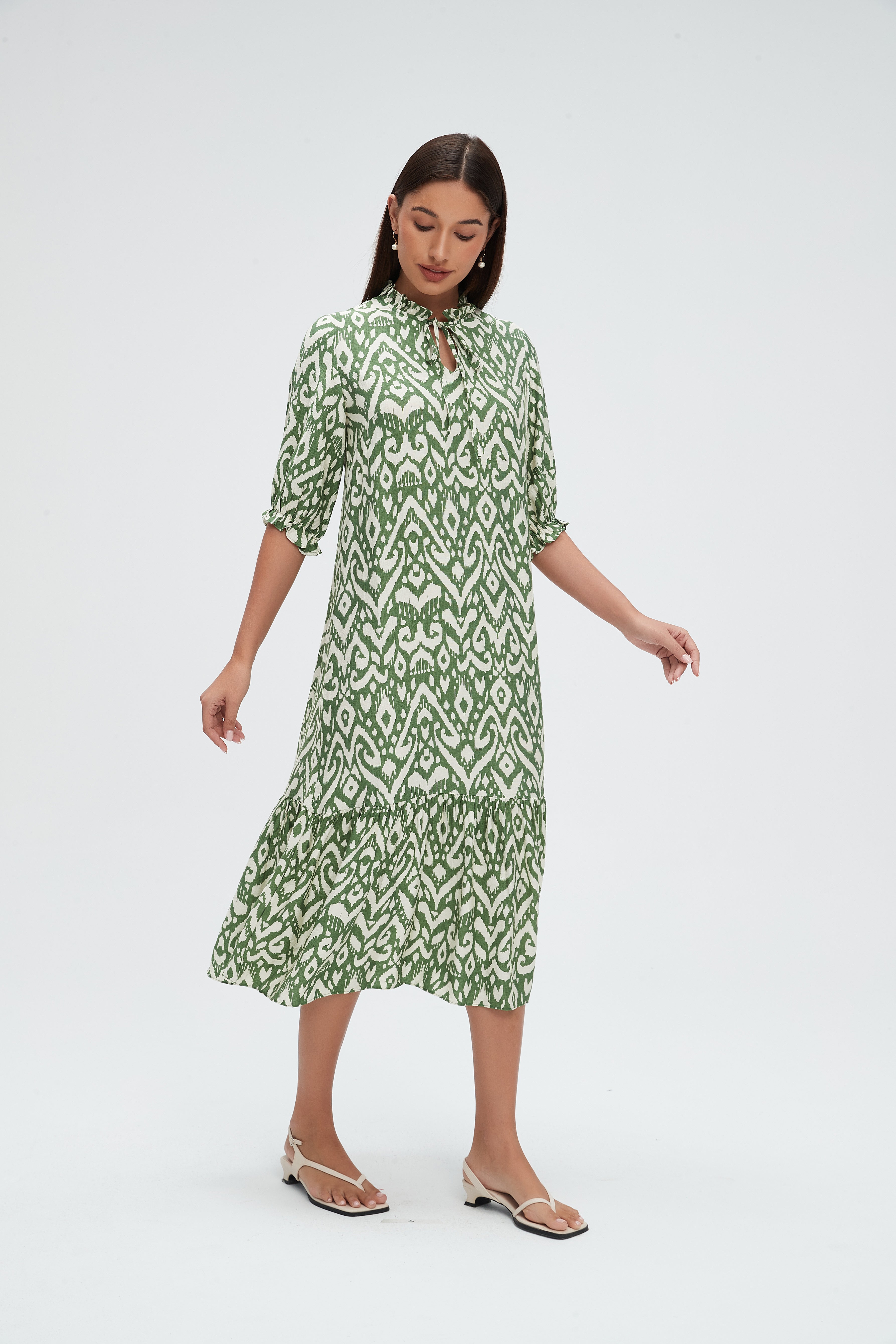 فستان ميدي نص كم منقوش بفتحة رقبة مستديرة