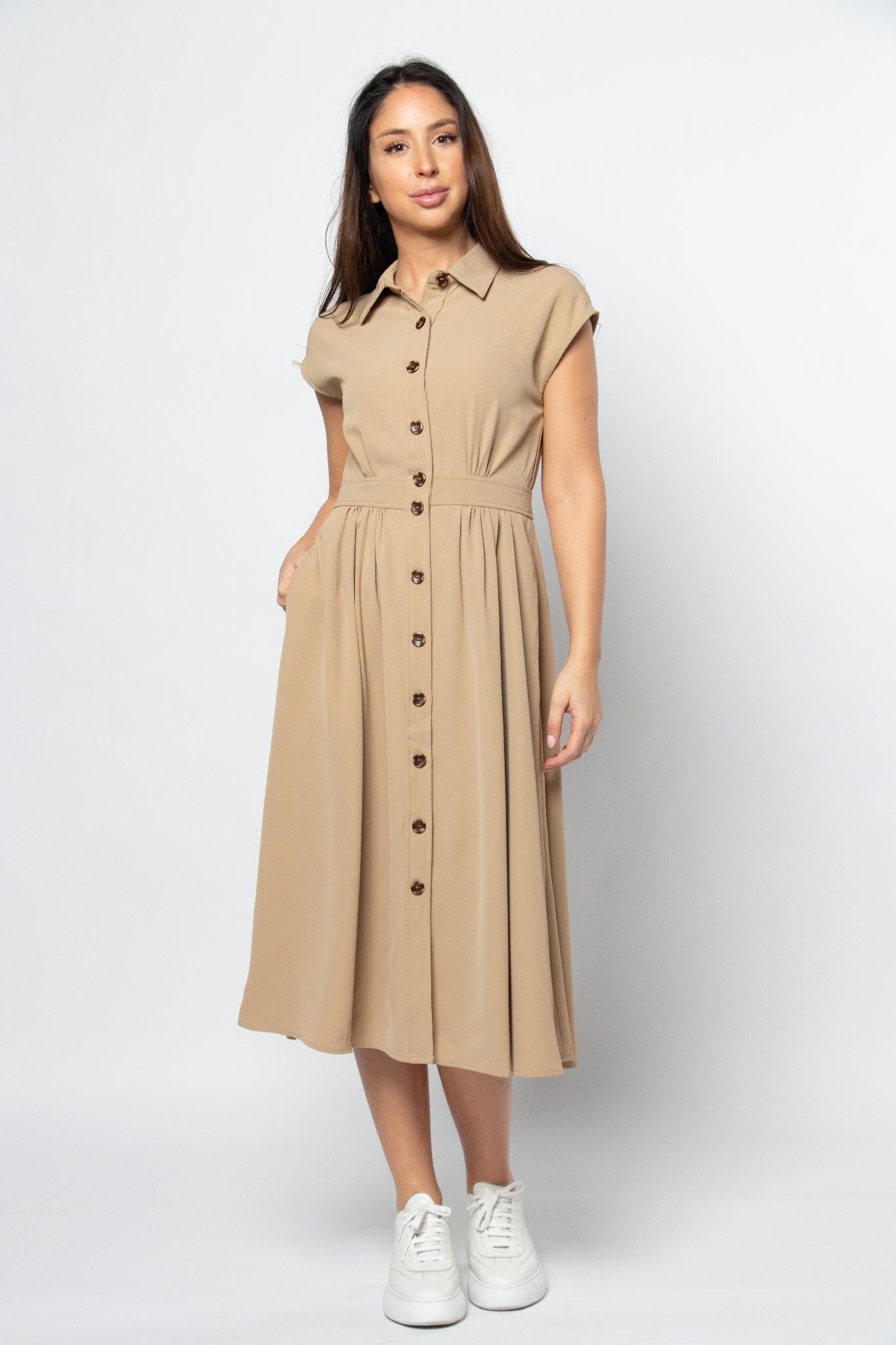 هل تبحثين عن فستان مريح وعصري يصلح للاستخدام اليومي؟ هذا الفستان البيج بقصة A وطول ميدي يجمع بين راحة بسيطة ولمسة أنثوية مناسبة للخروجات والكاجوال. الخامة بوليستر 100% تجعله سهل الغسل ومتينًا بسمك متوسط يصلح لكل المواسم. ياقة قميص مع أزرار أمامية تضفي شكل مرتب ويمكنك فتحها قليلاً لمظهر أكثر استرخاء. الكم القصير مريح في الأيام الحارة، والجيوب على طراز تشينو تضيف عملية تخزين للأغراض الصغيرة. لا يحتوي على بطانة ولا حزام، ما يمنحه انسيابية وحركة لطيفة مع كل خطوة. ستحبين كيف يبدو بسيطًا لكنه أنيق، مثالي للنزهات، القهوة مع الأصدقاء أو لمساءات هادئة برفقة من تحبين. اعثري على مقاسك في فاشن السعودية وأضيفي هذه القطعة المتنوعة إلى خزانة ملابسك اليوم.