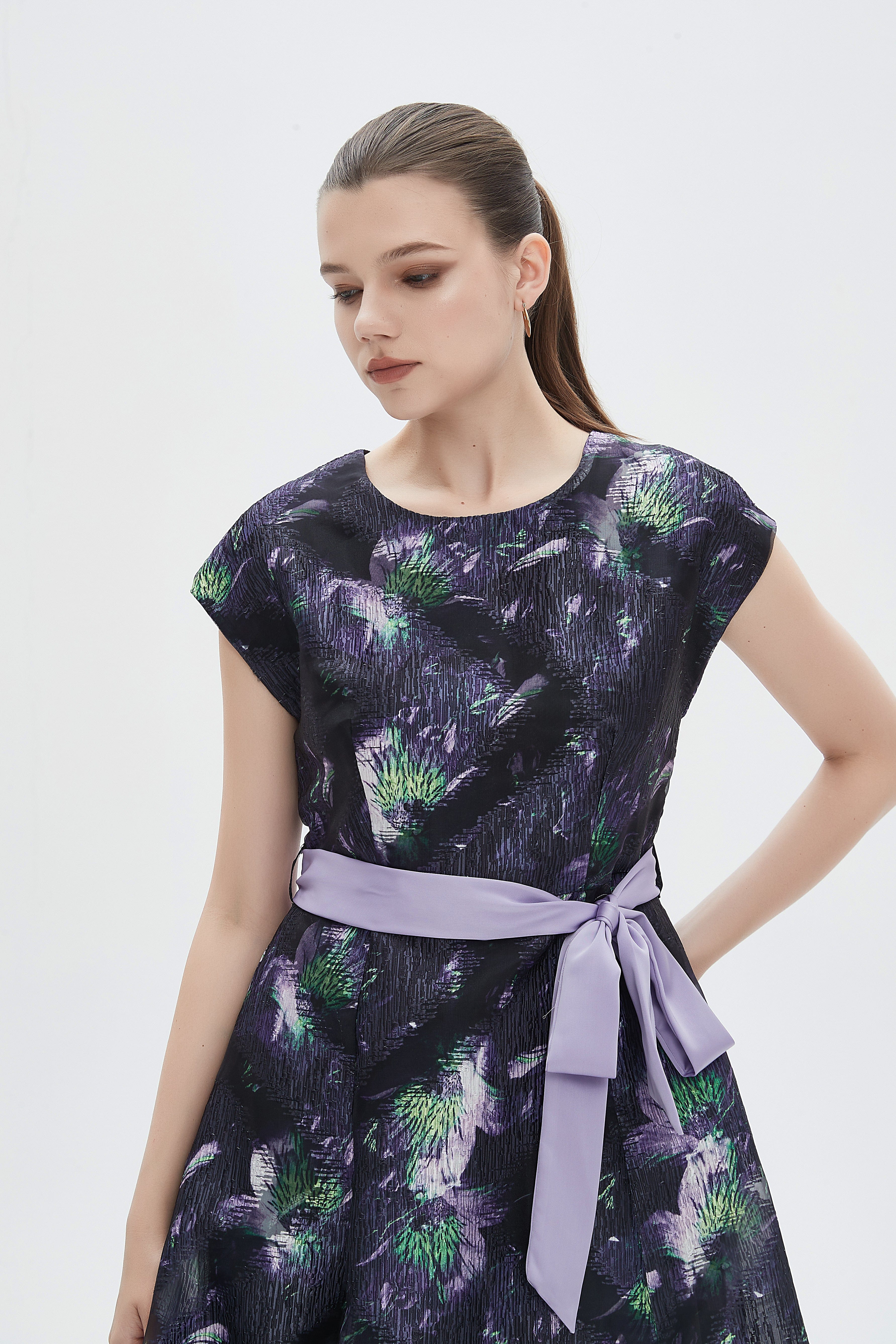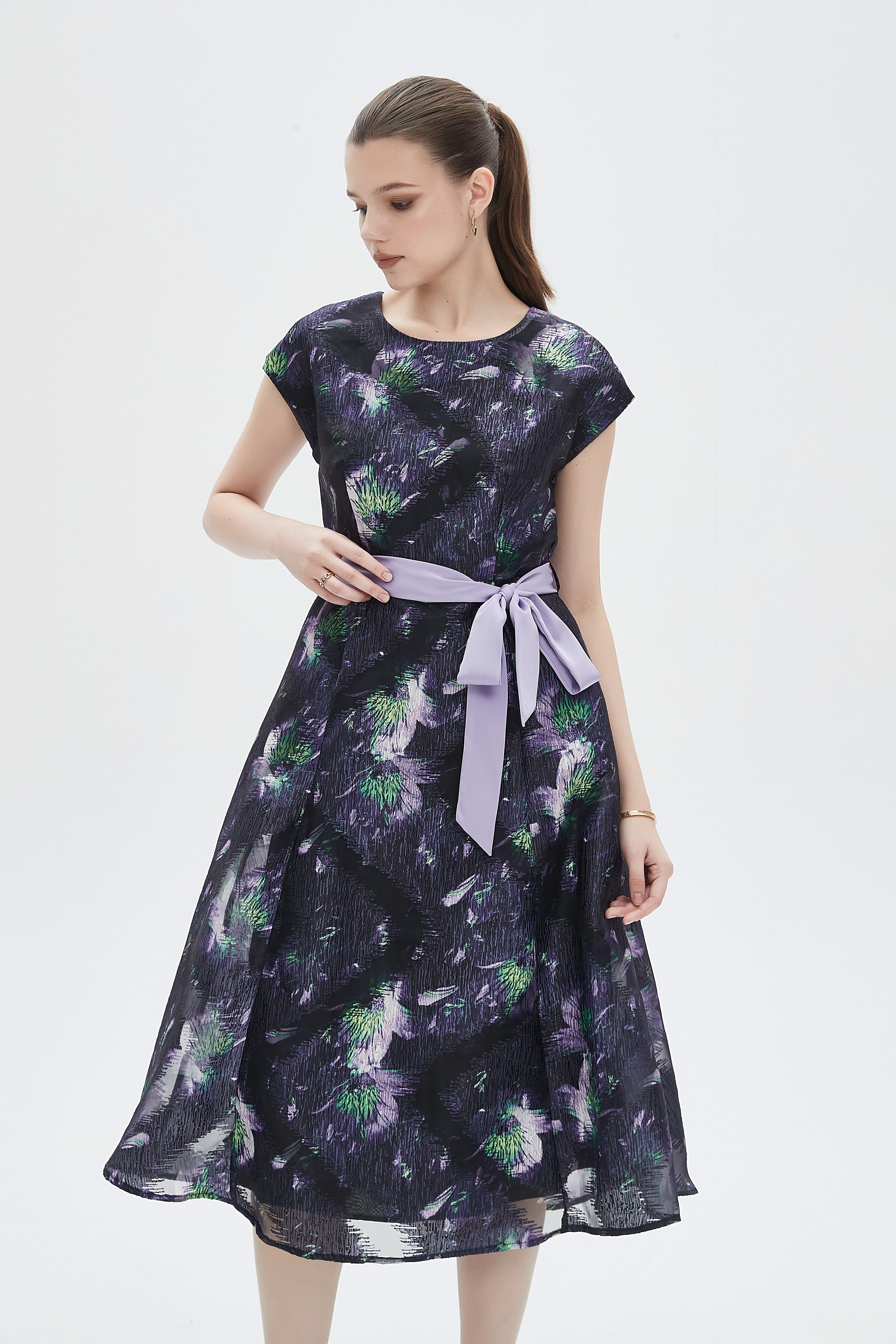 فستان ميدي كم قصير منقوش بحزام على الخصر وياقة مستديرة
