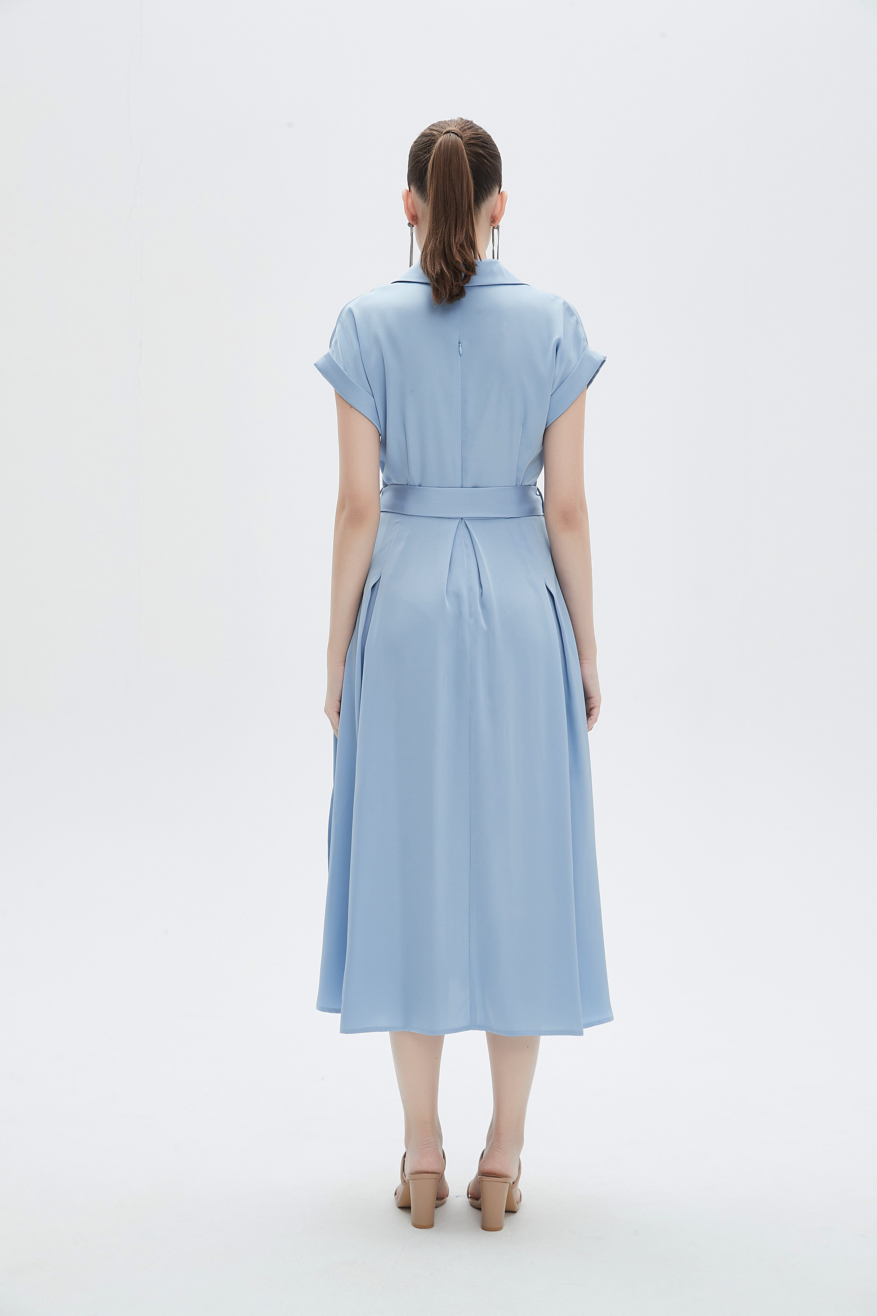 فستان نسائي ميدي بدون أكمام مكشكش مع ياقة قميص وفتحة رقبة على شكل V وحزام على الخصر