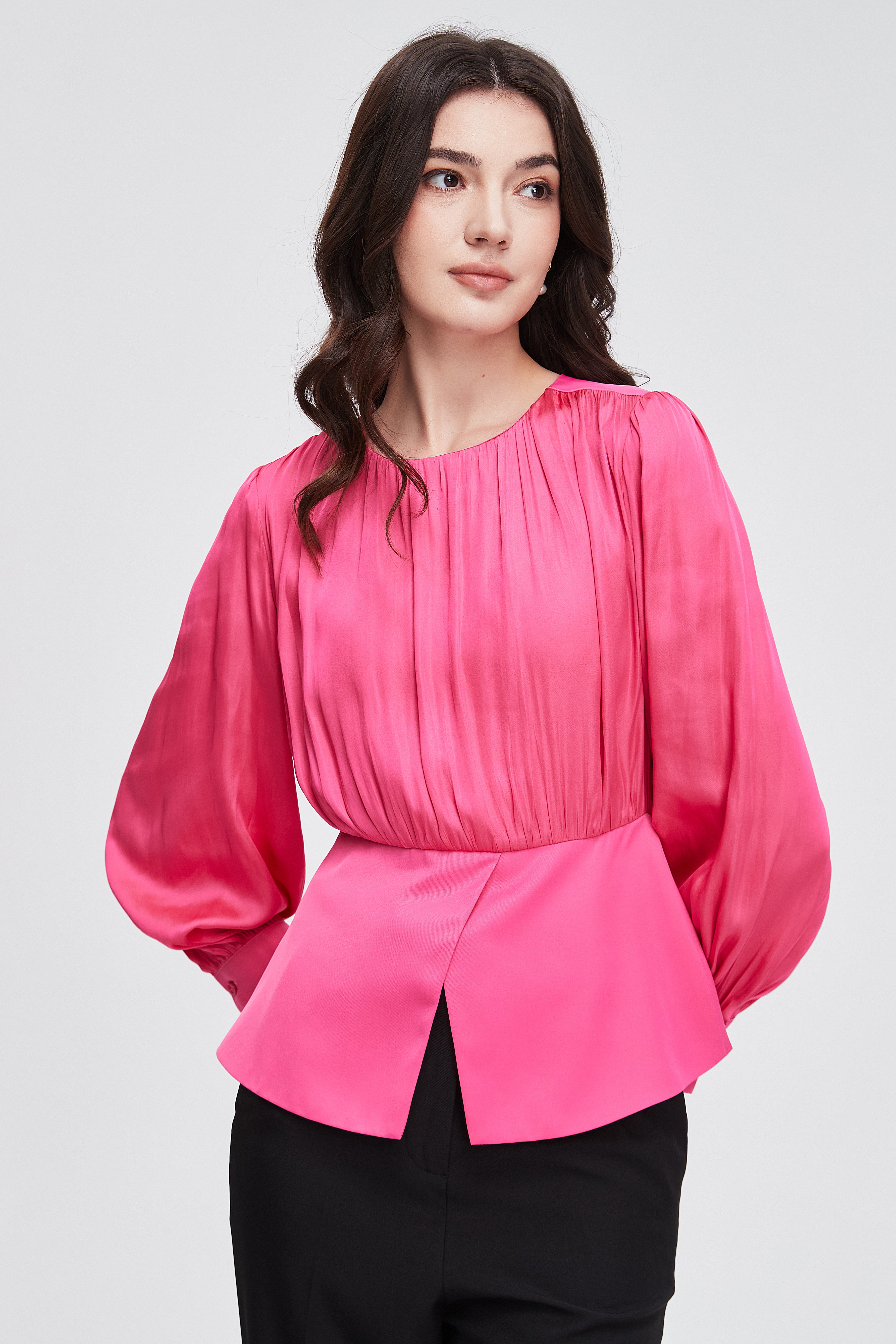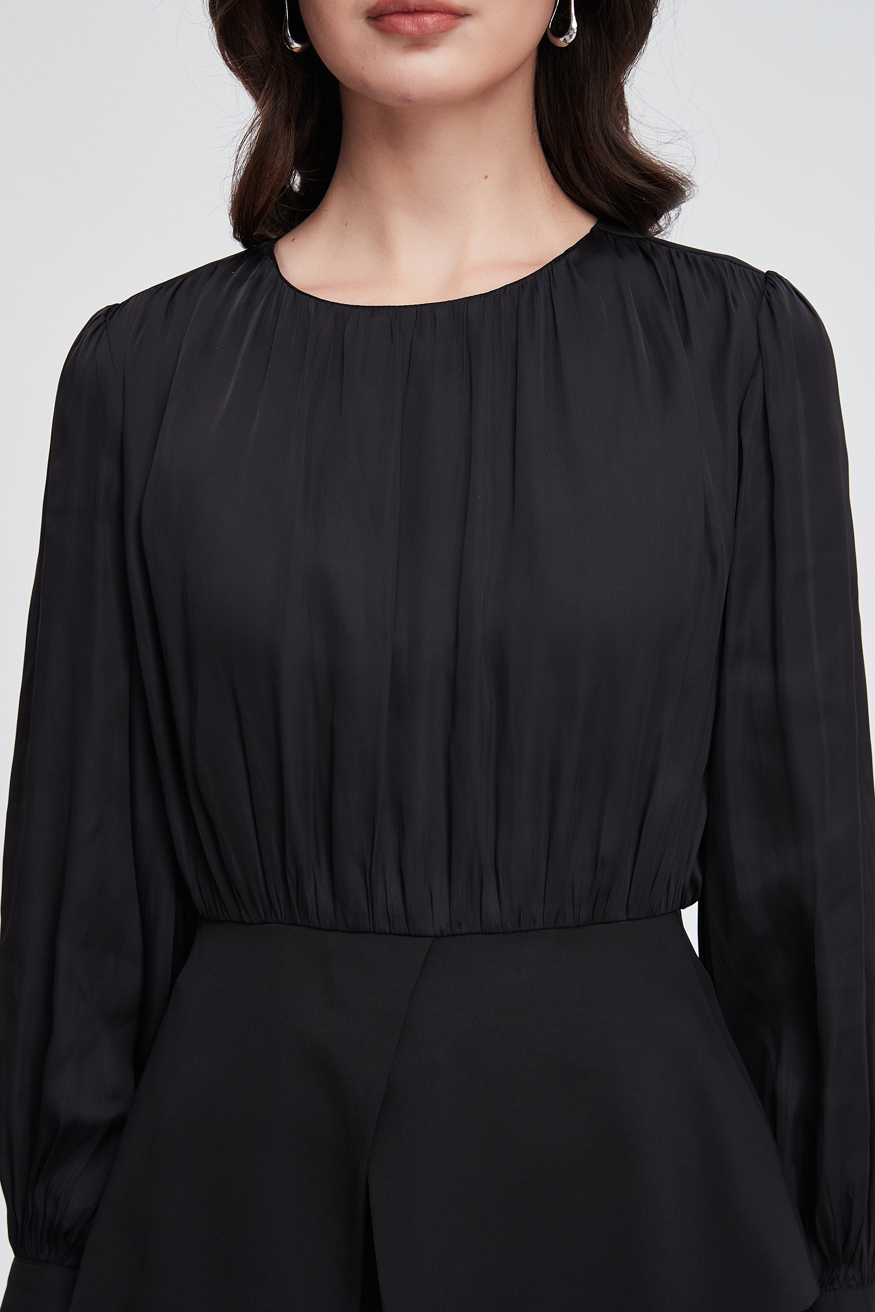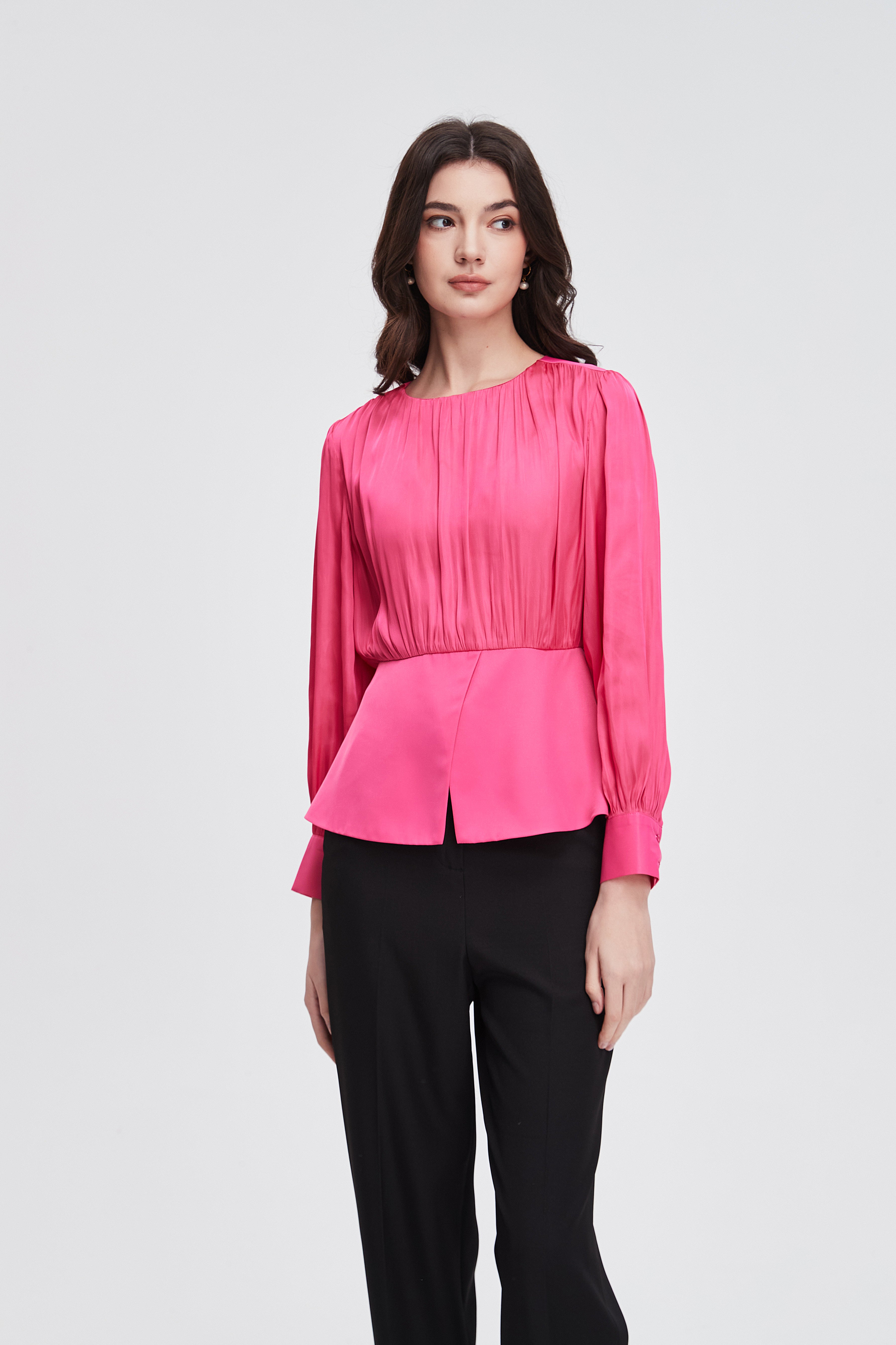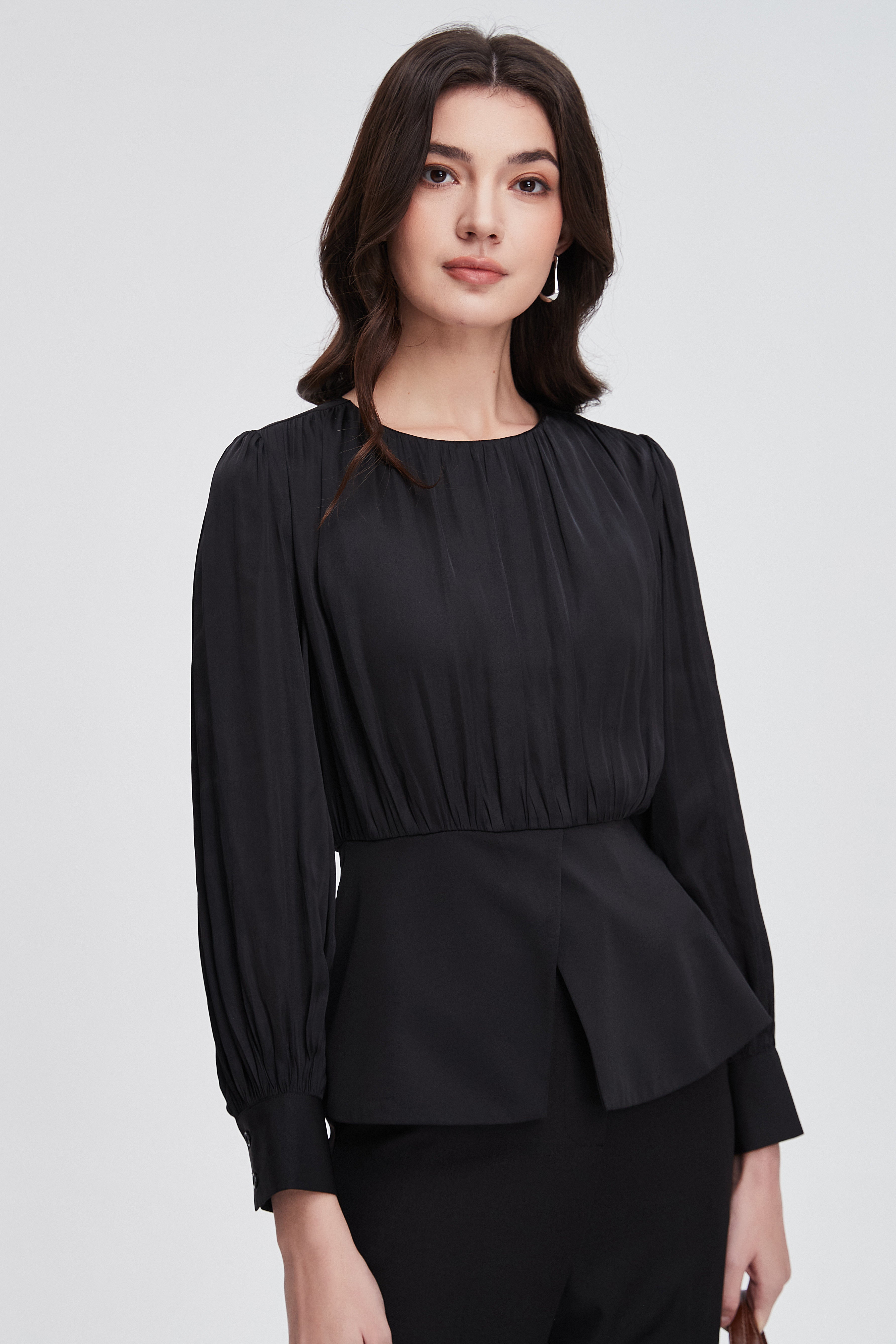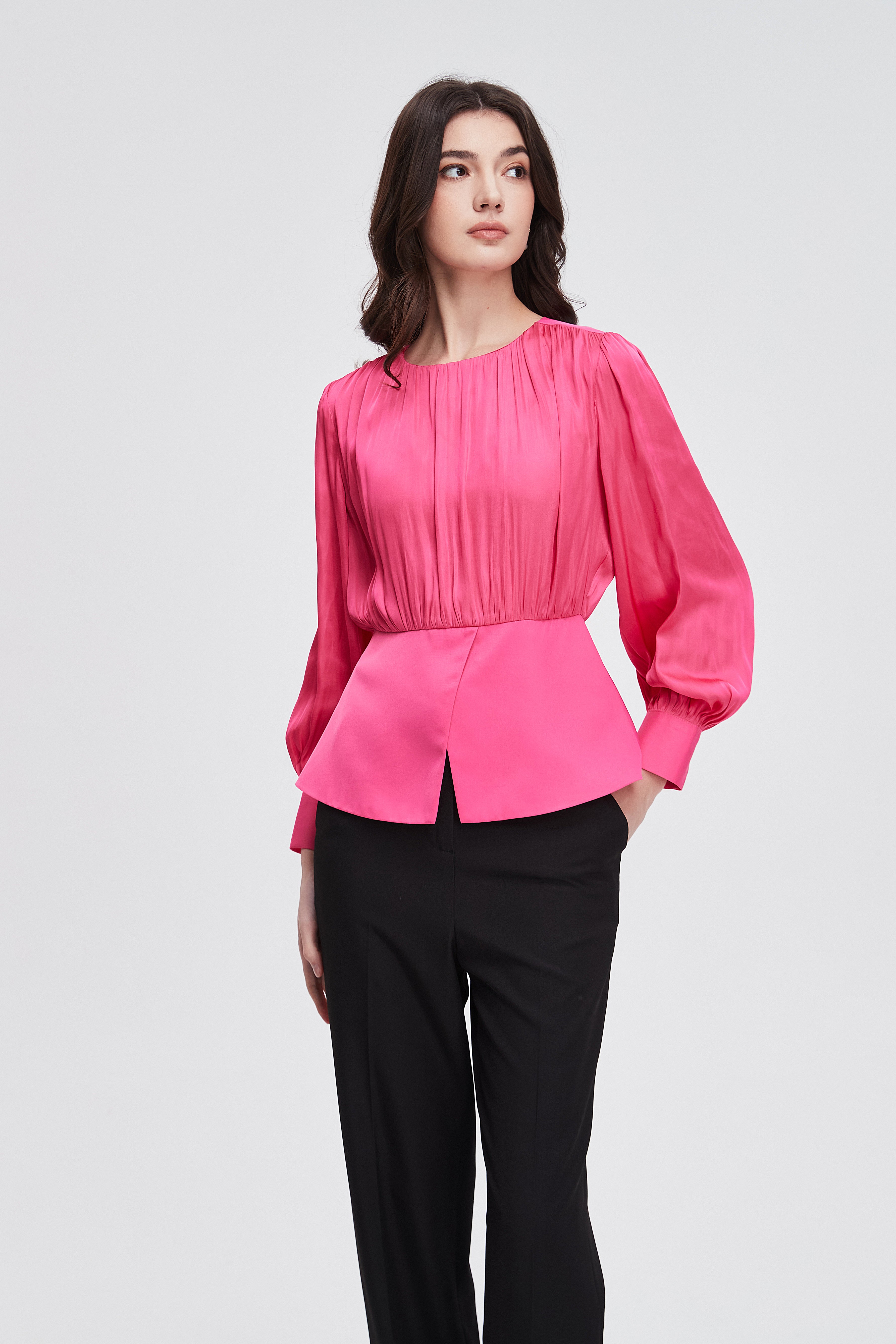 بلوزة نسائية بكم طويل واسع مكشكشة بفتحة رقبة مستديرة