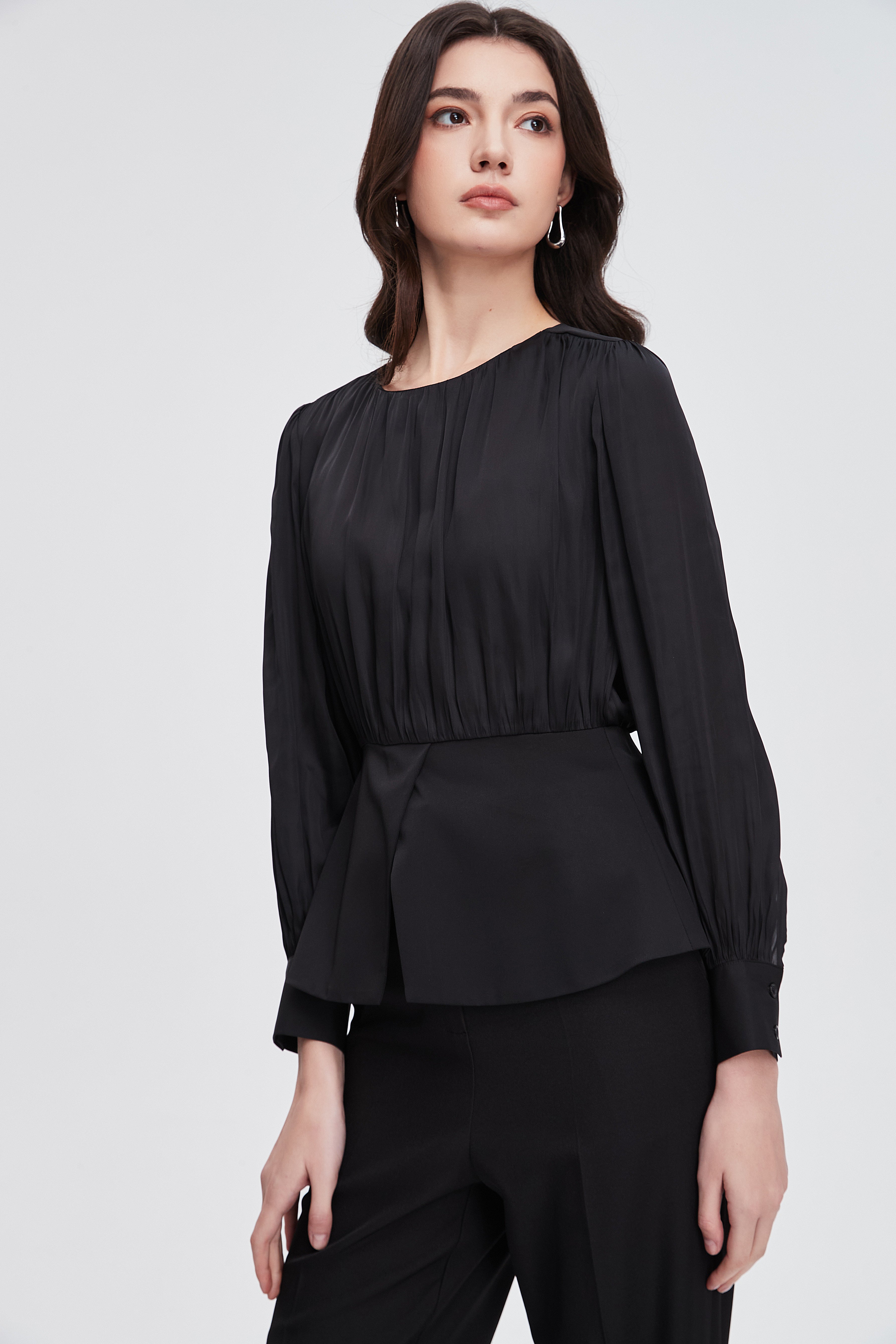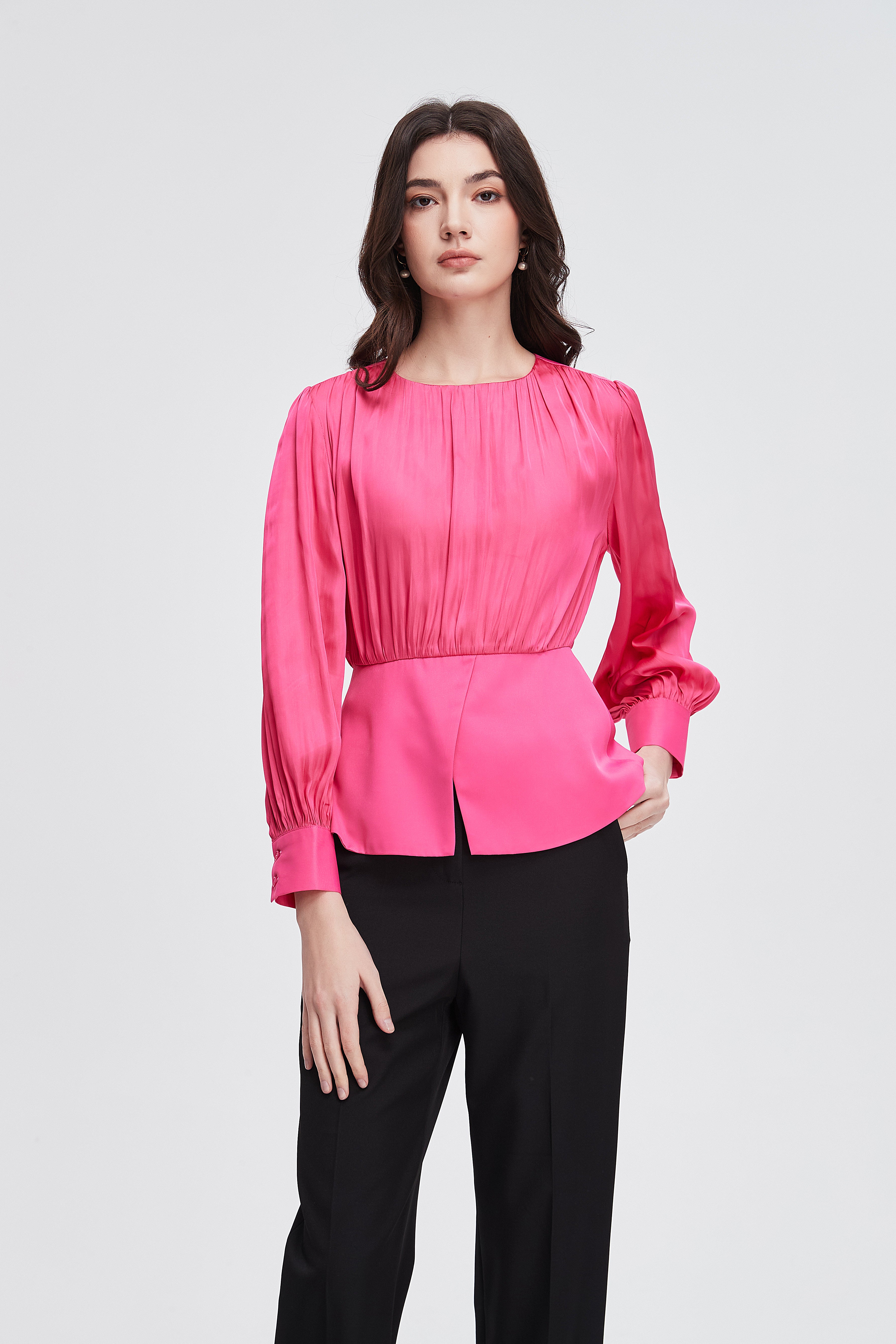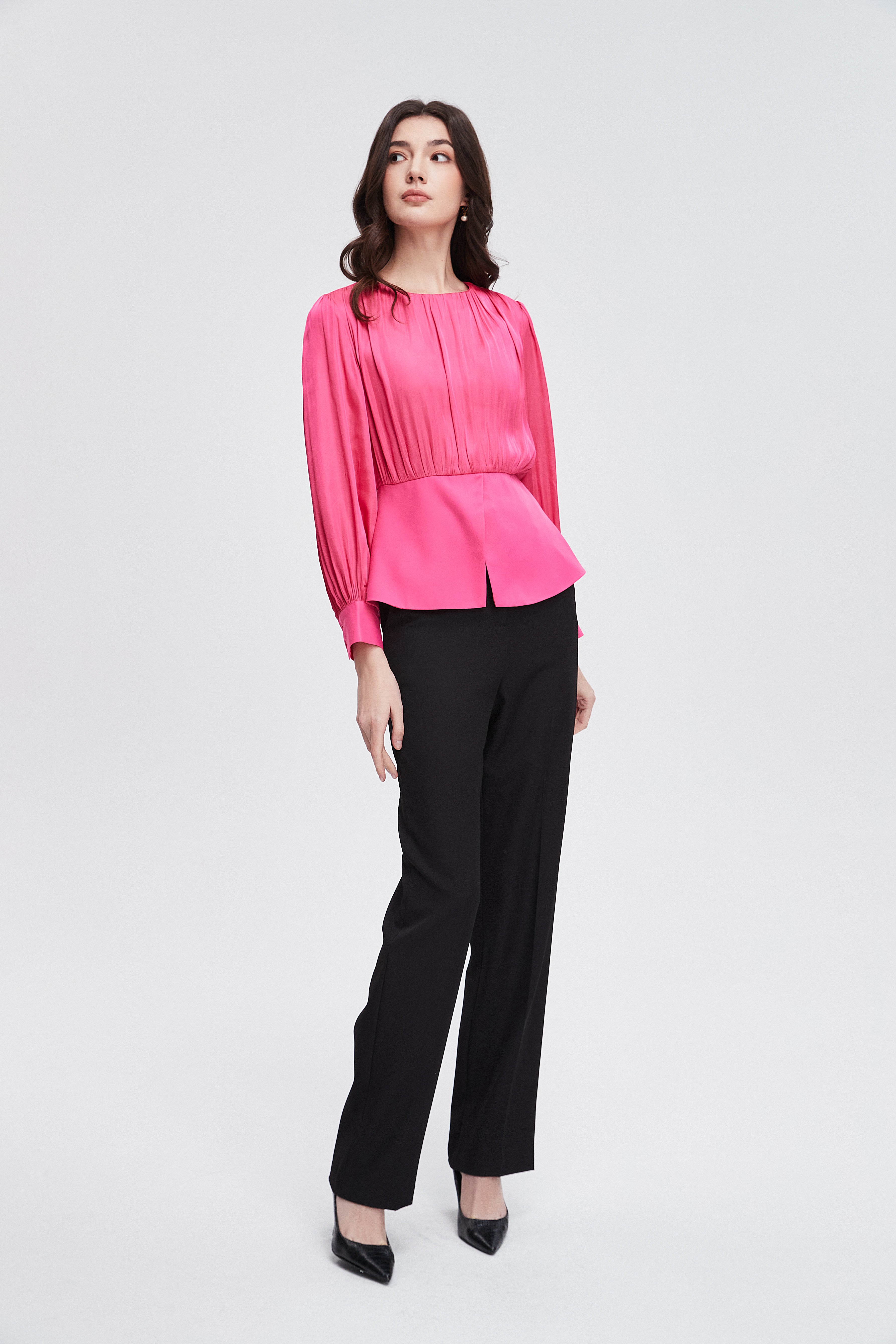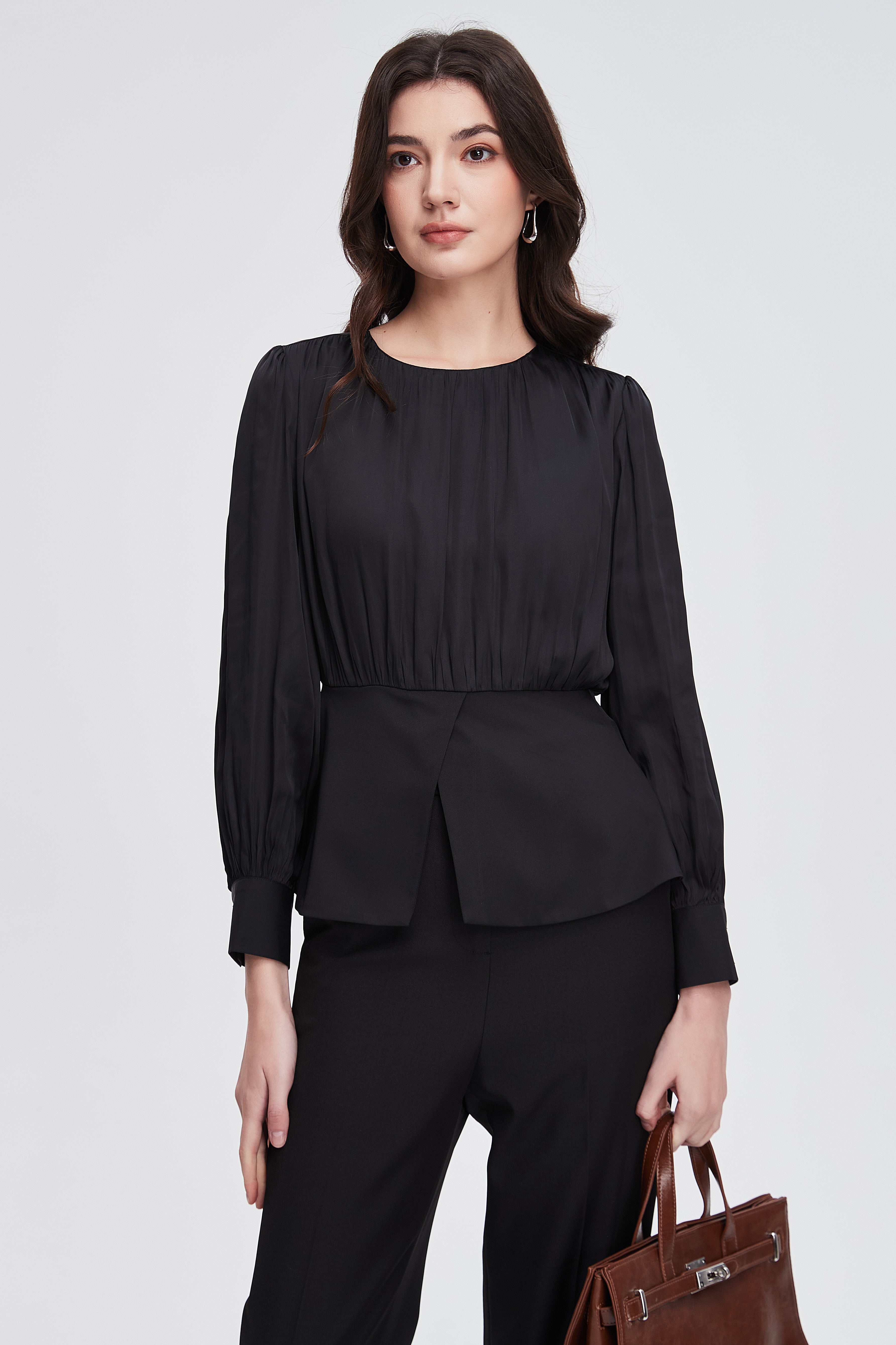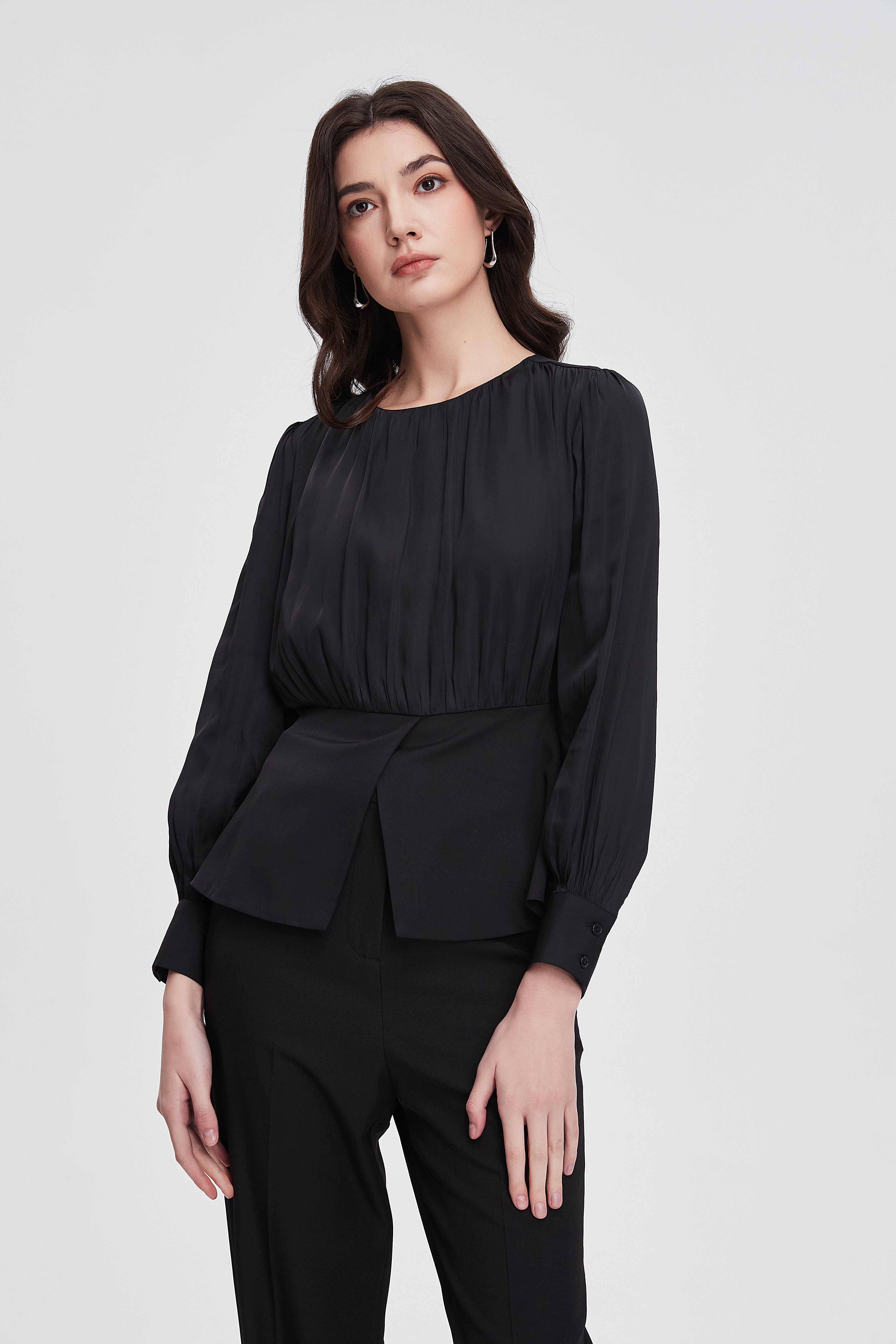 بلوزة نسائية بكم طويل واسع مكشكشة بفتحة رقبة مستديرة