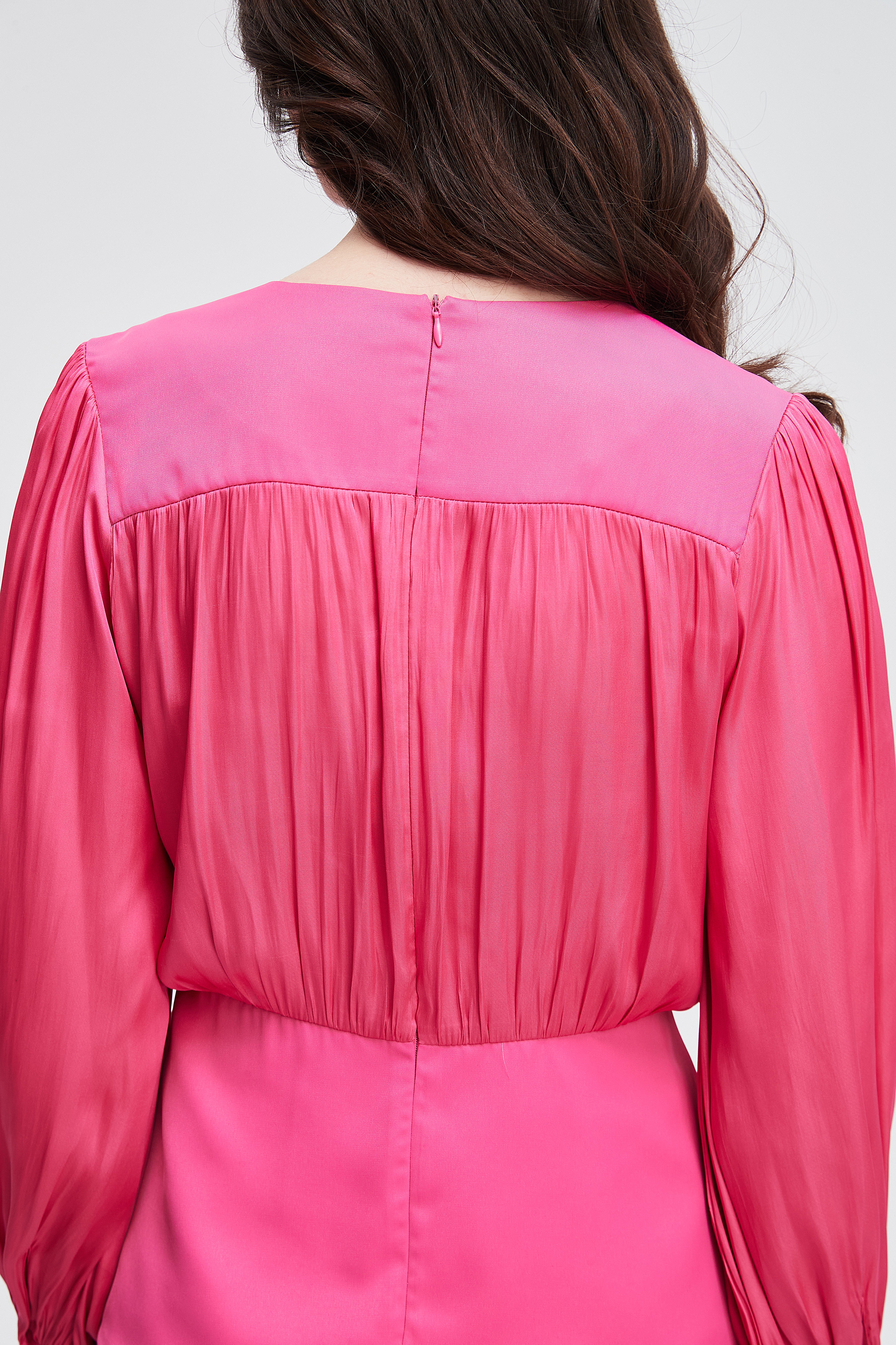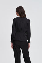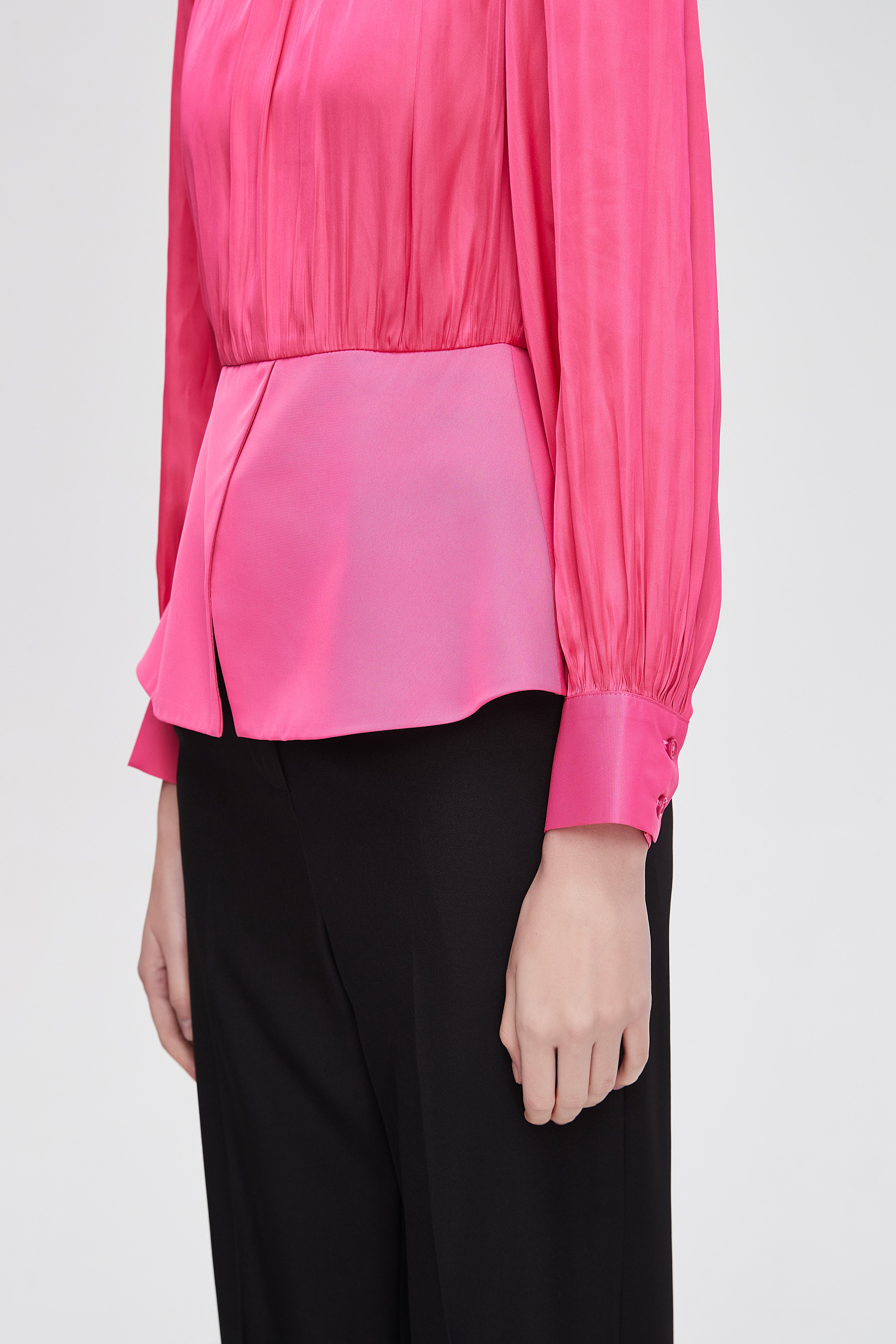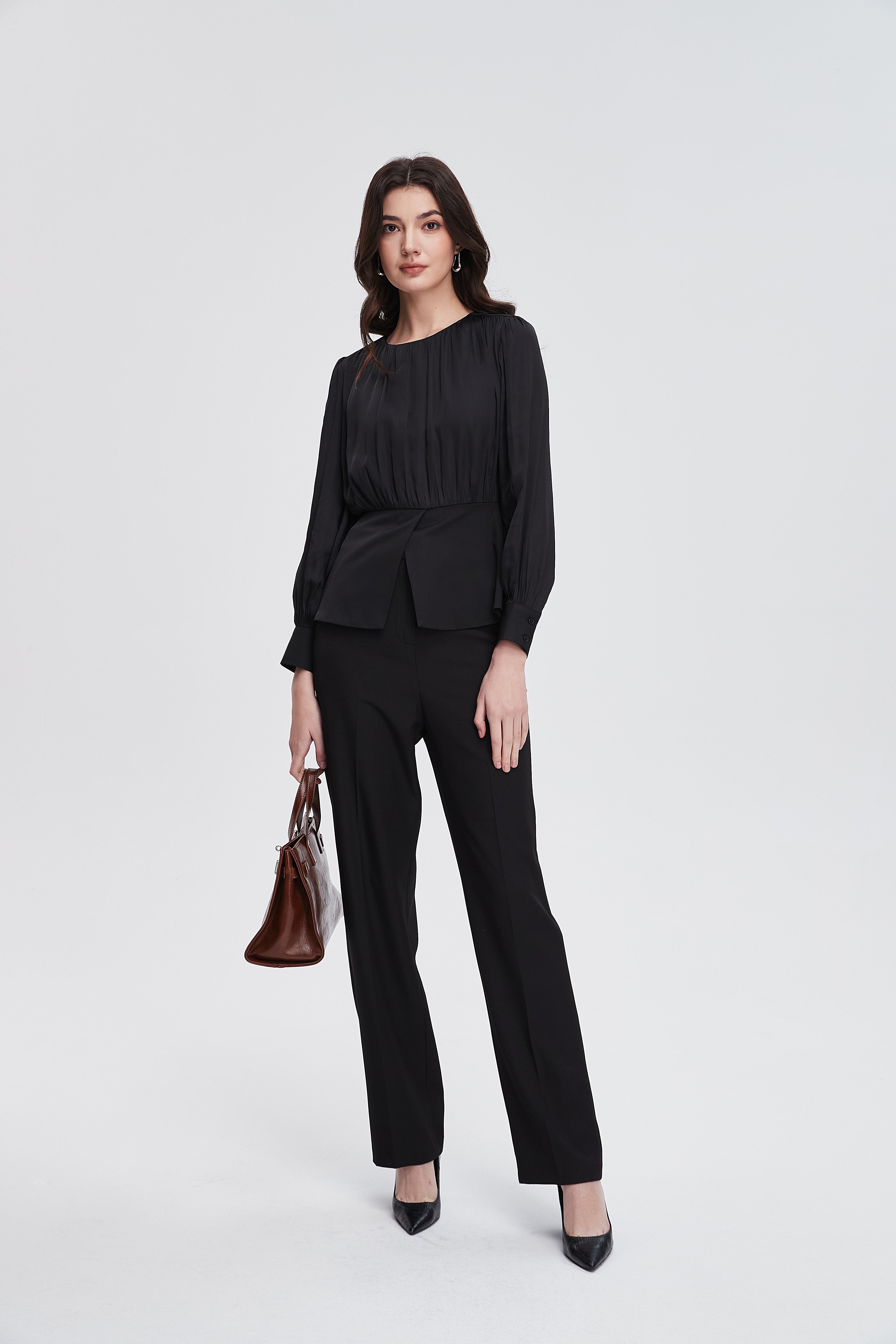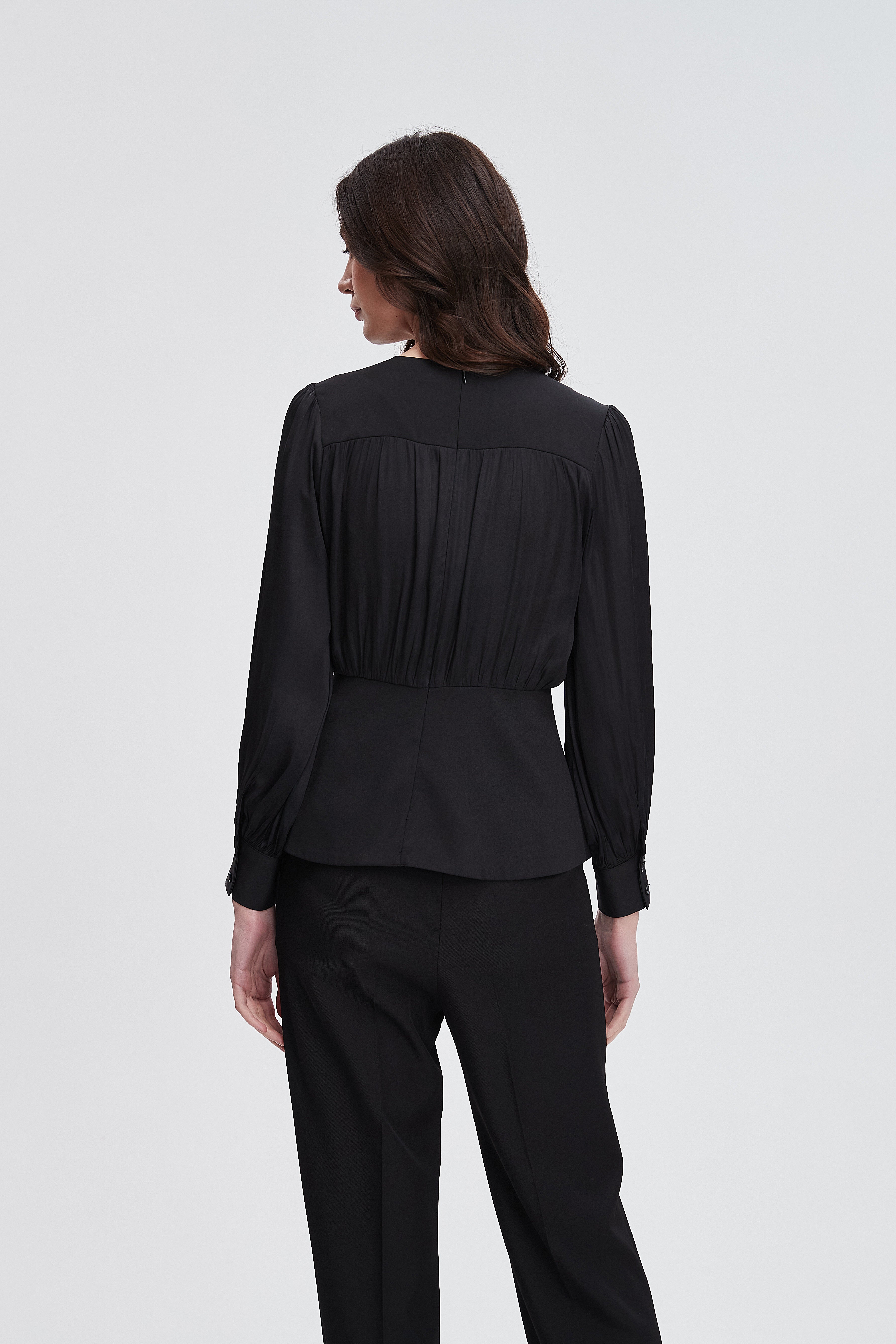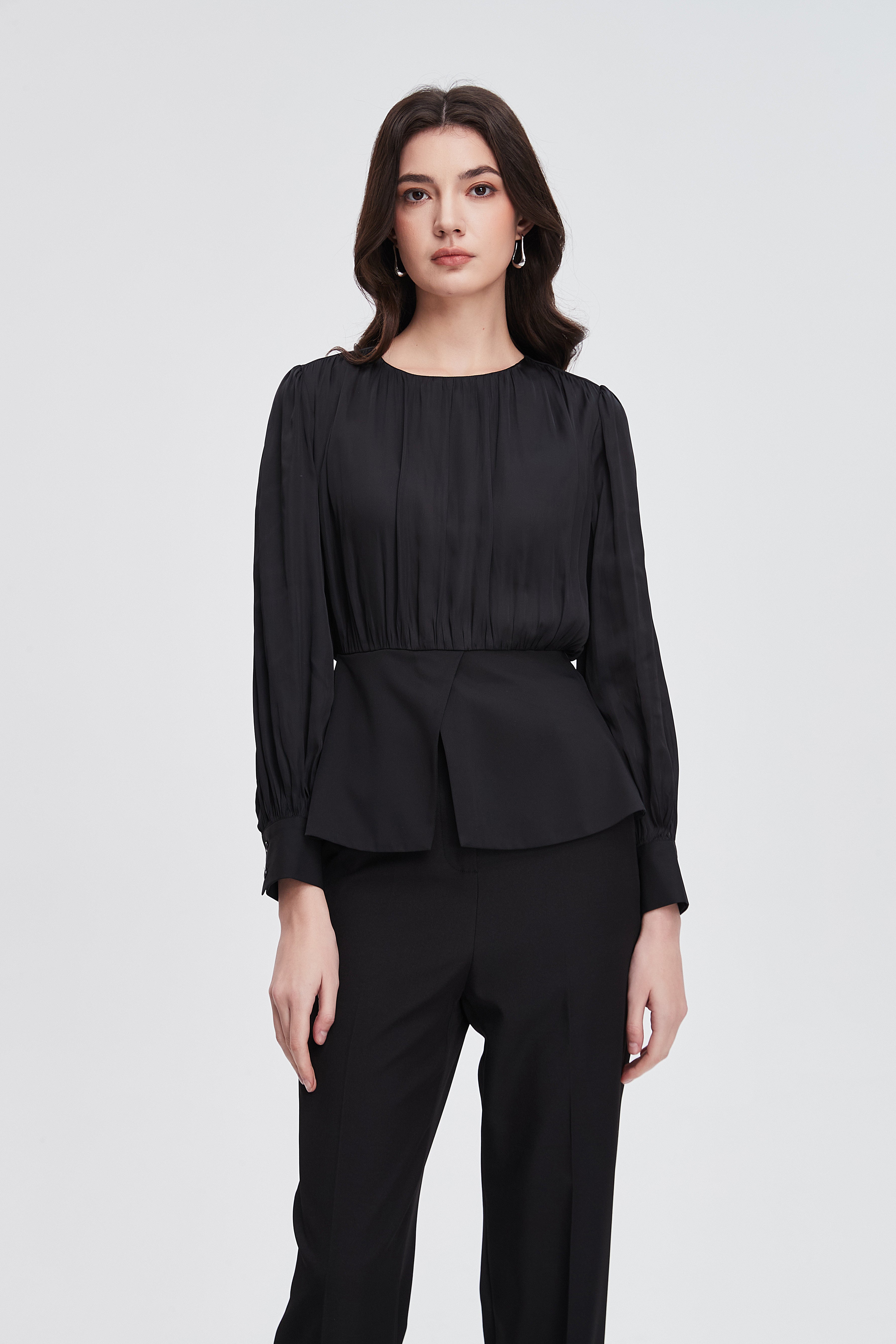 بلوزة نسائية بكم طويل واسع مكشكشة بفتحة رقبة مستديرة