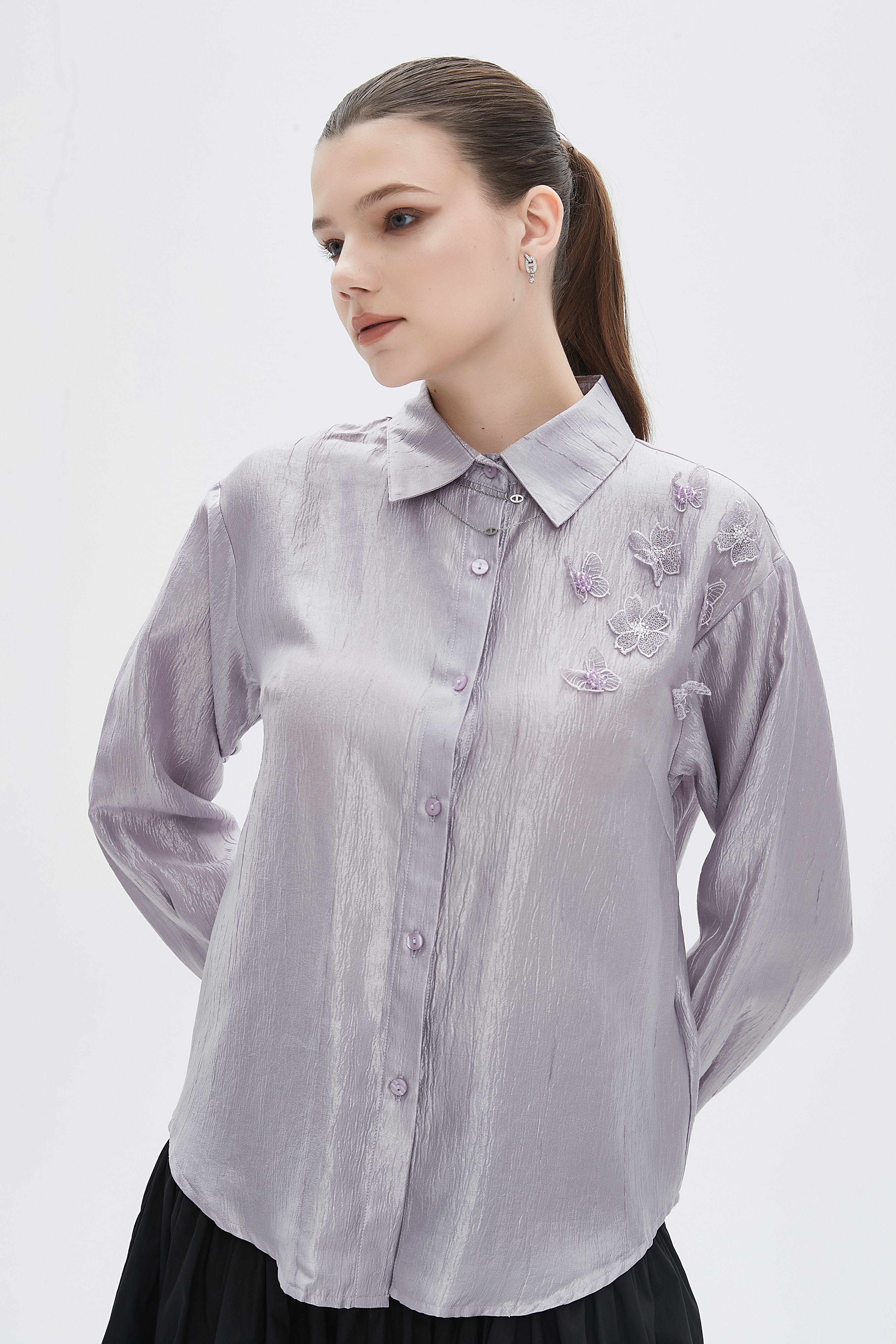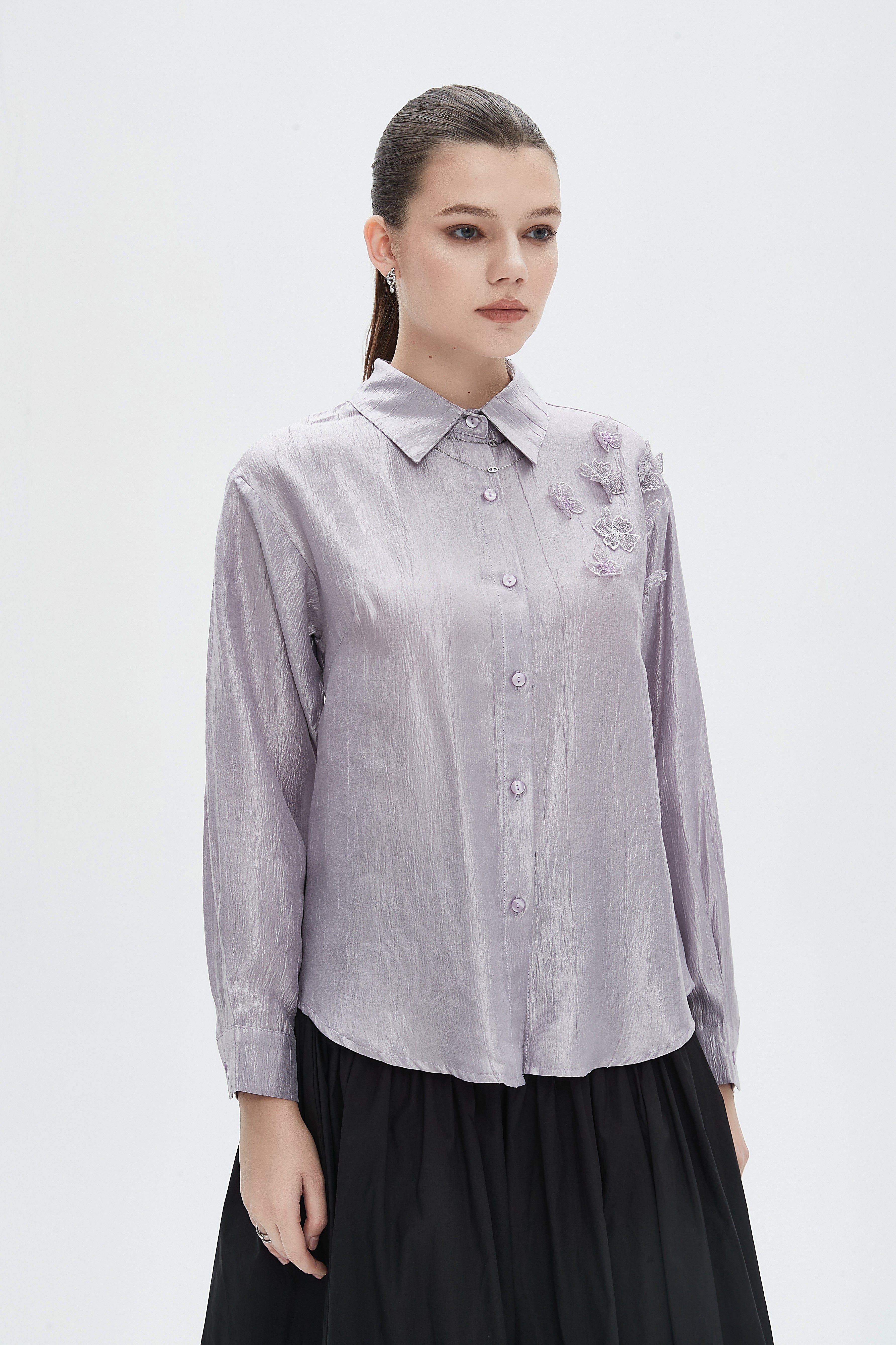 قميص نسائي كم طويل وبتطريز ورود على الكتف