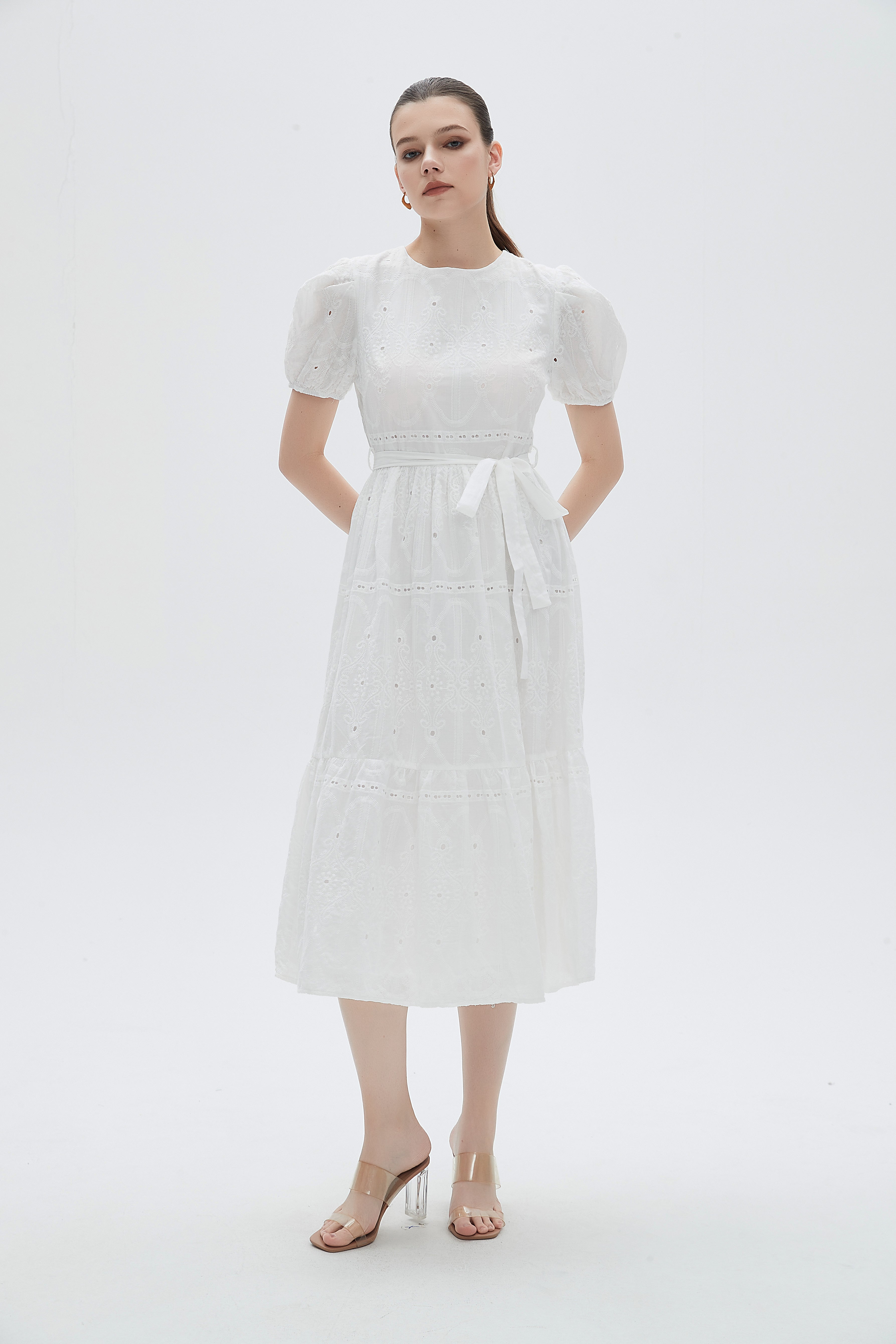 فستان ميدي نصف كم سادة برباط على الخصر