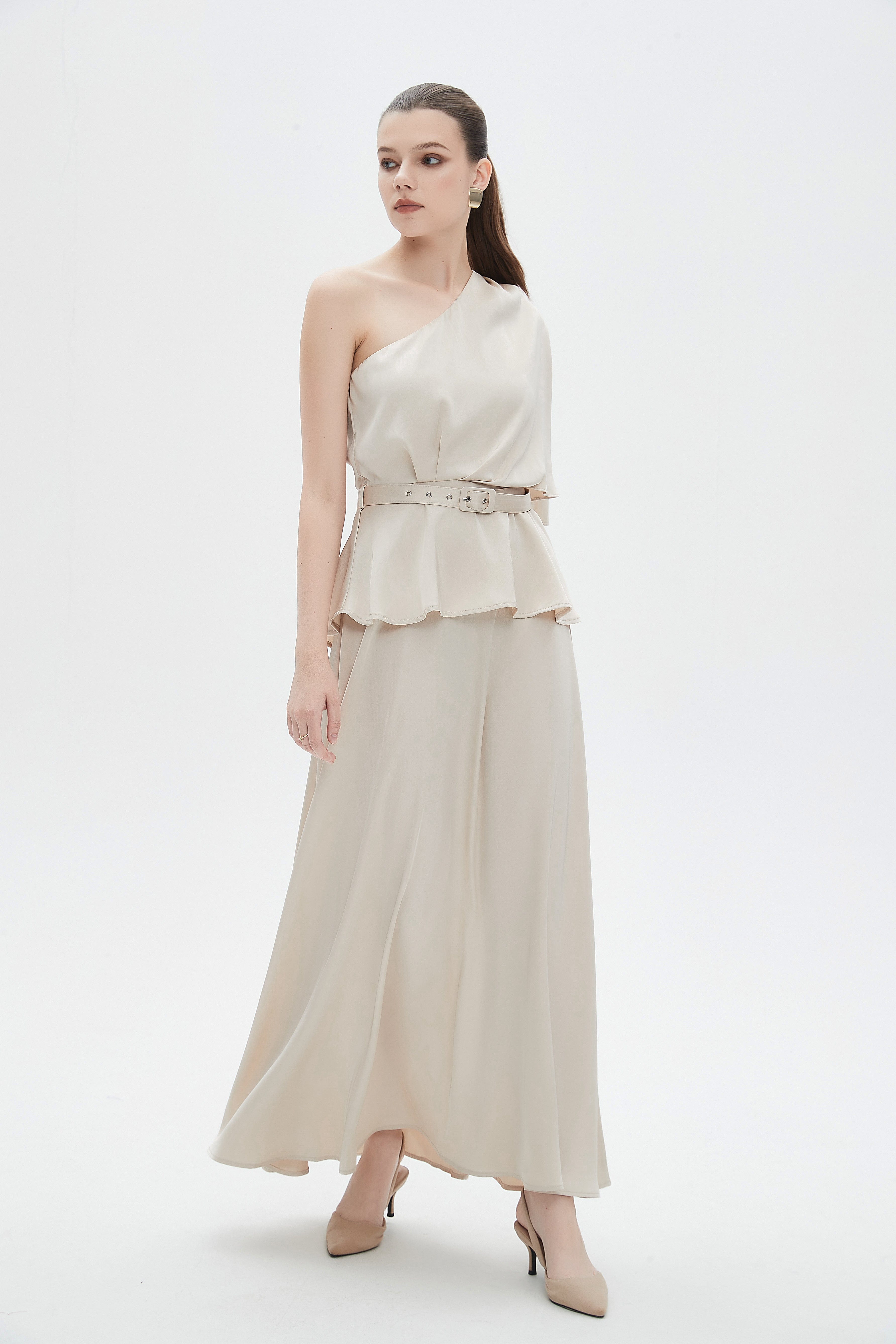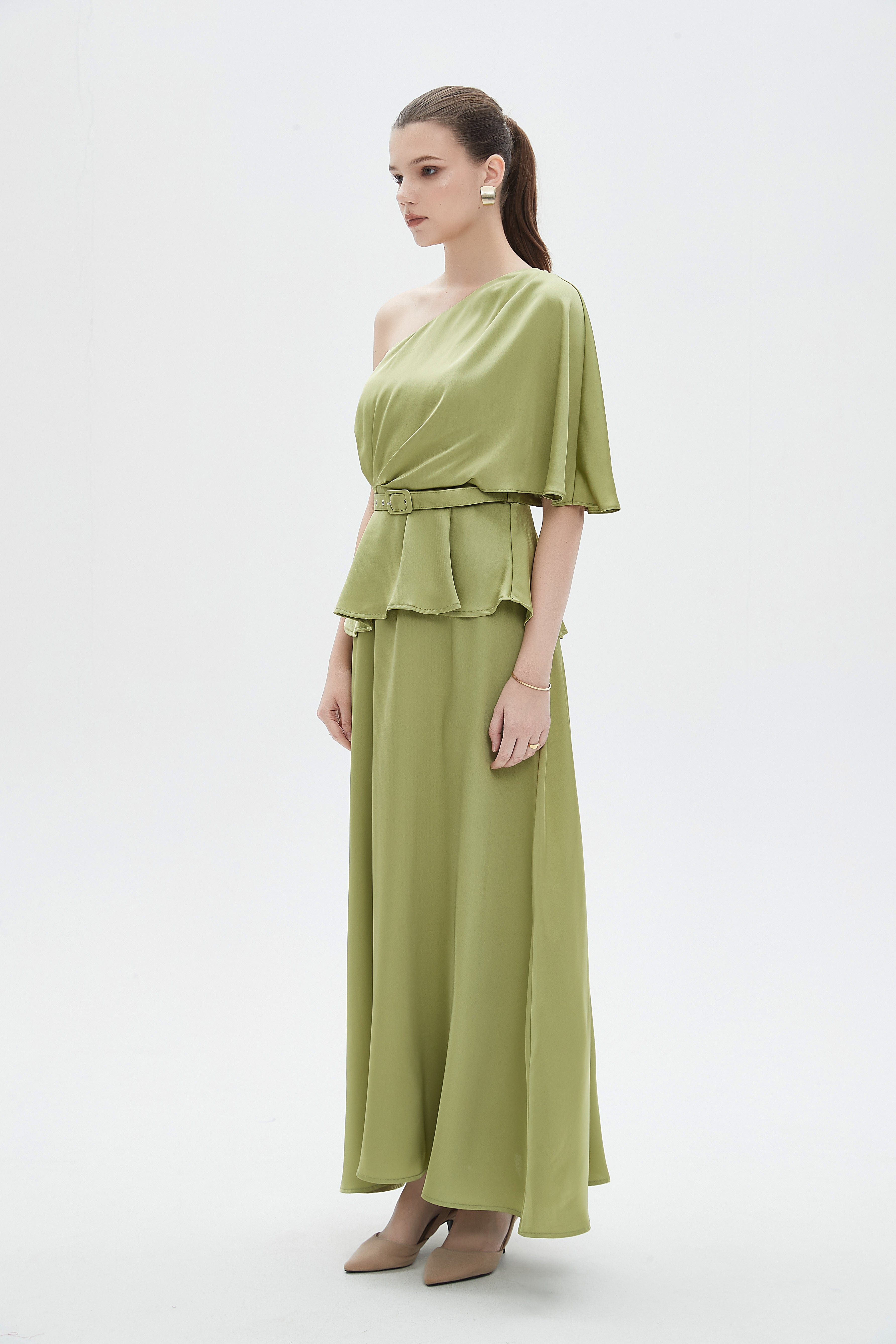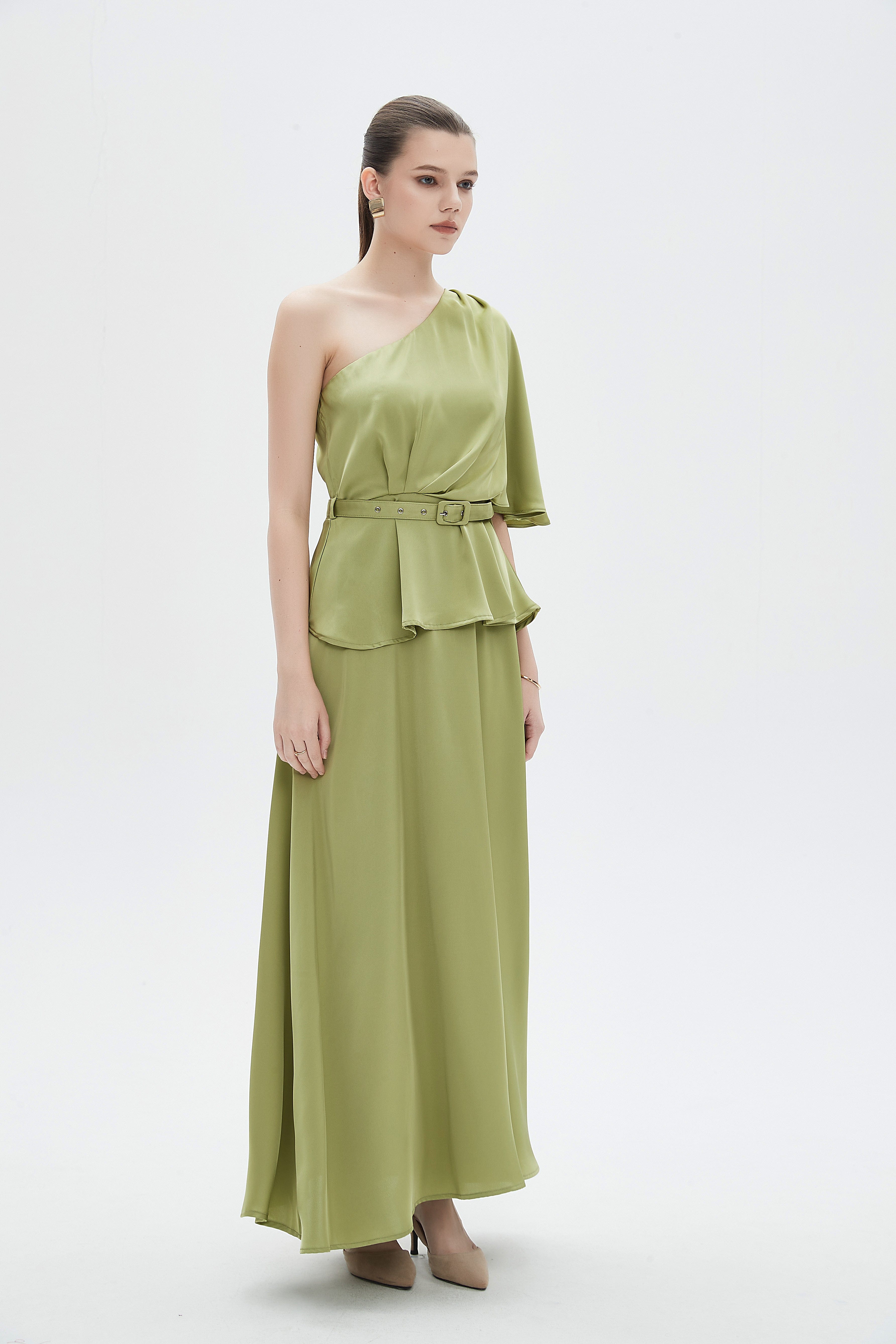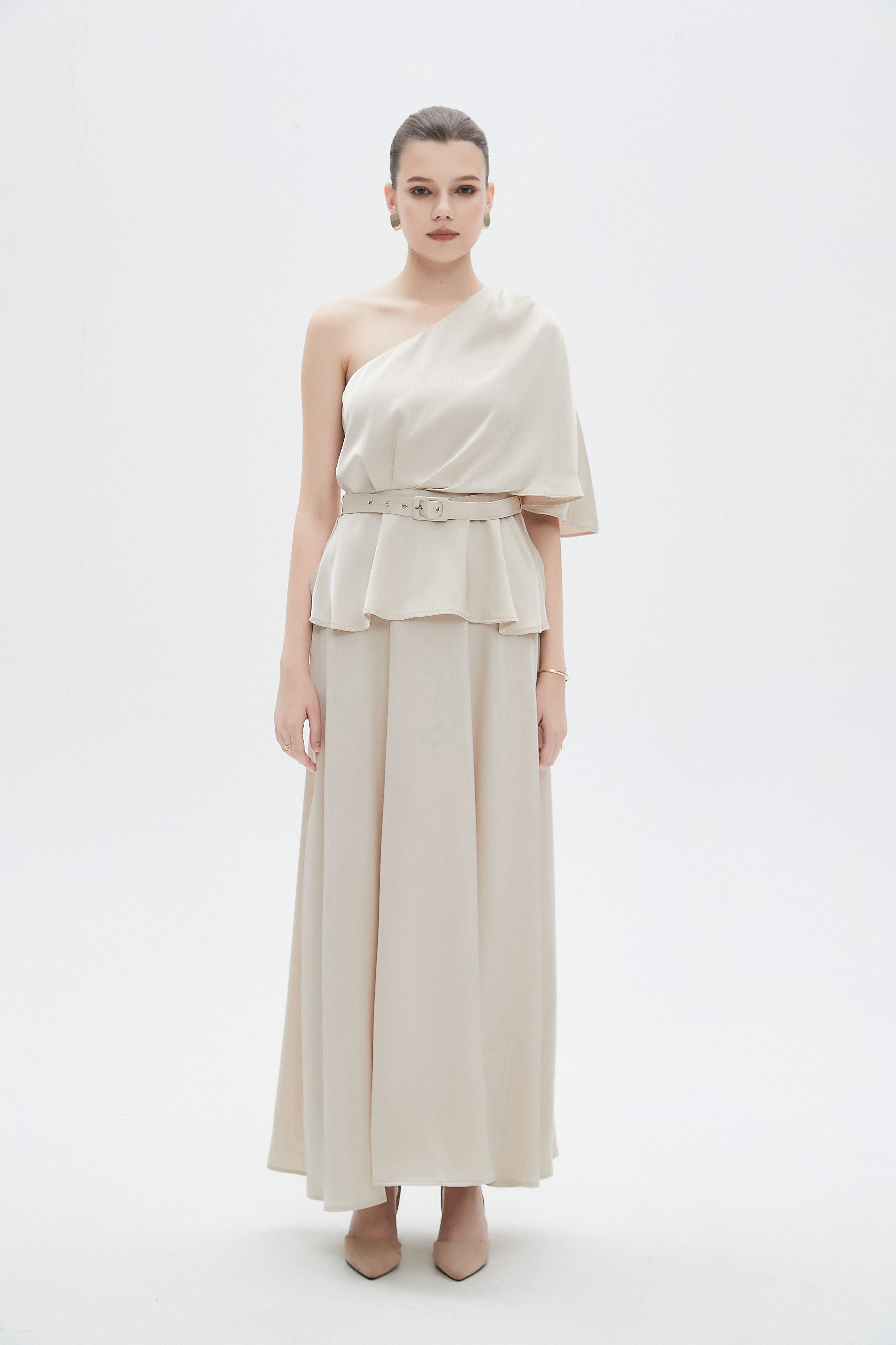 - الياقة/الكم: كتف واحد وذراع واحد لإطلالة عصرية