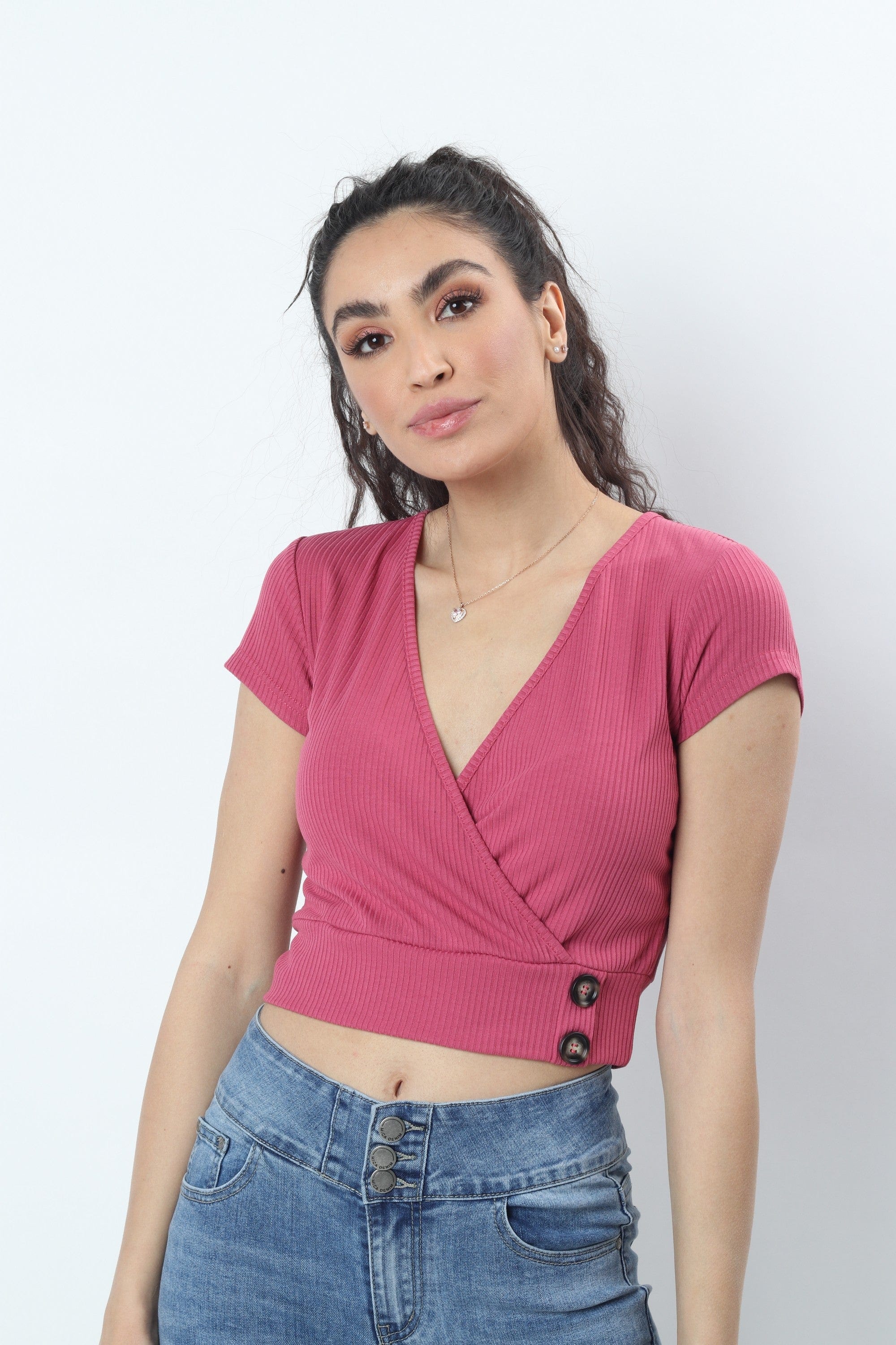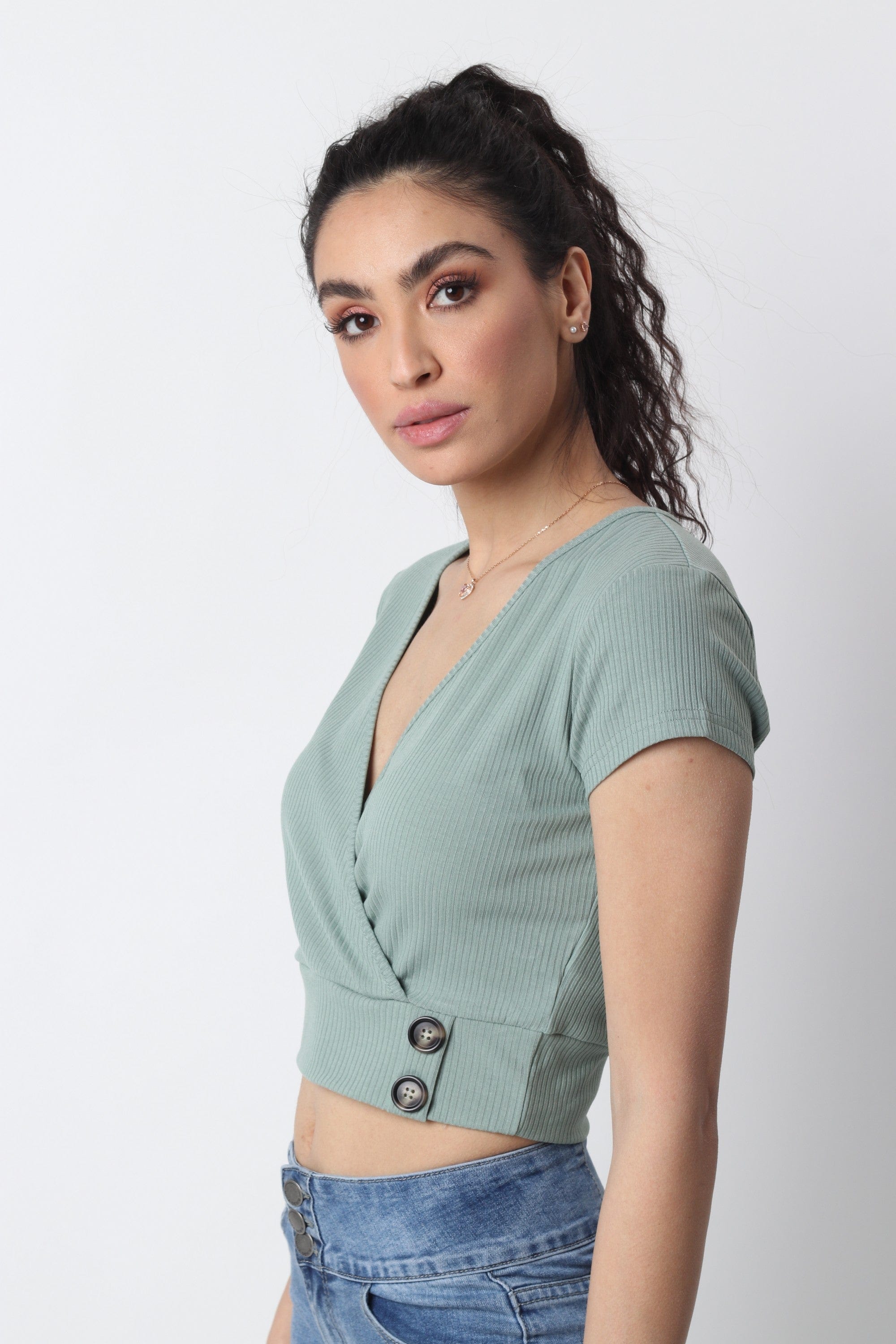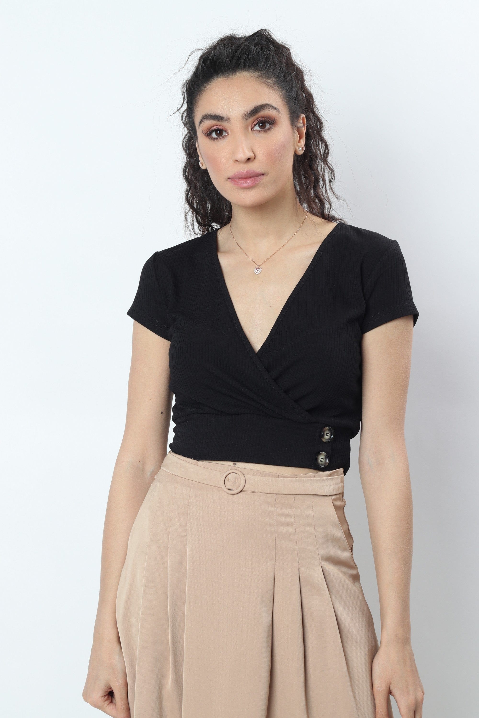 بلوزة قصيرة متداخلة بأزرار على الجانب كم قصير نسائي