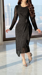 فستان ميدي بأكمام طويله بربطه من الخصر