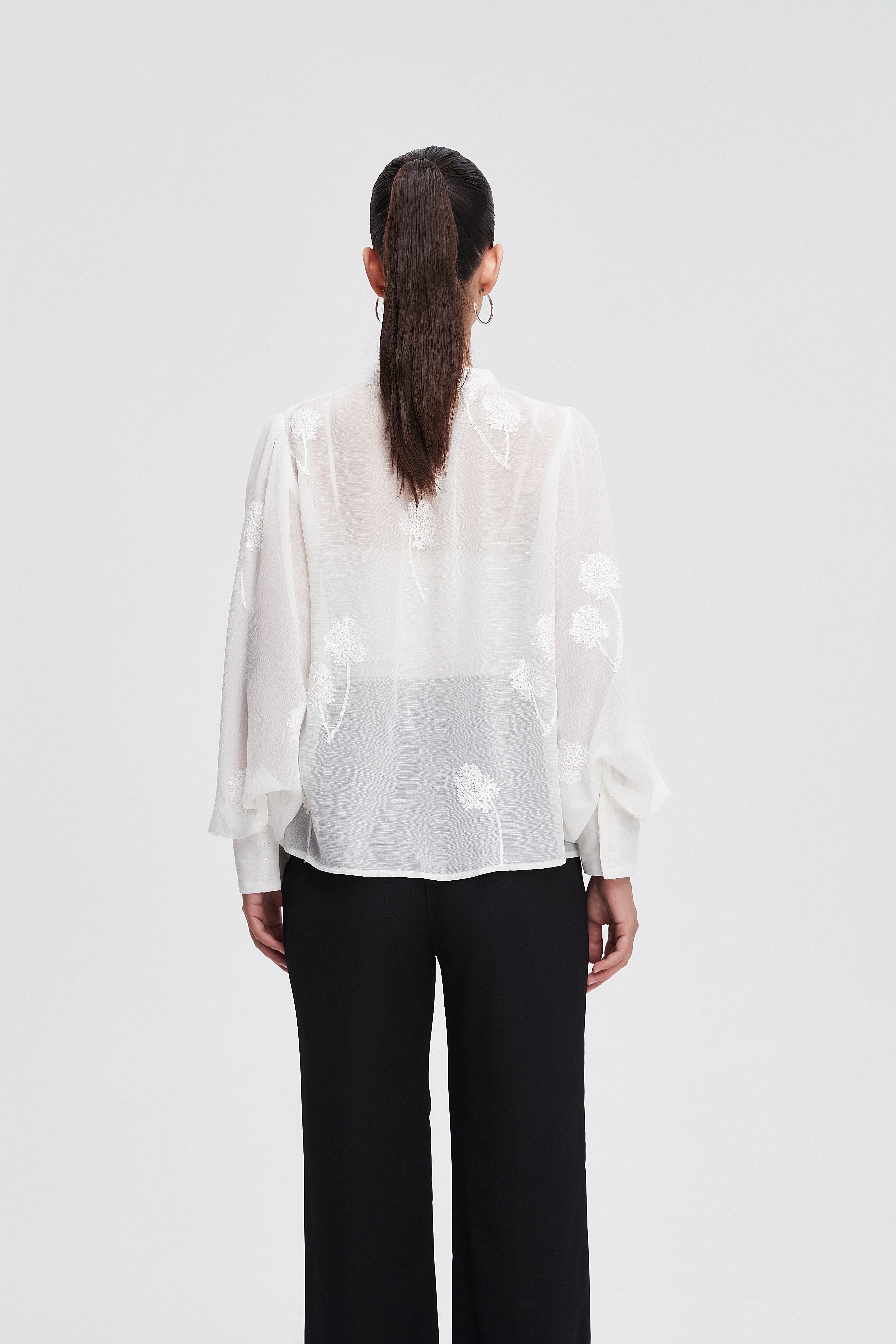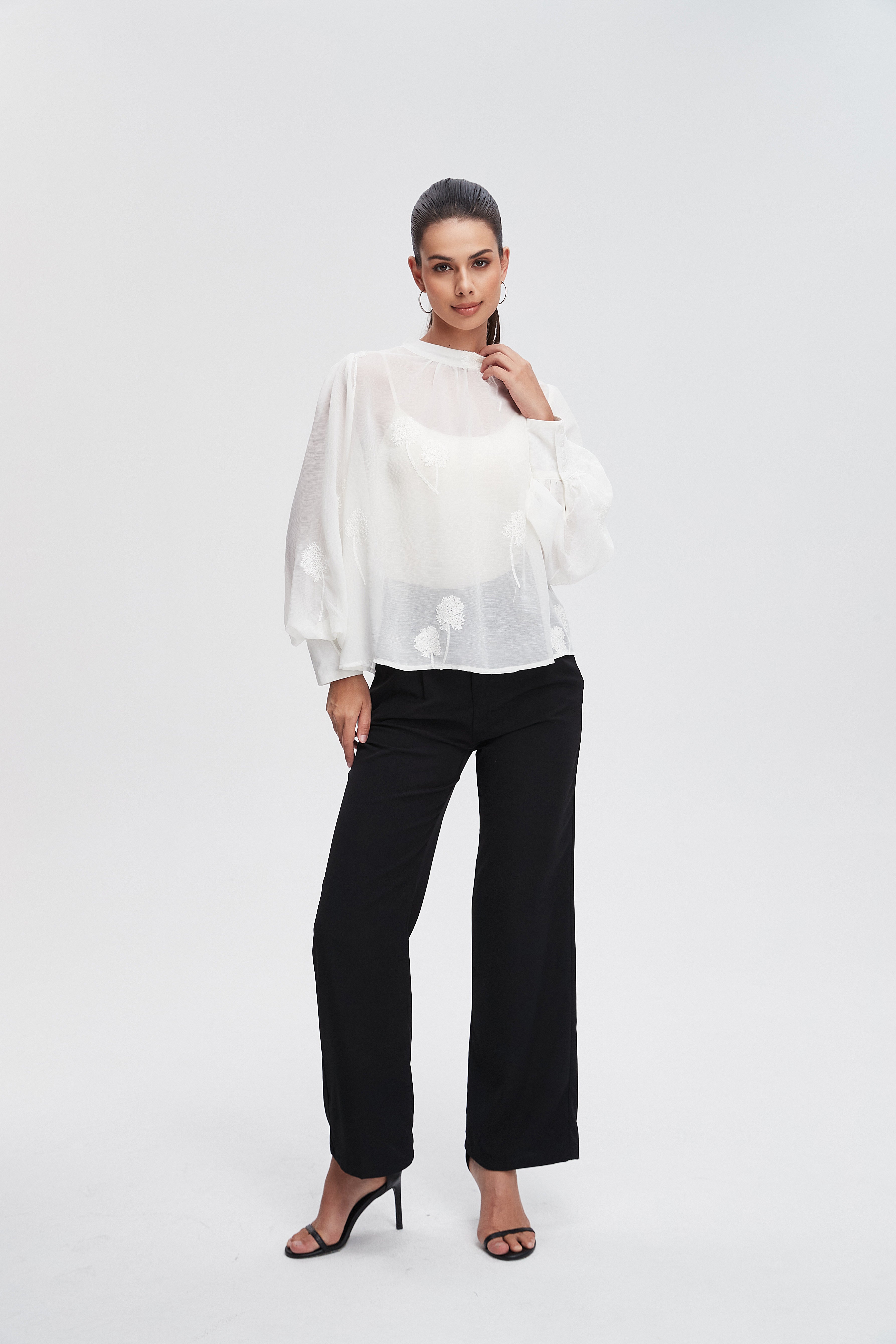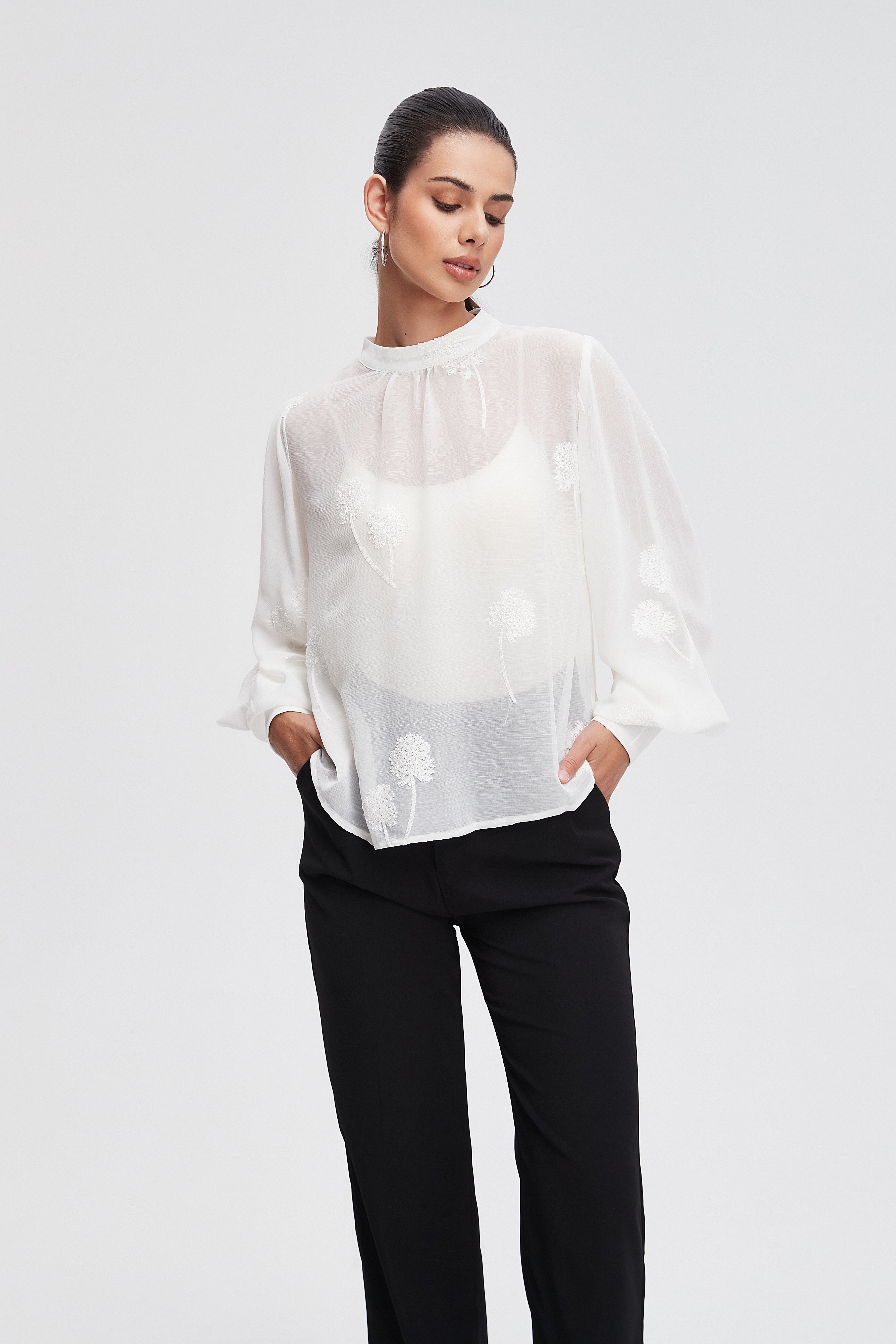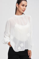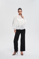 بلوزة بأكمام طويلة واسعة ورقبة مدورة