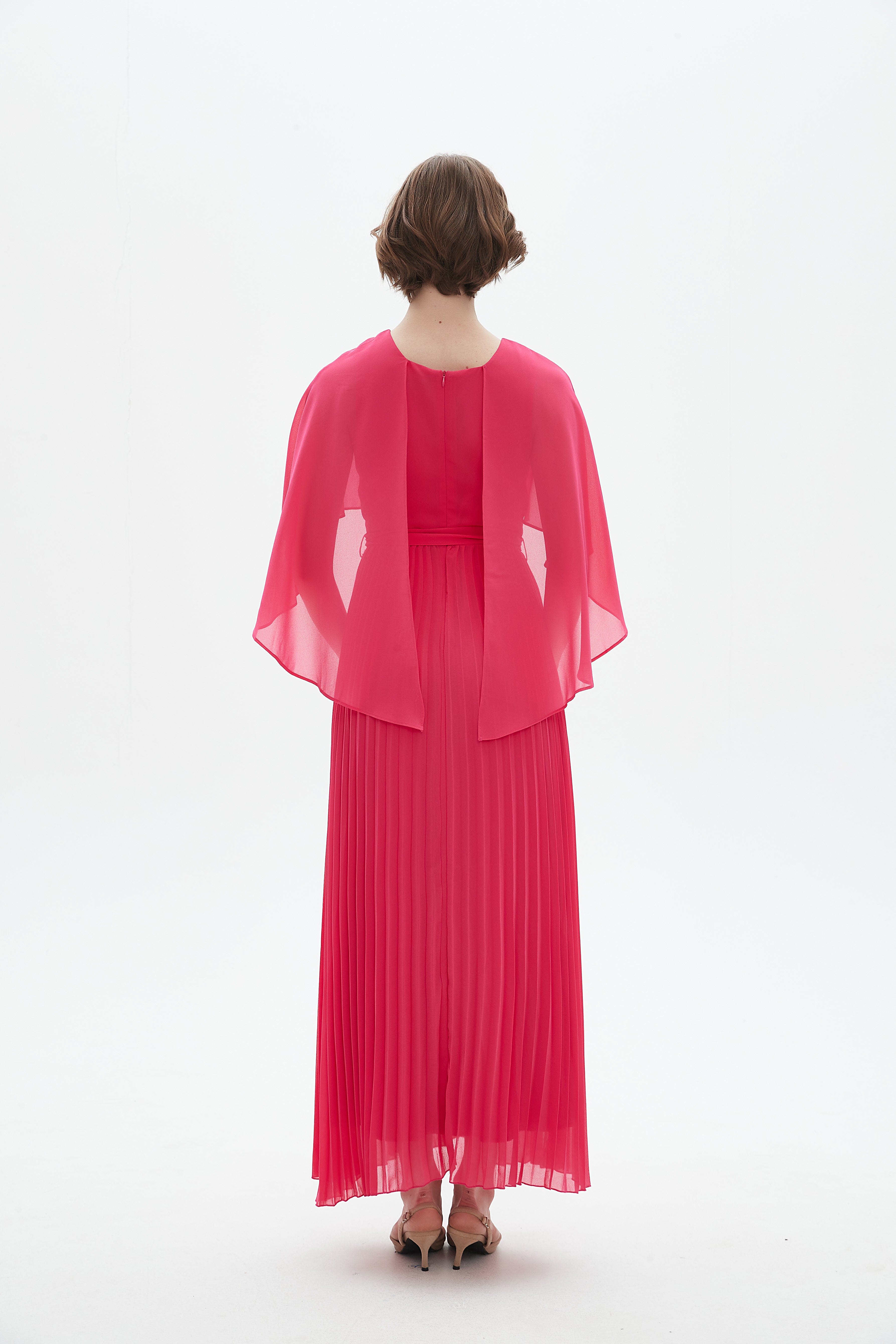 فستان طويل بأكمام كاب بيلسية وفتحة رقبة مستديرة