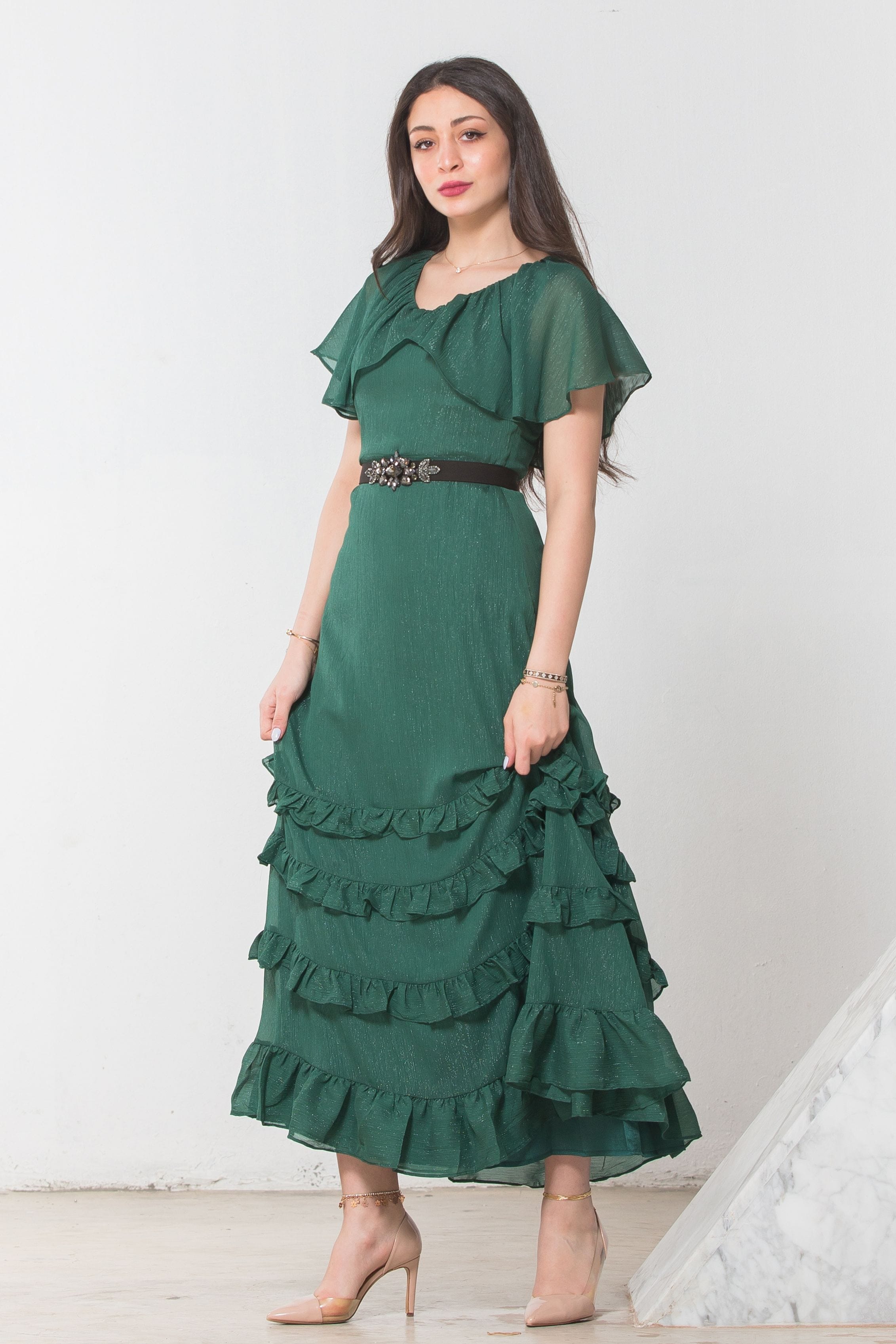 - سادة بلون أخضر مع حزام مرفق لتعريف الخصر