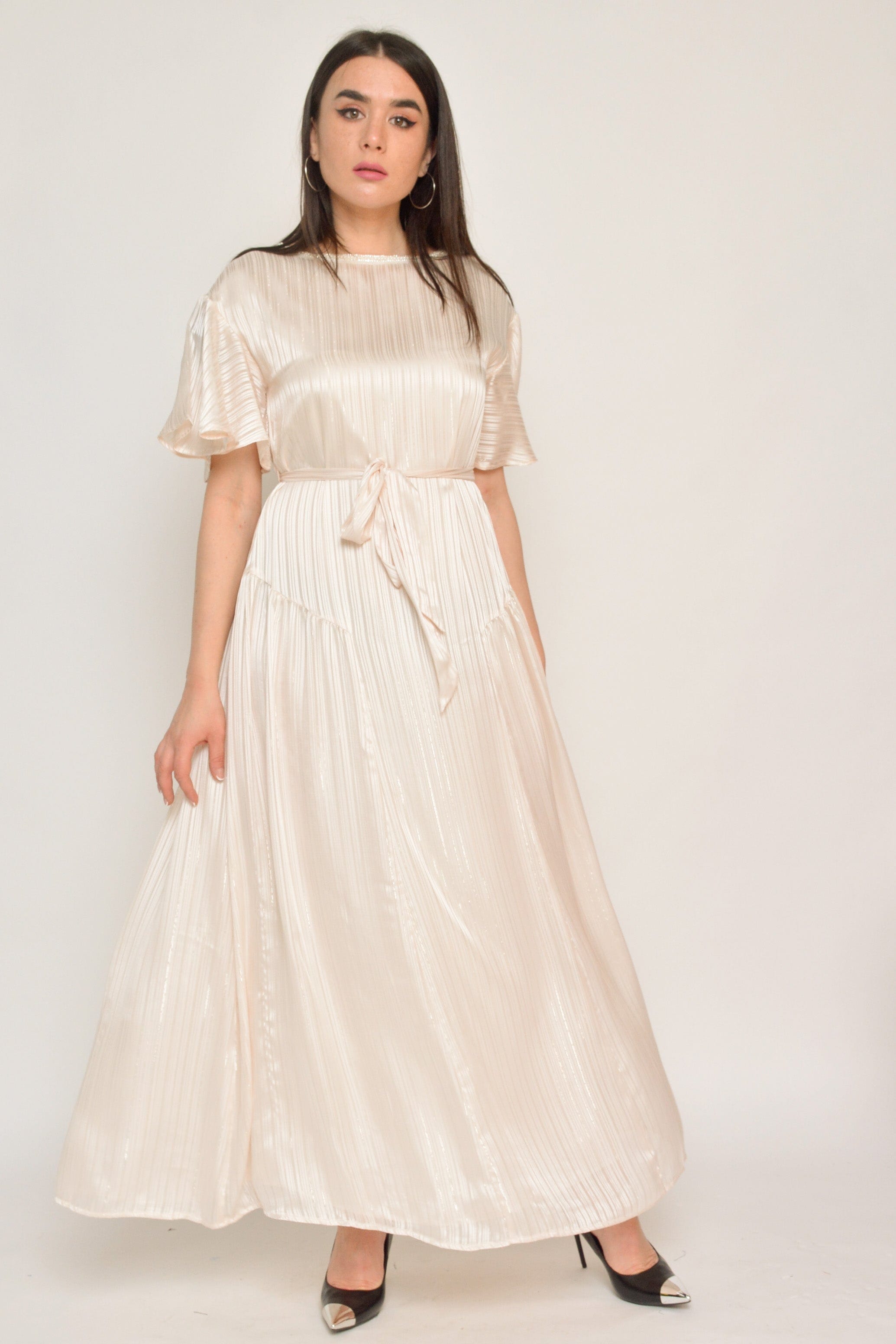 فستان طويل سادة ناعم بكسرات رقيقة برباط كم قصير