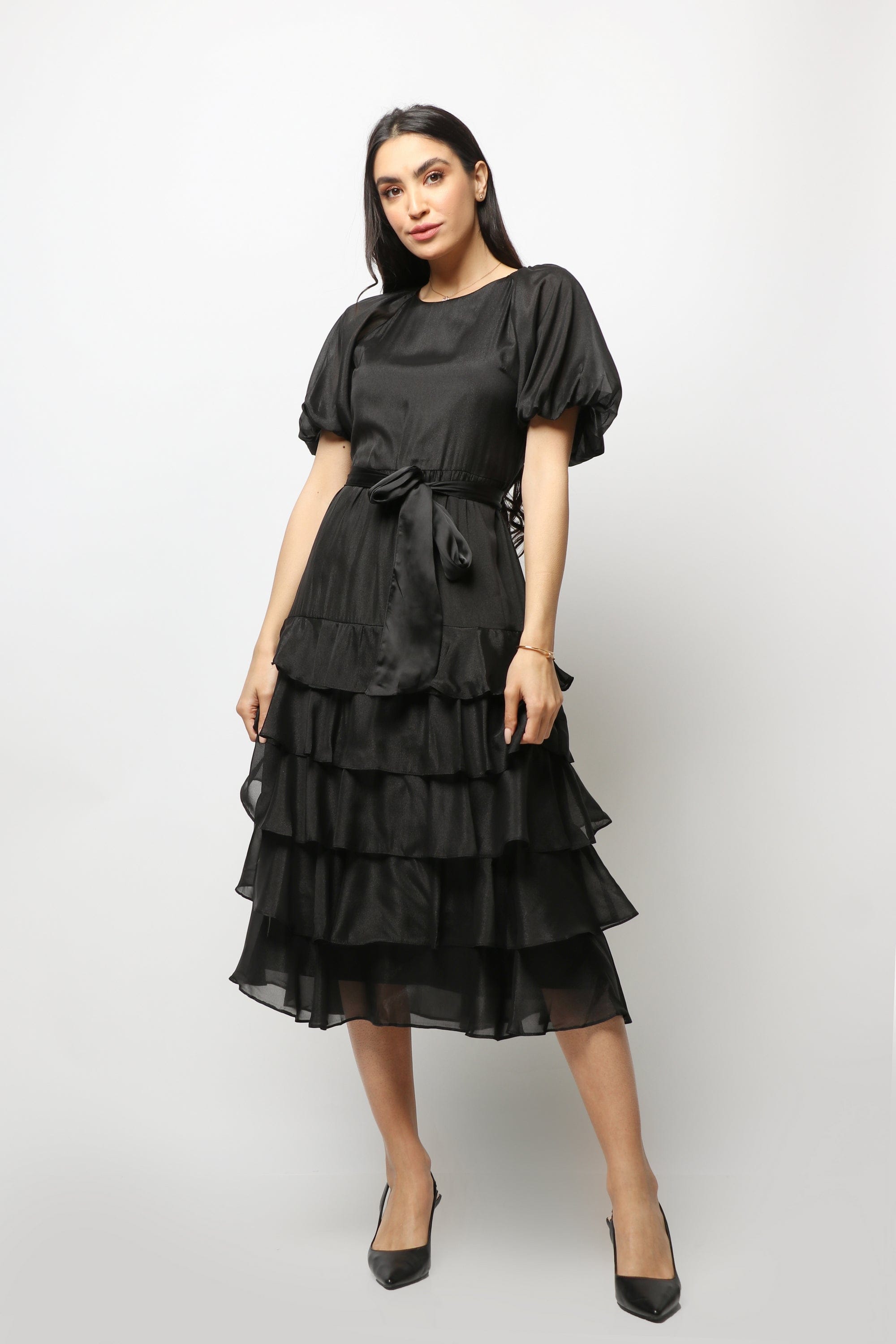 - ياقة مستديرة وأكمام منفوشة قصيرة لإطلالة مميزة