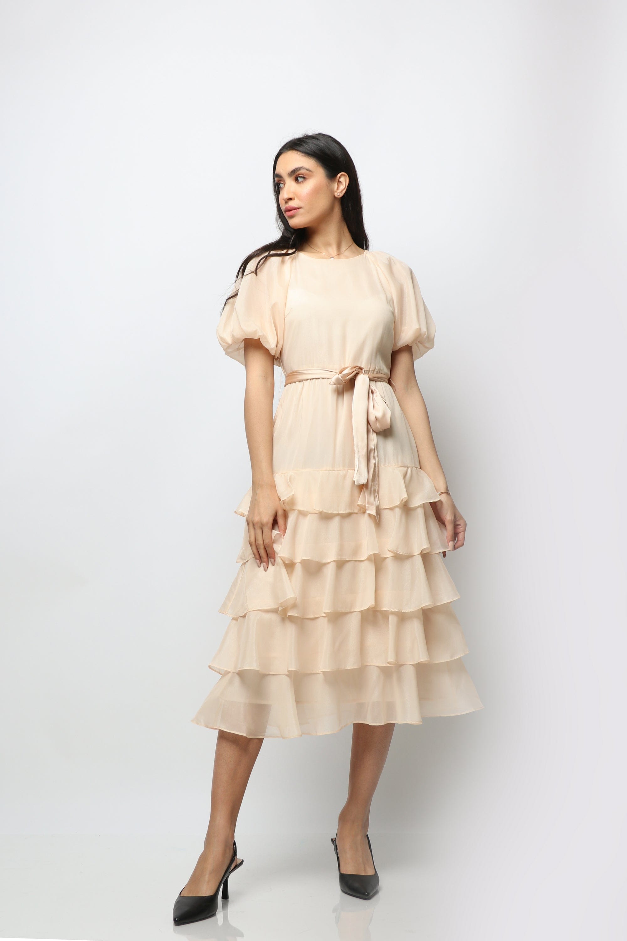 فستان ميدي شيفون مكشكش بربطة عند الخصر بكم قصير