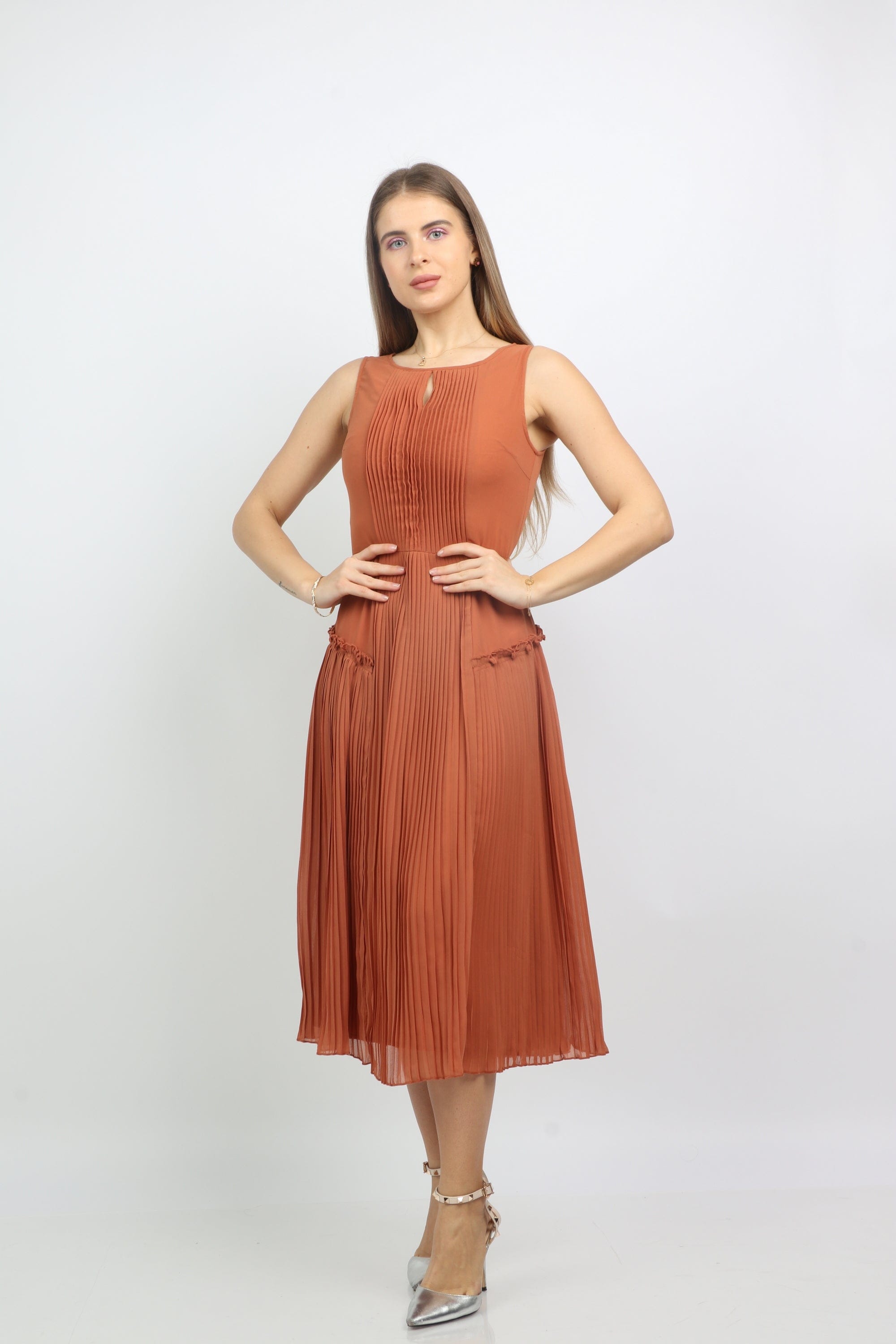 إذا كنتِ تبحثين عن فستان بسيط وعملي للنهار والمناسبات الكاجوال، هذا الفستان رائع. مصنوع من بوليستر 100% يمنحك خامة متينة وسهلة العناية، وسماكته المتوسطة تجعله مناسبًا لكل المواسم دون الحاجة لبطانة. التصميم بقصة A يعطيه طابعًا أنثويًا مع حركة خفيفة، وطوله الميدي يوازن بين الأناقة والراحة. الفستان سادة باللون البني مما يسهل تنسيقه، وياقته مستديرة وبأنه بلا أكمام تضيف لمسة بسيطة ومريحة للصيف أو للطبقات. لا يحتوي على جيوب ولا حزام، والقصة عادية تناسب الاستخدام اليومي. يمكنك ارتداؤه مع صنادل مسطحة لطلعات النهار، أو مع حذاء بكعب منخفض لمظهر مسائي بسيط، وستحبين كيف يتحرك معك ويمنحك إطلالة أنثوية دون تعقيد. اعثري على مقاسك في فاشن السعودية وأضيفي هذه القطعة المتنوعة إلى خزانة ملابسك اليوم.