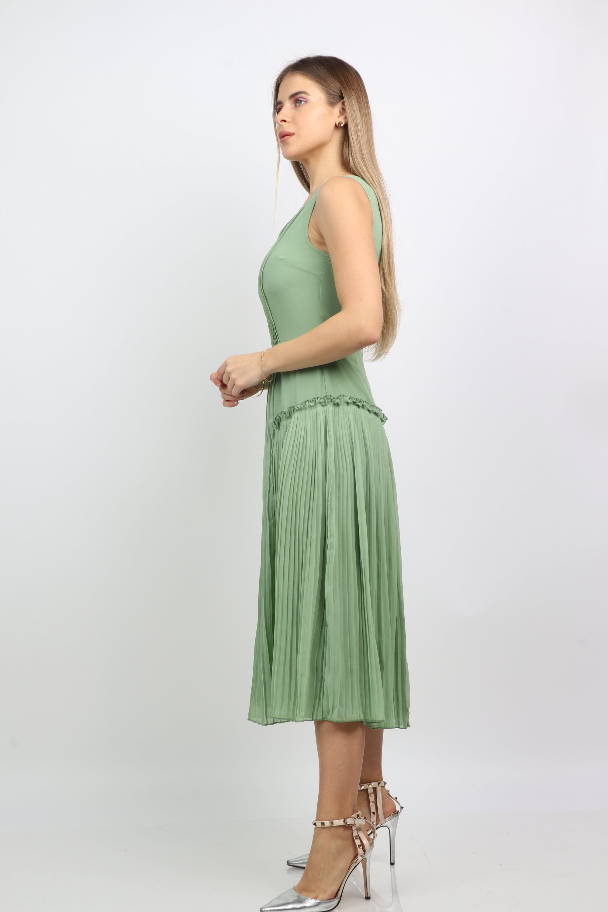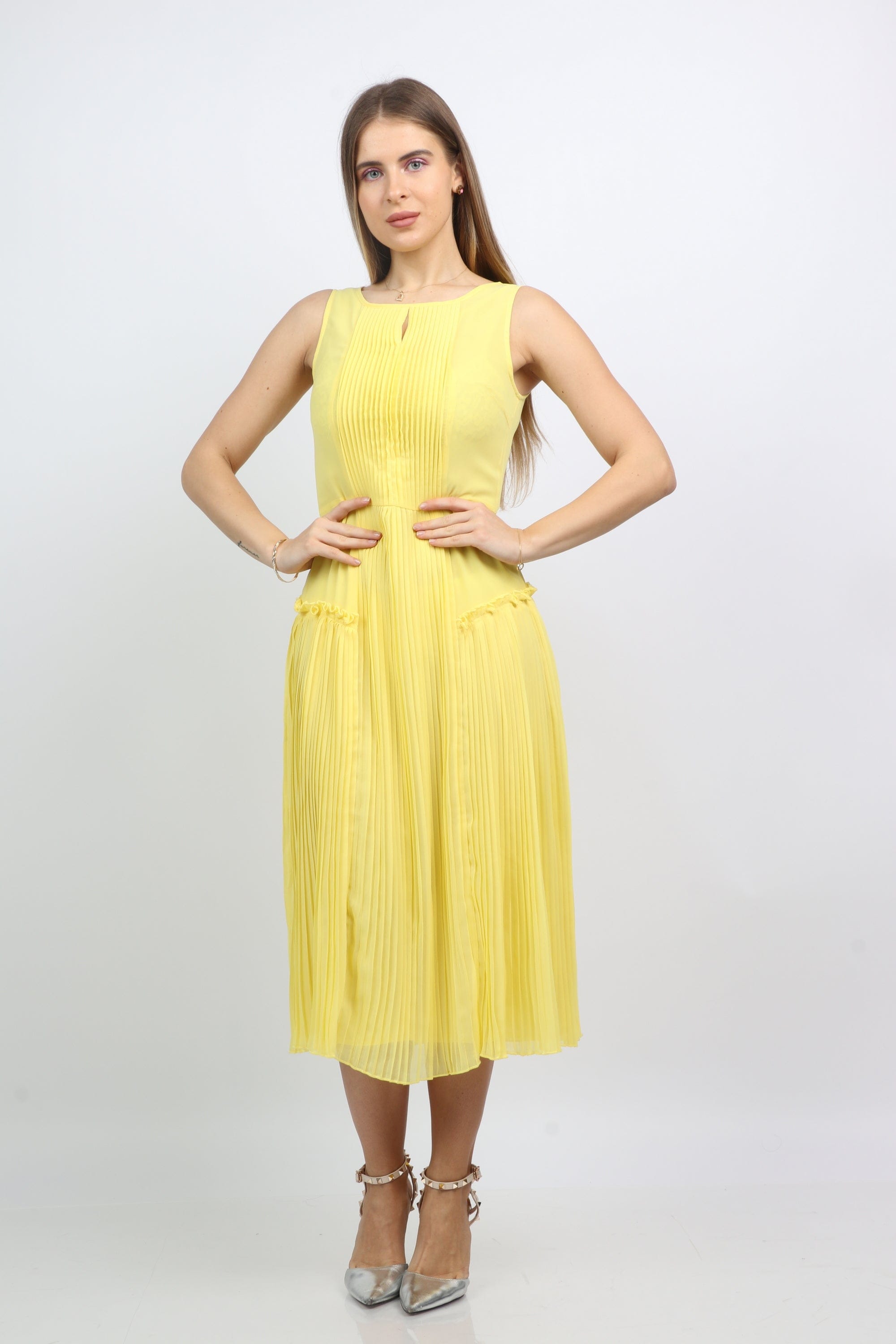 فستان ميدي بيليسيه سادة فتحة صدر مربعة بدون كم