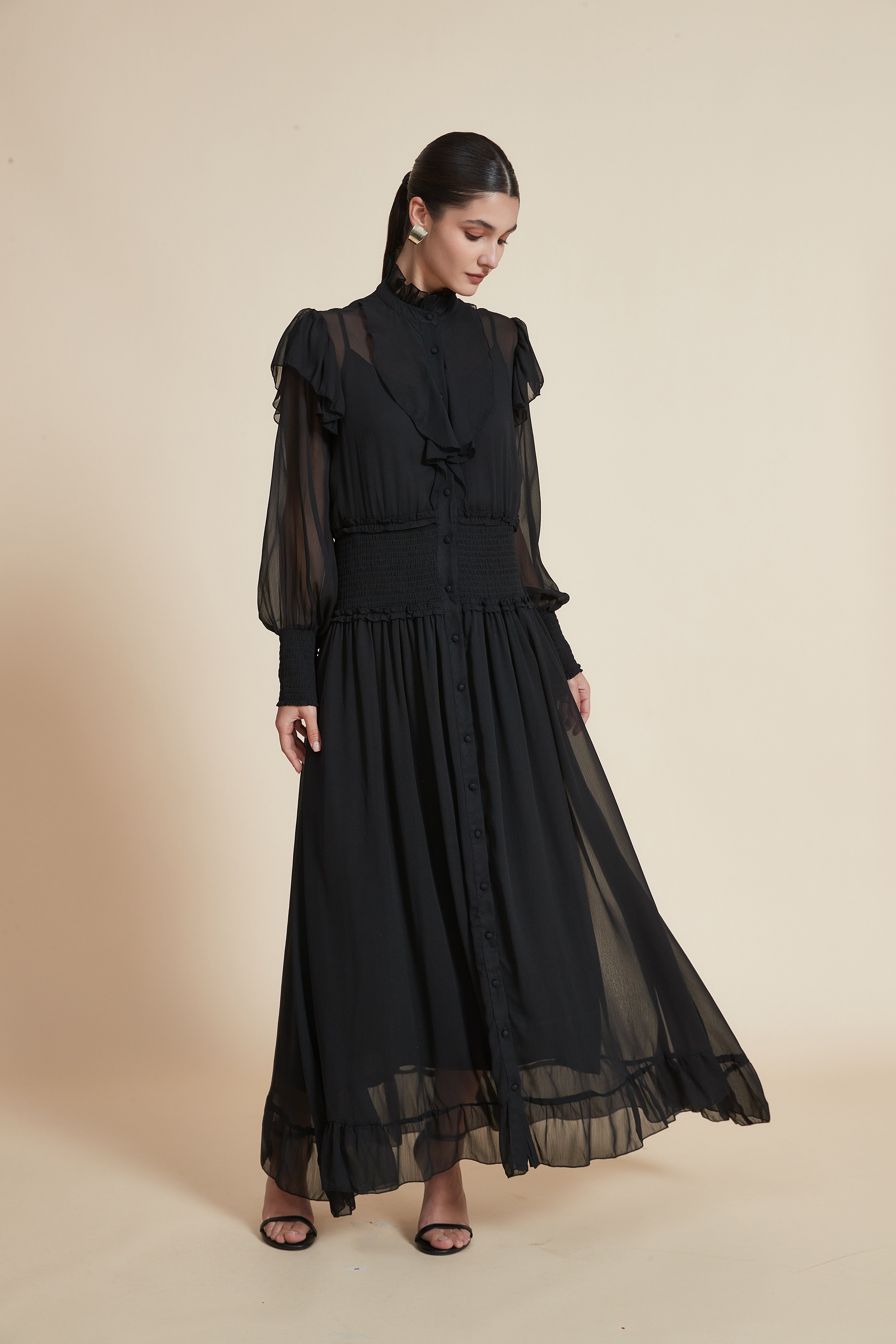 إذا تبحثين عن فستان يجمع الأناقة والراحة في إطلالة واحدة، هذا الفستان الماكسي بقصة A سيعجبك. خامته 100% بوليستر مع بطانة 100% فيسكوز تمنحه مظهر مرتب وتجعله مريحاً على البشرة، مع سماكة متوسطة مناسبة لكل المواسم. ياقة عالية وأكمام طويلة تضيفان لمسة أنثوية ومحتشمة، والإغلاق الكامل بالأزرار يتيح لك التحكم بالتهوية والأسلوب. تصميمه السادة باللون الأسود مناسب للمناسبات الأنيقة والخروجات الرومانسية، وستحبين كيف يتحرك معك ويمنح طلة انسيابية وطويلة. القَصّة العادية تمنحك راحة يومية دون تكلف، ولا يحتوي على جيوب أو حزام، والبطانة تعزز الاحتشام والشكل المنسدل. قطعة بسيطة لكنها قوية لمخزونك من الفساتين الأنيقة. اعثري على مقاسك في فاشن السعودية وأضيفي هذه القطعة المتنوعة إلى خزانة ملابسك اليوم.