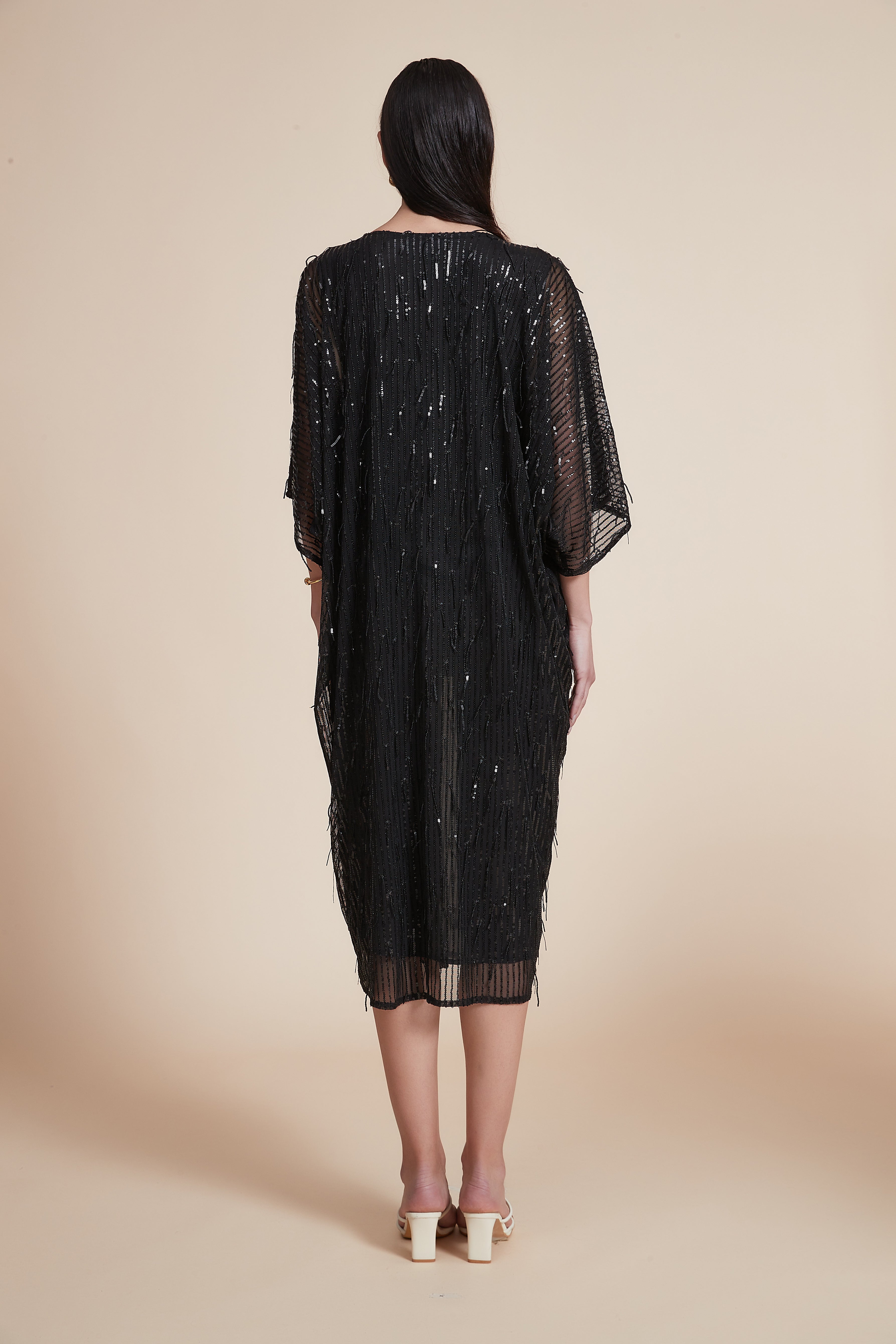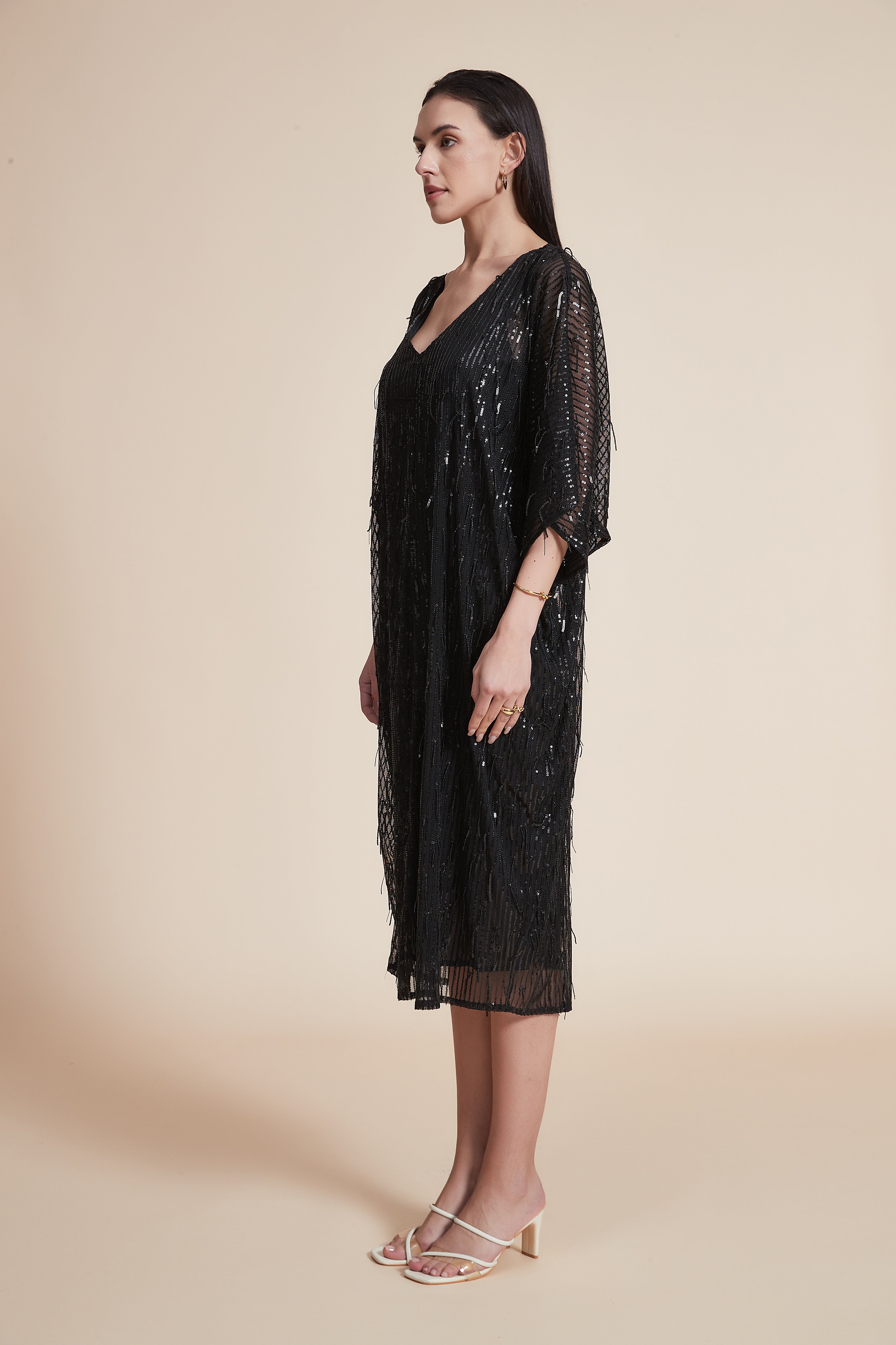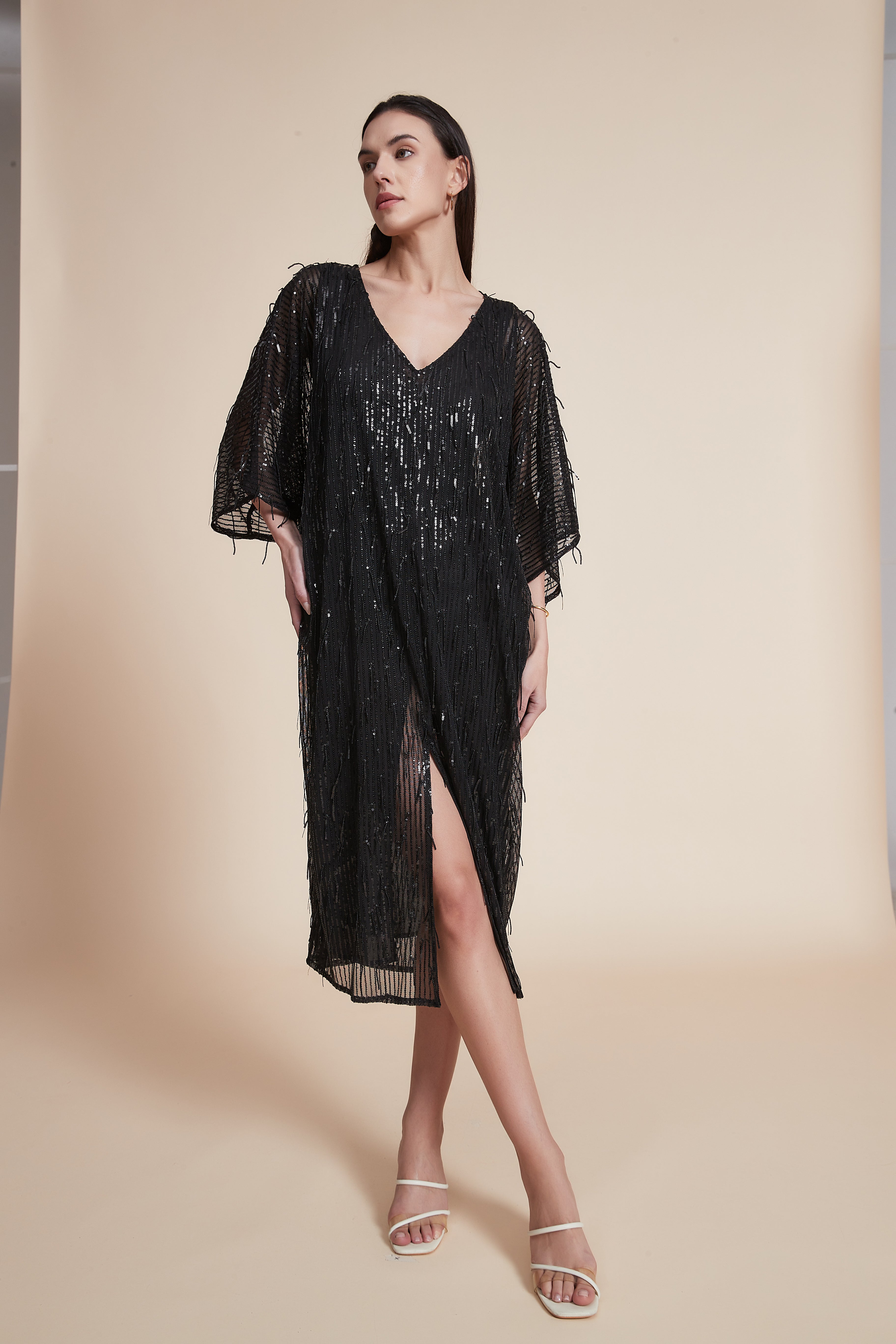 لو تبحثين عن فستان يجمع الأناقة للمساء وبساطة النهار، هذا الفستان الأسود سيخطف نظرك. الخامة مكوّنة من 98% بوليستر و2% إيلاستين فتمنح مظهر مرتب مع مرونة خفيفة لحركة طبيعية. القصة مستقيمة وقصة عادية بطول ميدي تمنح إطلالة راقية ومريحة مع ياقة V تعزز الطول البصري. أكمام كيمونو ثلاثة أرباع تضيف لمسة عصرية، والنقش المطرز البارز مع الترتر يعطي بريقًا خفيفًا مناسبًا للسهرات. التصميم بدون بطانة، بدون جيوب وبدون حزام يظهر بسيطًا وأنيقًا، وسمكه المتوسط يجعله مناسبًا لكل المواسم. قطعة مواكبة للموضة للنساء البالغات، مثالي للخروجات الرومانسية وستحبين كيف يتحرك معك أثناء السهرة. اعثري على مقاسك في فاشن السعودية وأضيفي هذه القطعة المتنوعة إلى خزانة ملابسك اليوم.