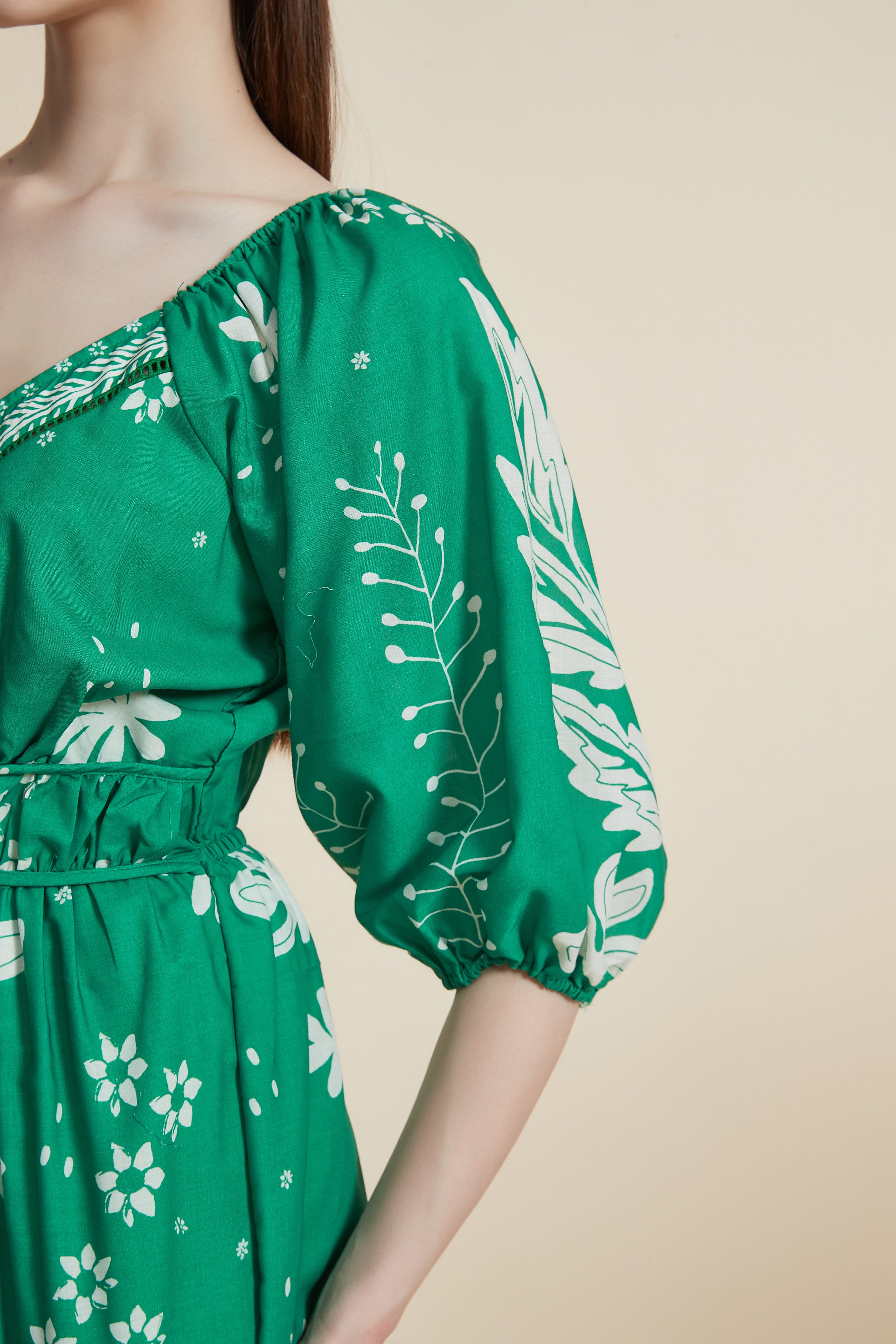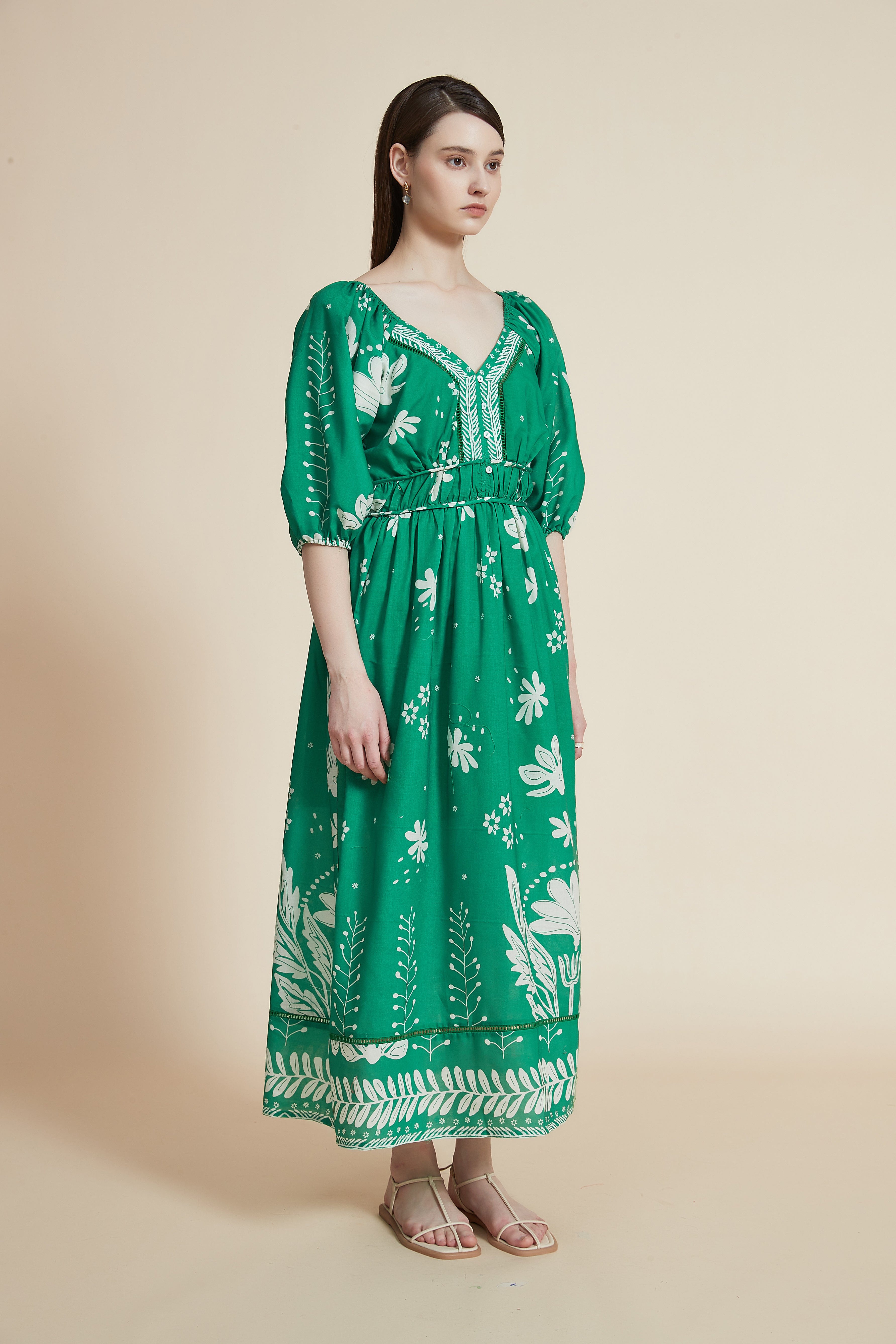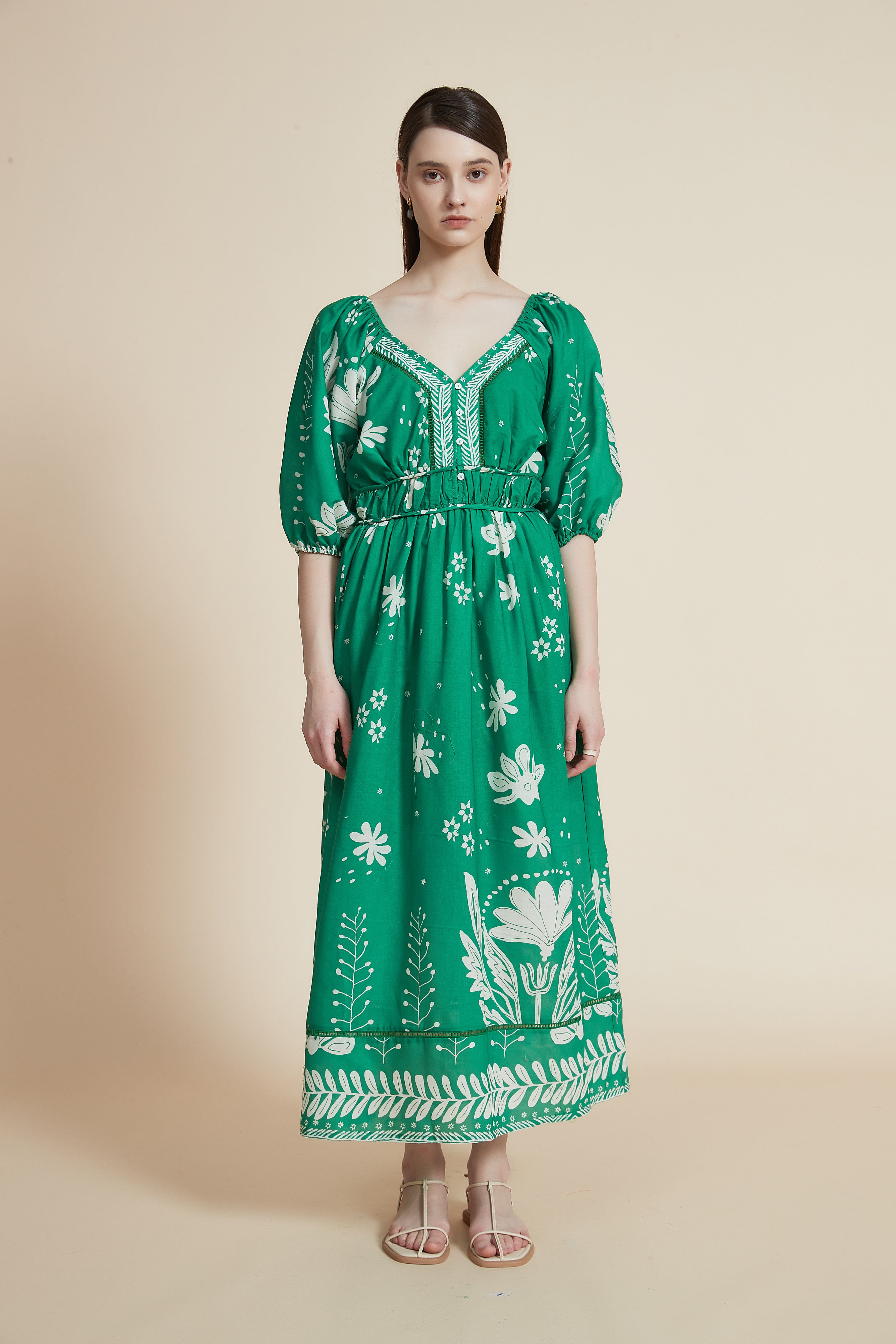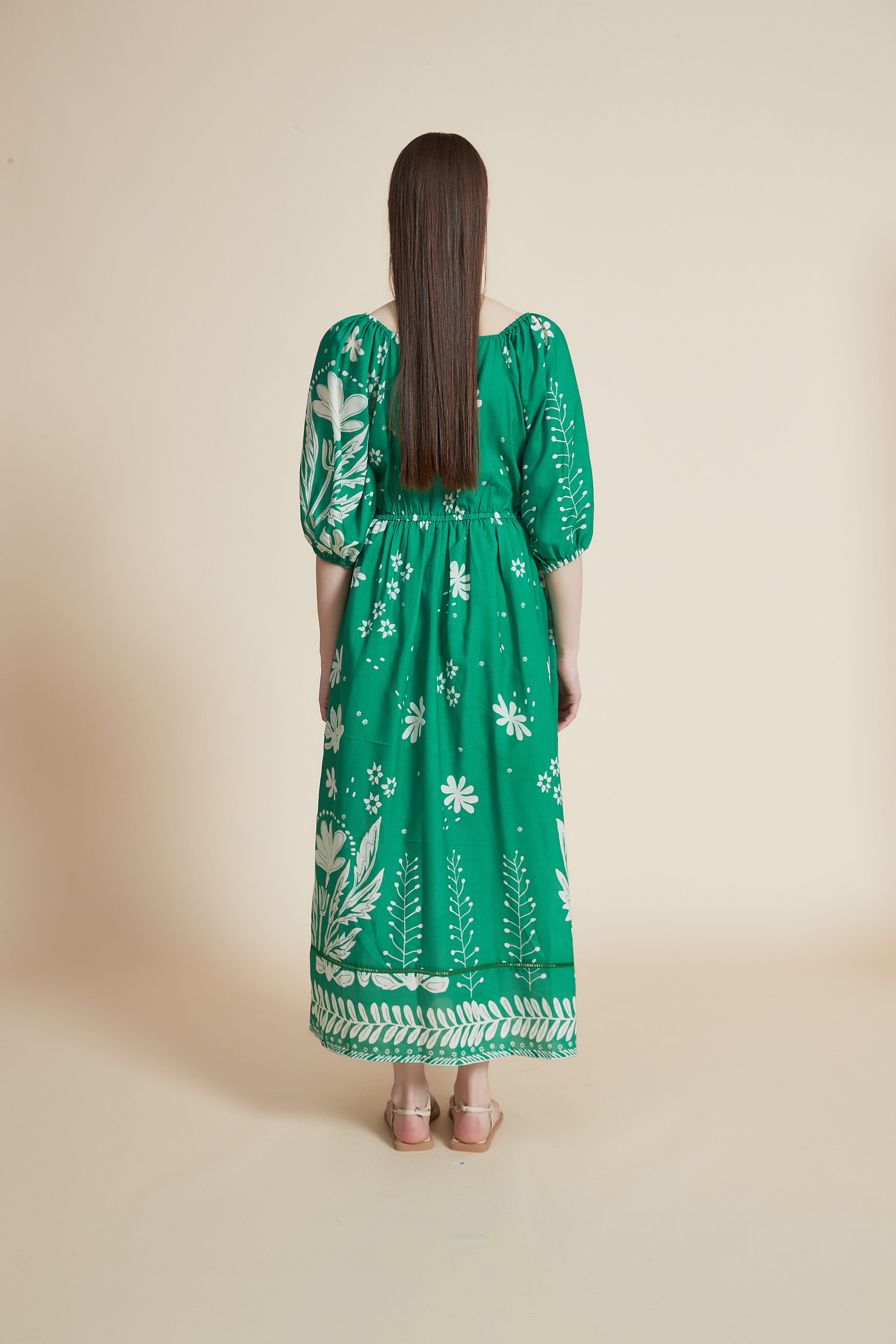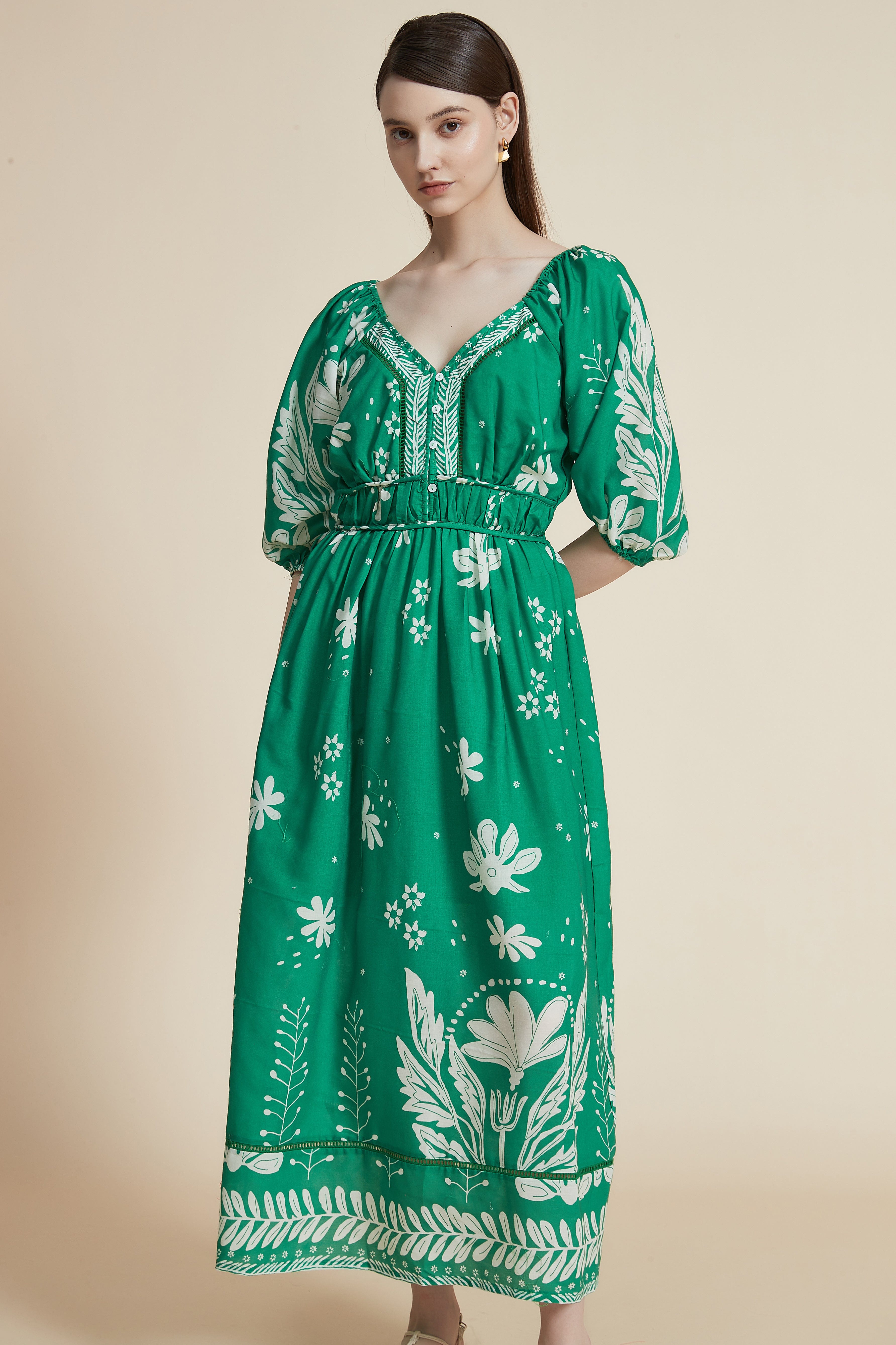 - فستان ماكسي بطول كامل بلون أخضر مزخرف بنقشة زهور بطباعة رقمية