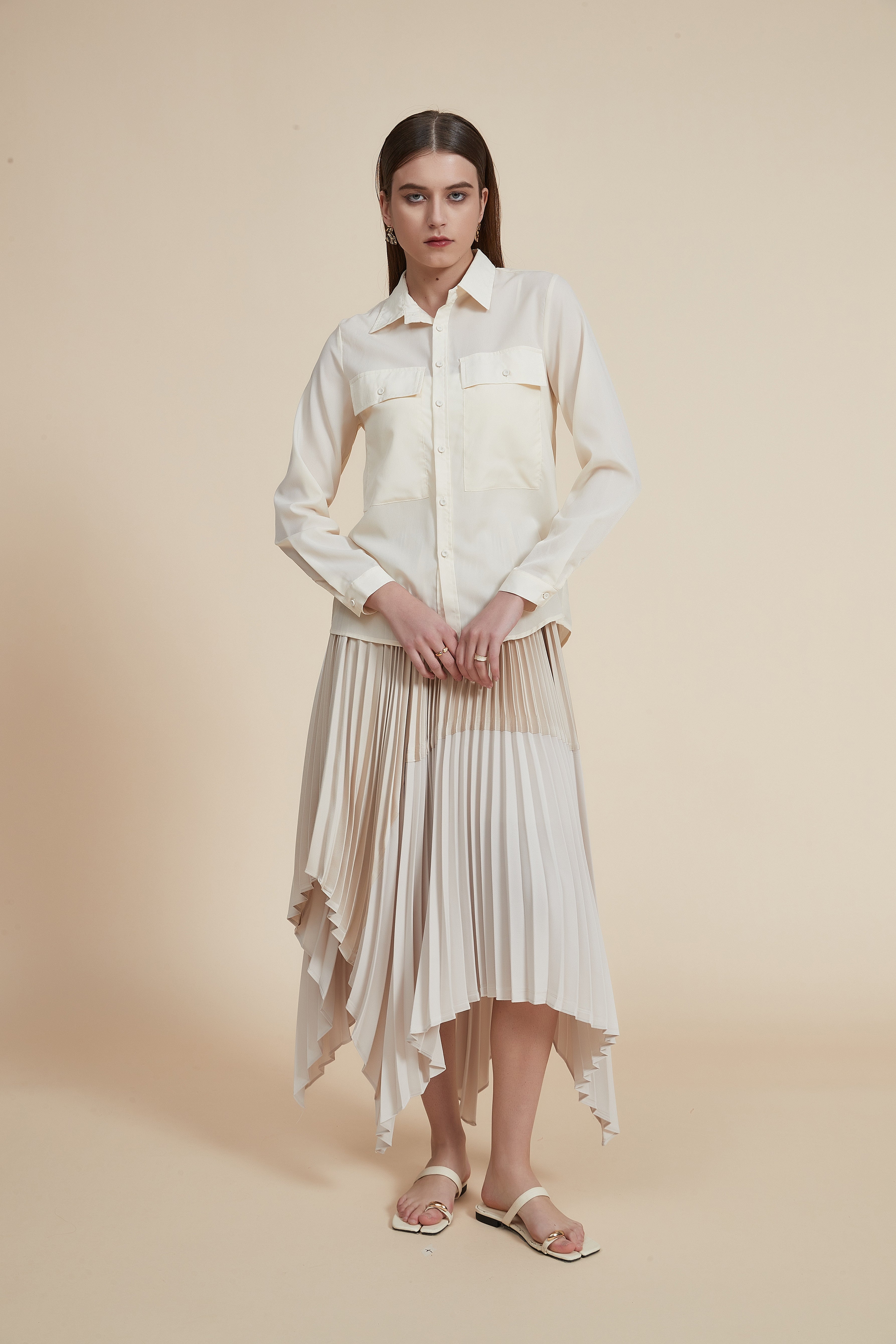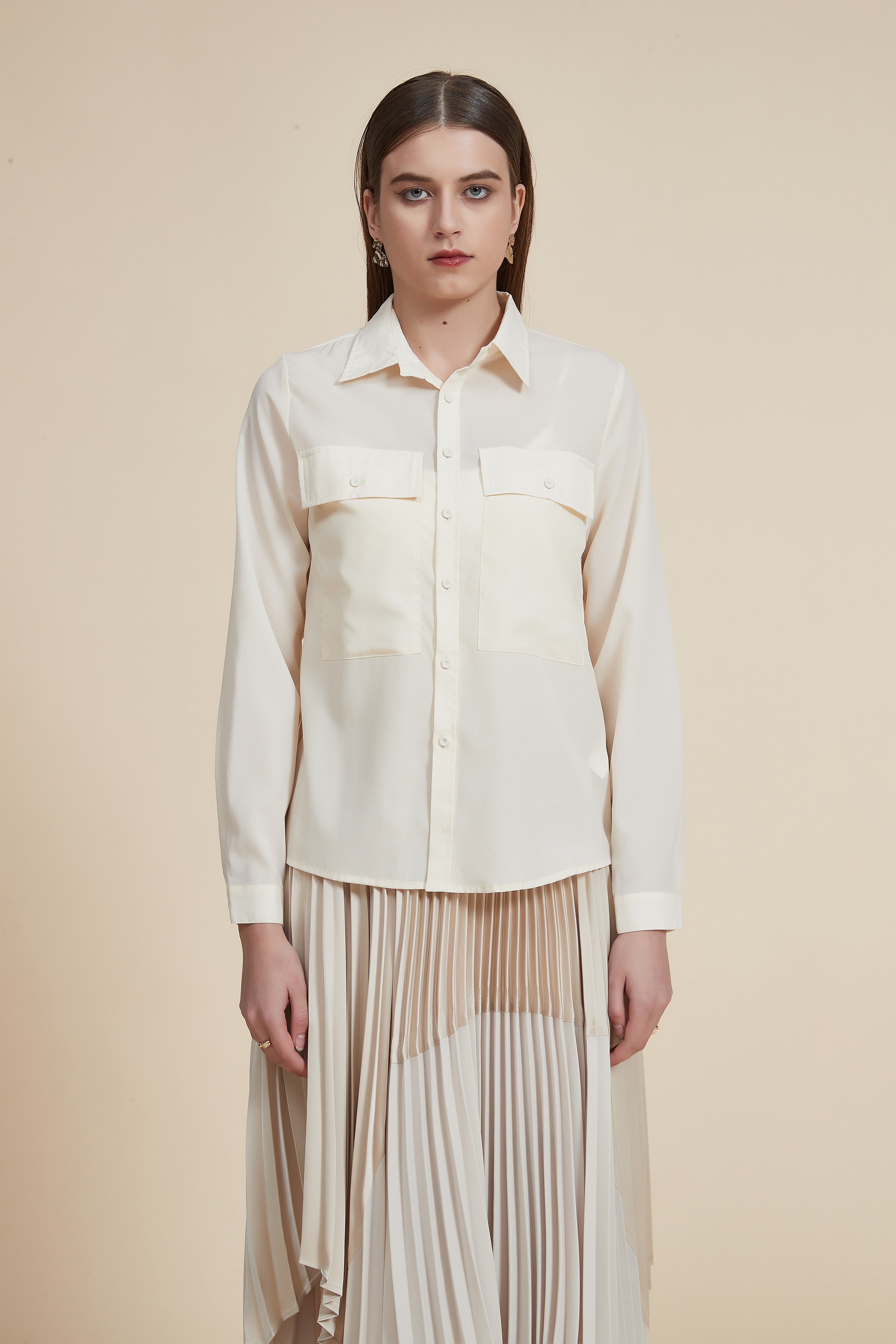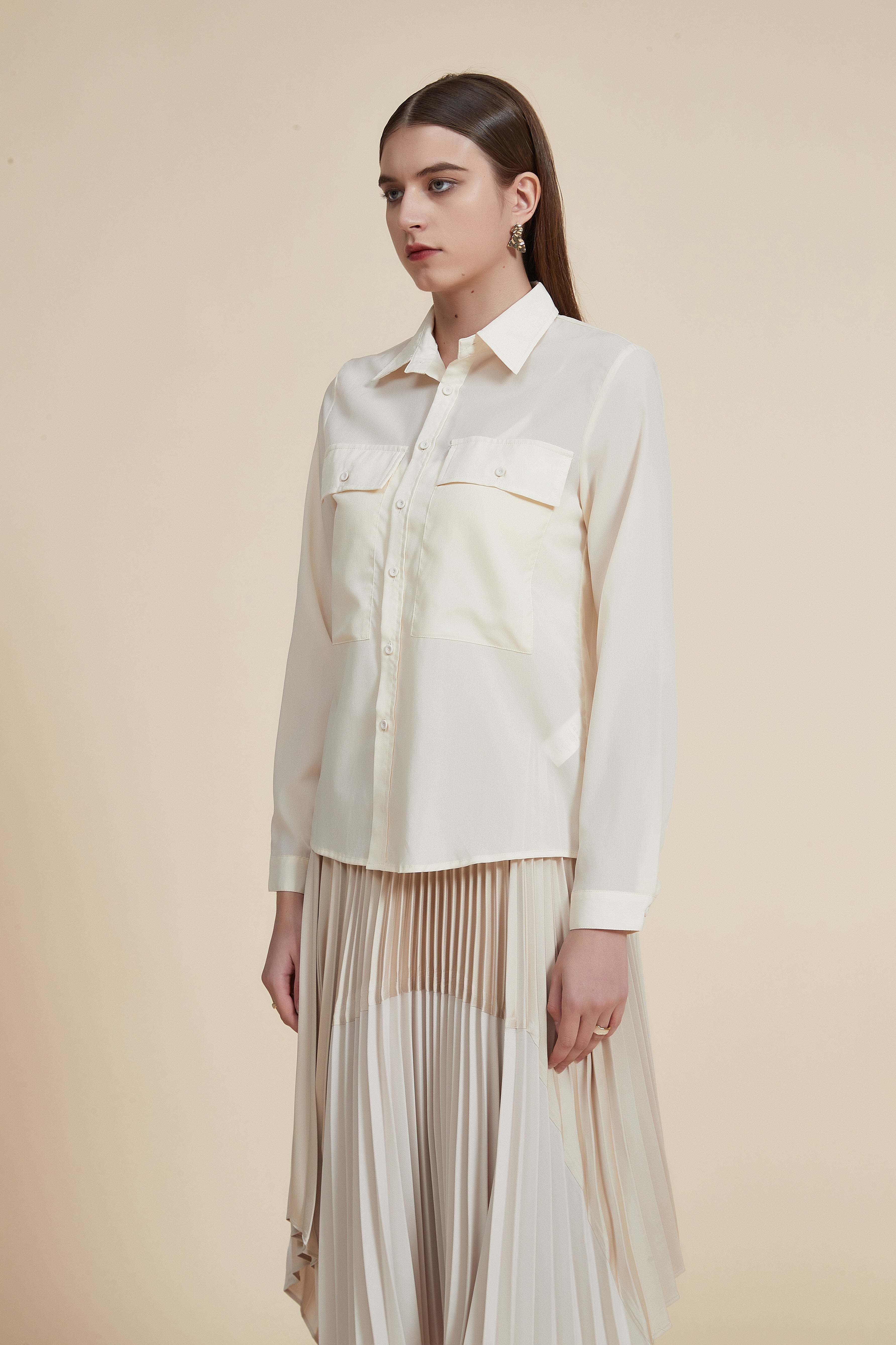 بلوزة بياقة قميص وجيوب عالصدر وأكمام طويلة