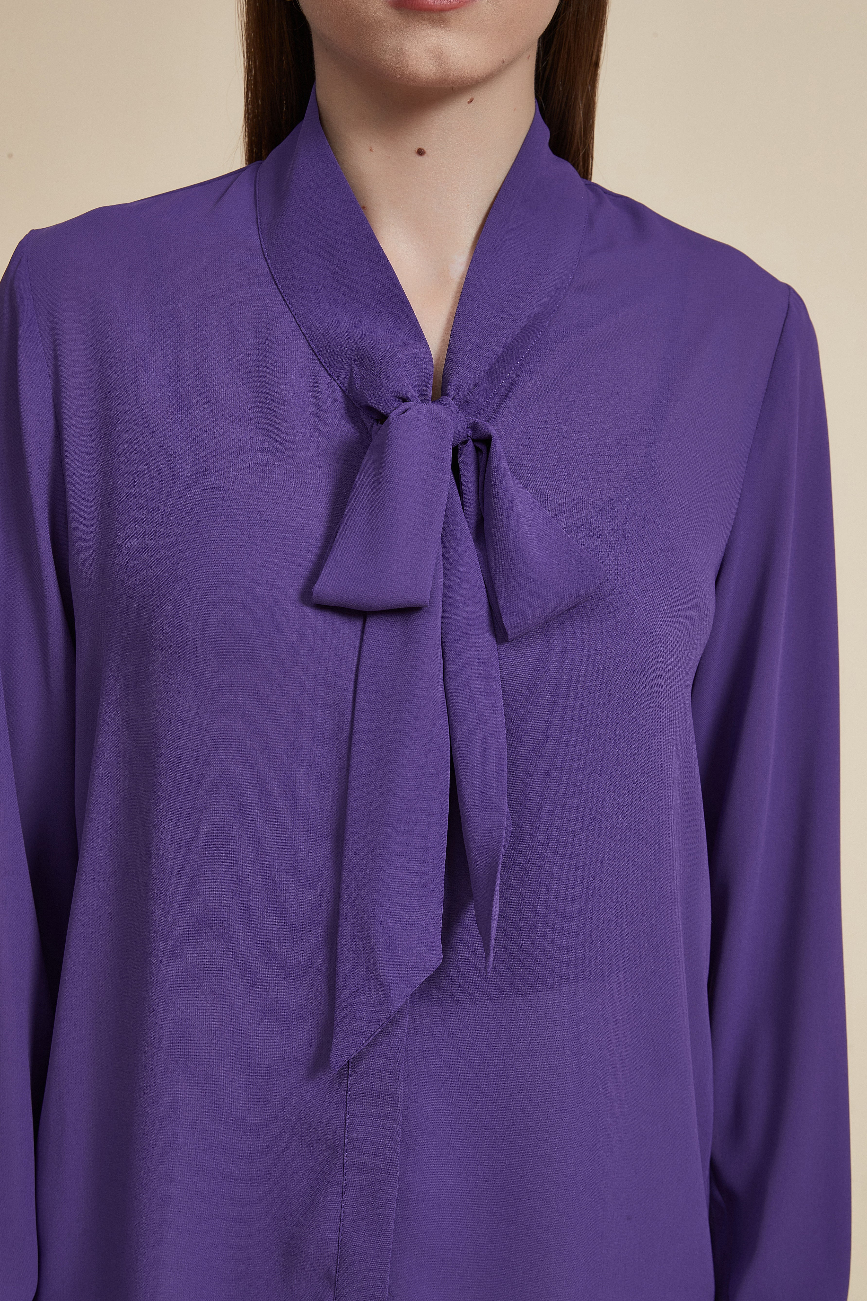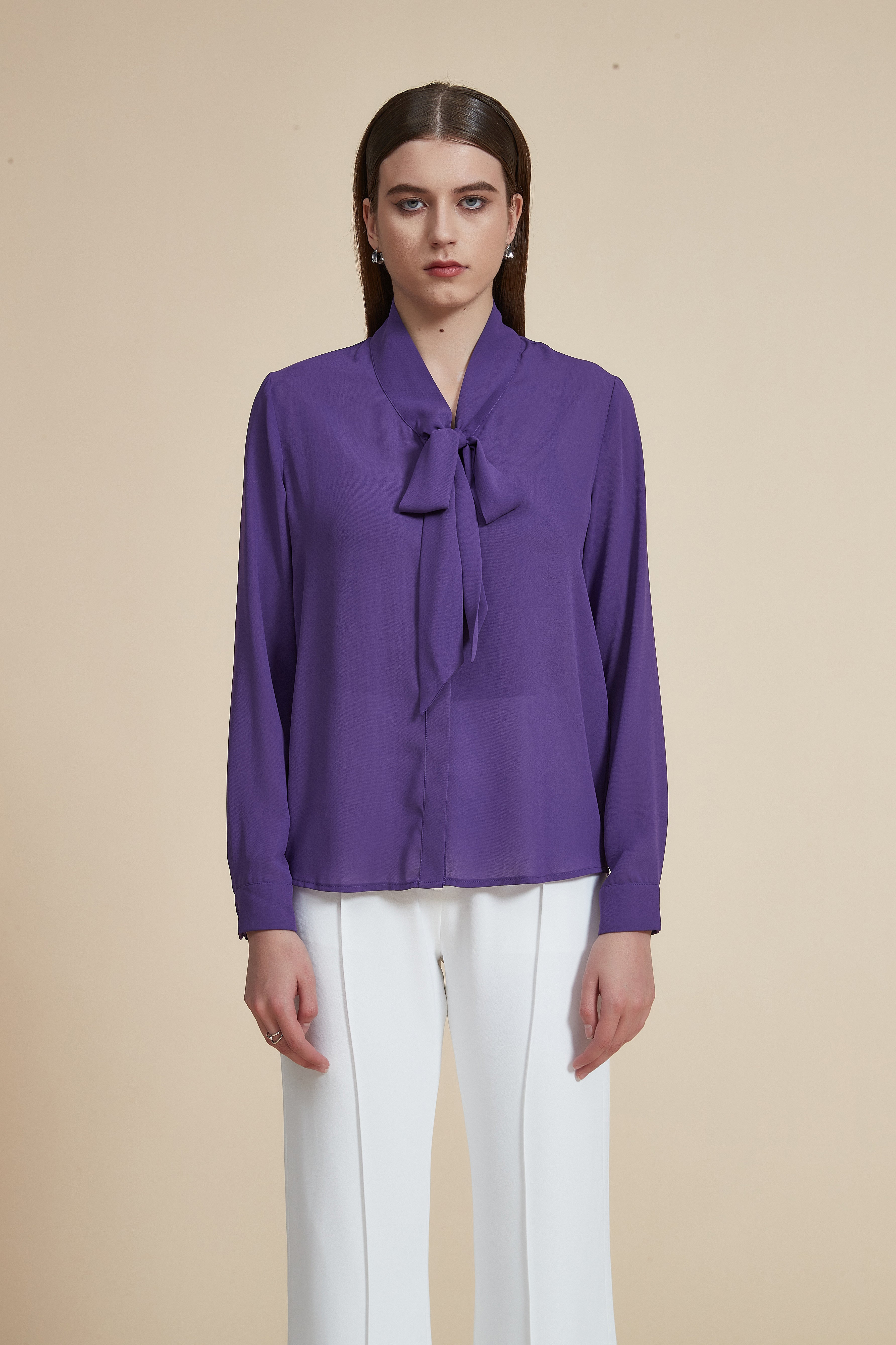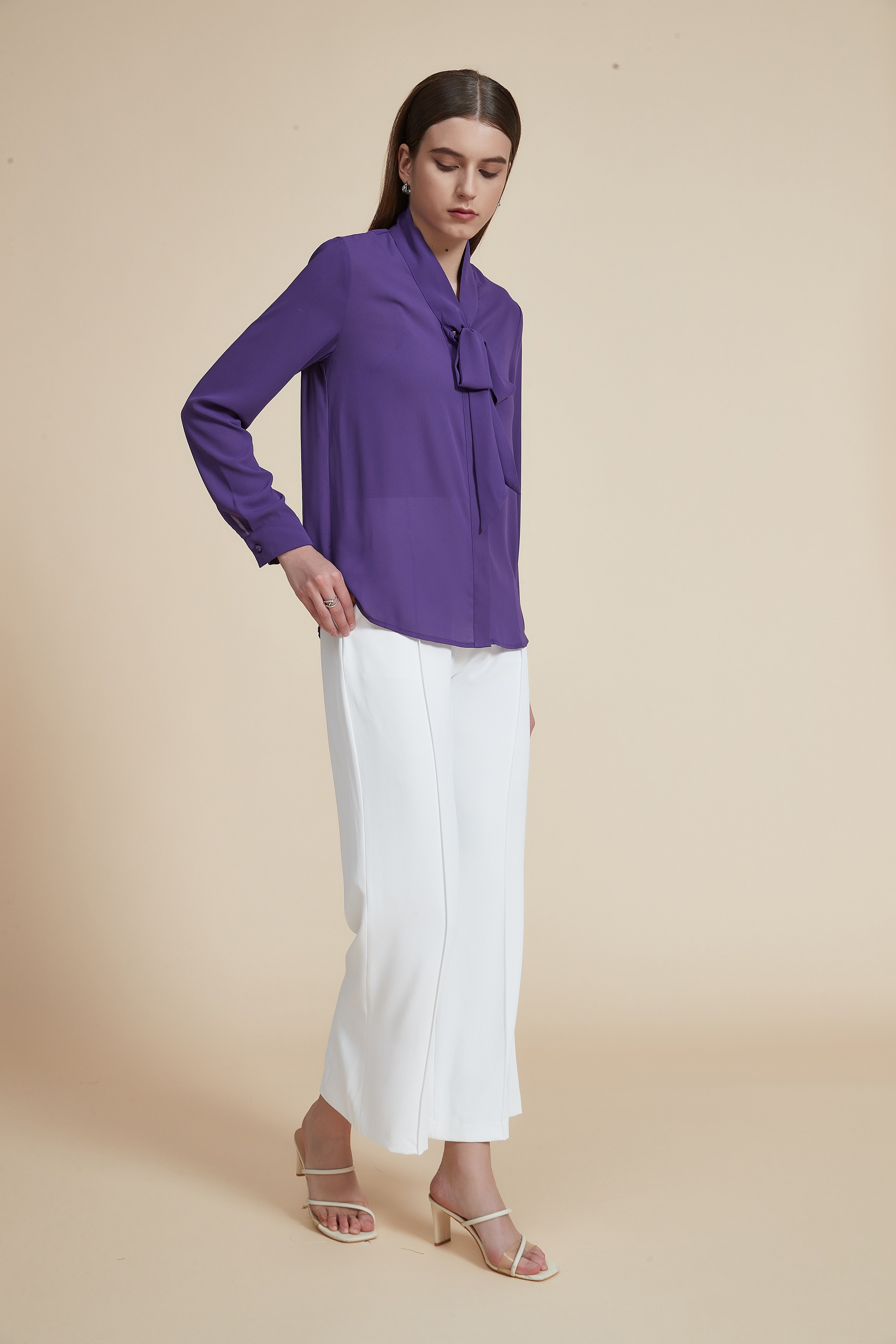 بلوزة سادة وبفيونكة على ياقة على شكل حرف V كم طويل
