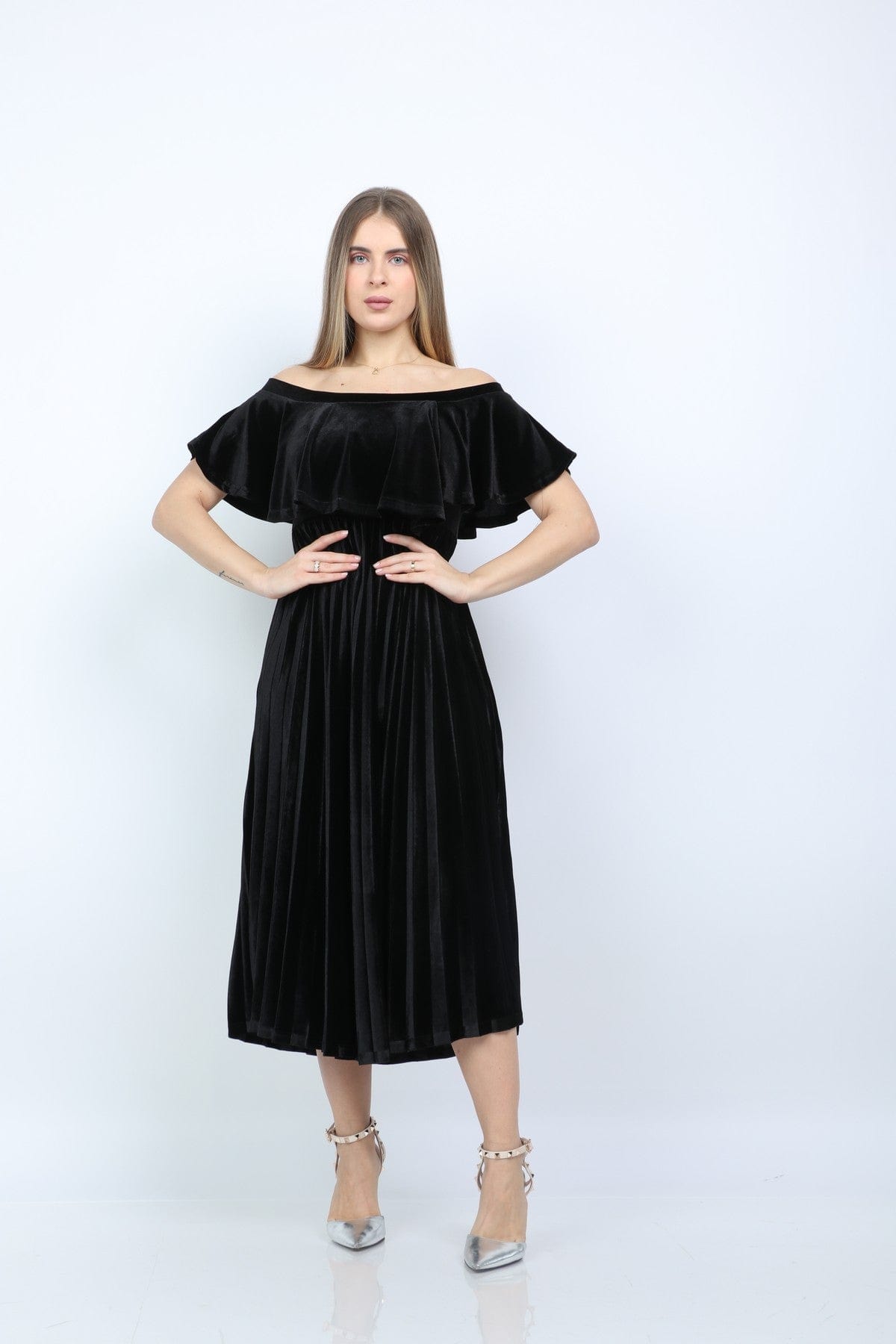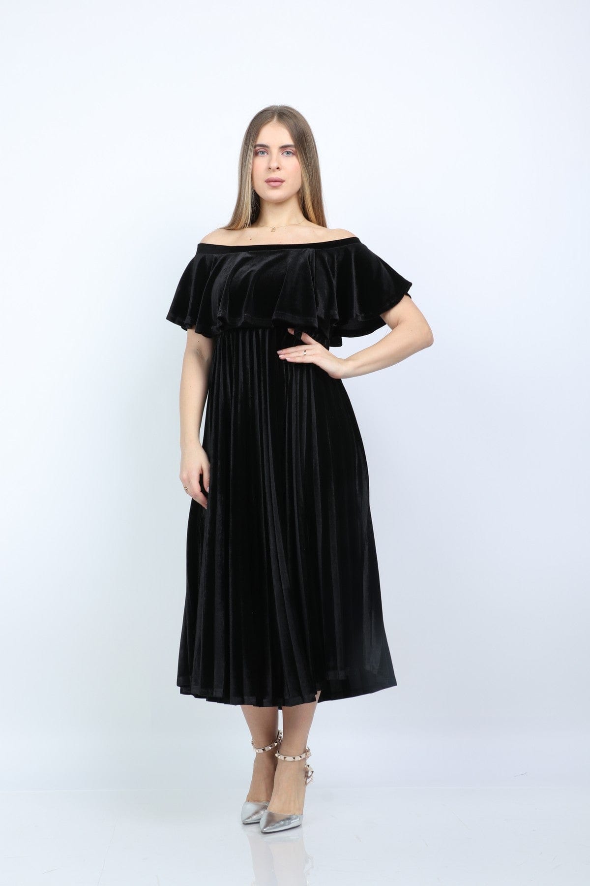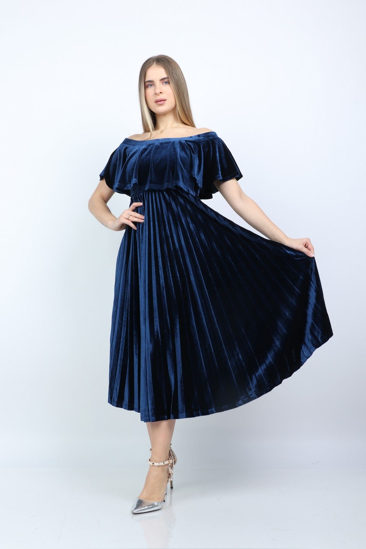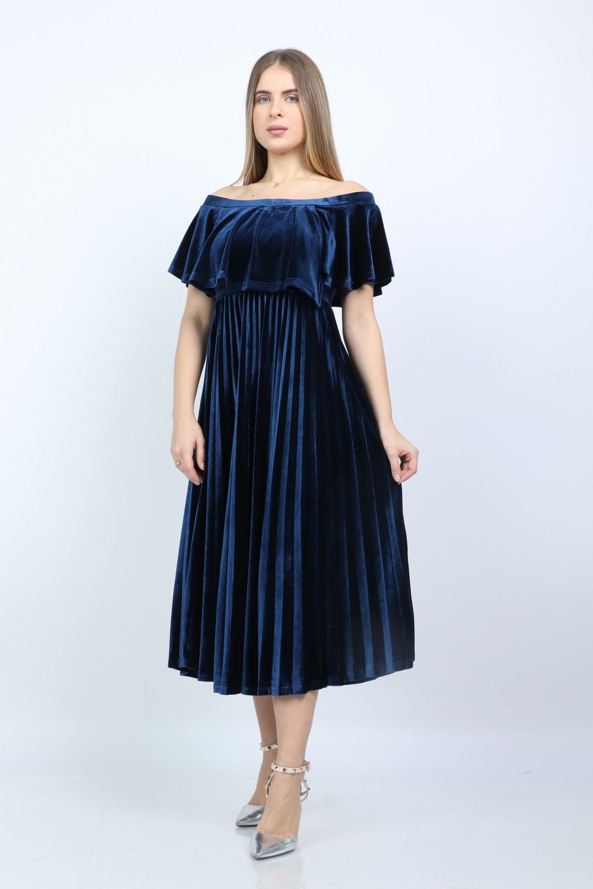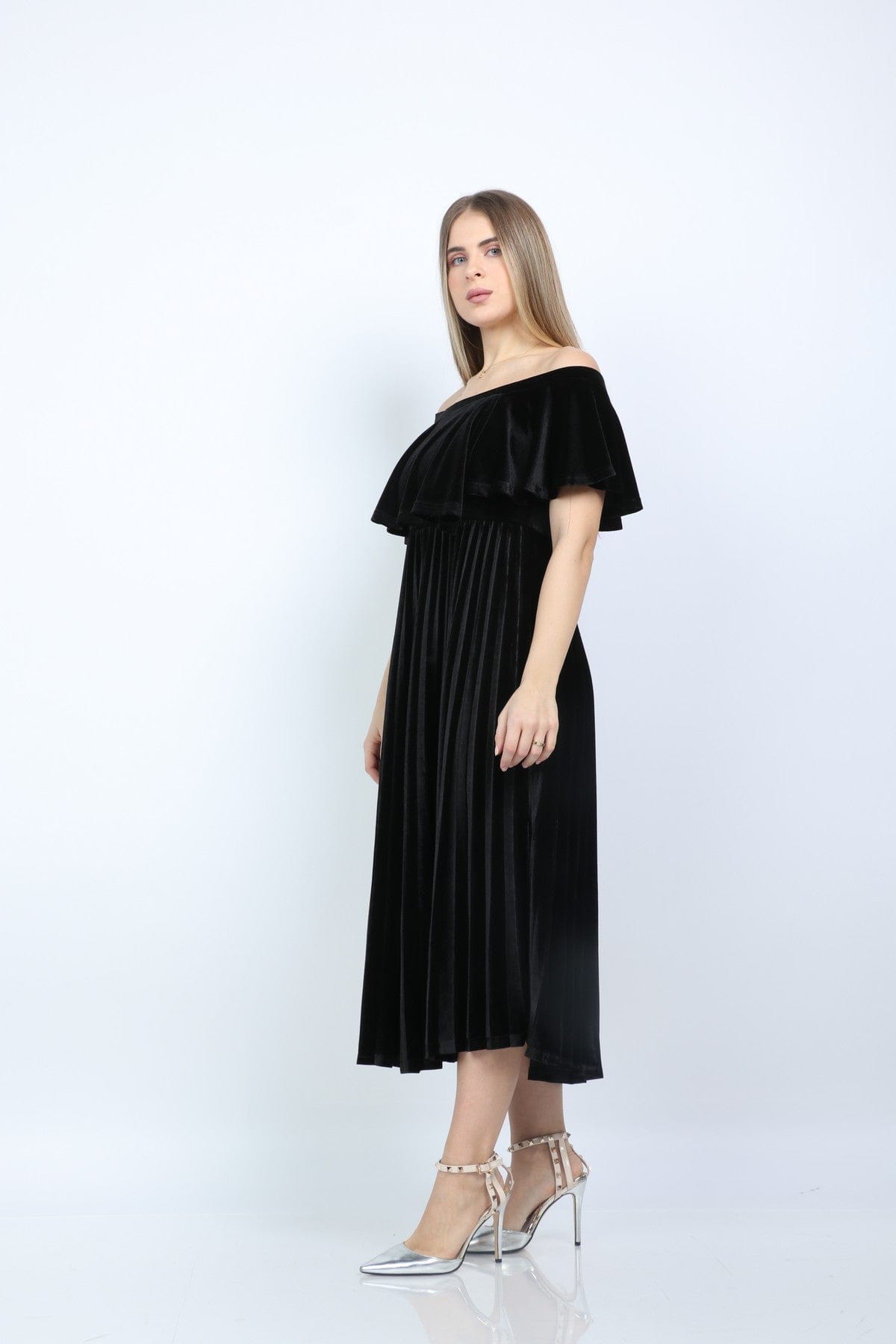 فستان ميدي مخمل سهرة كتف بكم قصير