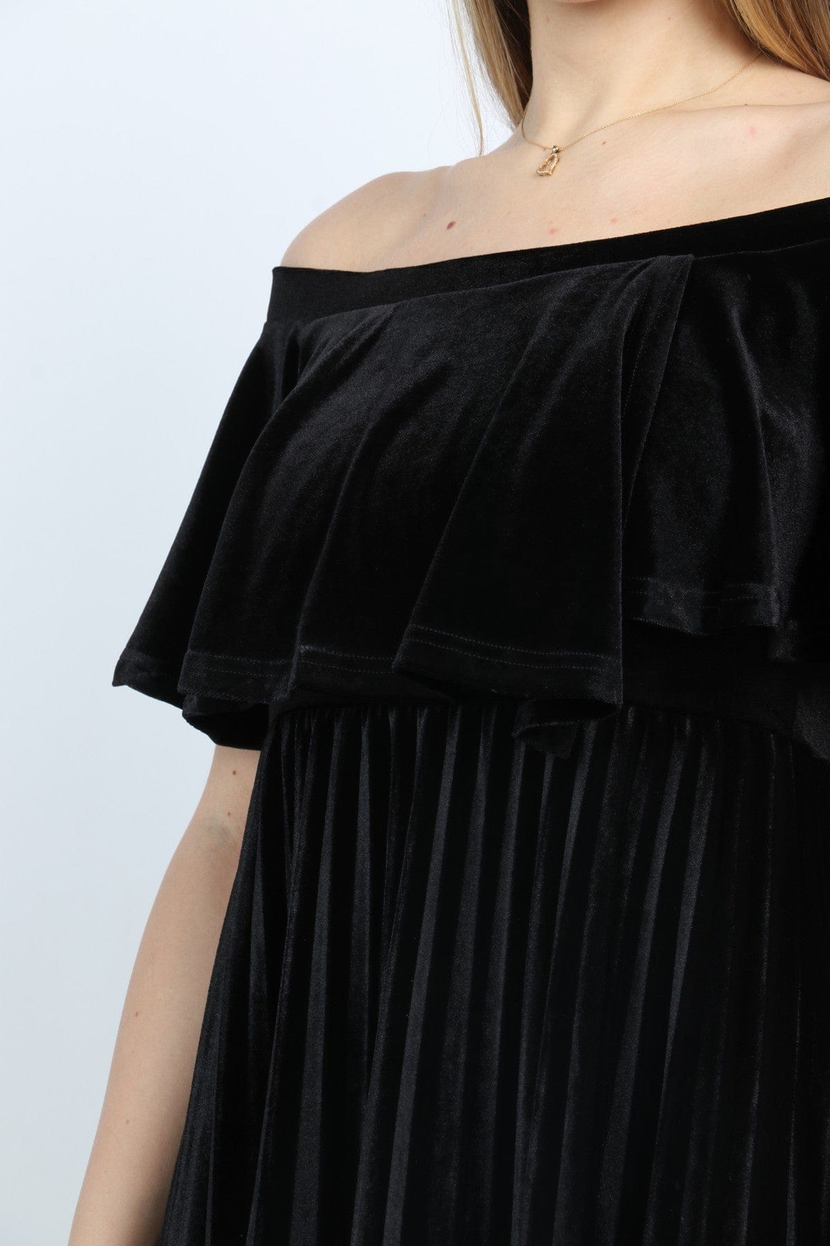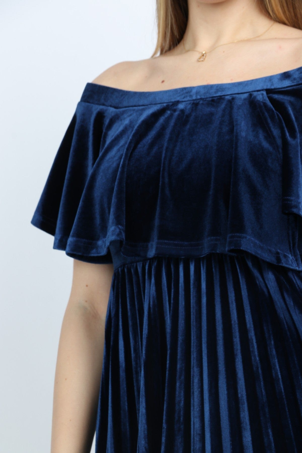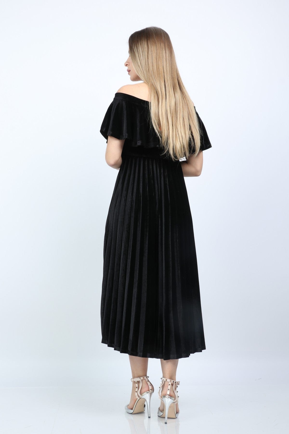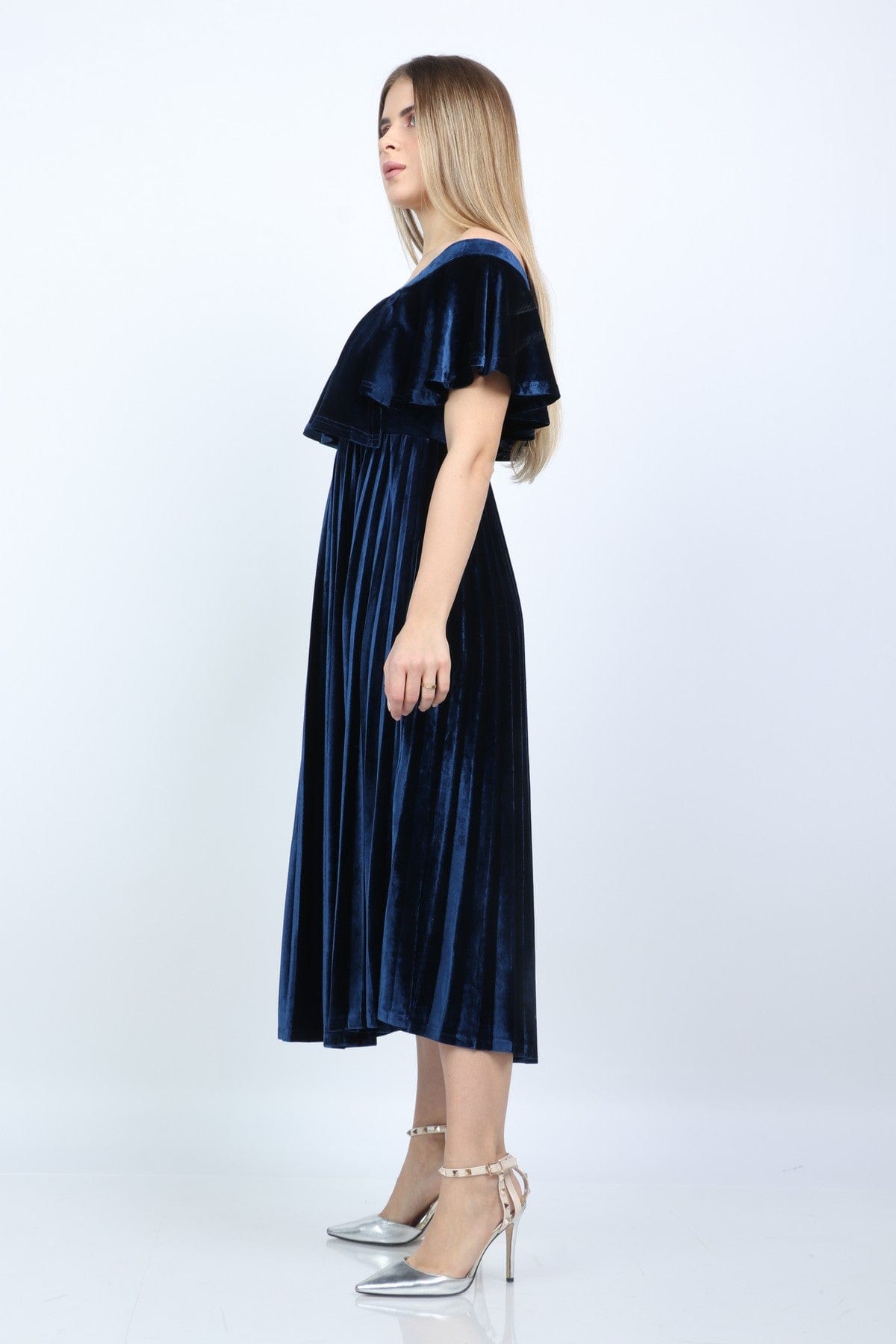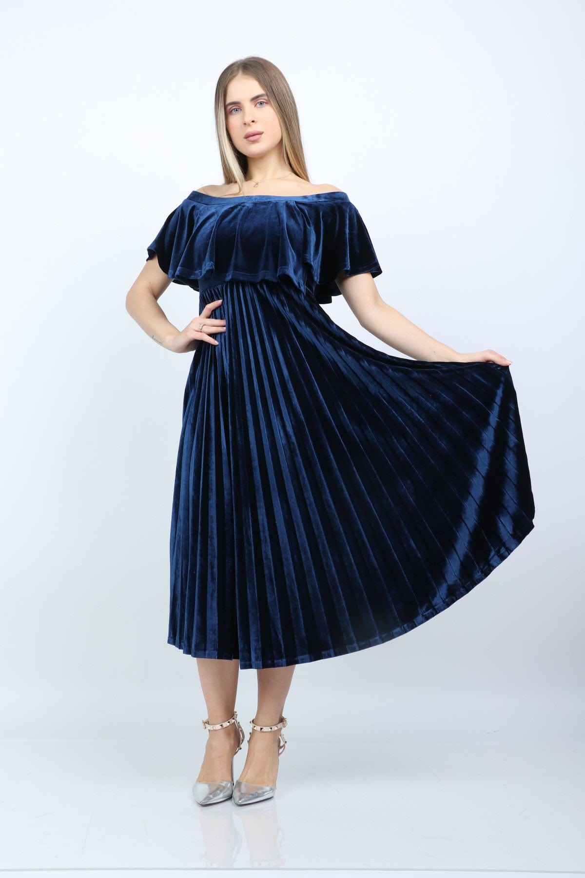 فستان ميدي مخمل سهرة كتف بكم قصير