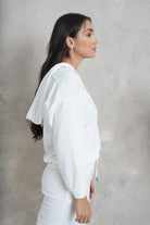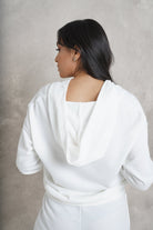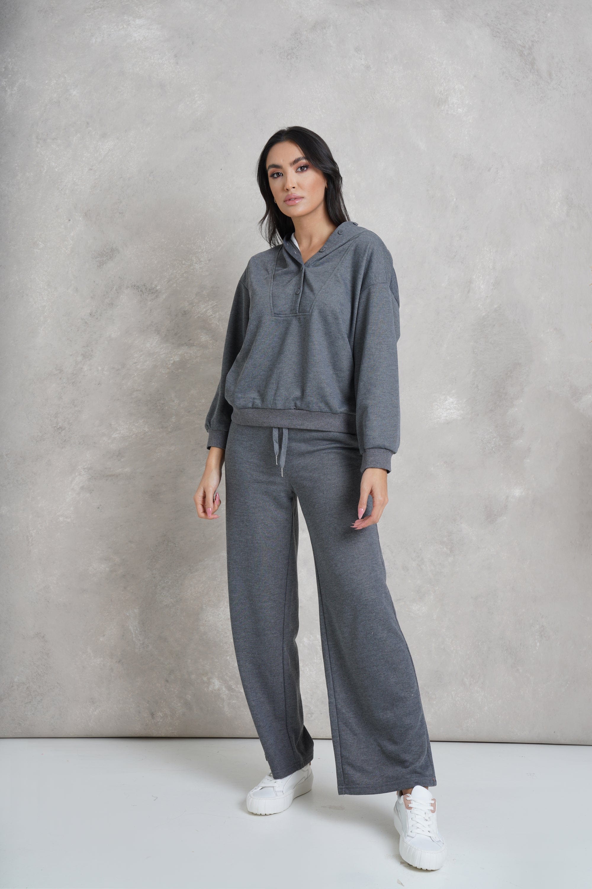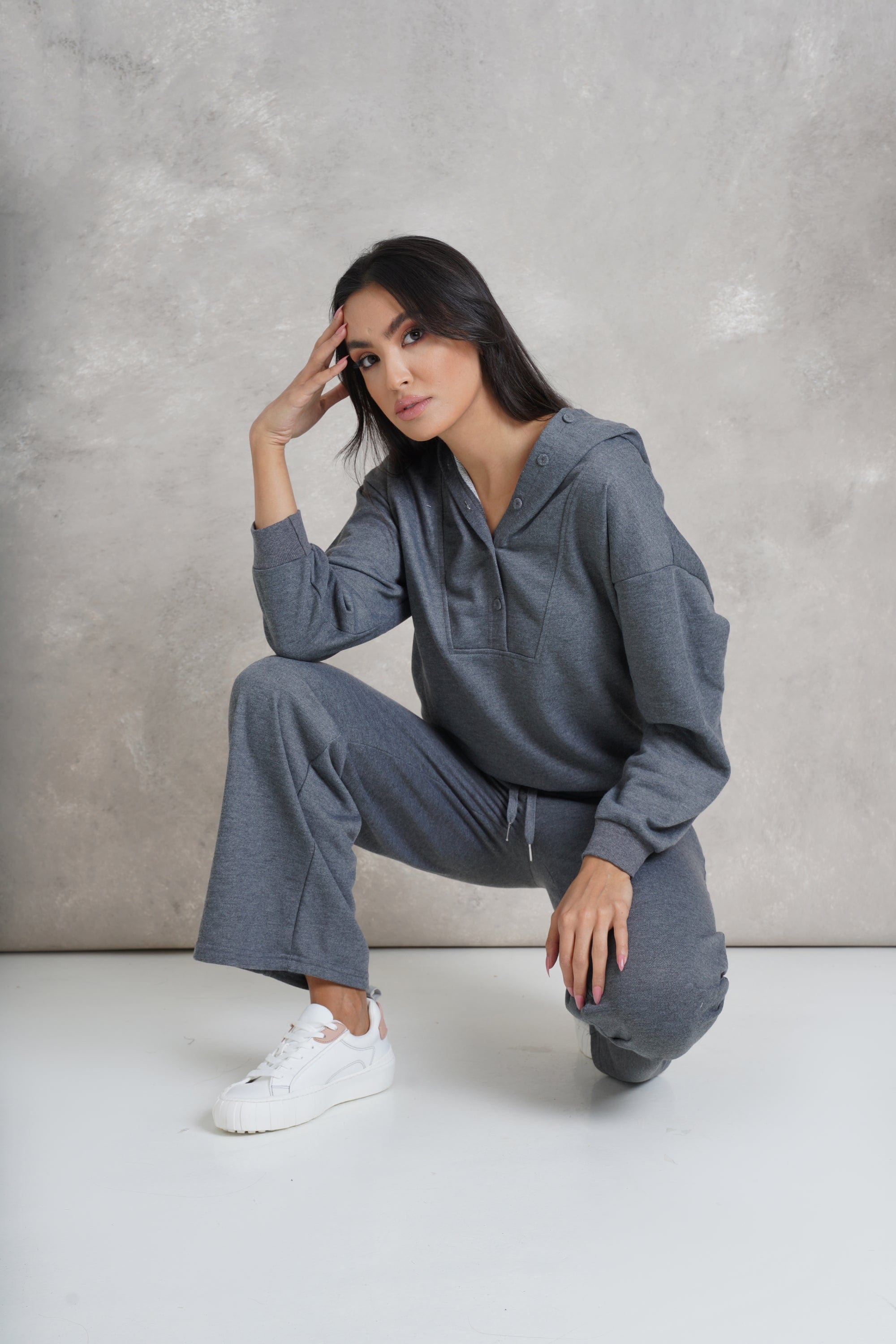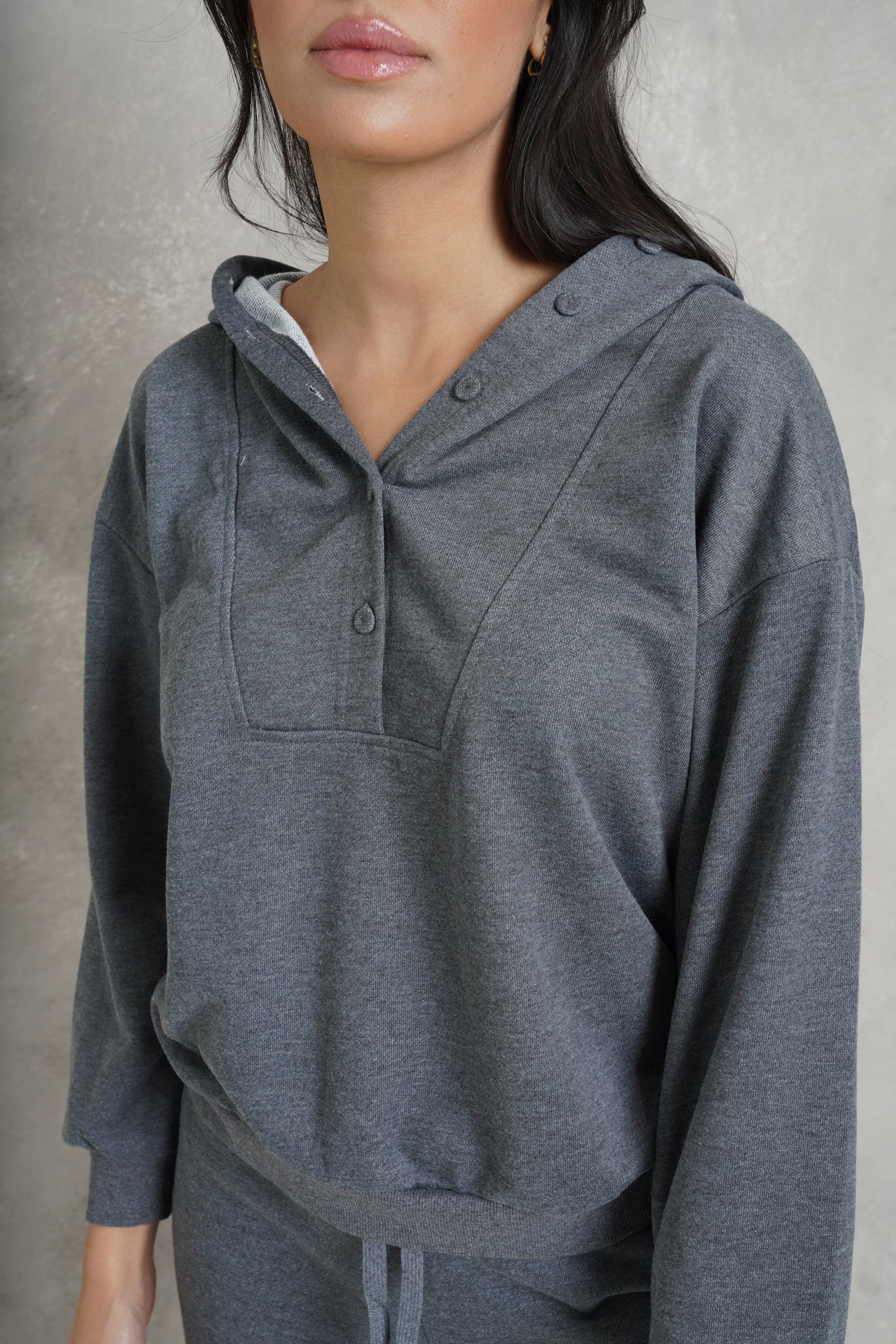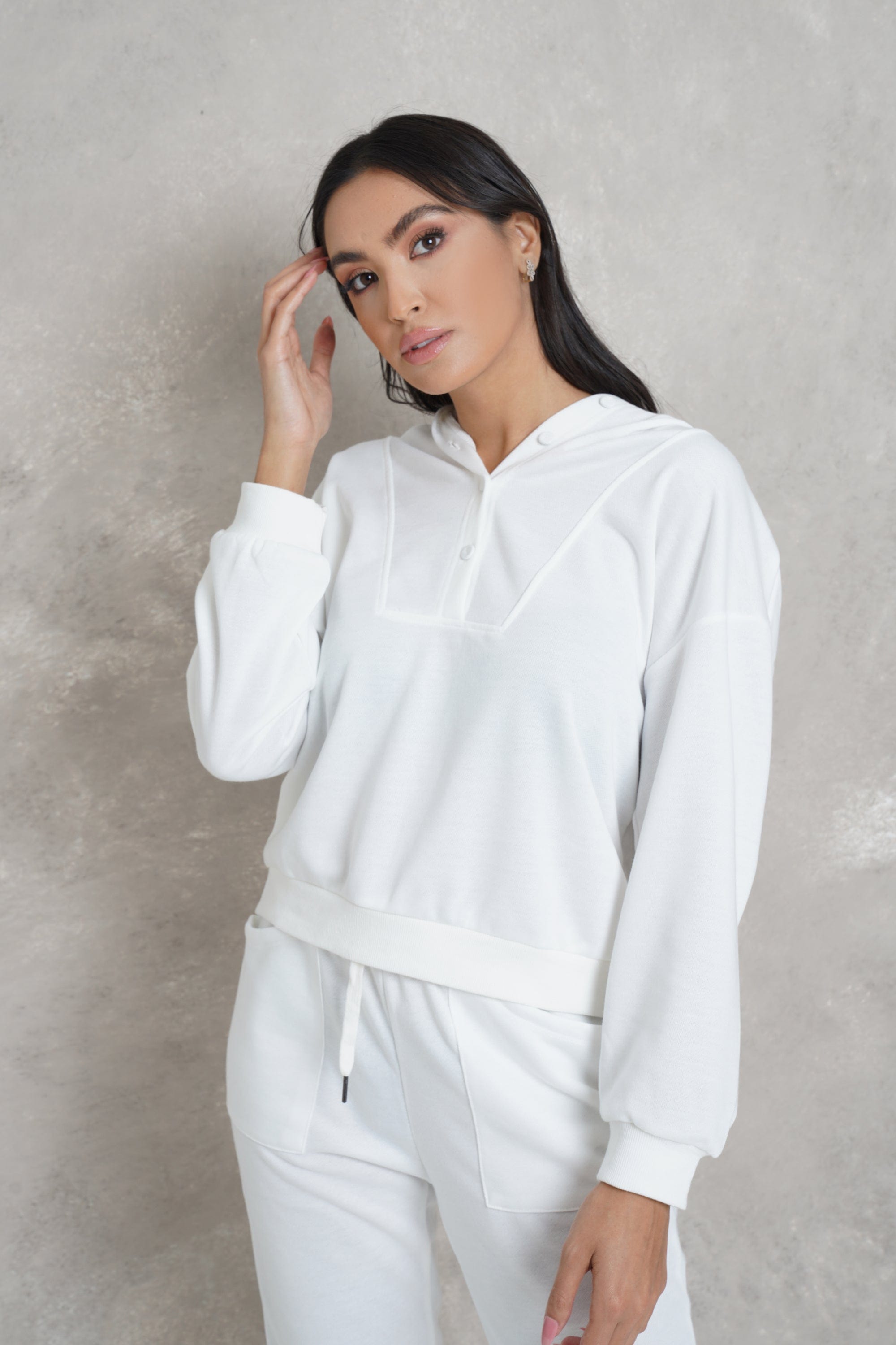 بلوزة هودي رياضي بأزرار وقبعة خلفية كم طويل
